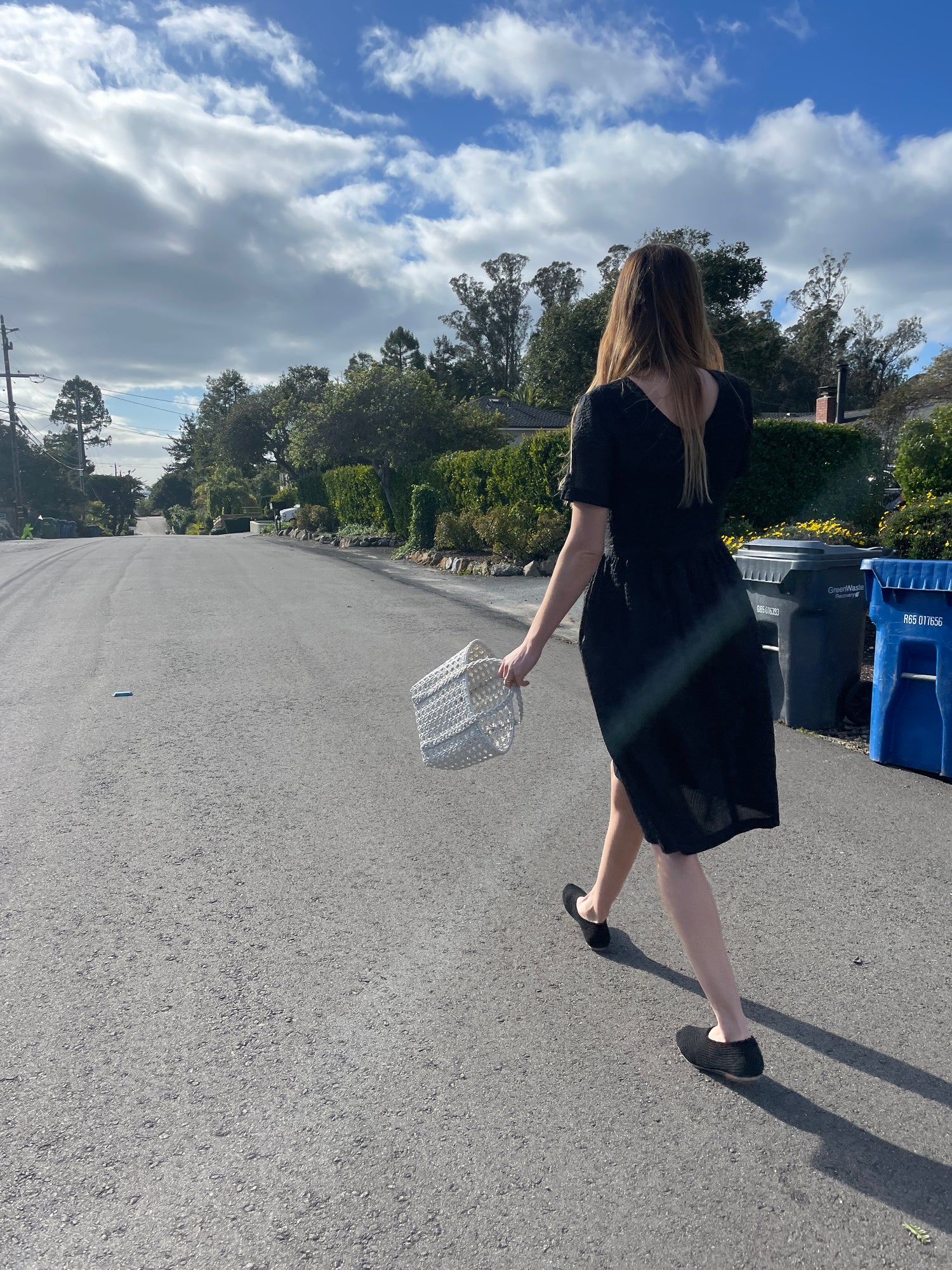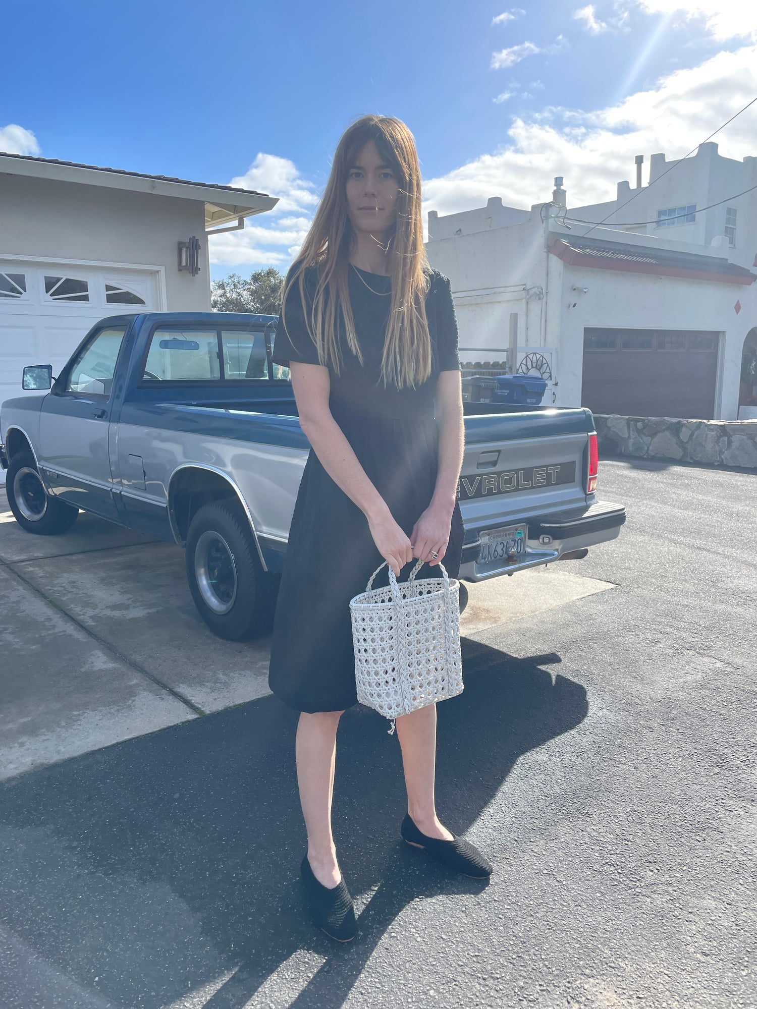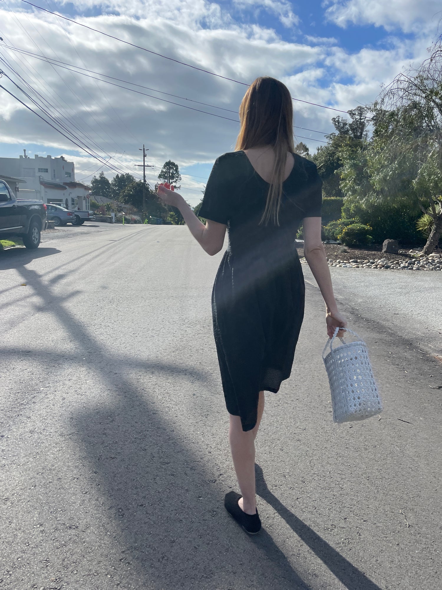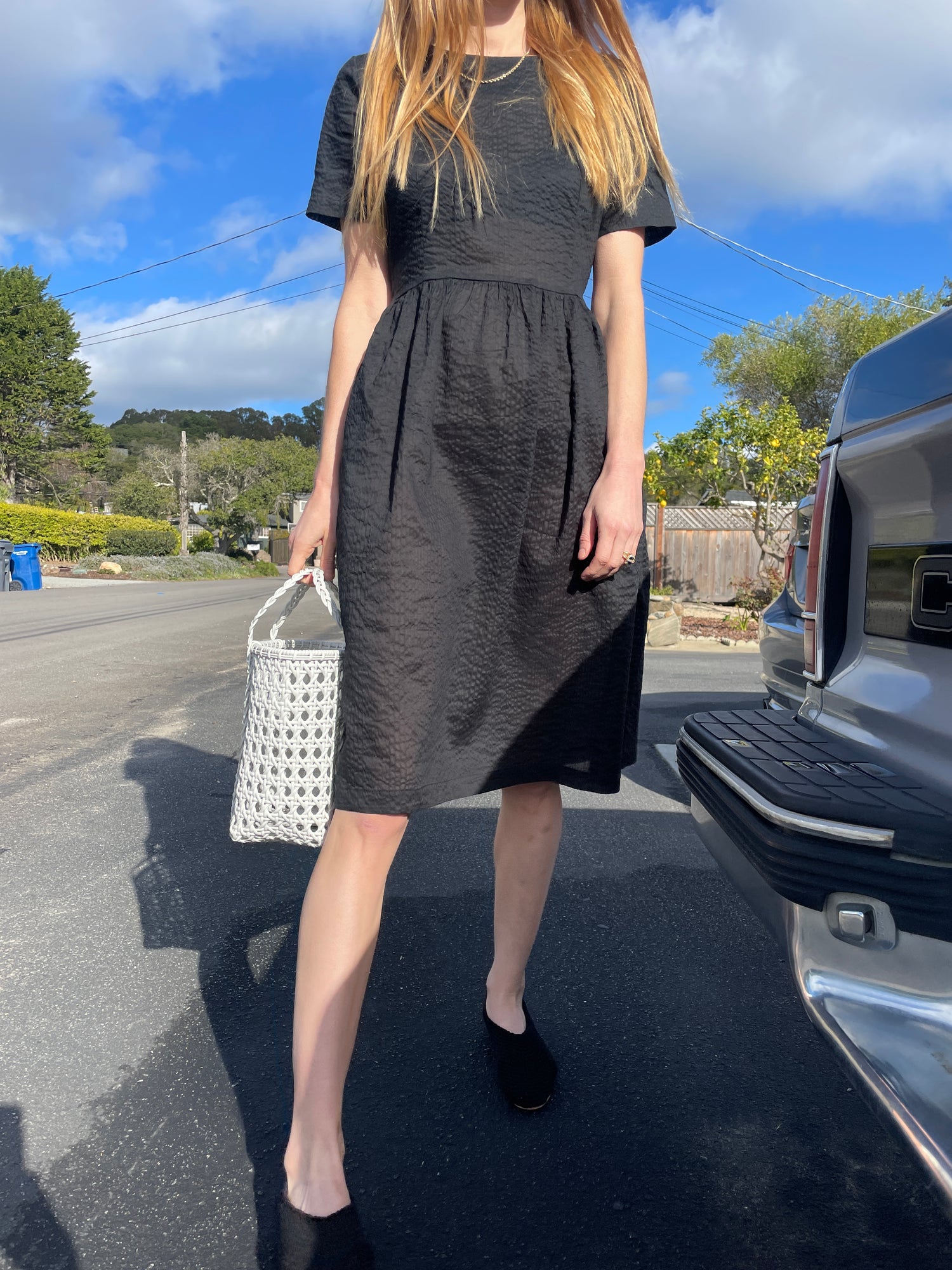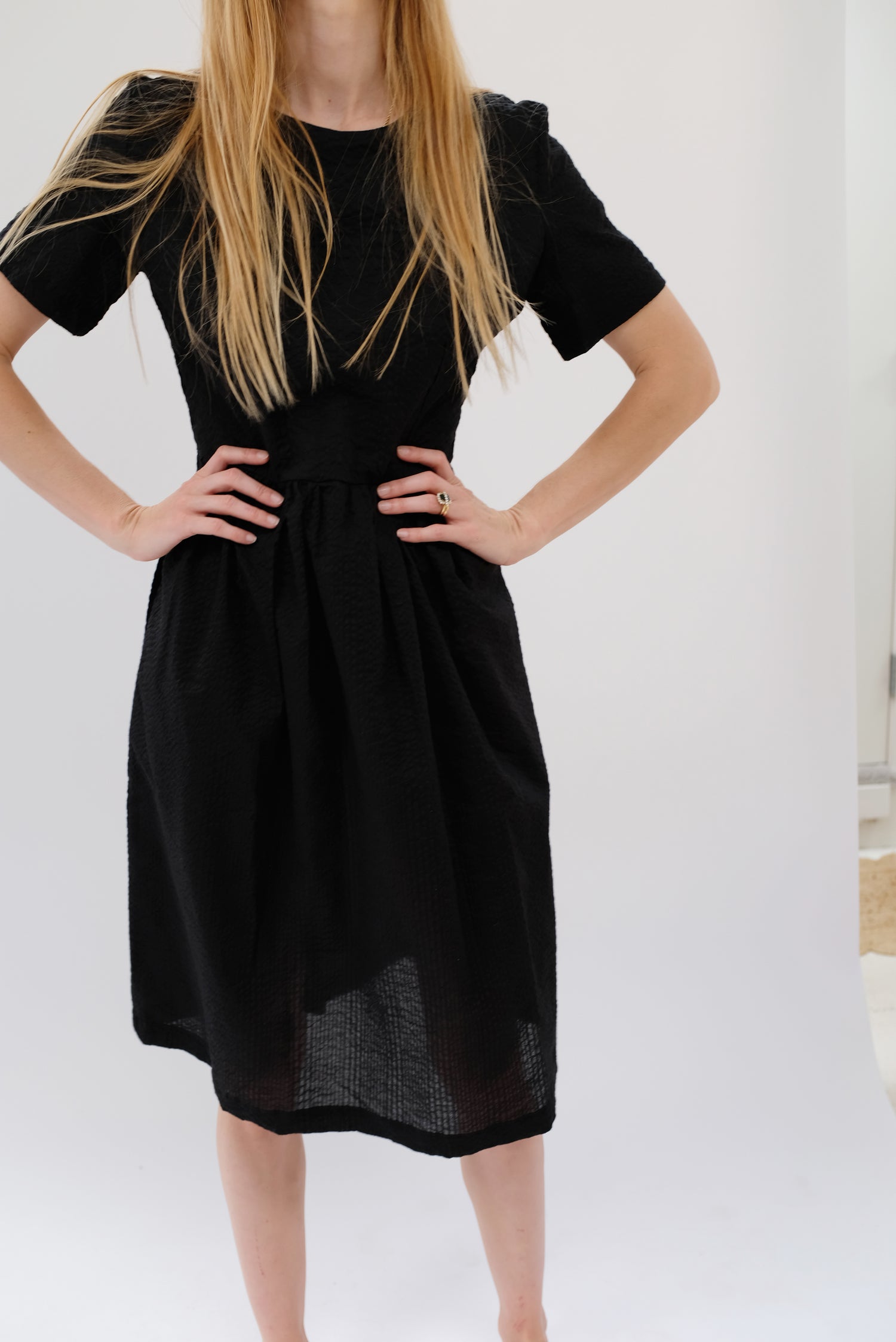 100% Woven textured Japanese cotton, fitted waist and upper, short sleeve, full skirt hits just below knee, zipper in back. Semi-sheer fabric, classic fit. Total length 41"
