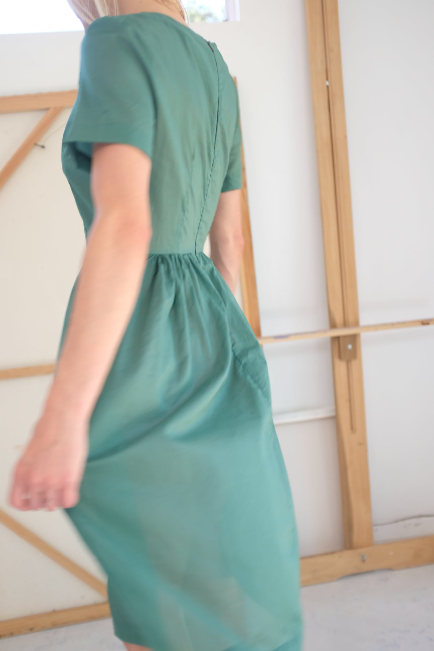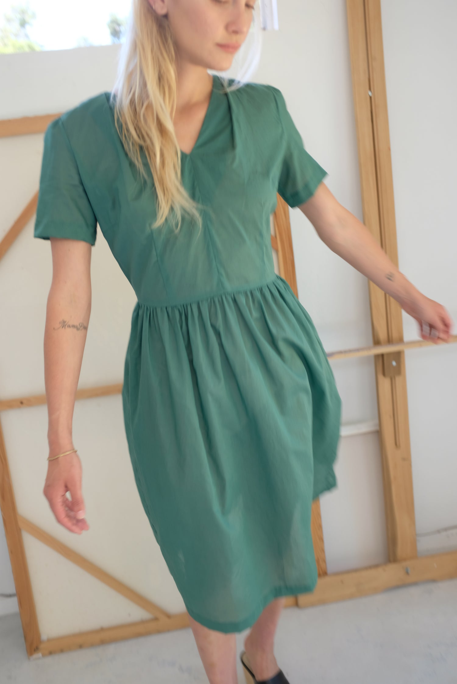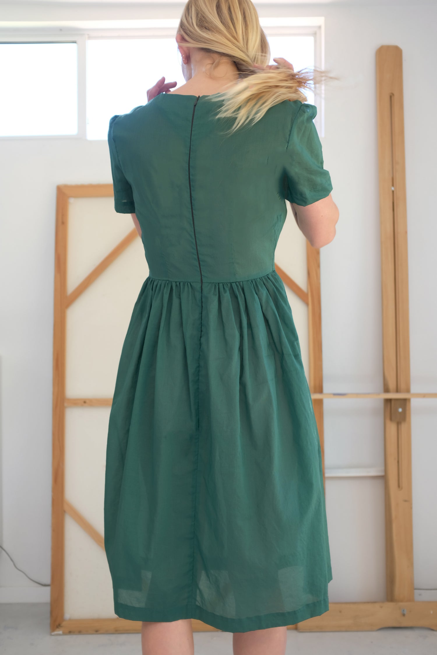 100% Cotton gauze, fitted waist, short sleeve, full skirt hits just below knee, zipper in back, pleat details on shoulders and darts for fitting upper bodice front and back. Sheer gauze, light woven cotton, feminine classic fit.