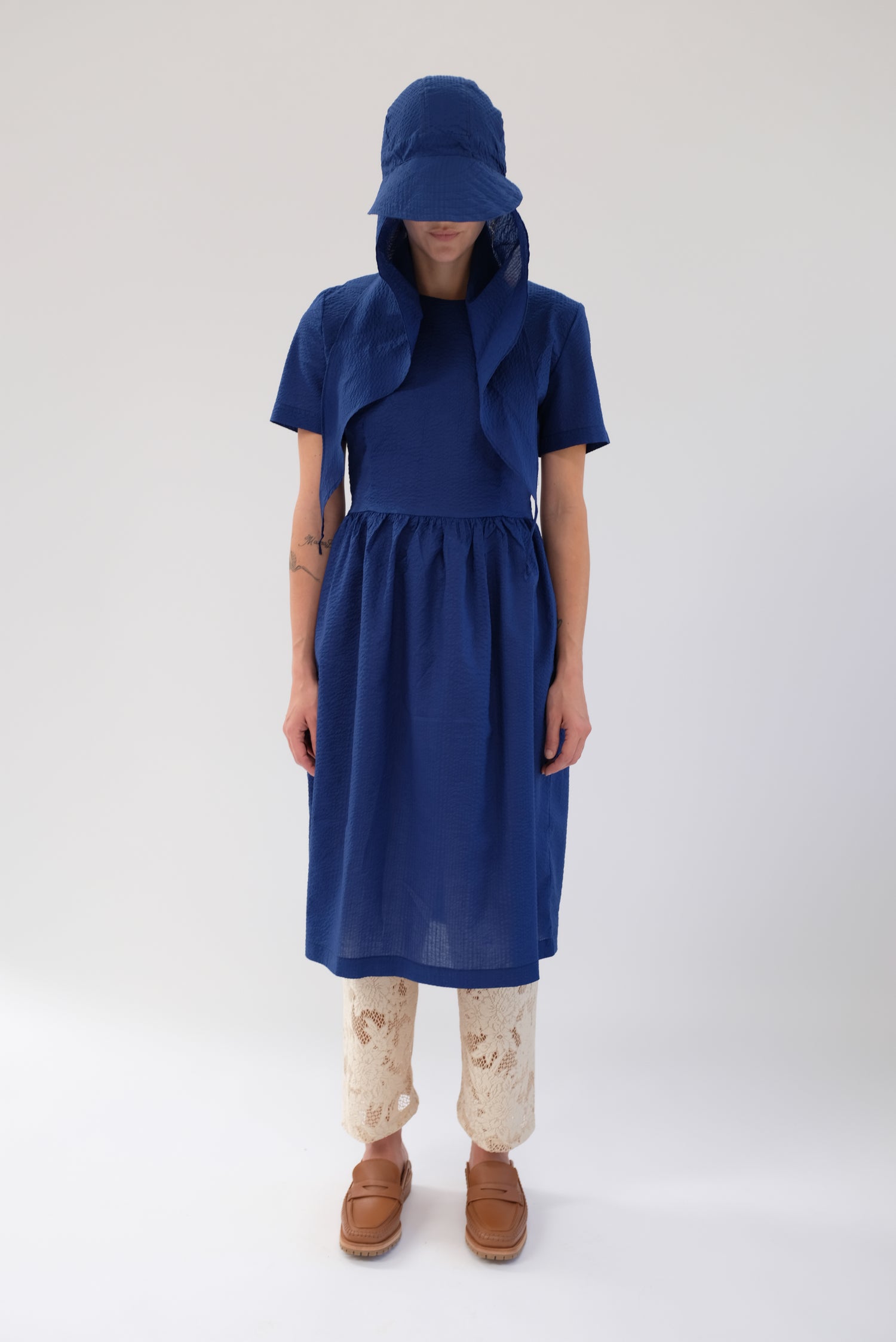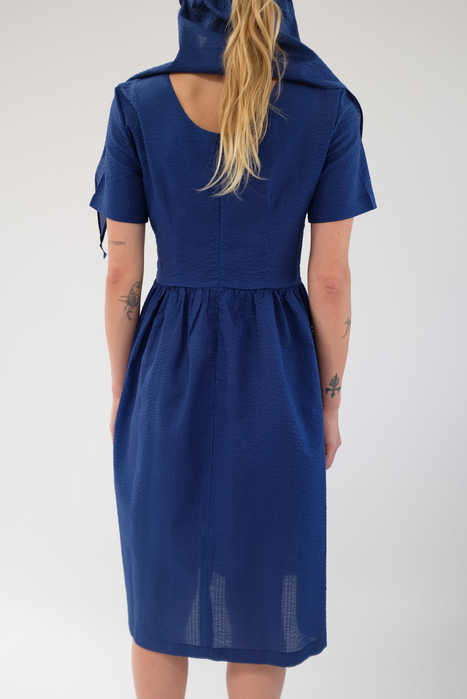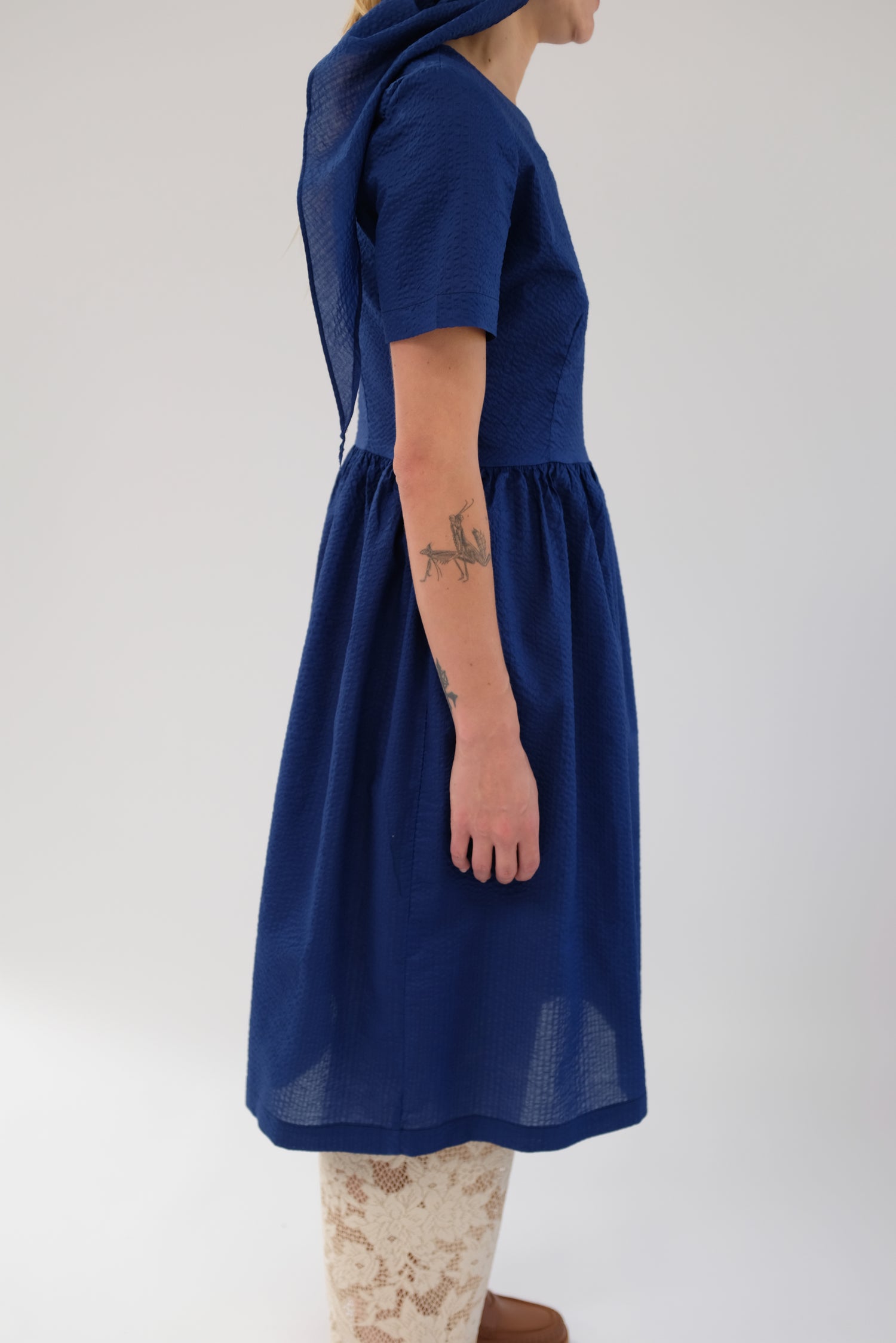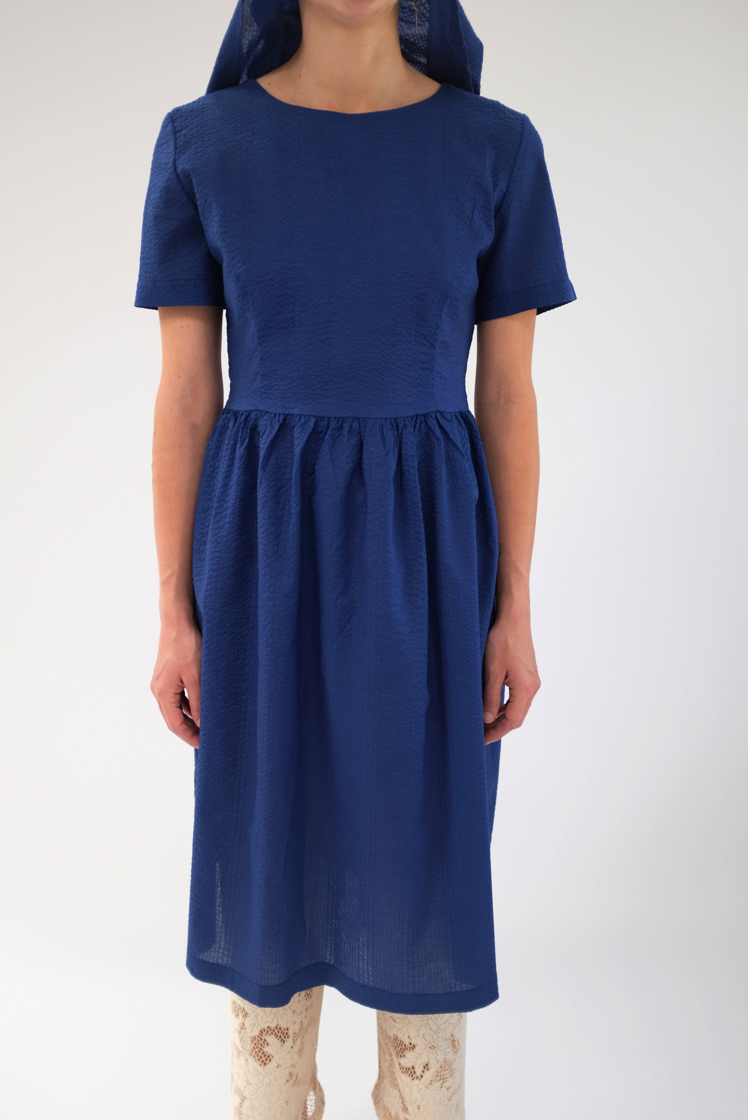 100% Woven textured Japanese cotton, fitted waist and upper, short sleeve, full skirt hits just below knee, zipper in back. Semi-sheer fabric, classic fit. Total length 41"