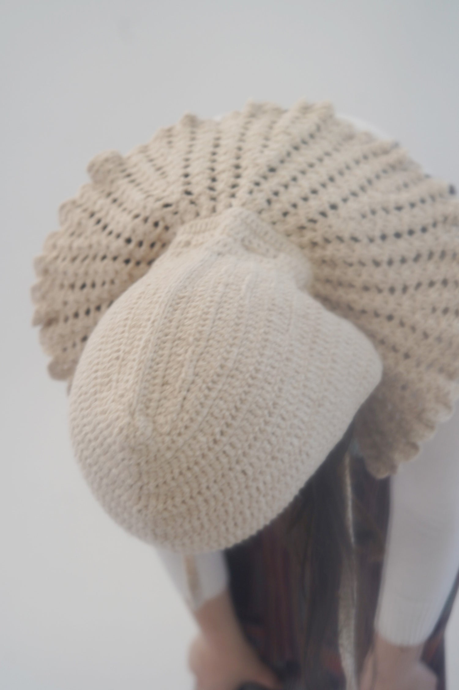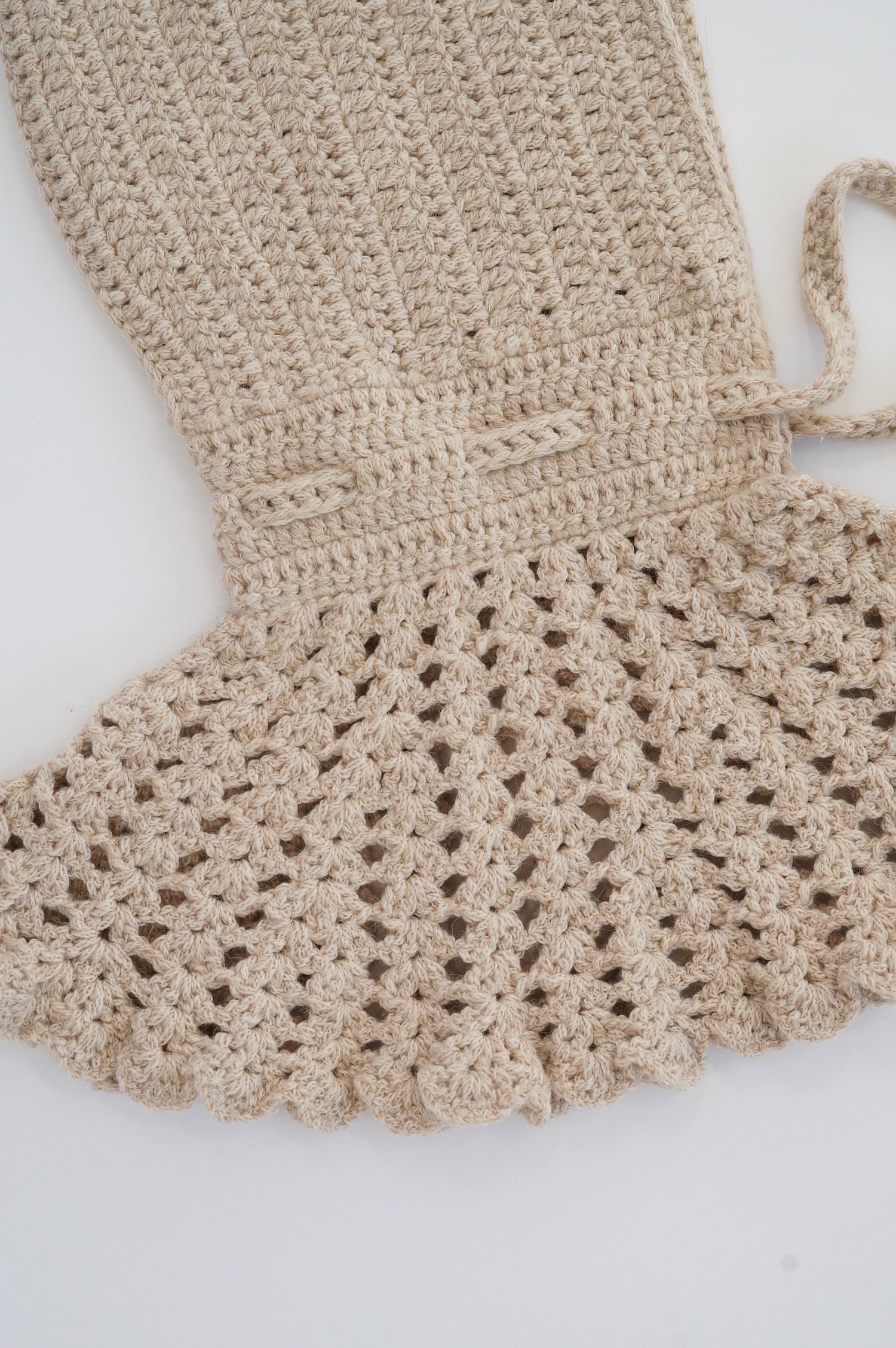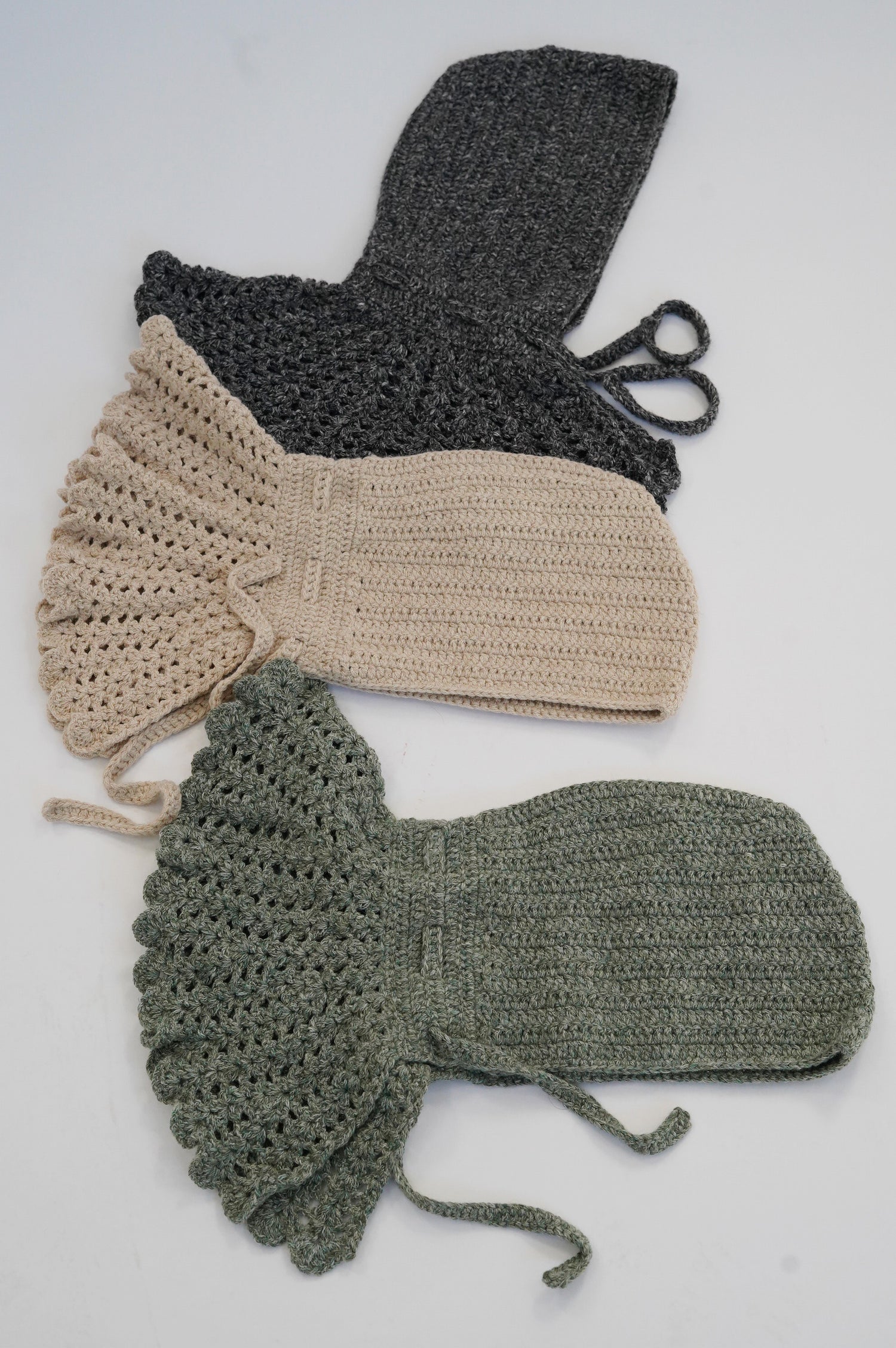 Hand crocheted, adjustable tie, warm, open lace crochet collar. 68% Baby alpaca, 32% pima cotton. One size fits most. Unisex.