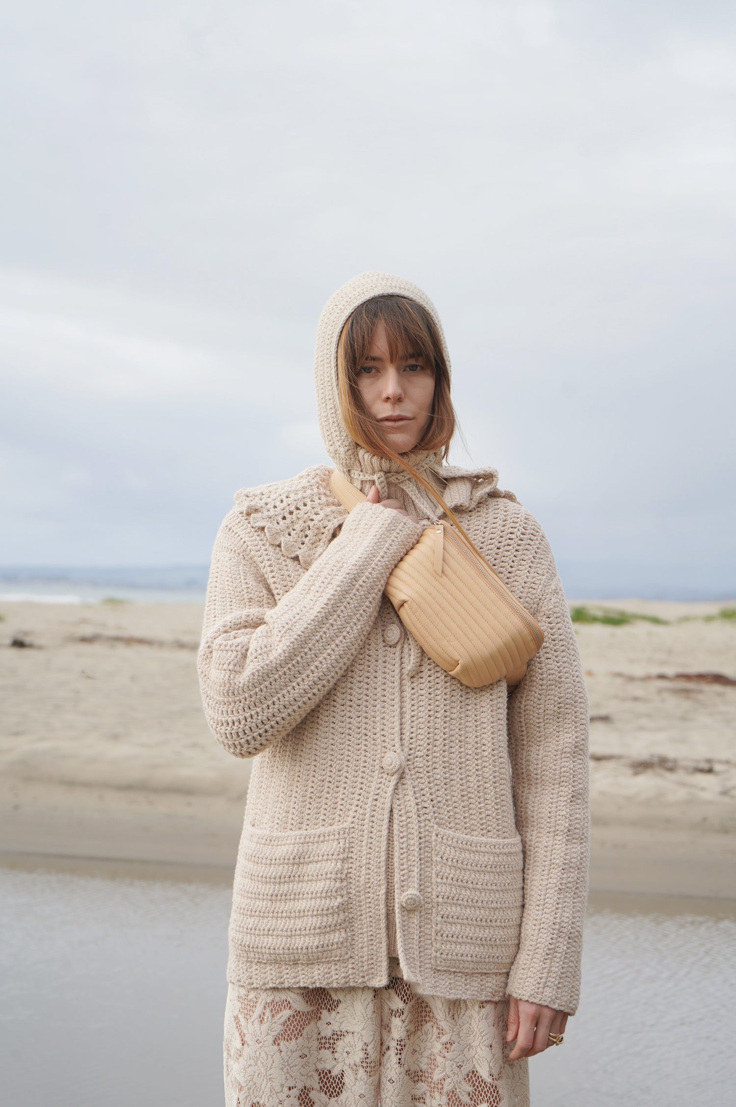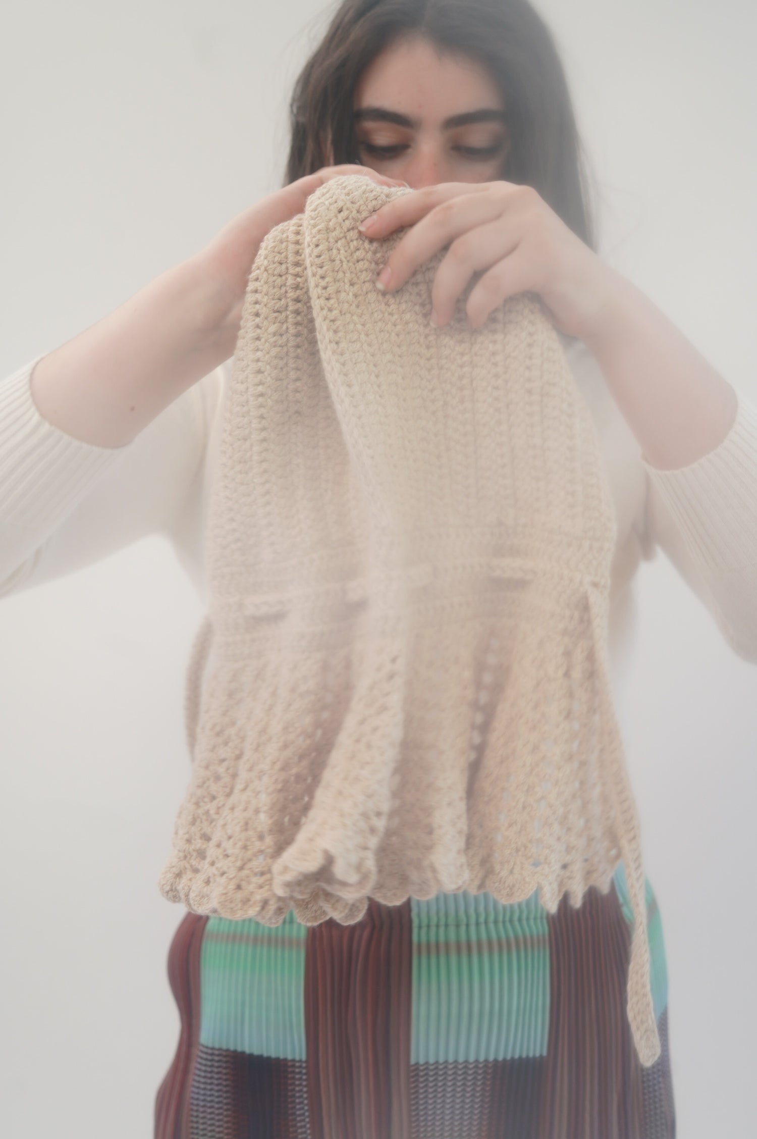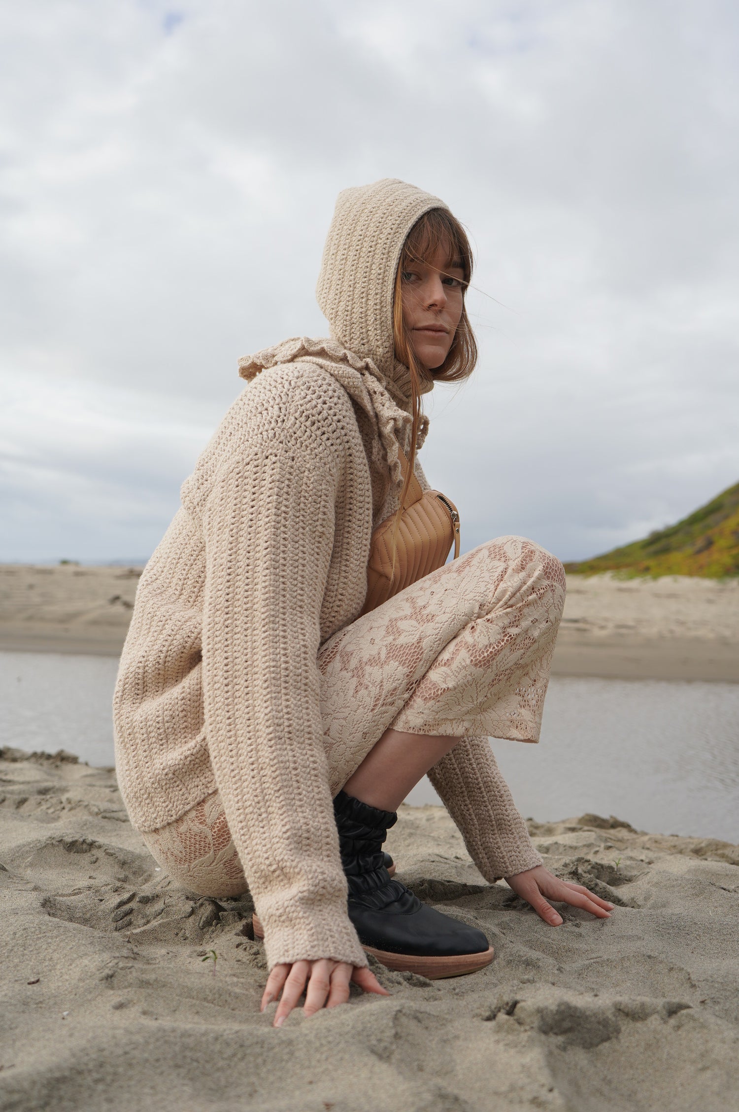 Hand crocheted, adjustable tie, warm, open lace crochet collar. 68% Baby alpaca, 32% pima cotton. One size fits most. Unisex.