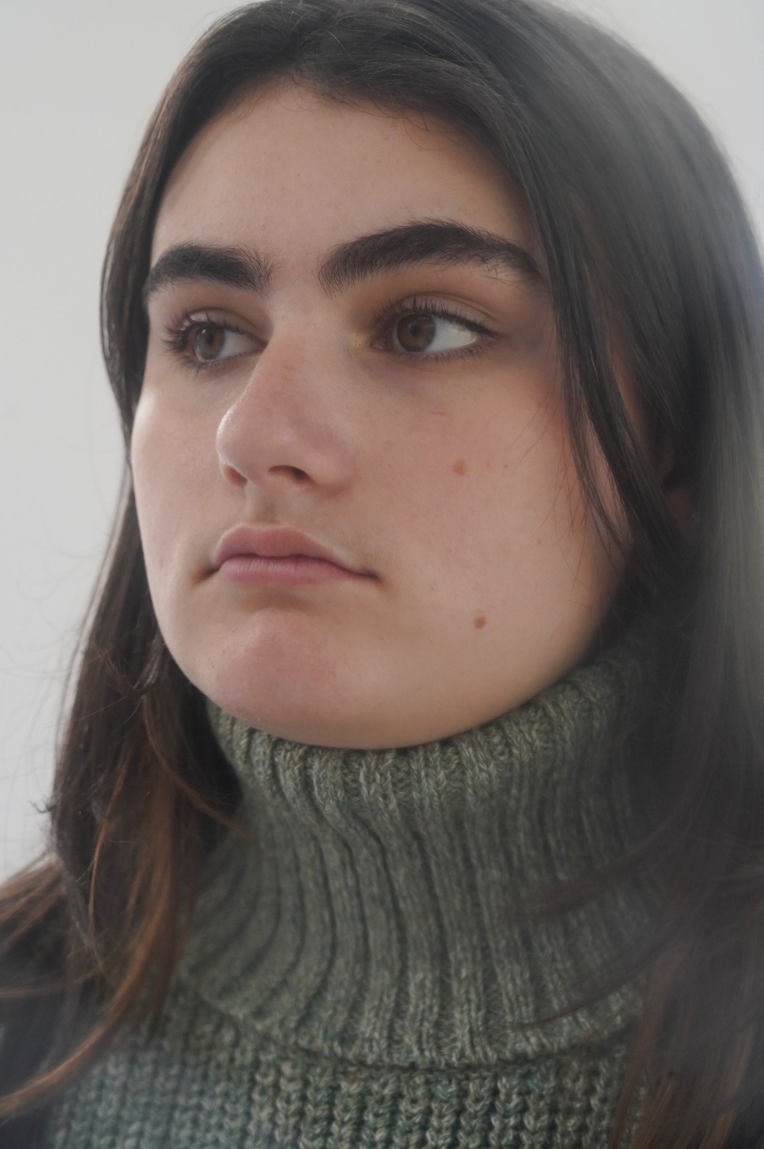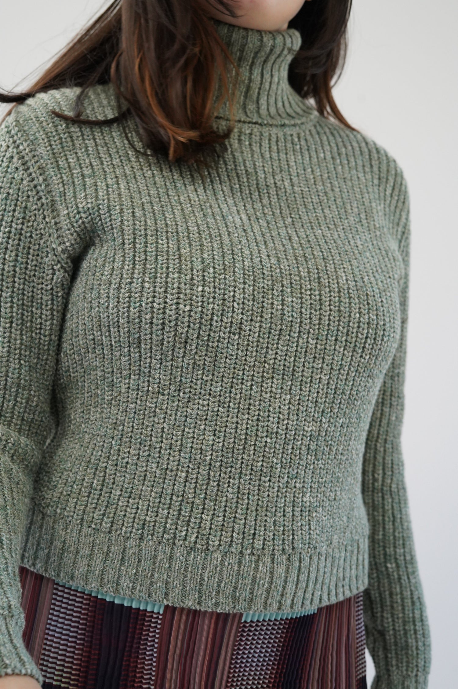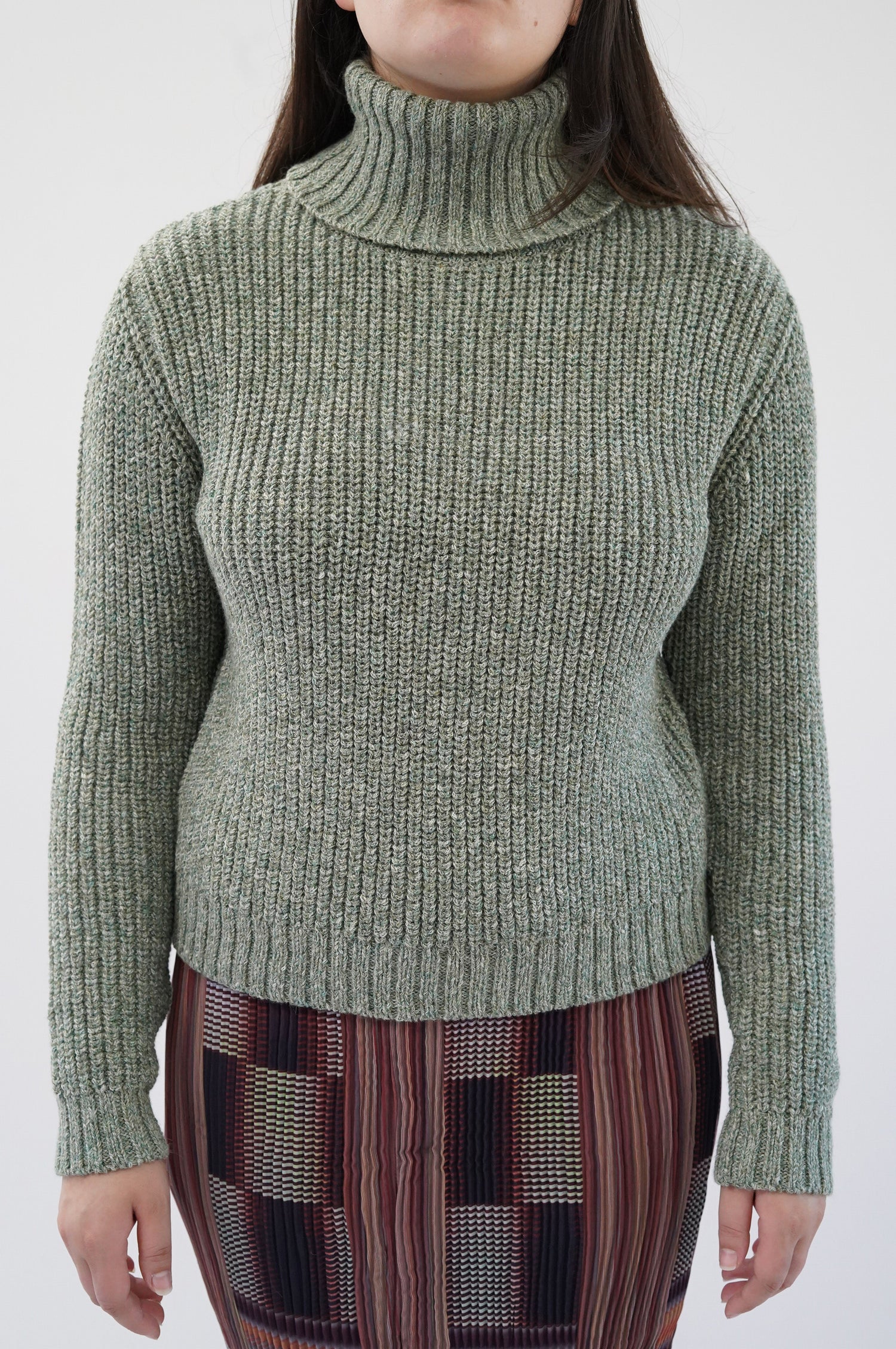The most luxurious hand knit sweater we have ever made. You won’t want to wear anything under it, or take it off. Ultimate comfort object that will draw you in first thing in the morning. 9" ribbed turtleneck, 2" ribbing at cuff and waist. 68% Baby alpaca, 32% pima cotton. Model is wearing size s/m.