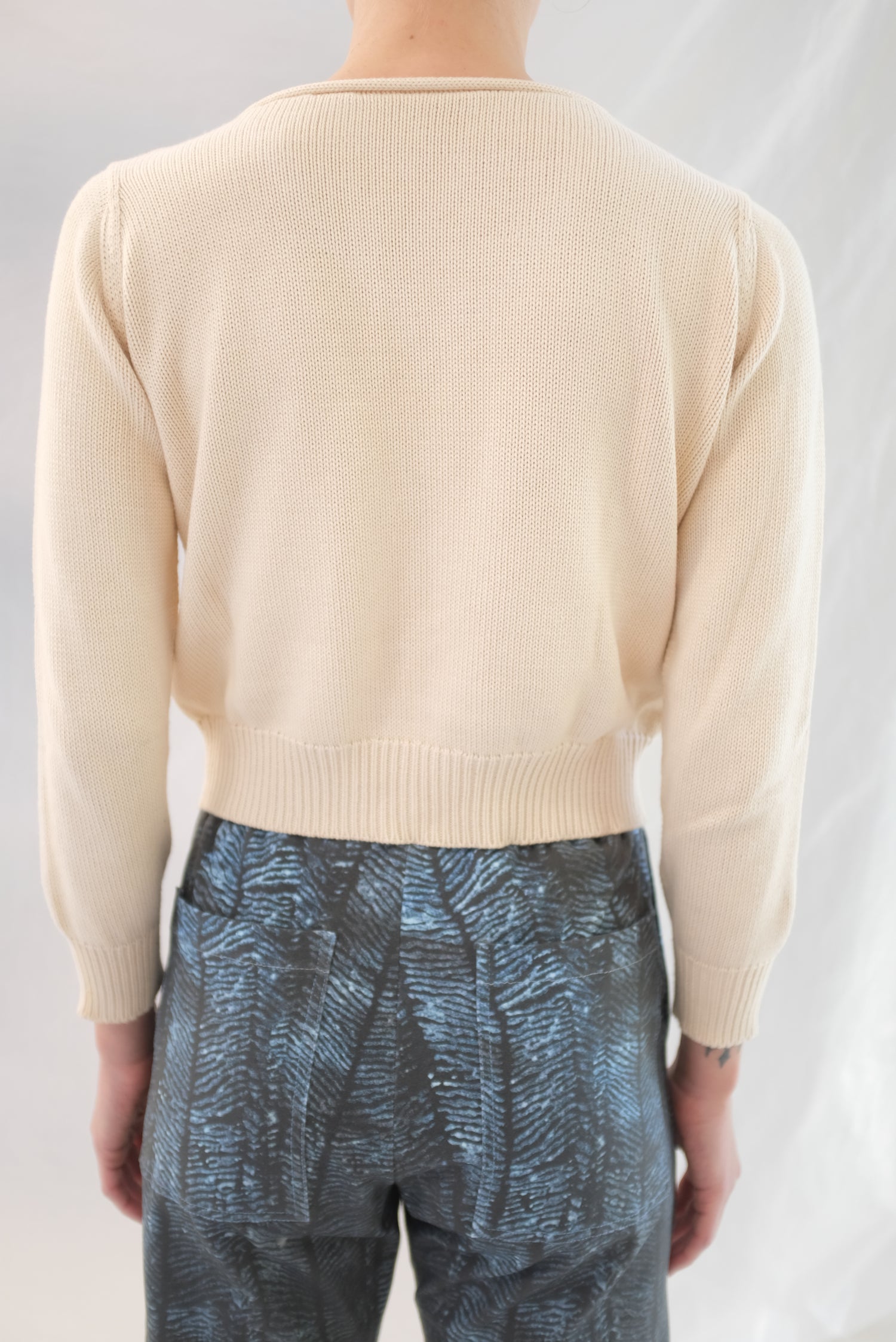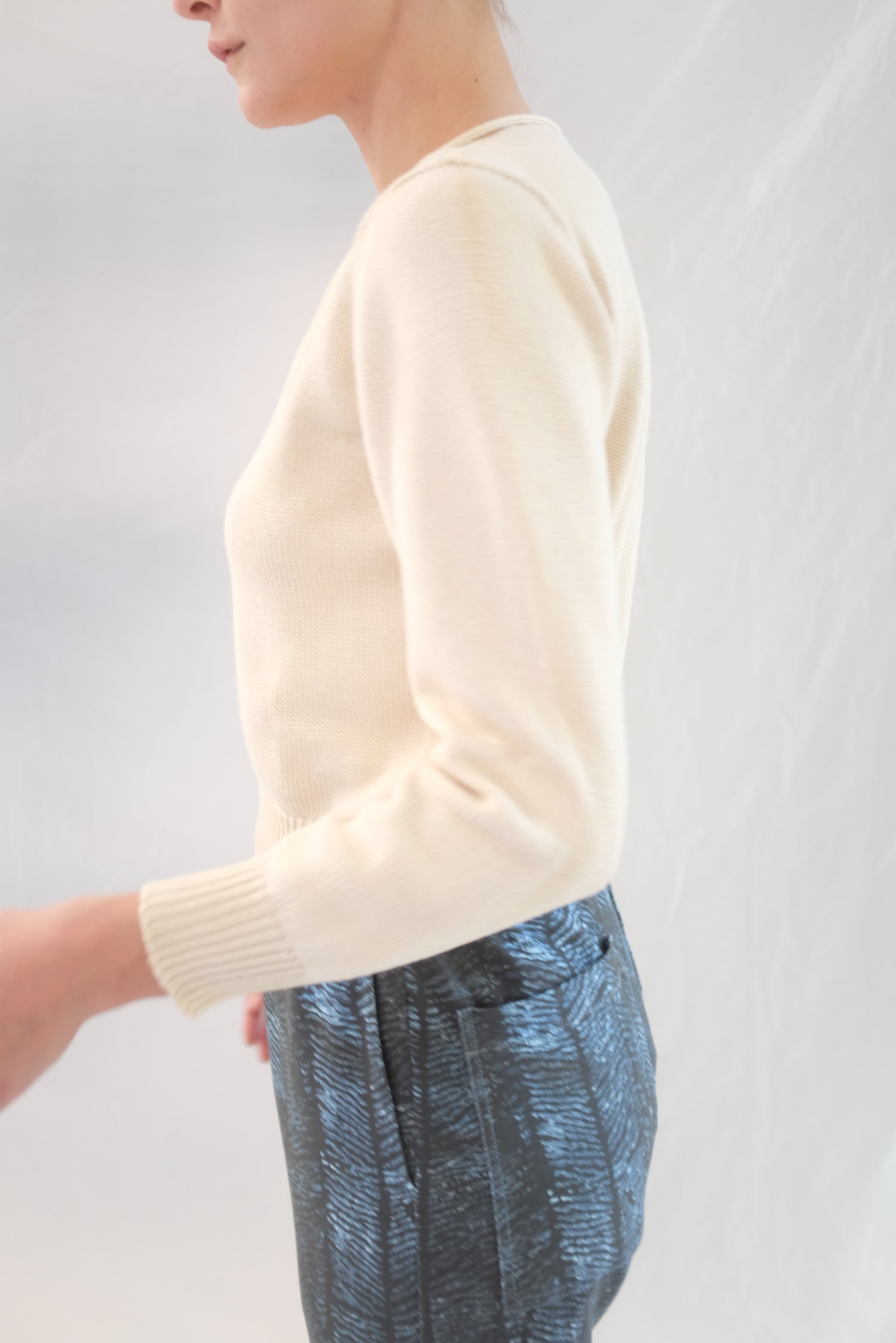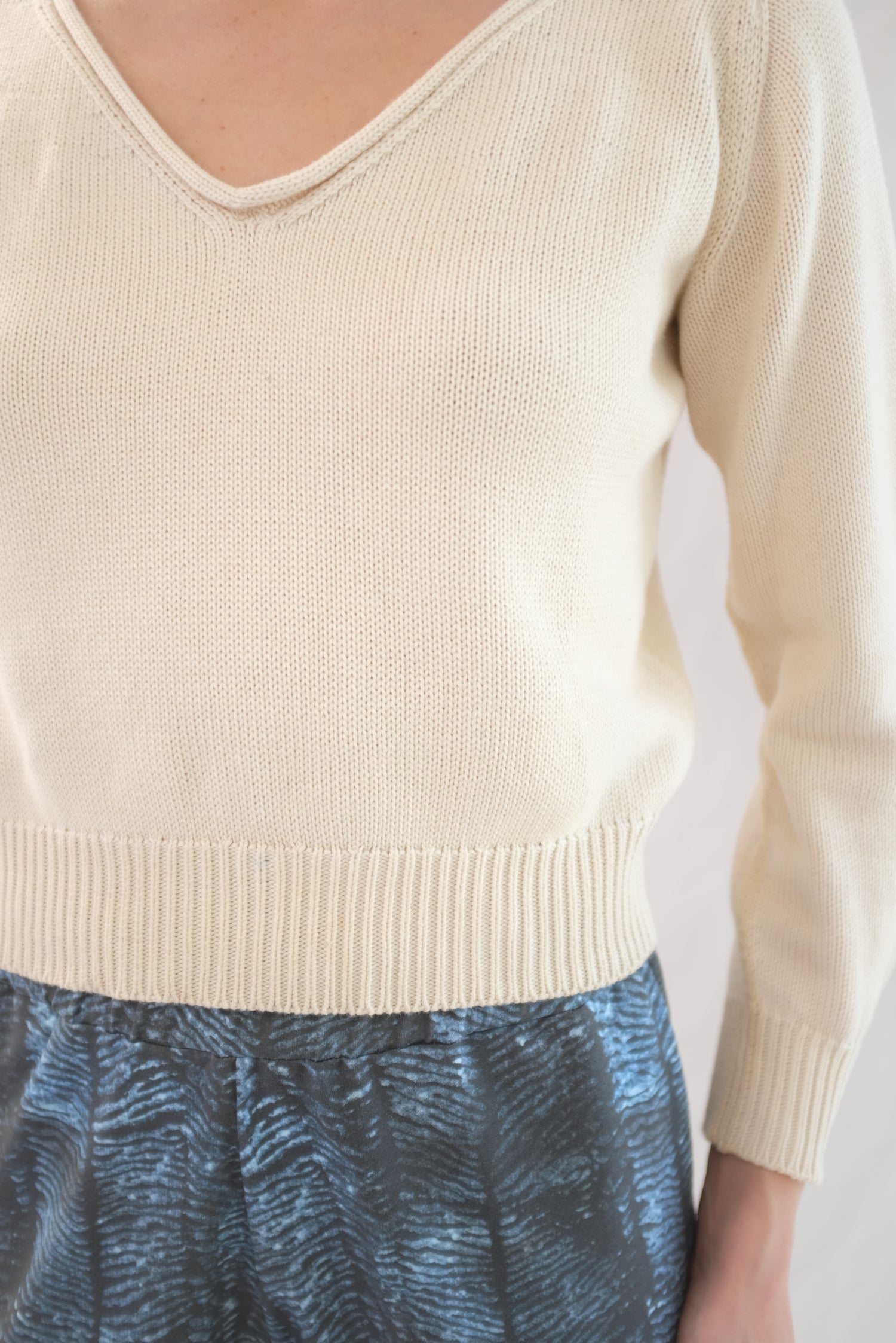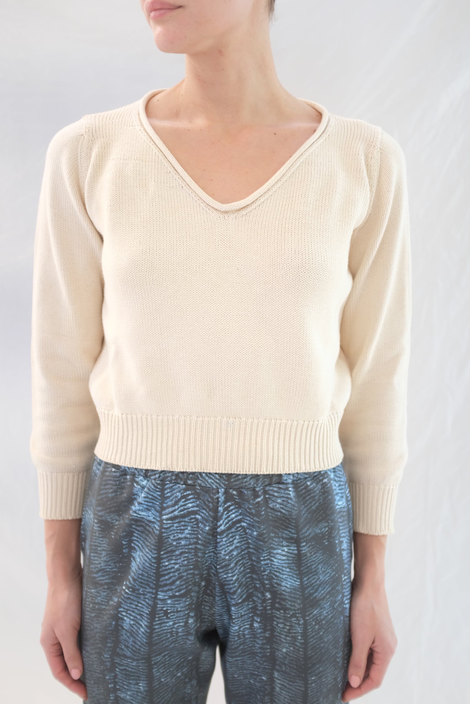 Hand knitted sweater top, long sleeved, 2.5” cuff at waist and wrist, rolled detail on v-neckline. 100% Organic pima cotton. Exclusive to Beklina. Soft luxurious cotton yarn, that wears and washes like a dream. A shop favorite.