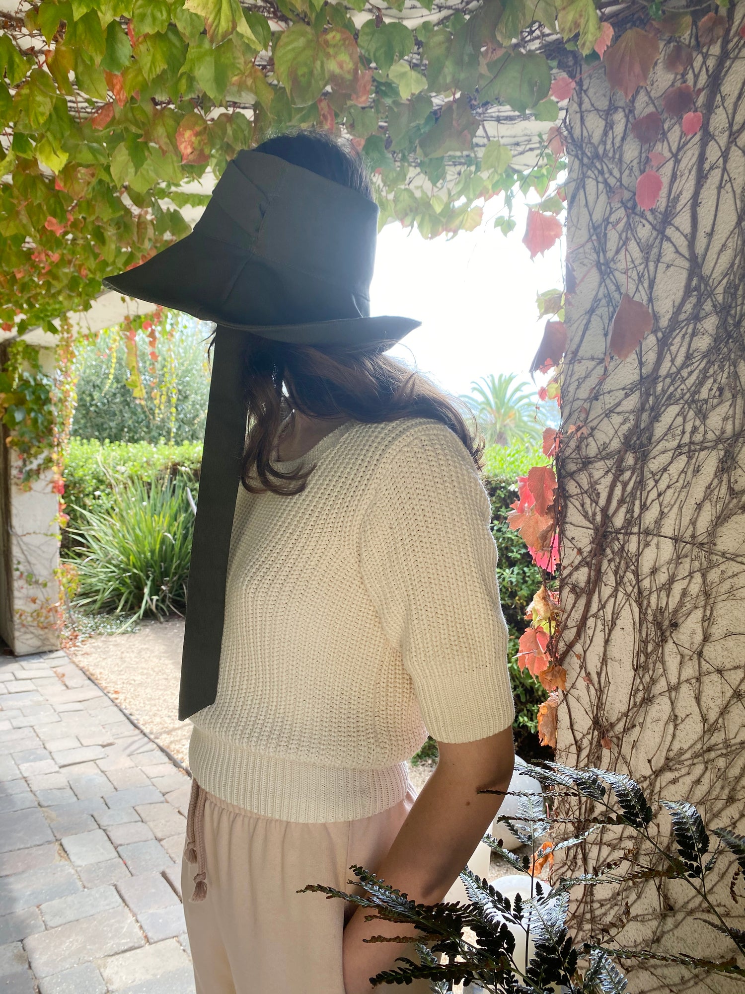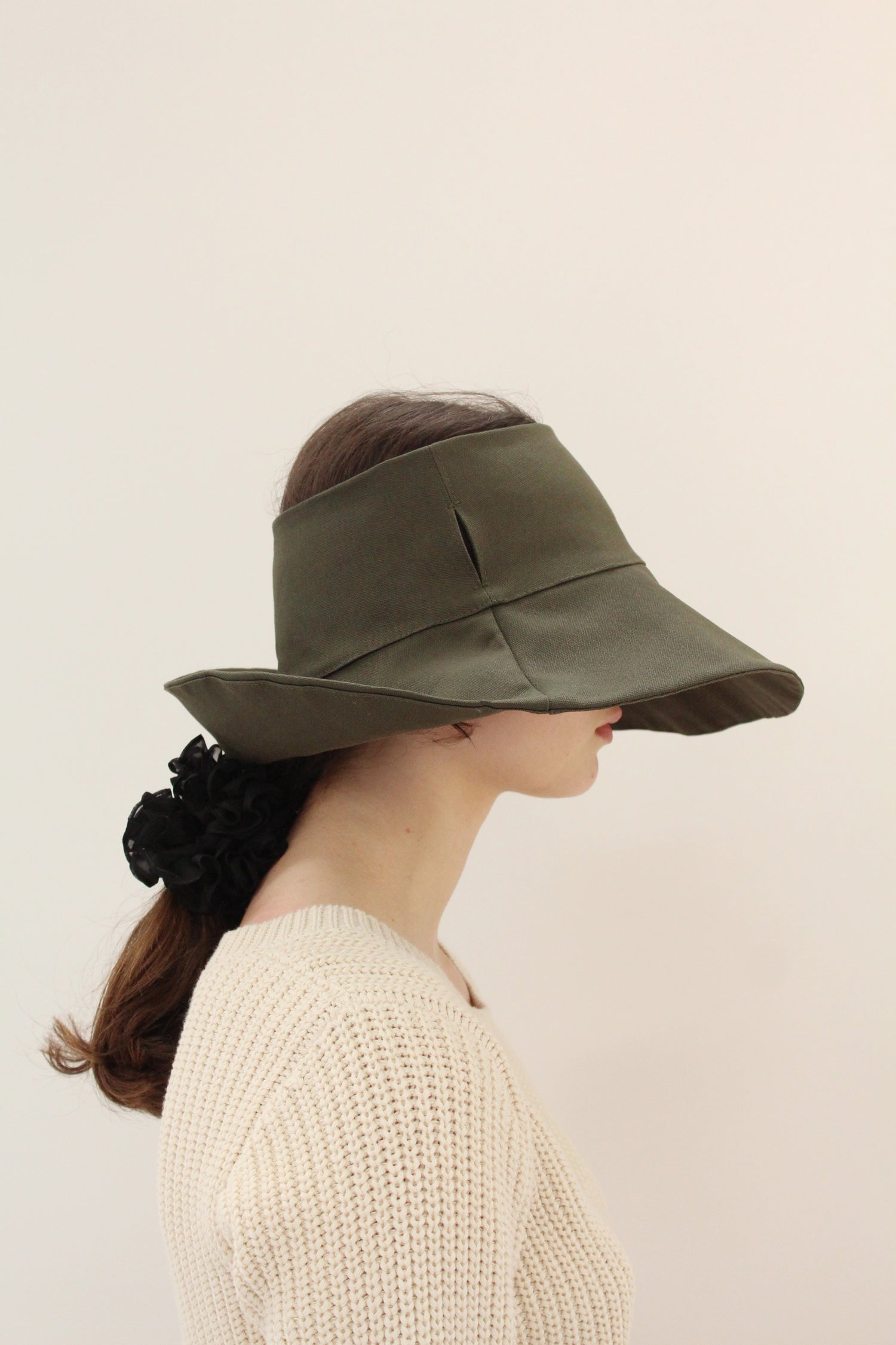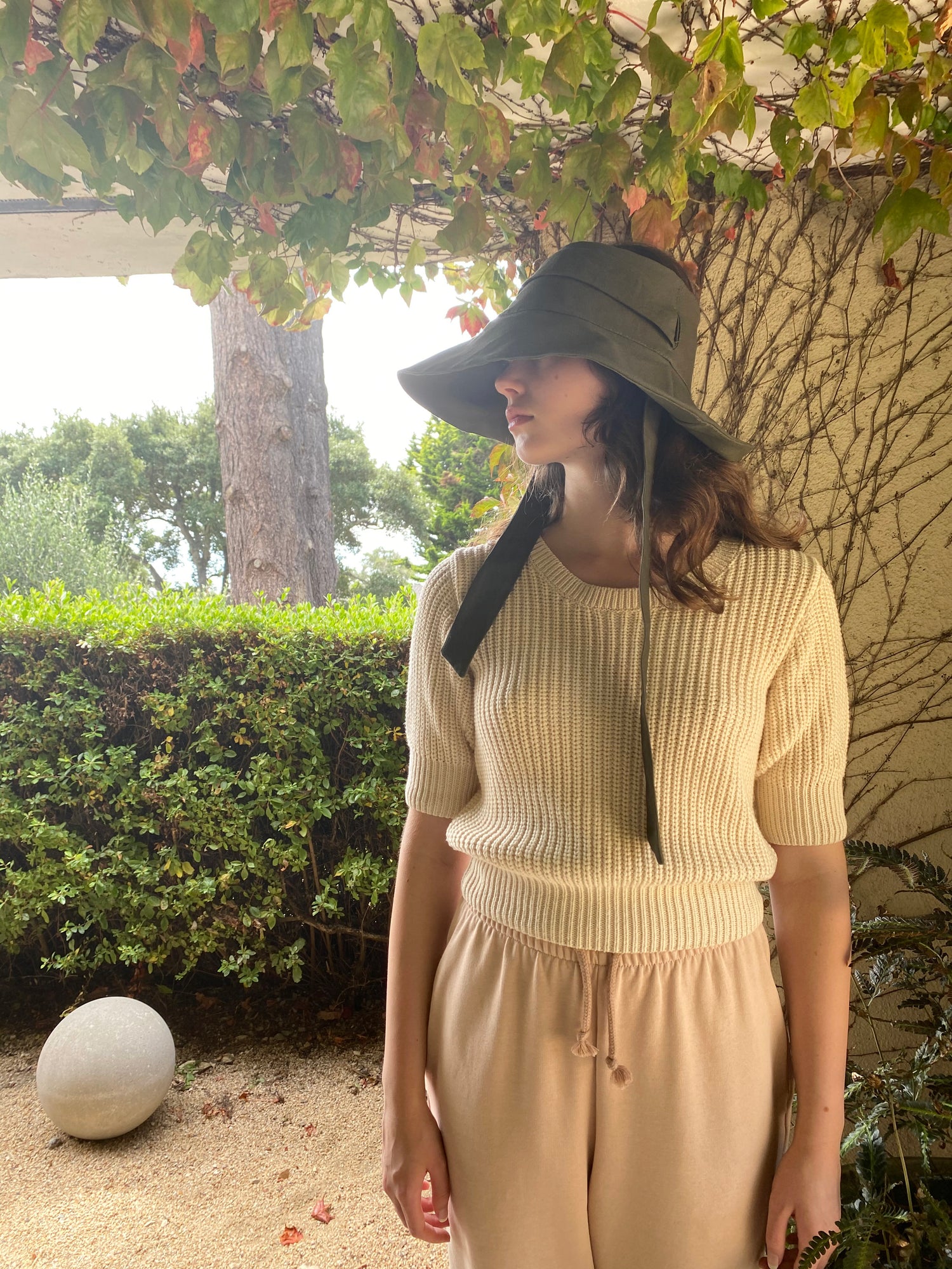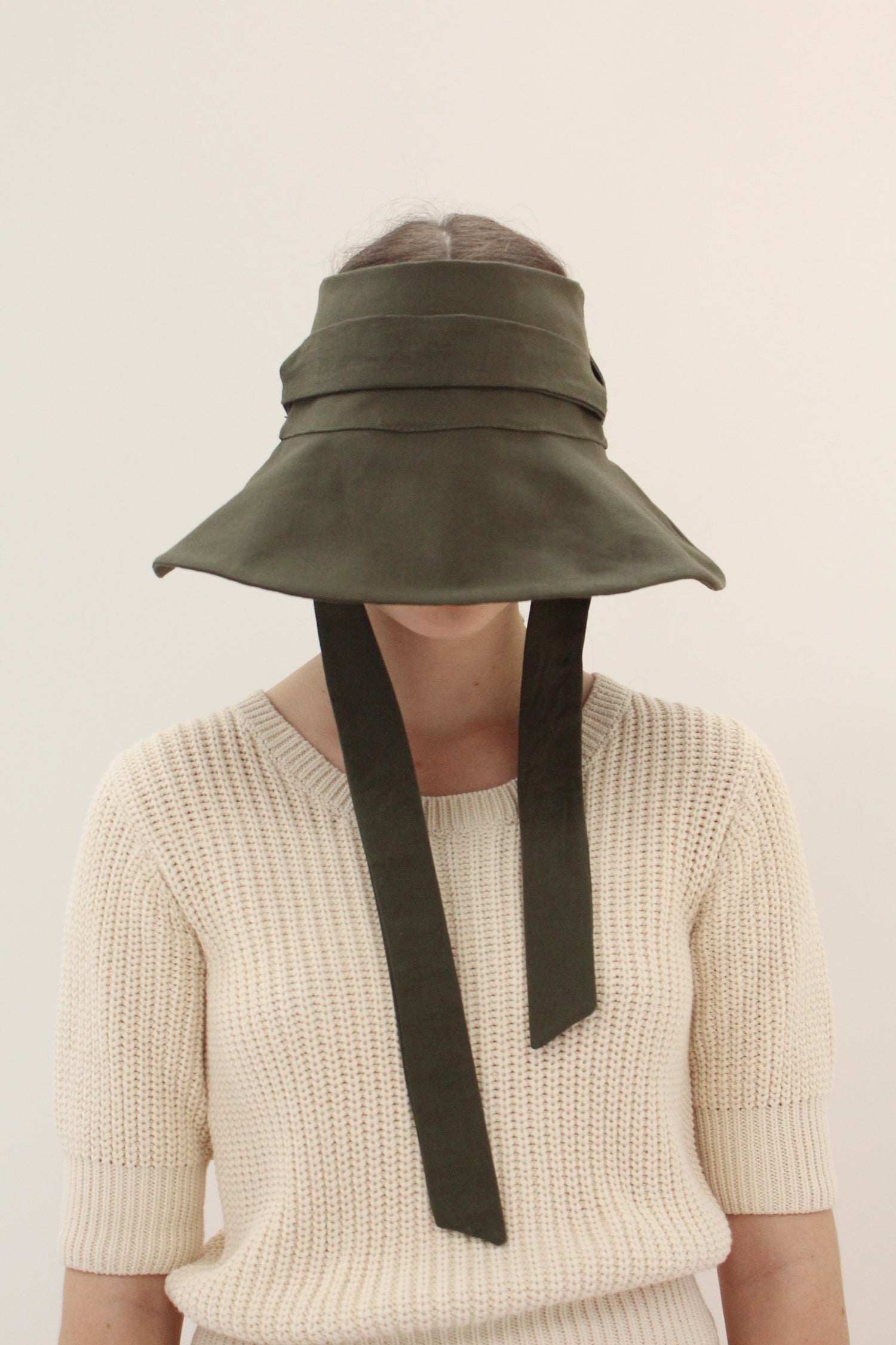 Versatile sun hat with removable tie that can be worn in several ways, or removed. 100% Cotton canvas, topless, allowing for one size fits most heads, 22"-23.25”. Travels well and washable. Great sun protection.