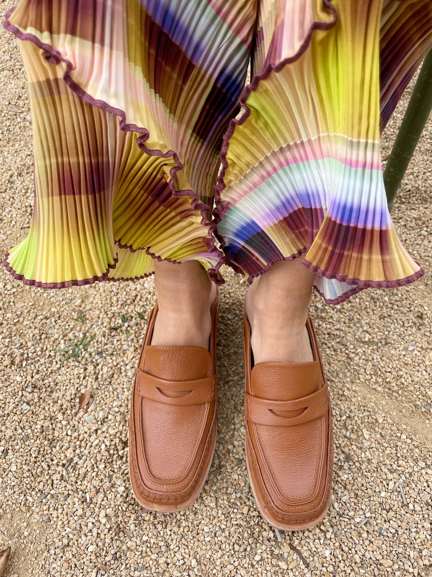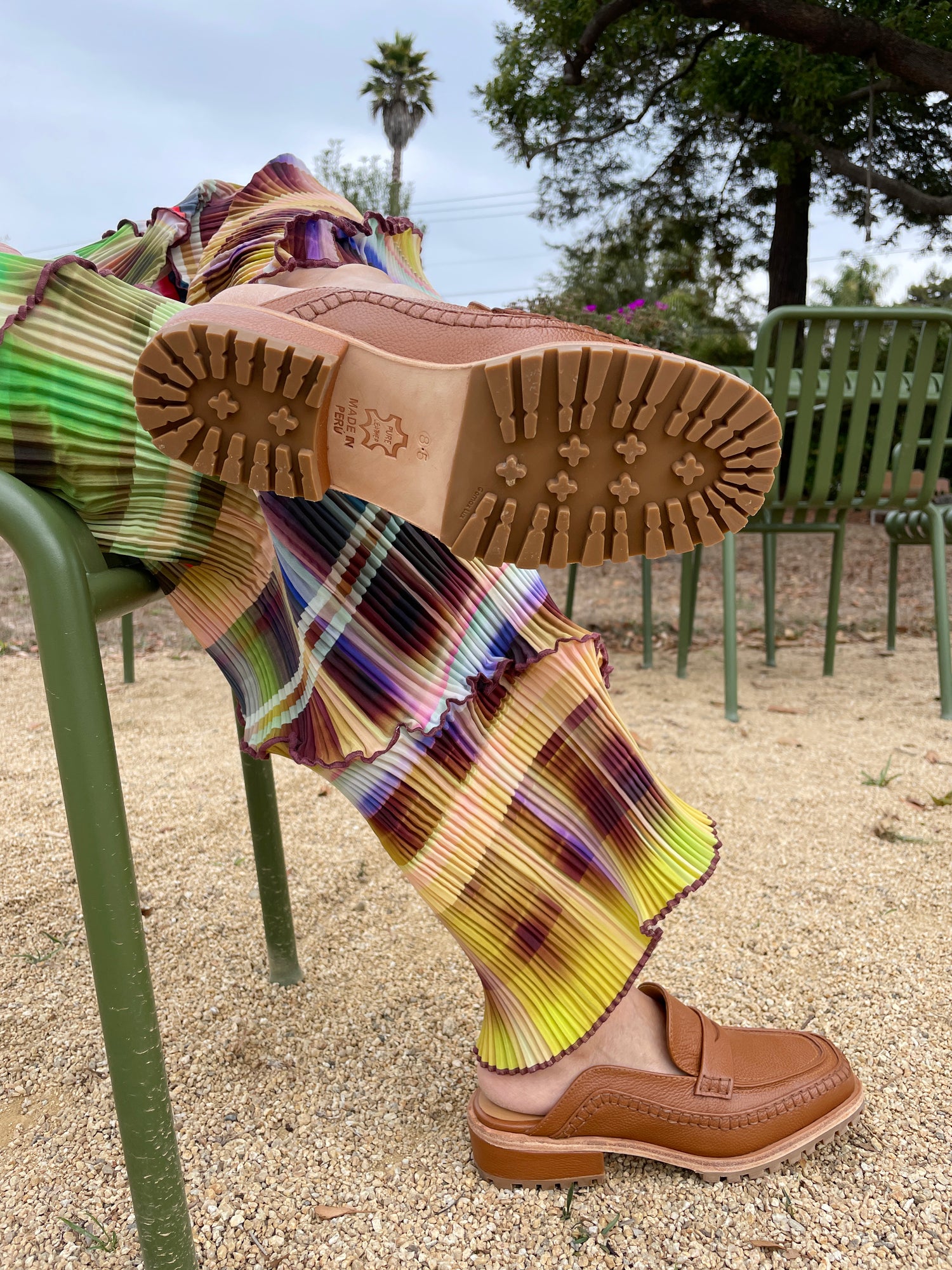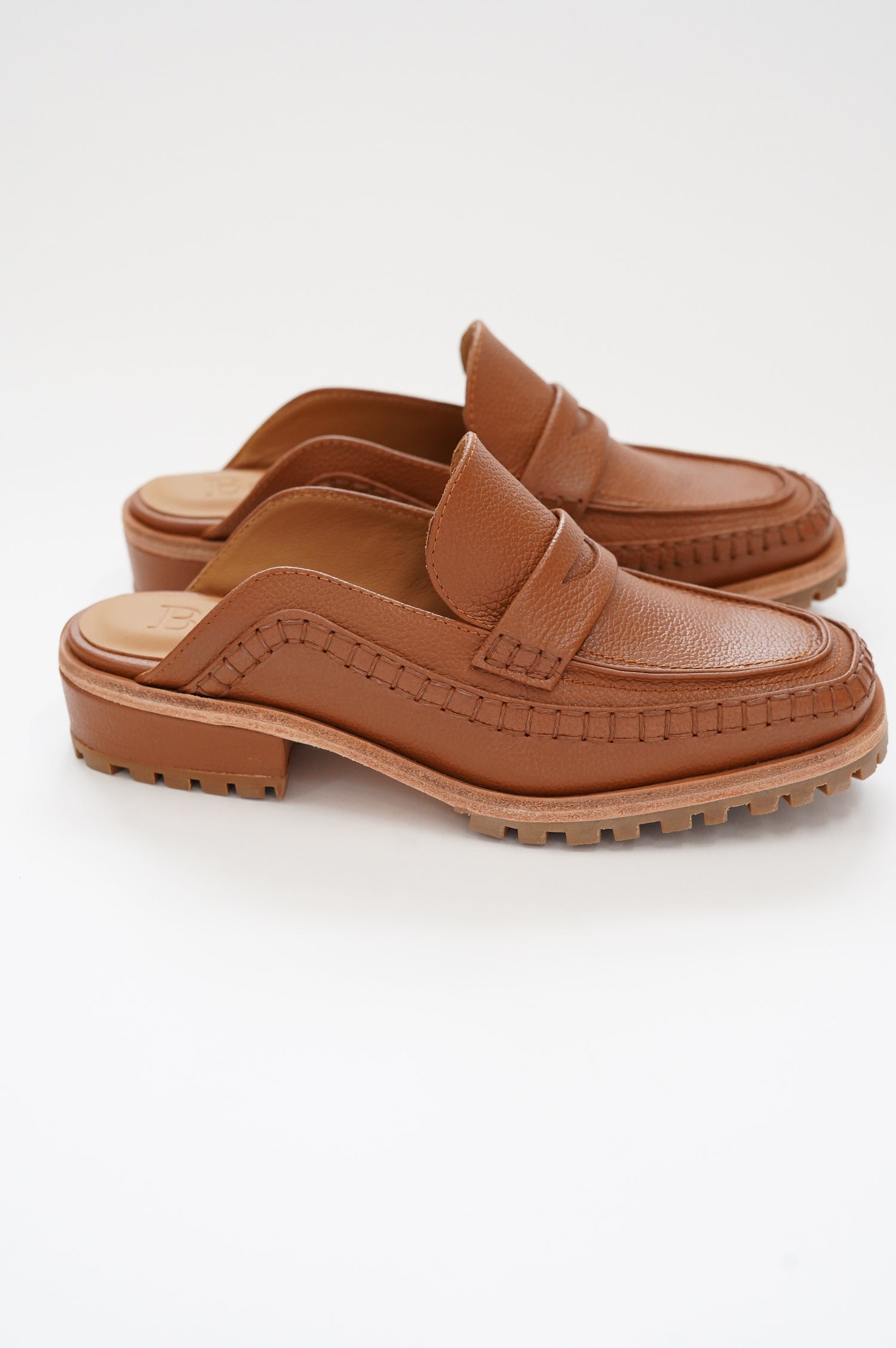 Tailored classic penny loafer in a comfy slip on mule. Pebbled leather upper, tread bottoms, beautiful walking shoe. 1.5" Leather stacked heel, welt. Running true to size.