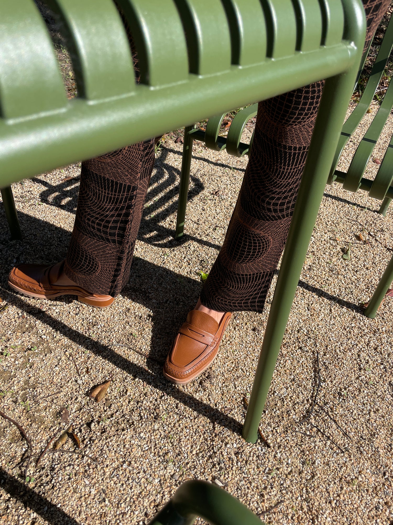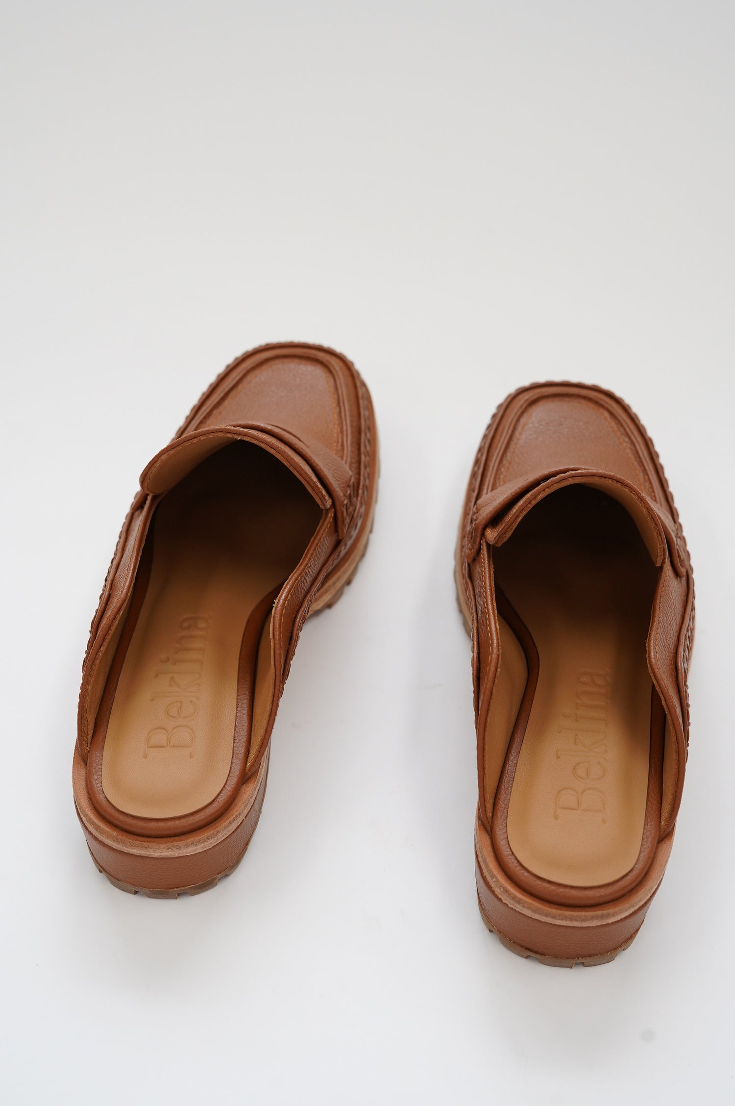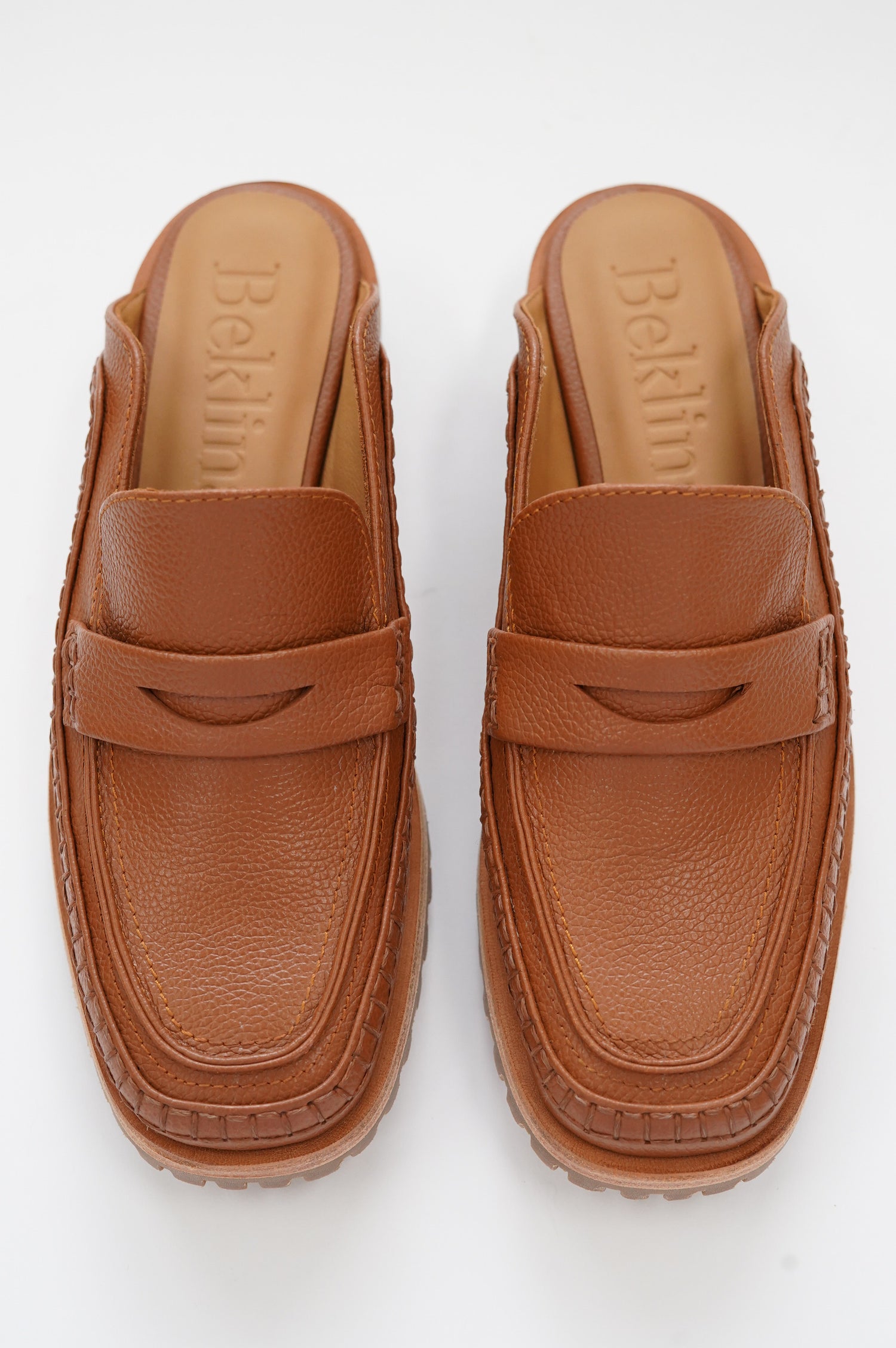 Tailored classic penny loafer in a comfy slip on mule. Pebbled leather upper, tread bottoms, beautiful walking shoe. 1.5" Leather stacked heel, welt. Running true to size.