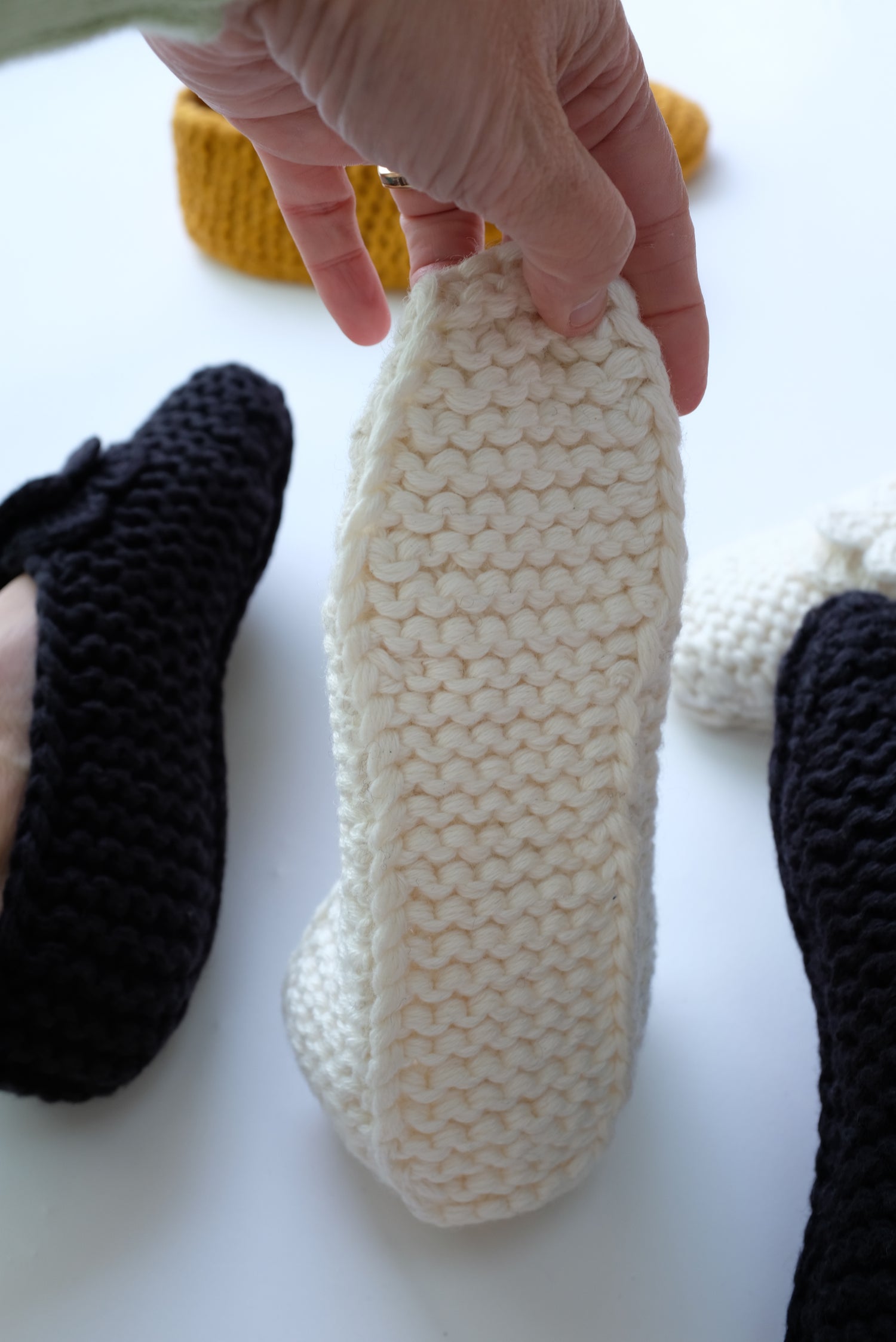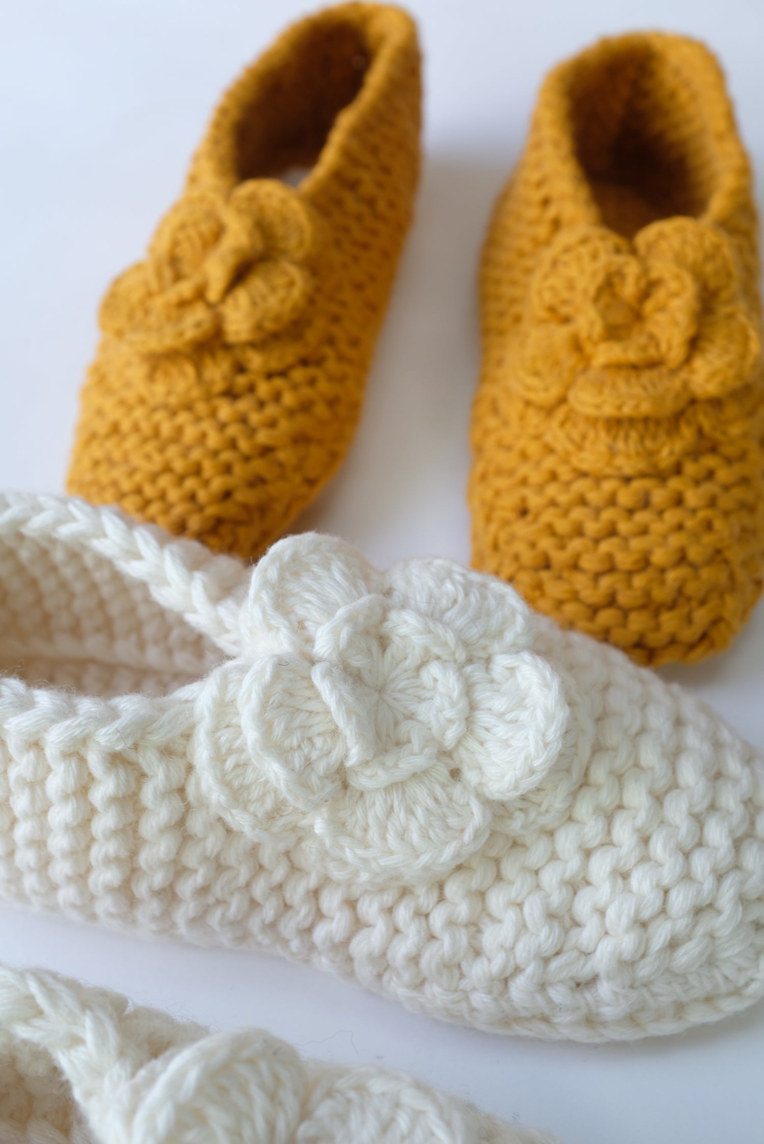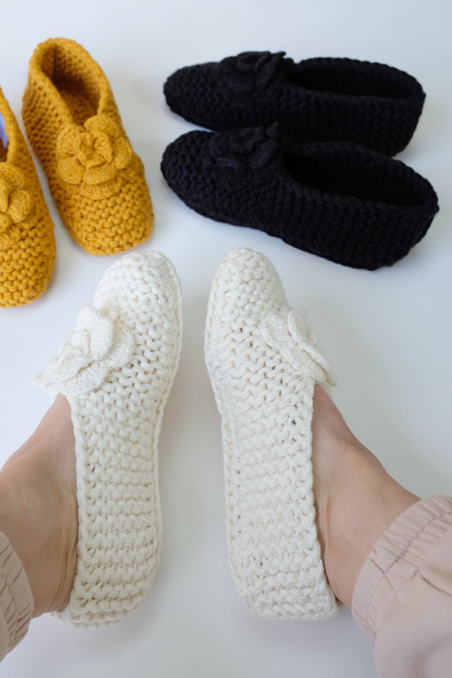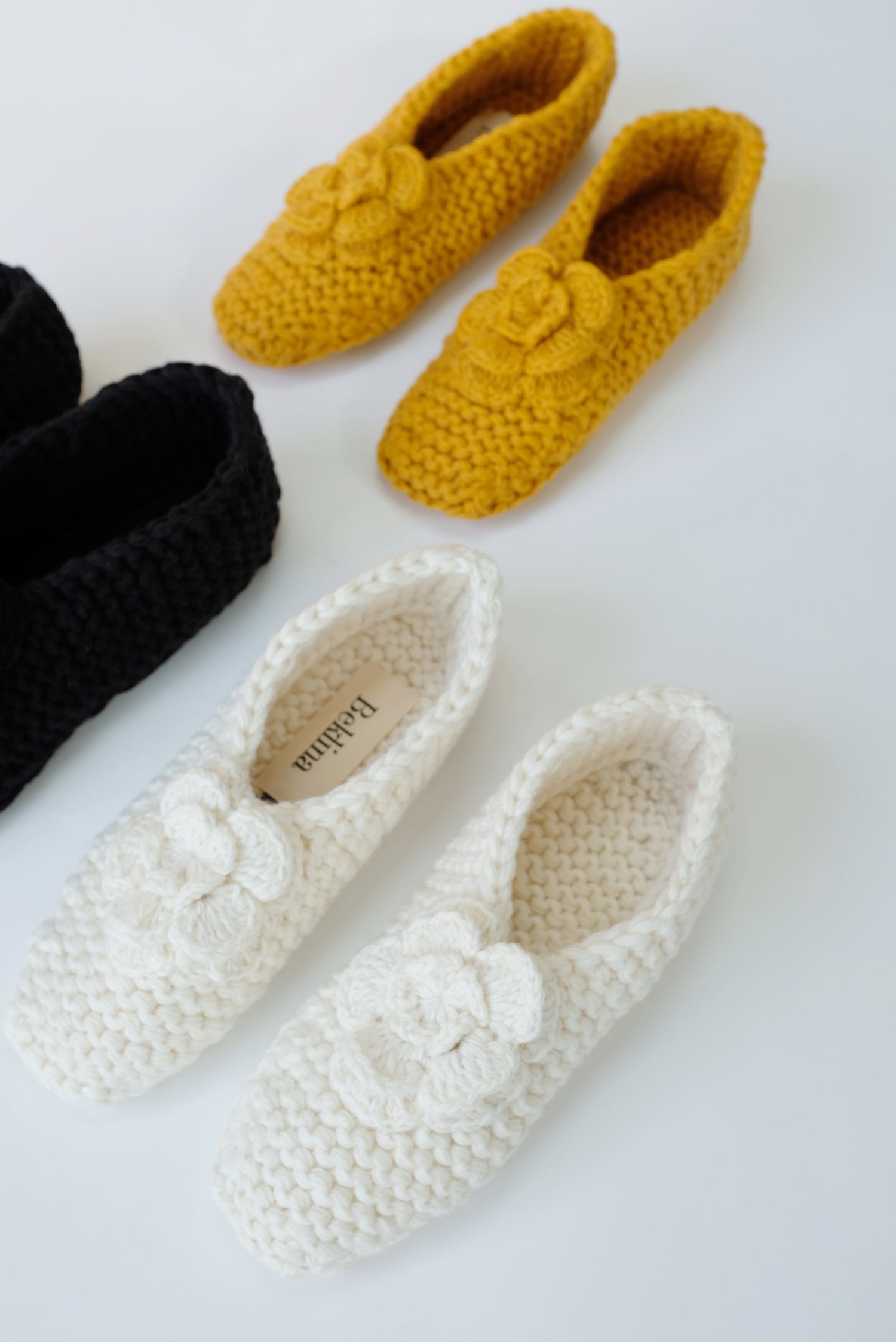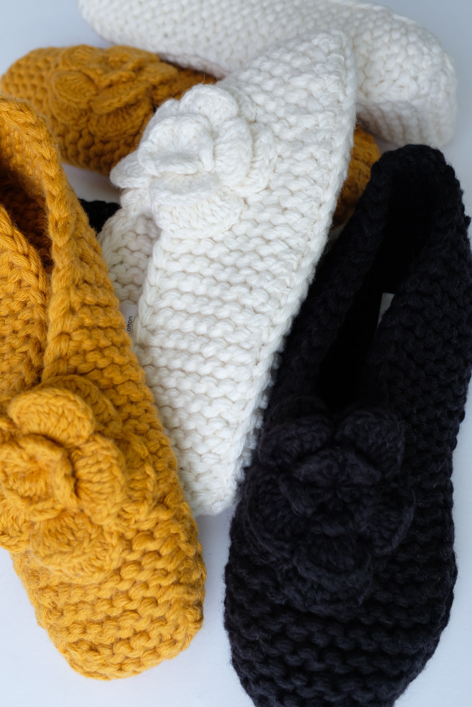Beautifully hand knit slippers. 70% cotton and 30% virgin wool, a comfortable and insulating blend that can be worn year round. A nostalgic design based off childhood slippers brought back from afar. Perfect gifts!