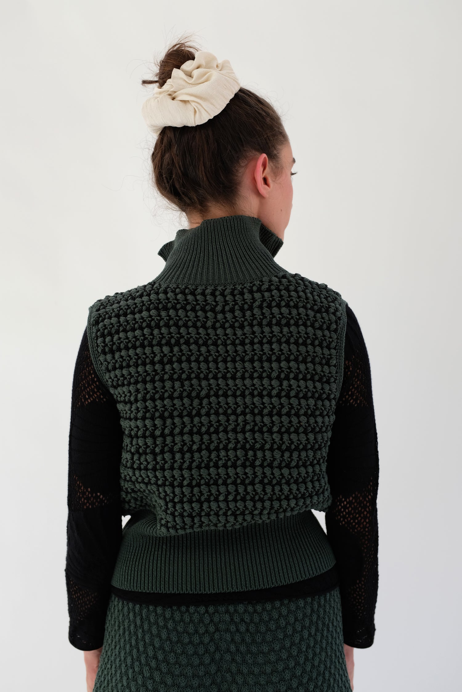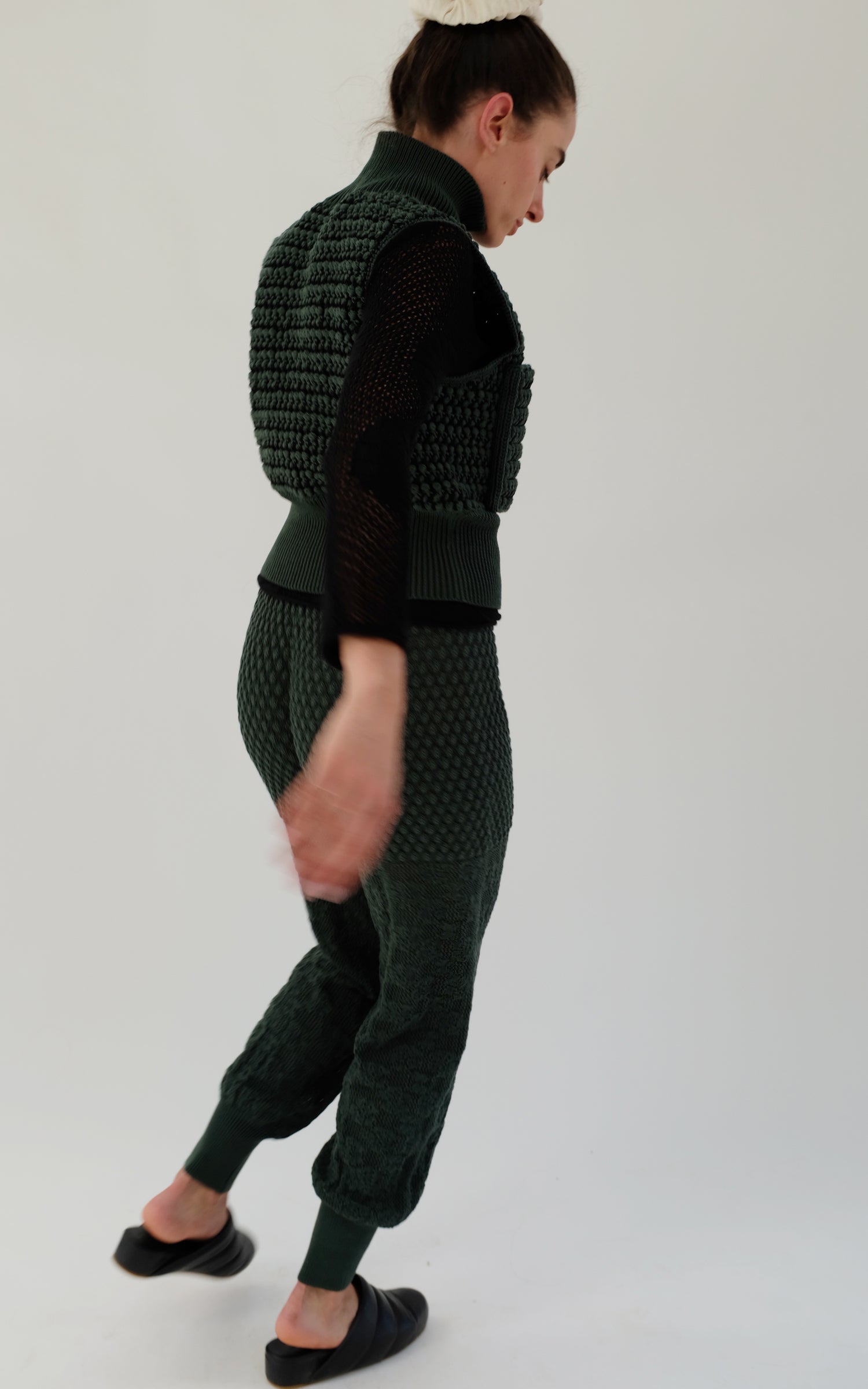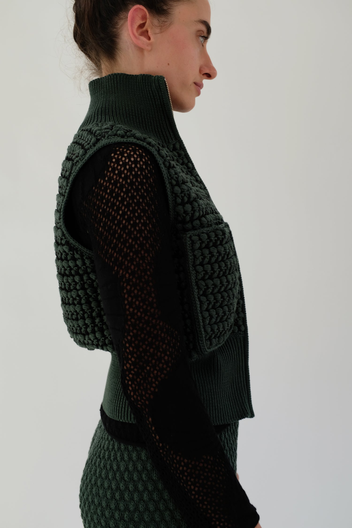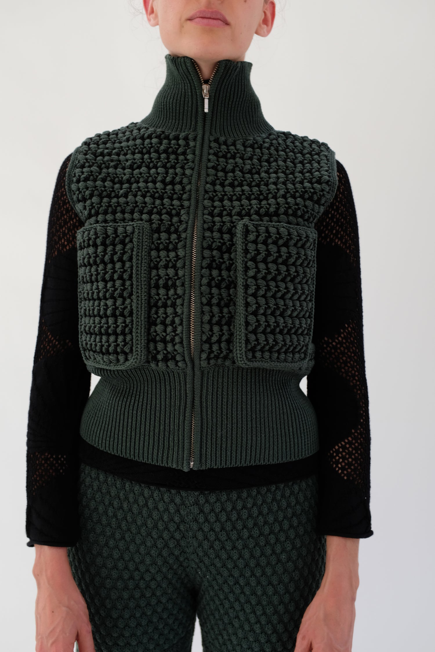 Ultra luxurious vest, crocheted by hand, thick and warm with the perfect amount of structure and weight. Pockets holds a cellphone, structured collar and body, completes a look, it’s all about the great fit and the pockets. Zip up front. 100% Pima cotton.
