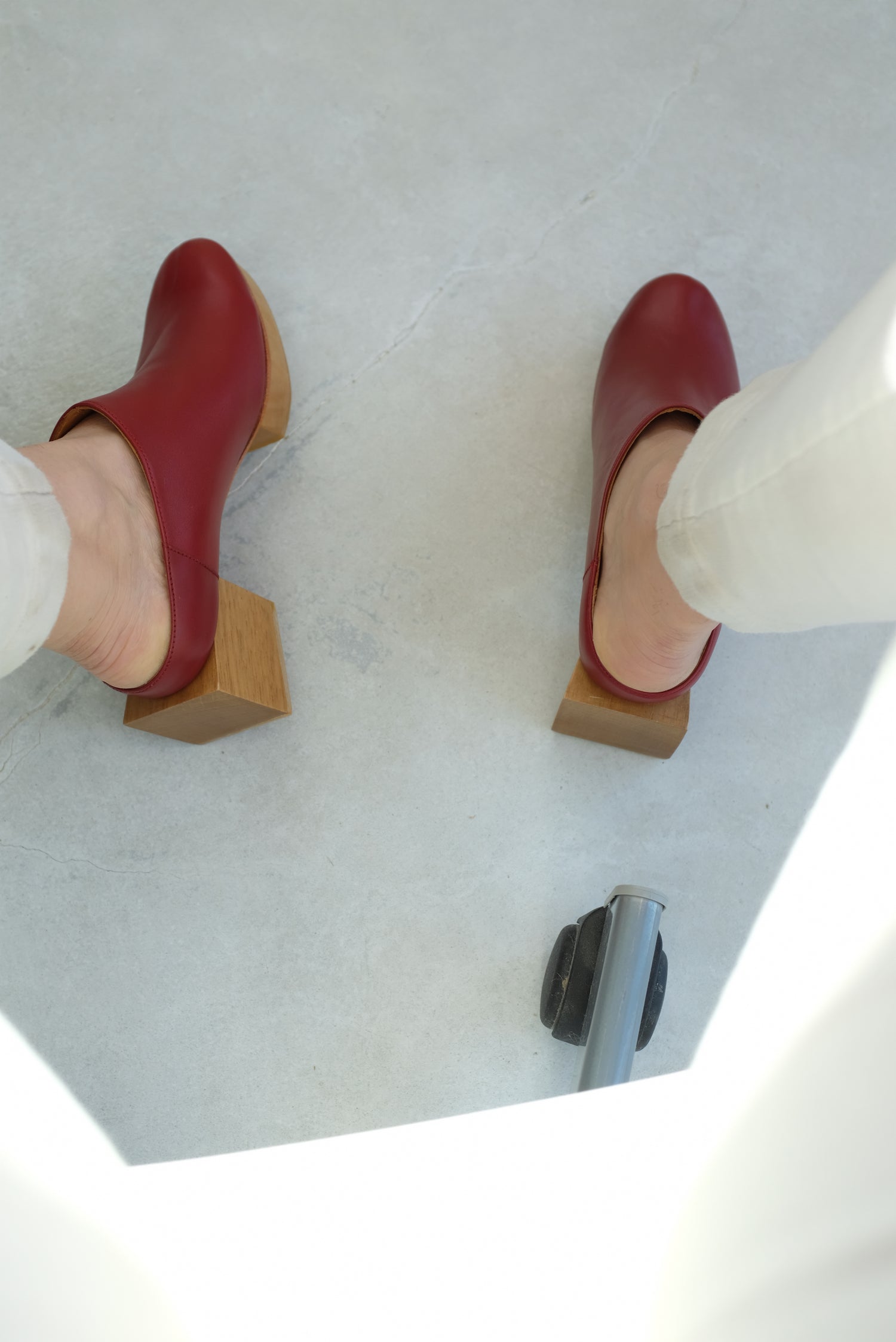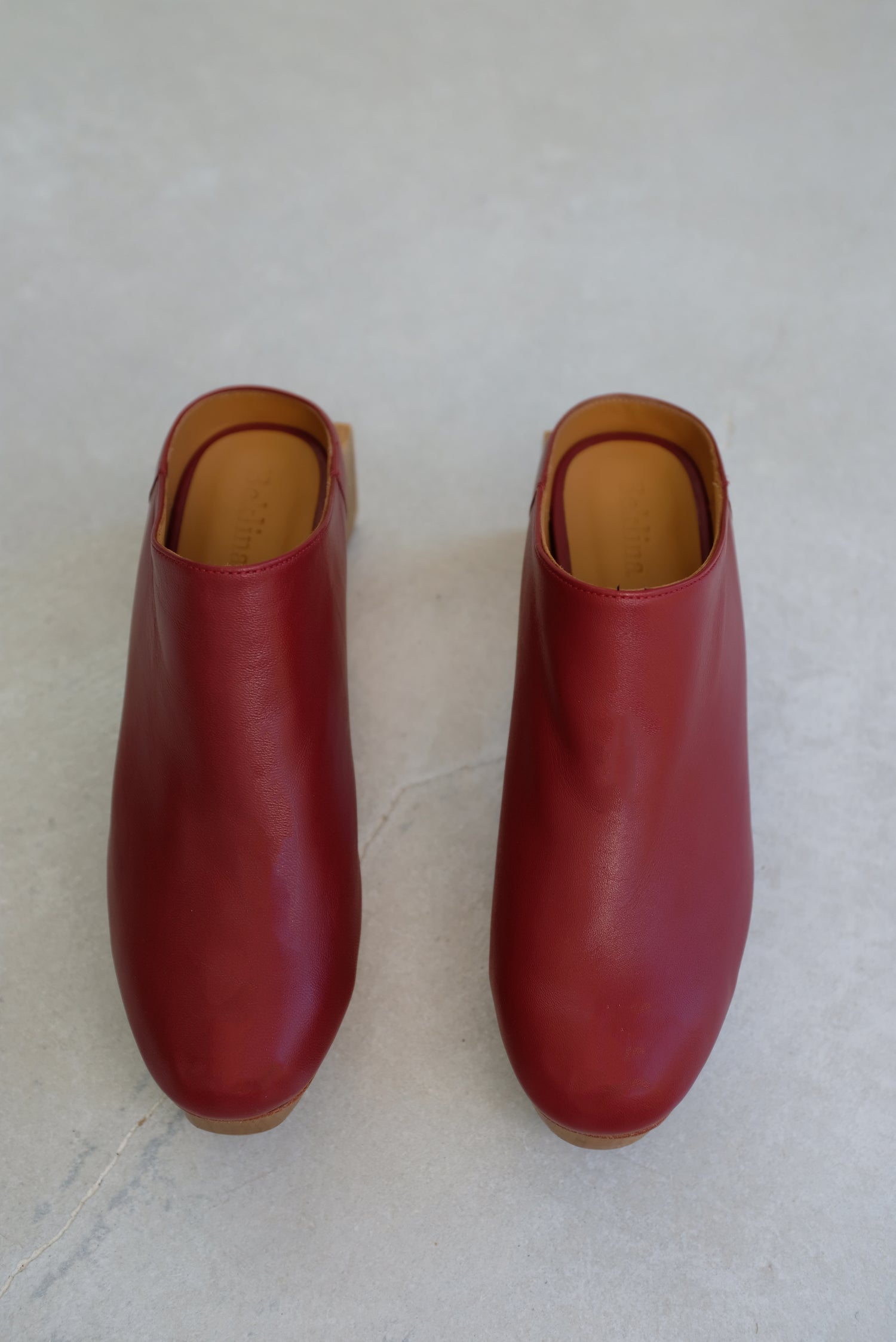 Hand carved wooden platform split heel, comfy mule slide upper 100% Italian leather uppers and leather lined. 2" back heel and 1" front platform. The heel is split it two parts, allowing the shoe's middle leather layer base to bend, making it very wearable and ultra comfortable.