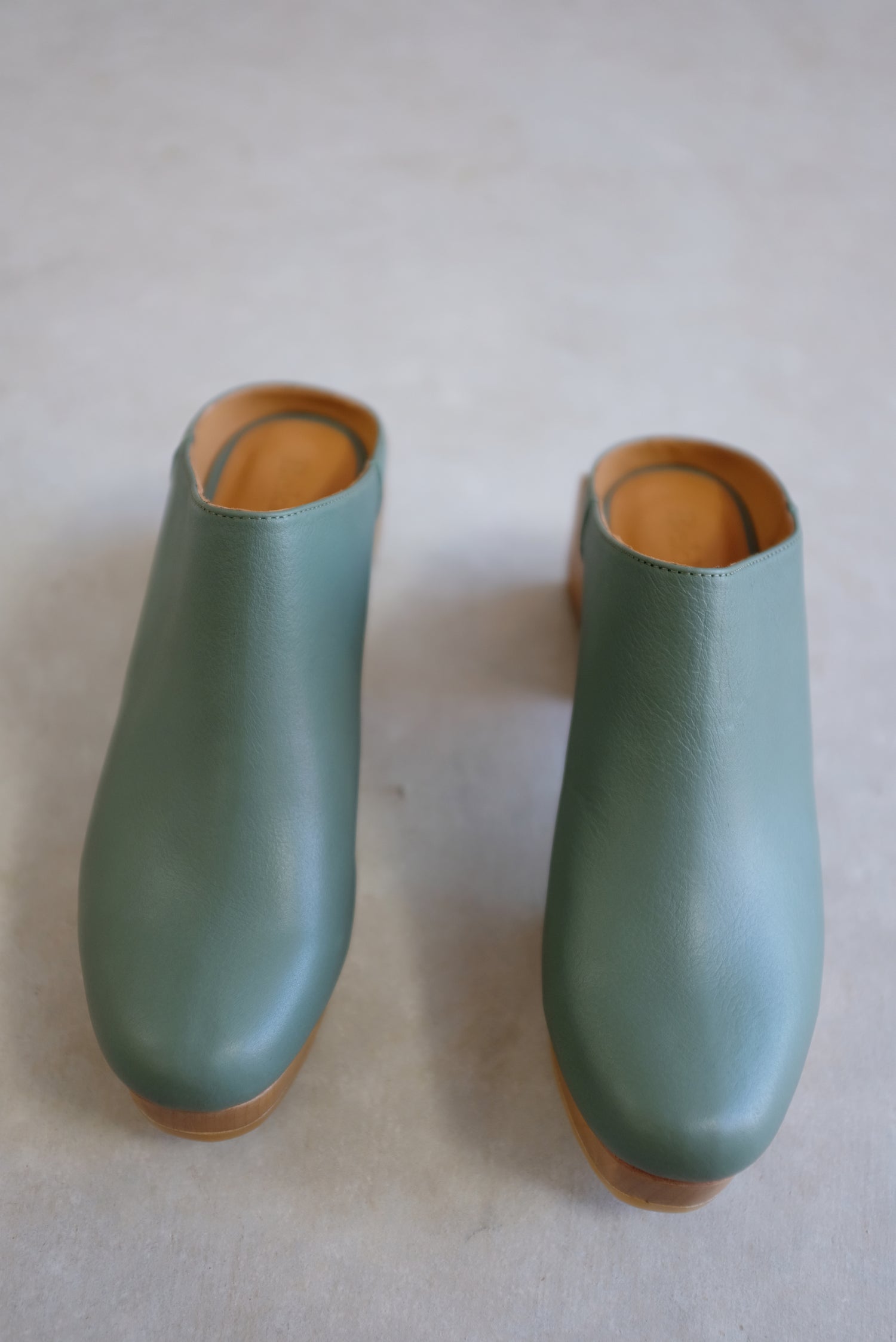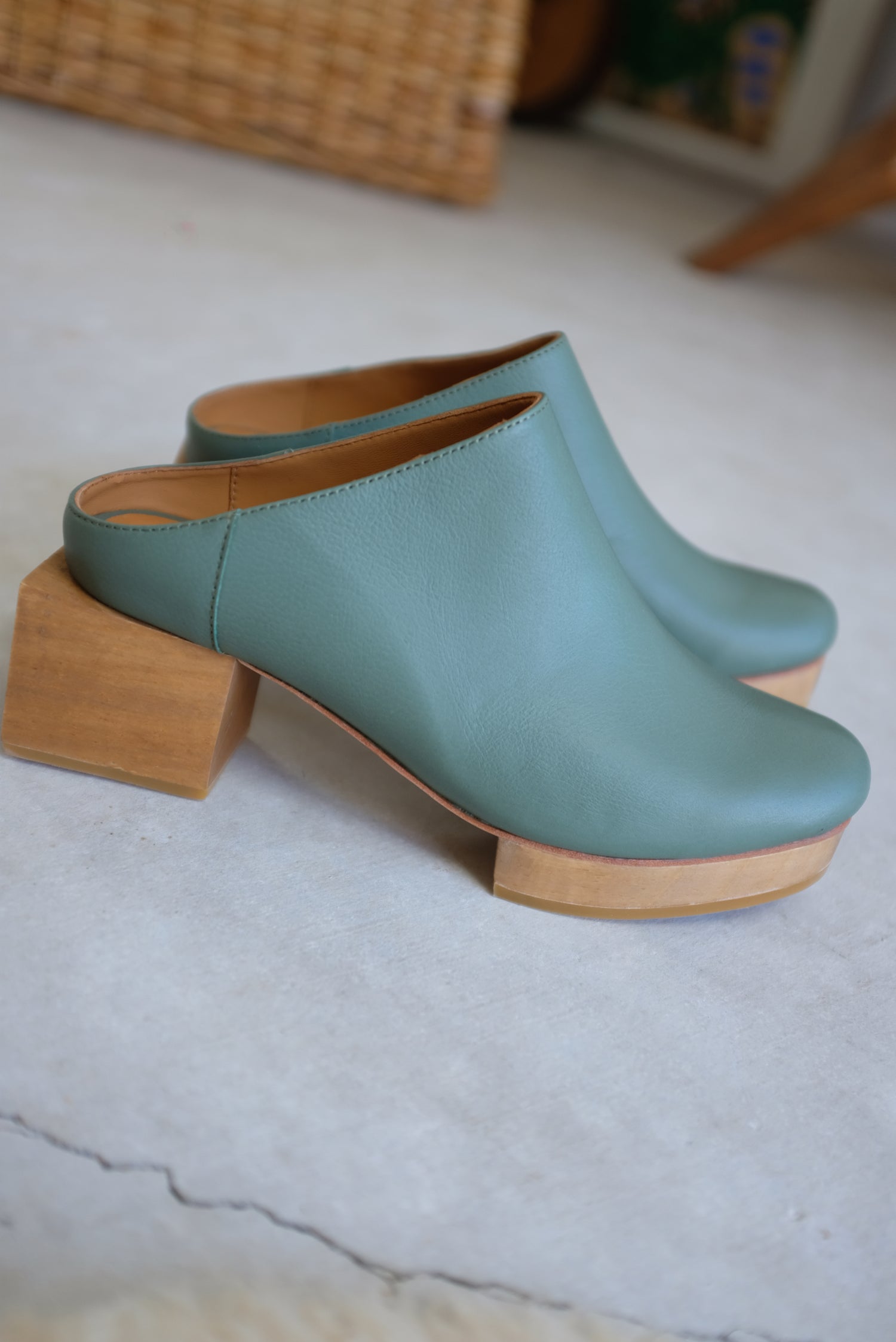 Hand carved wooden platform split heel, comfy mule slide upper 100% Italian leather uppers and leather lined. 2" back heel and 1" front platform. The heel is split it two parts, allowing the shoe's middle leather layer base to bend, making it very wearable and ultra comfortable.