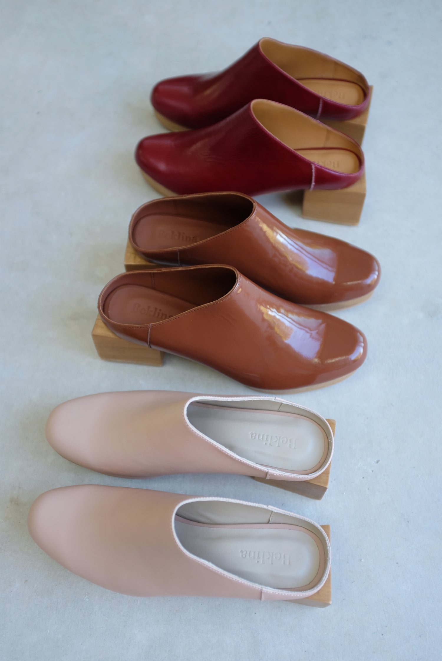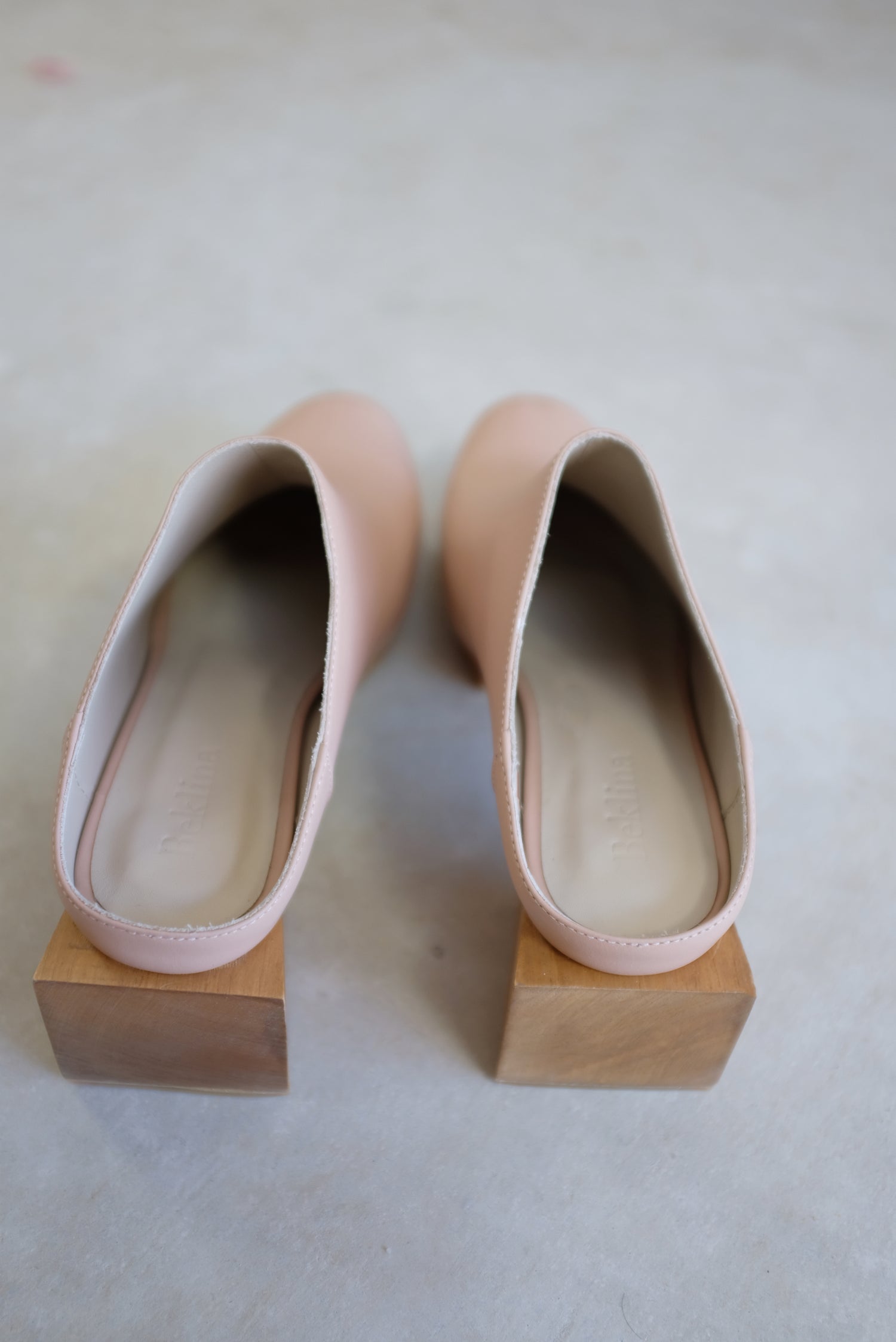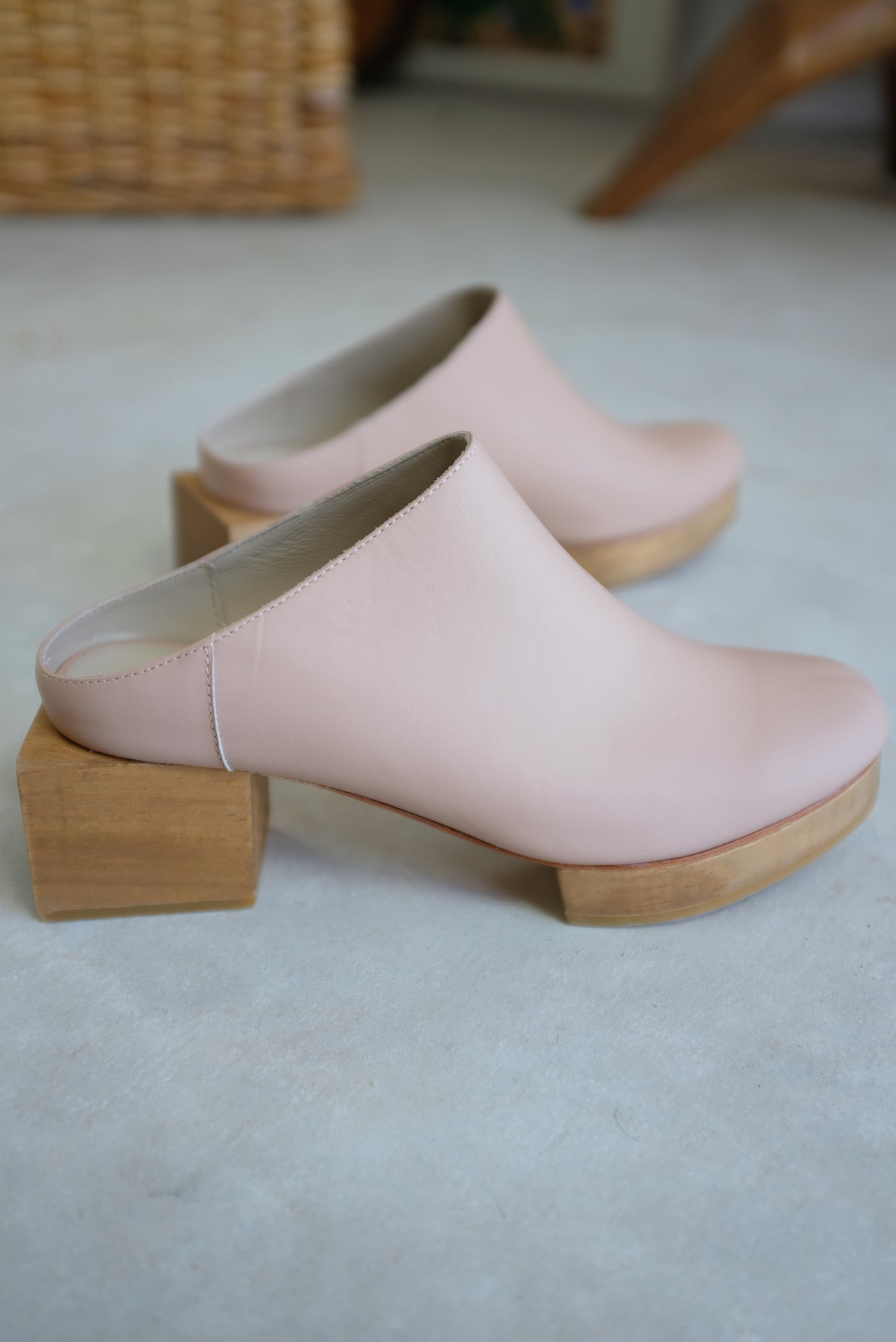 Hand carved wooden platform split heel, comfy mule slide upper 100% Italian leather uppers and leather lined. 2" back heel and 1" front platform. The heel is split it two parts, allowing the shoe's middle leather layer base to bend, making it very wearable and ultra comfortable.