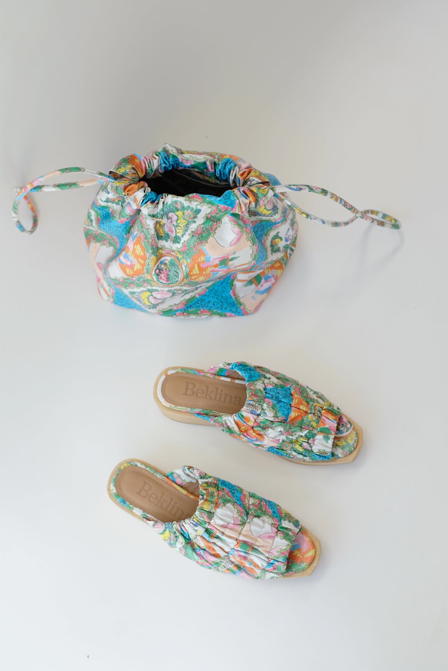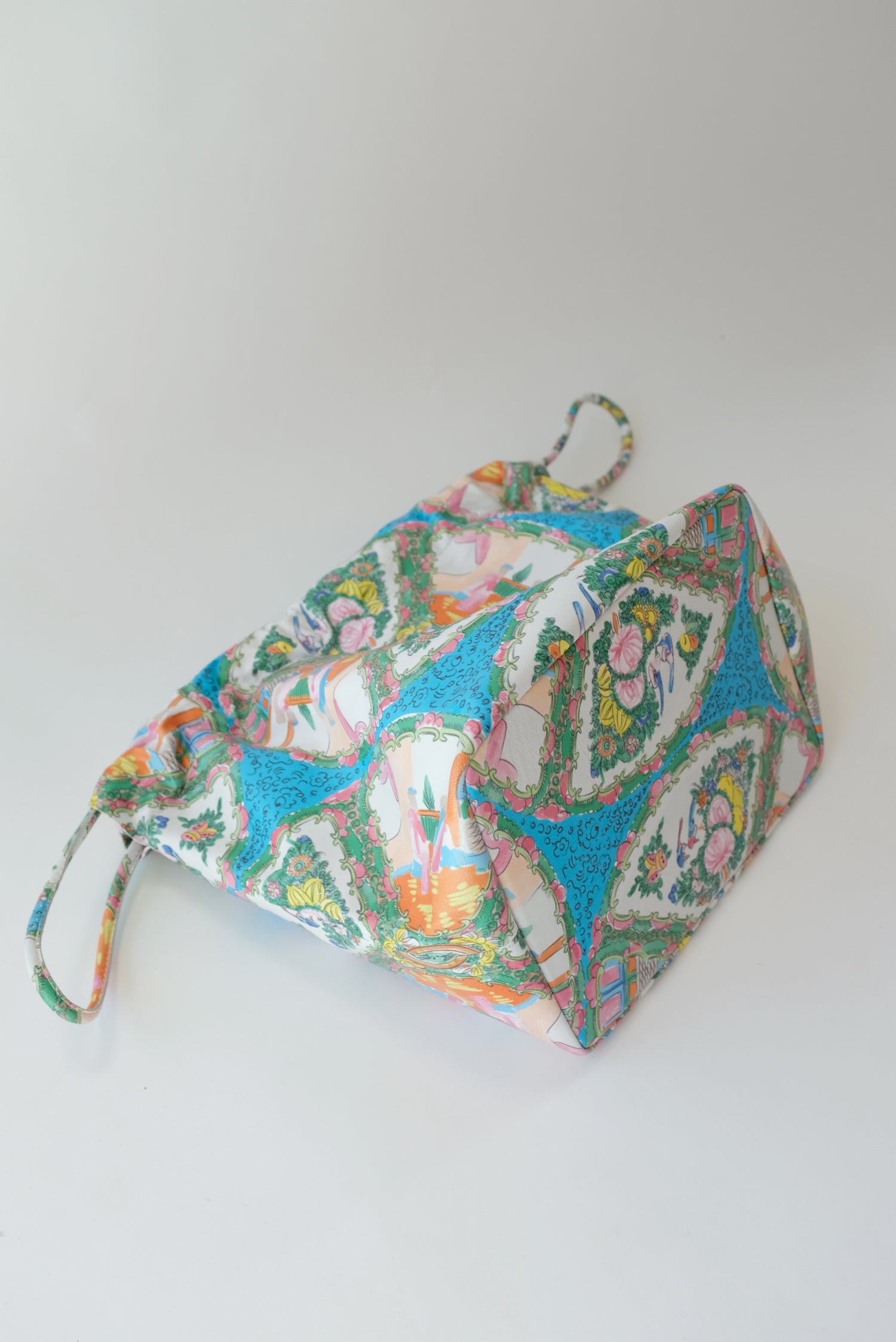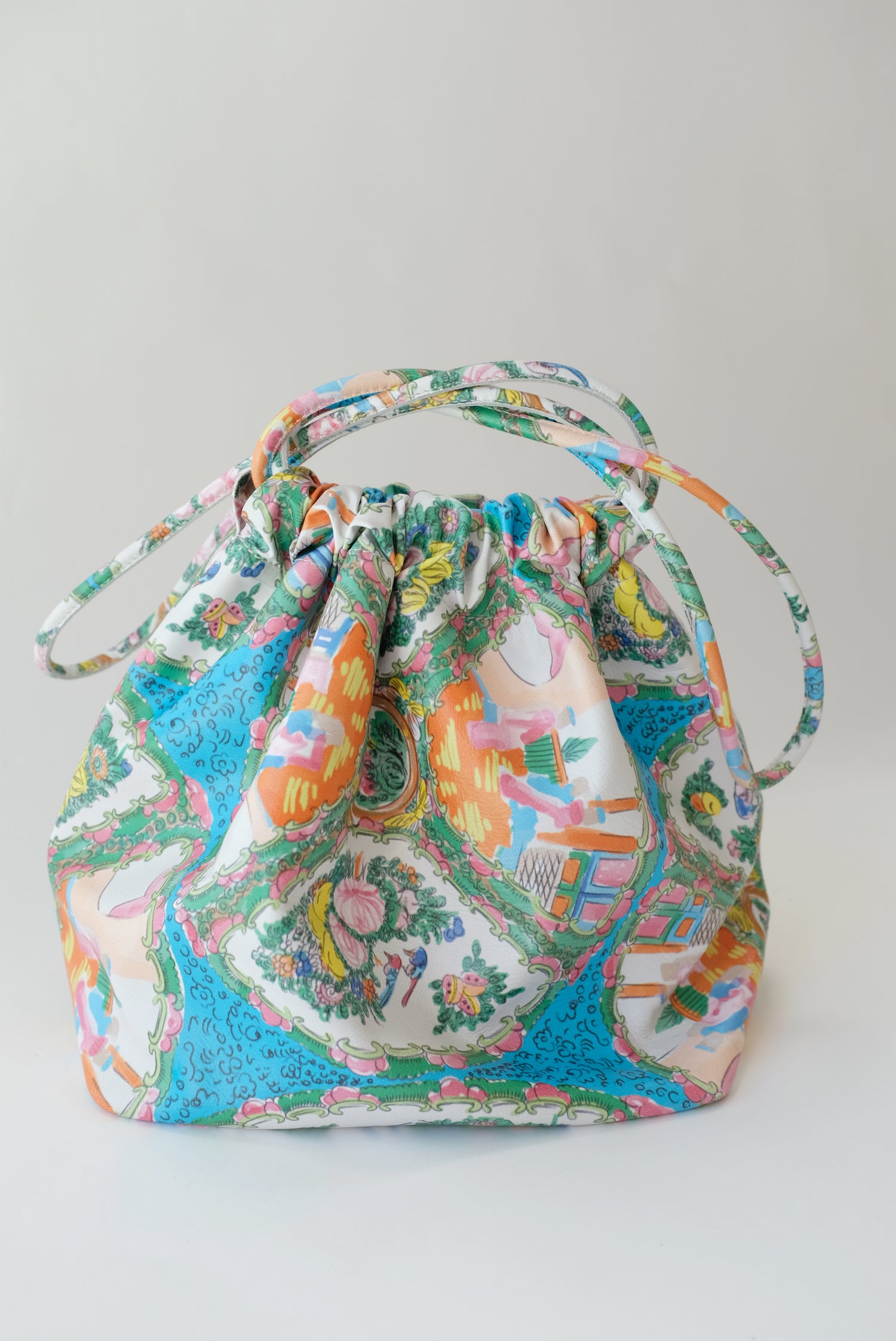 Very limited edition Plate Print. Buttery soft leather, cinch drawstring bag. Unlined, inside pocket, and holds just about everything, like even a sack of tangerines, the really sweet ones though. It has a flat bottom that stays open and upright. 100% leather.