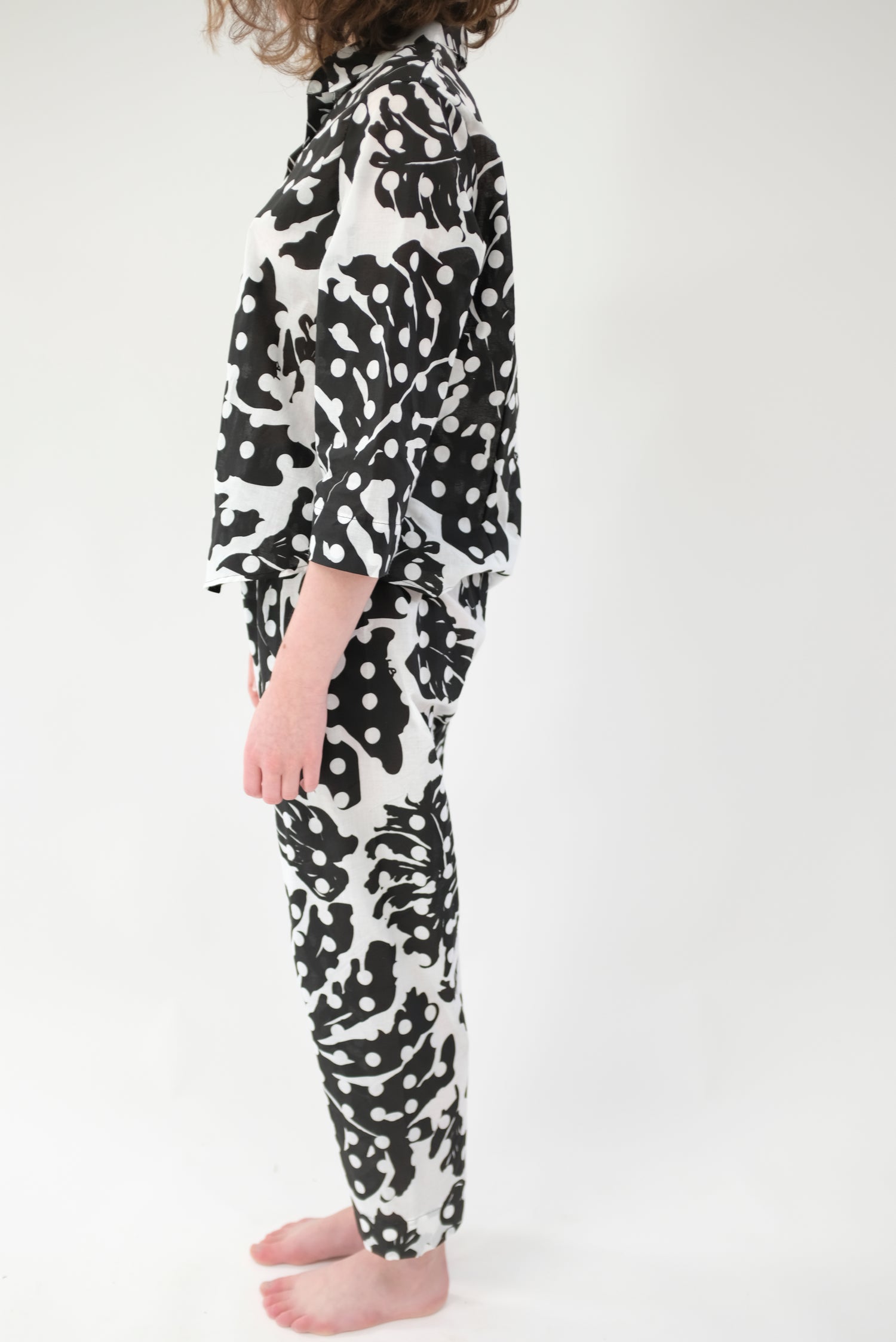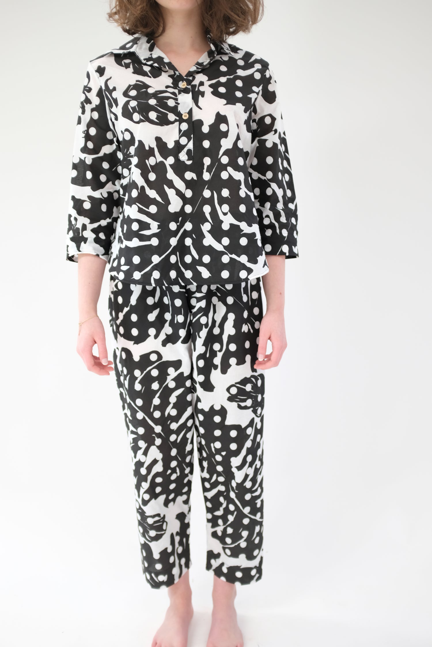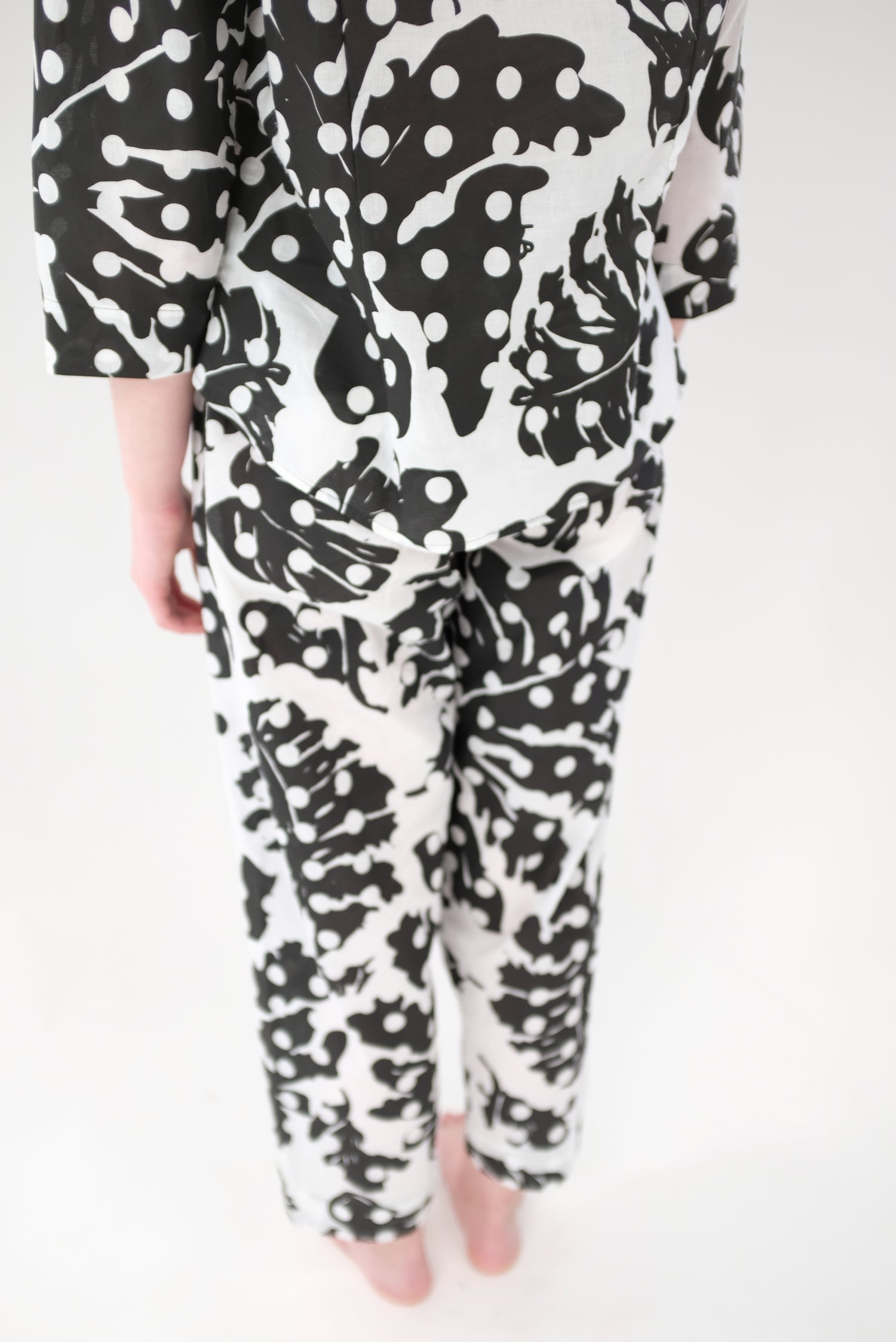 100% Organic cotton. Limited edition hand printed, black and white Leaf Dot print, enclosed French seams, wooden buttons down front, gentle elastic waist. They're pj's, but work as pants and blouse. Very limited edition.