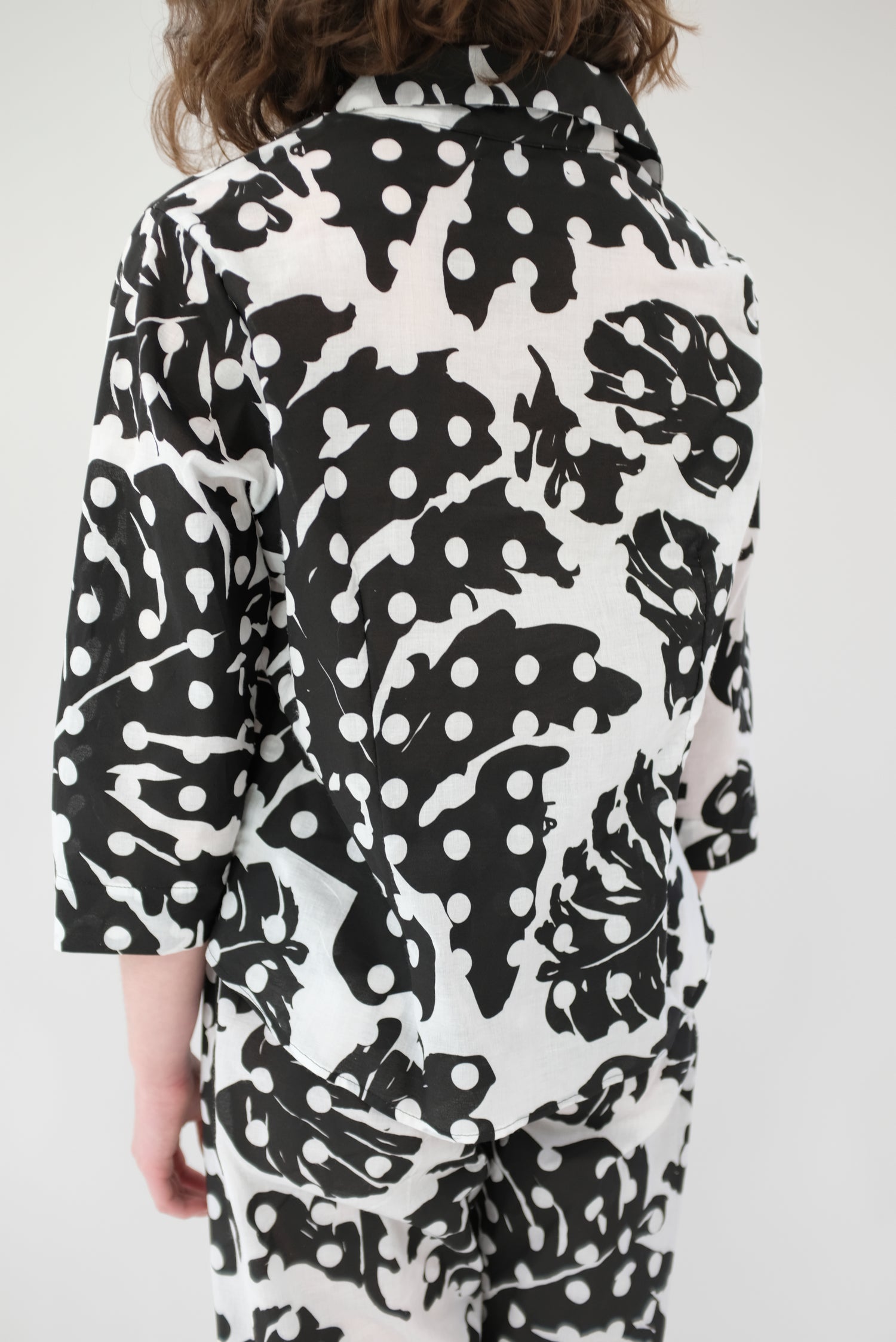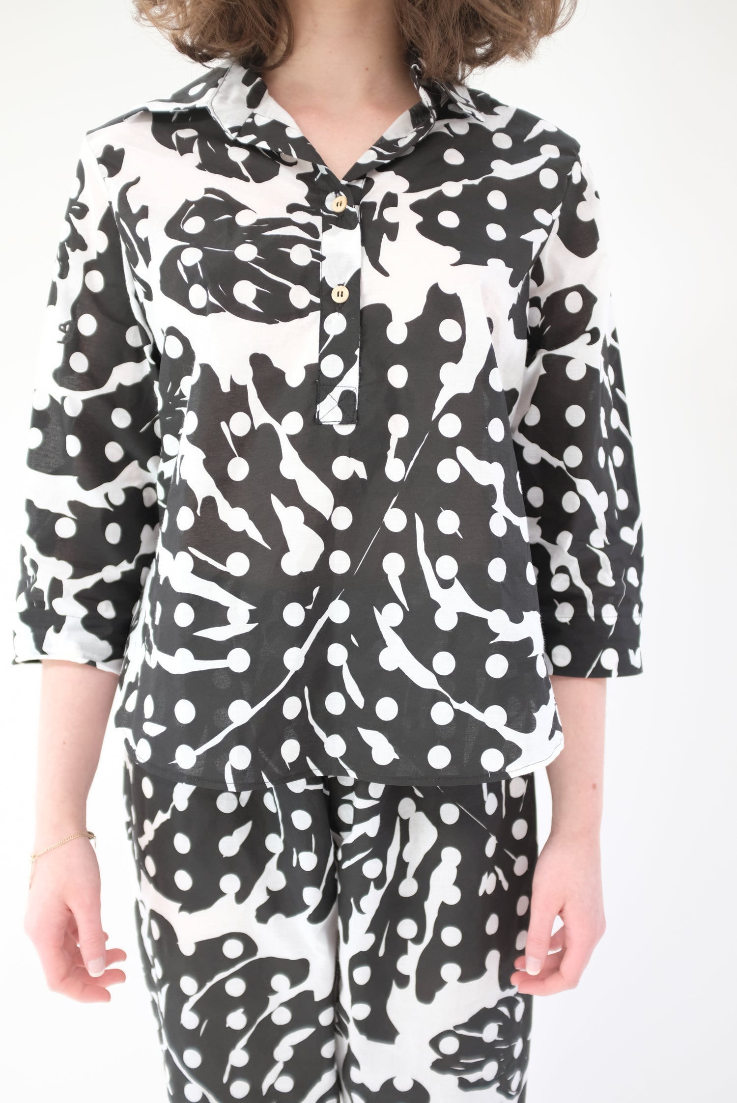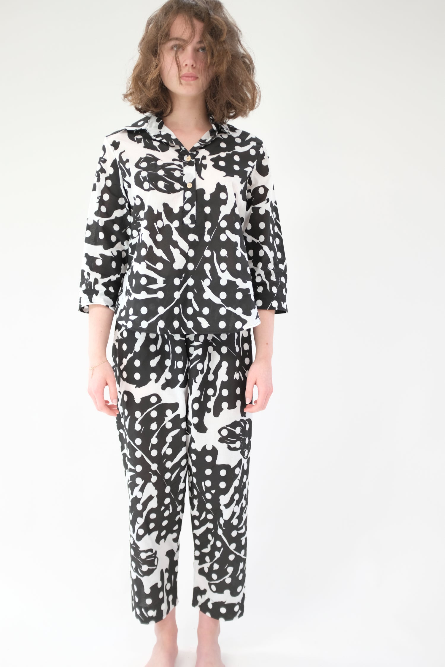 100% Organic cotton. Limited edition hand printed, black and white Leaf Dot print, enclosed French seams, wooden buttons down front, gentle elastic waist. They're pj's, but work as pants and blouse. Very limited edition.
