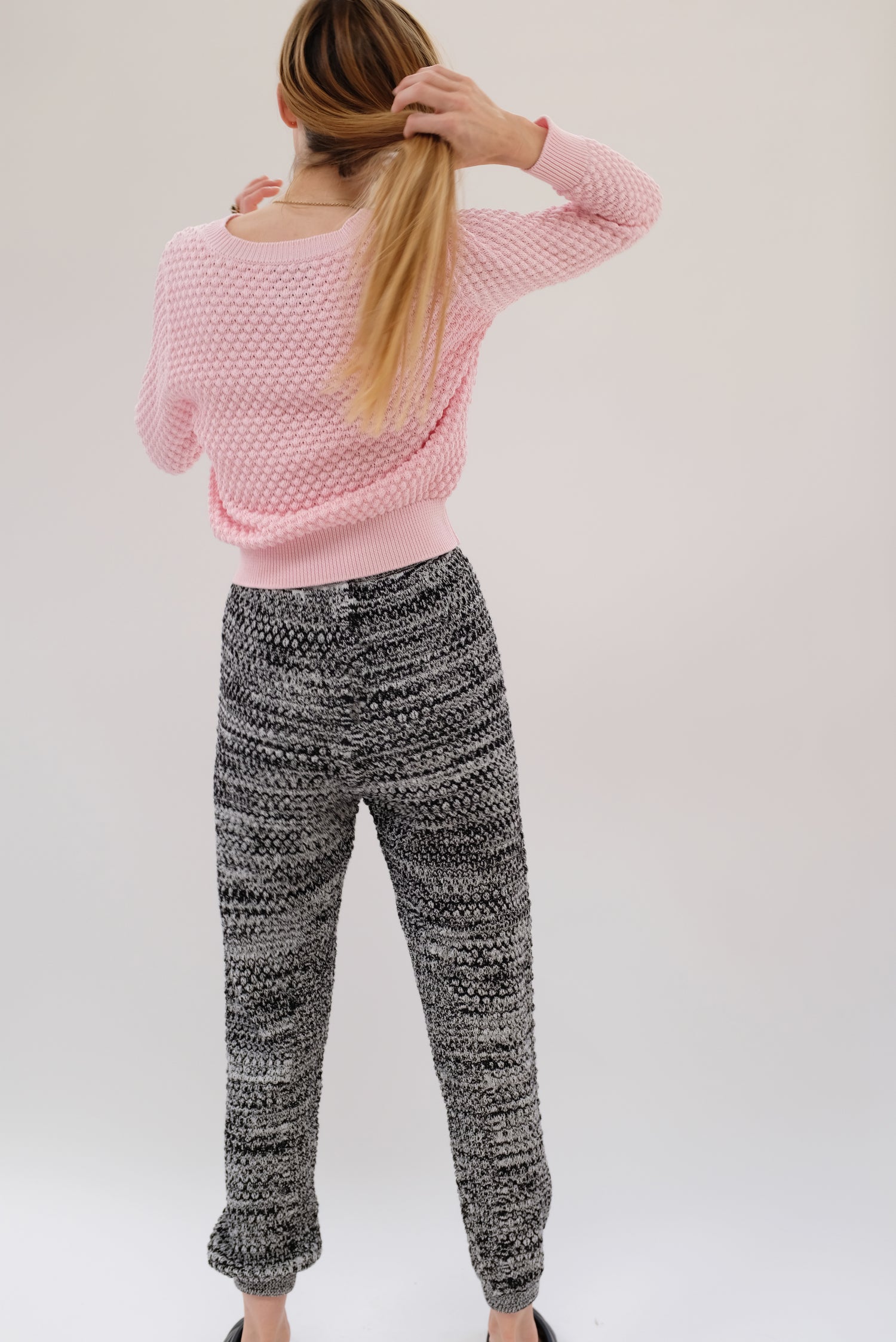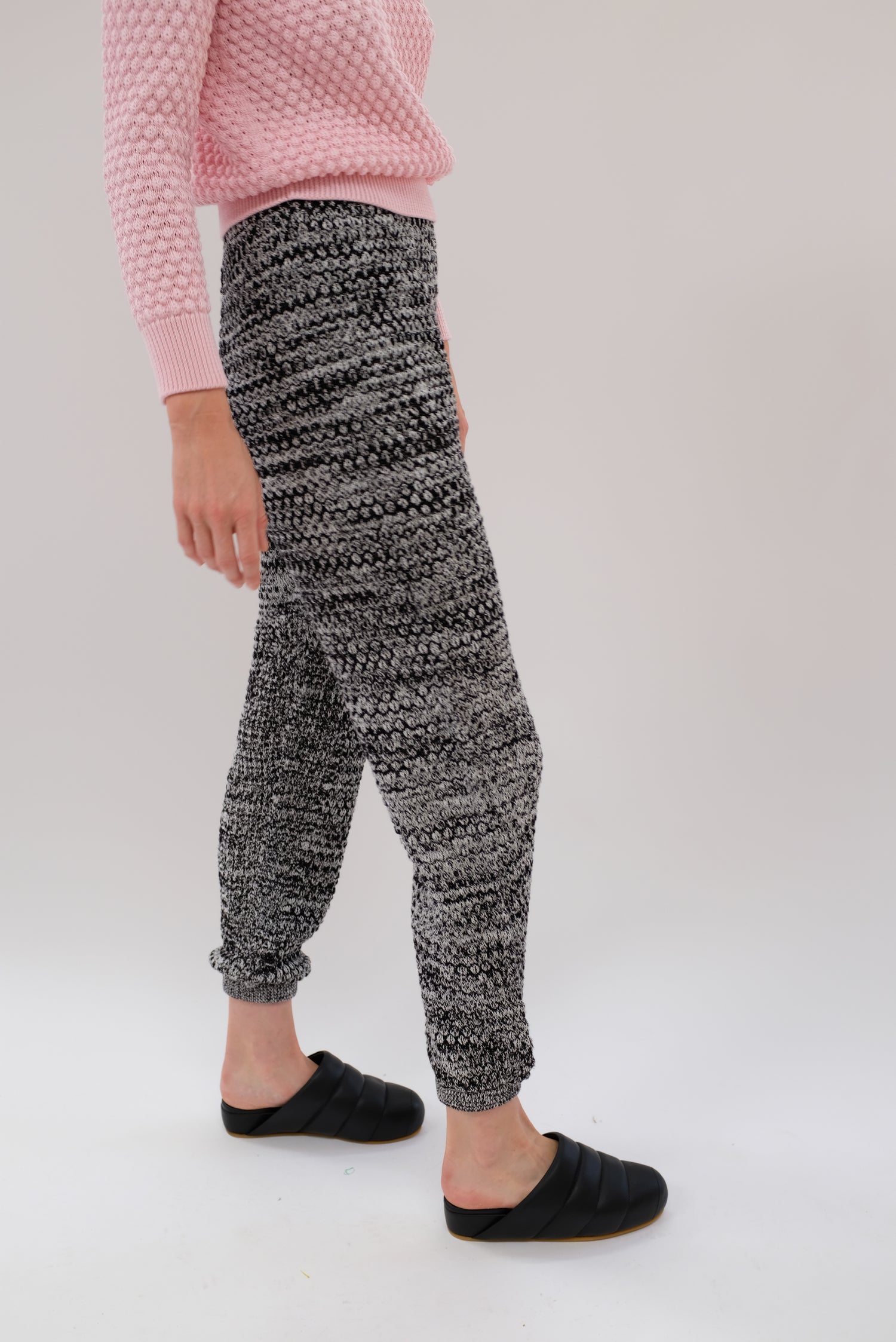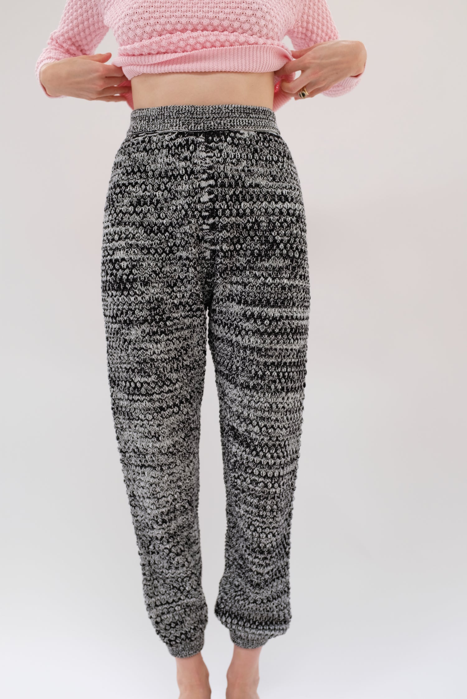 Gorgeous hand knit pant, with a unique pattern and texture, medium weight. Washable, soft luxurious cotton yarn. 100% Pima cotton. Gentle elastic at waist and ankle. Exclusive to Beklina. Runs true to size.