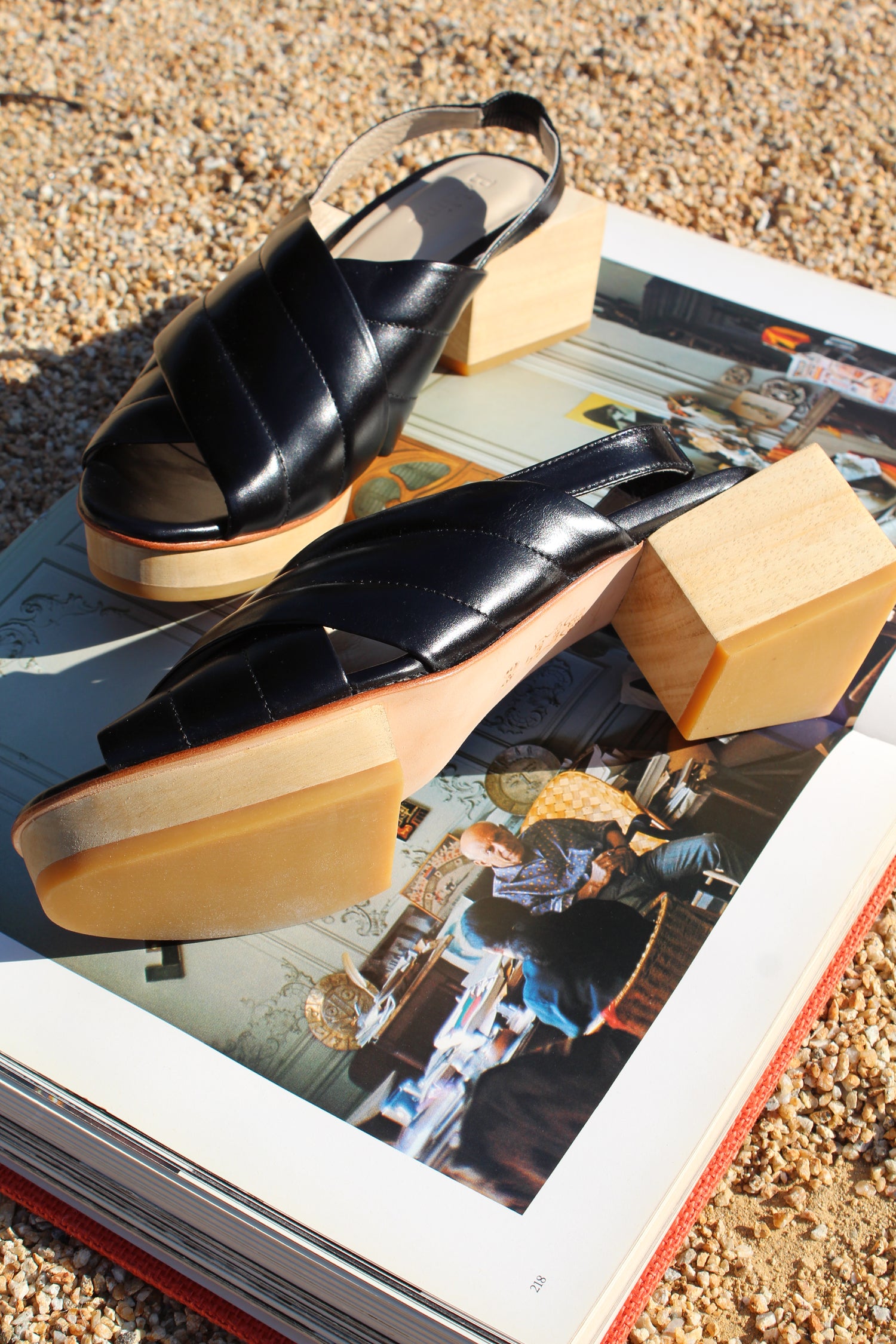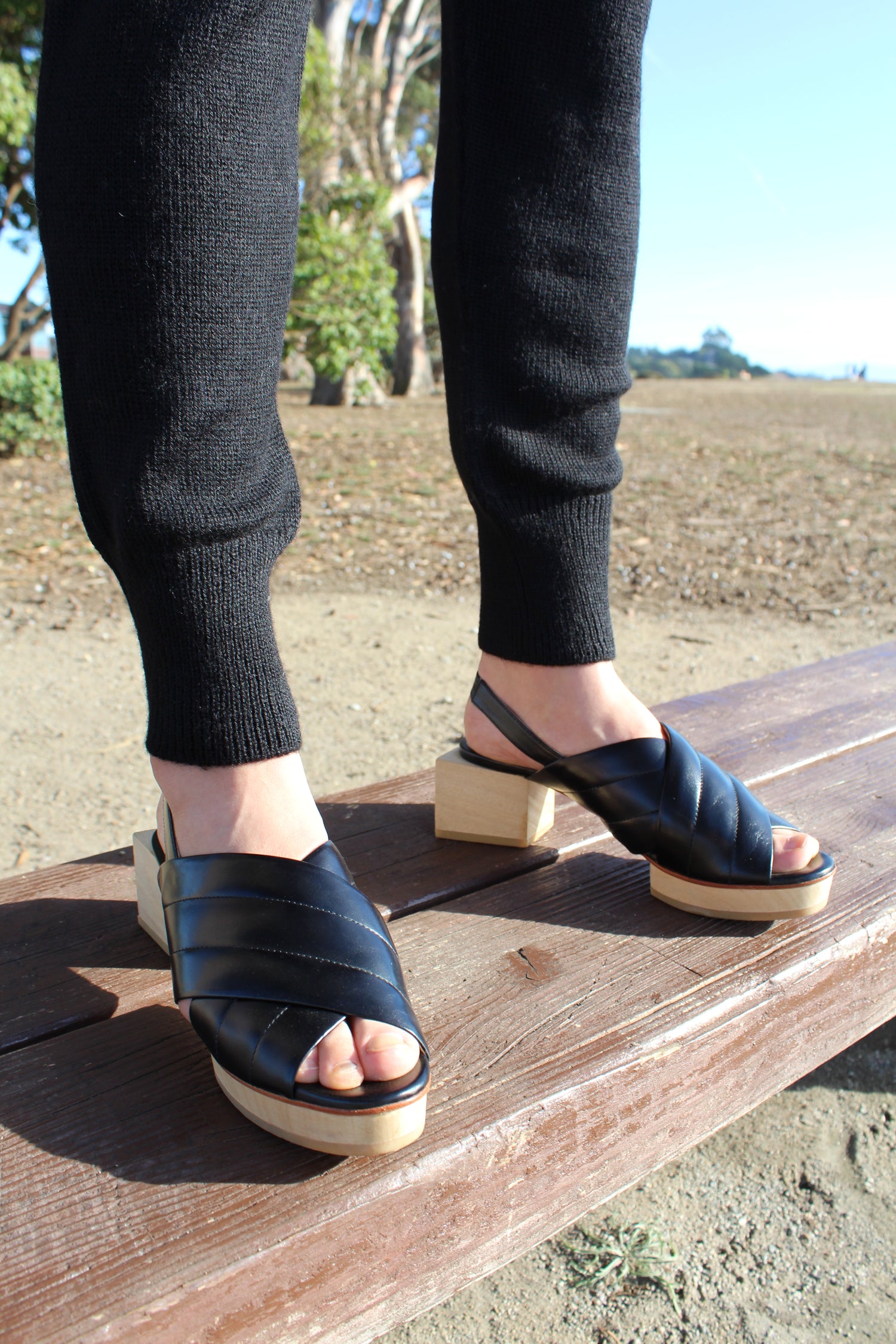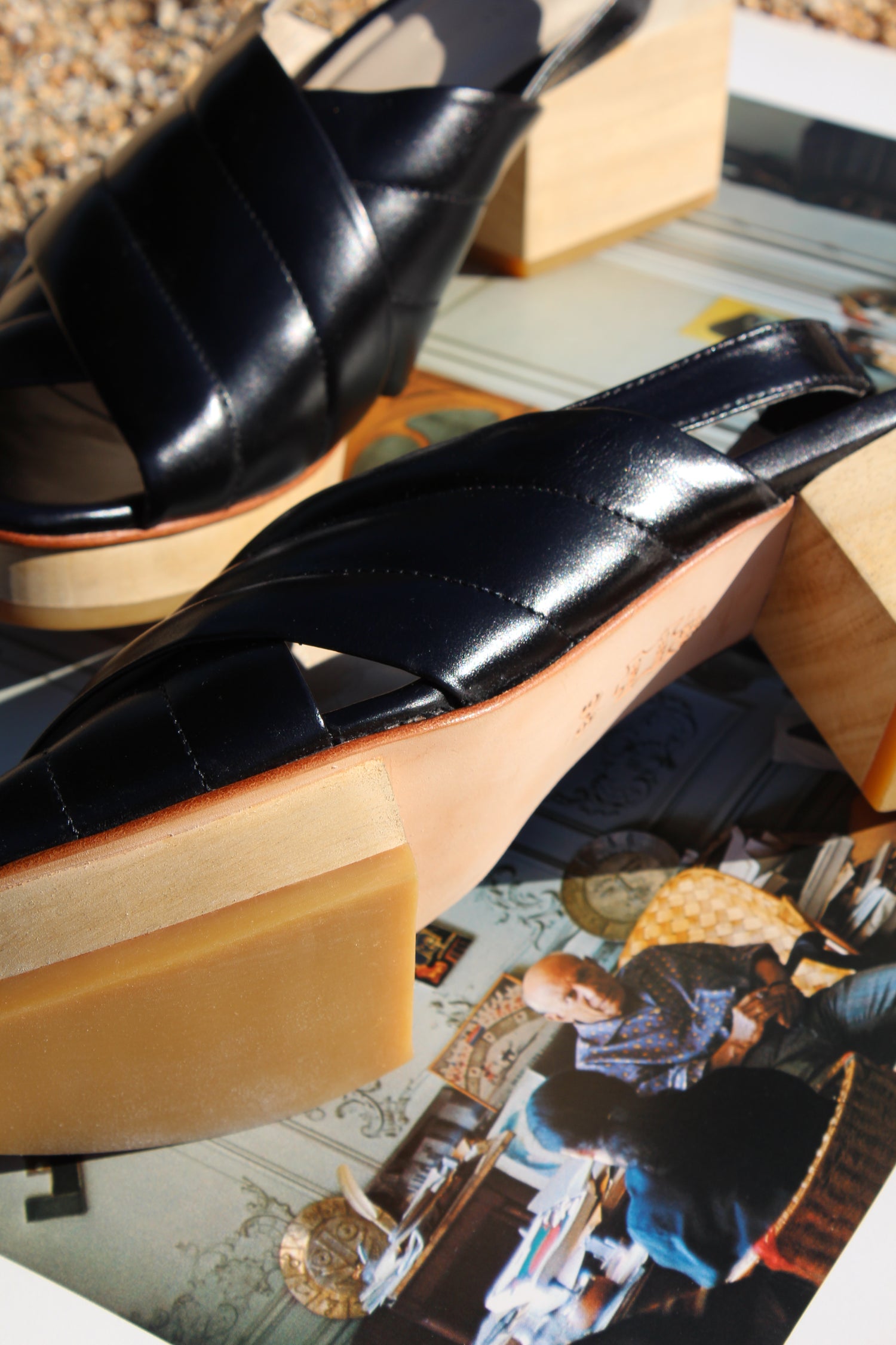Hand carved wooden platform split heel, classic criss-cross wide ribbed 100% Italian leather uppers and leather lined. 2" back heel and 1" front platform. The heel is split it two parts, allowing the shoe's middle leather layer base to bend, making it very wearable and ultra comfortable.