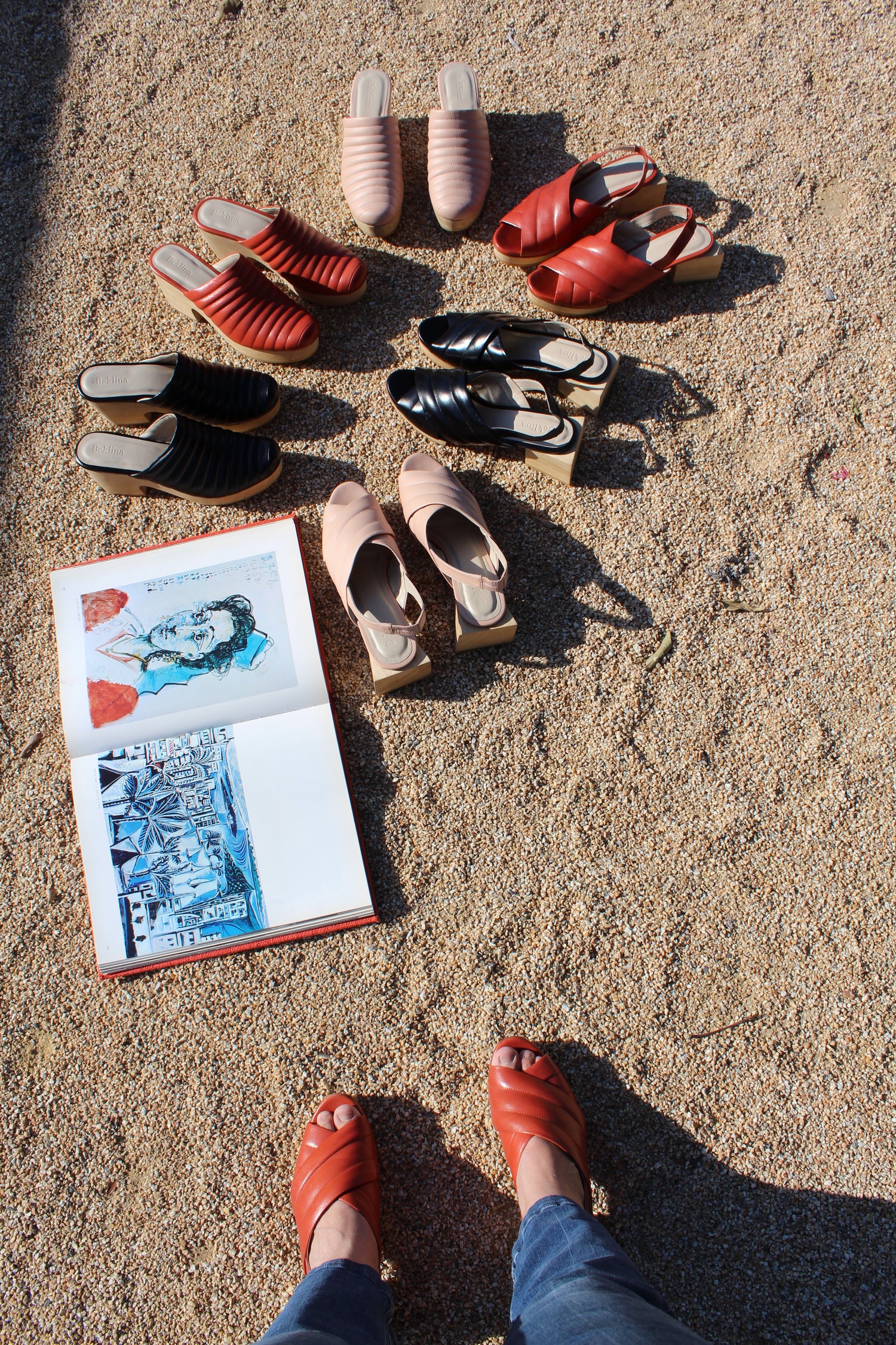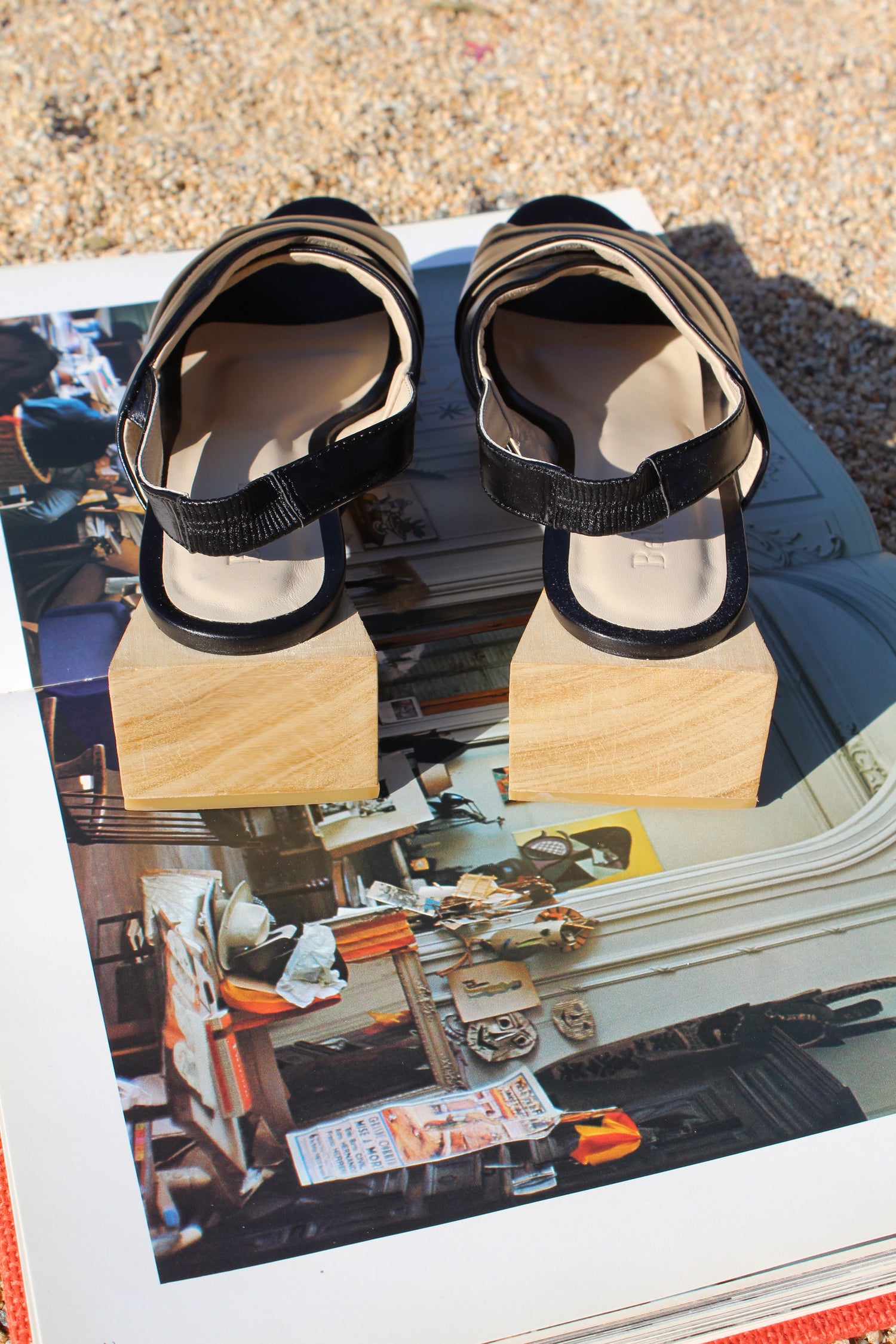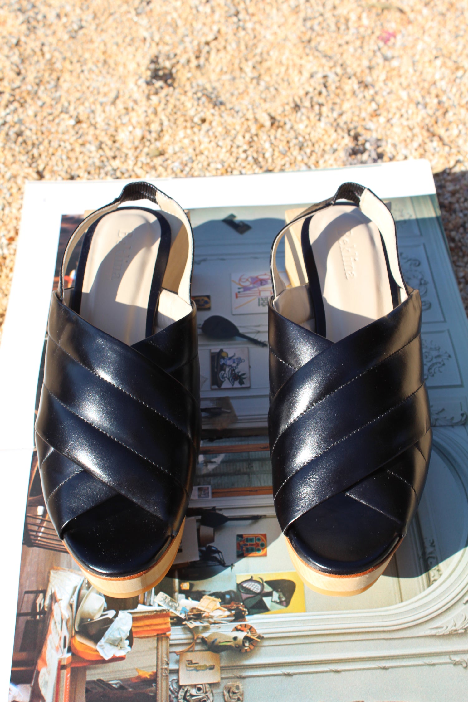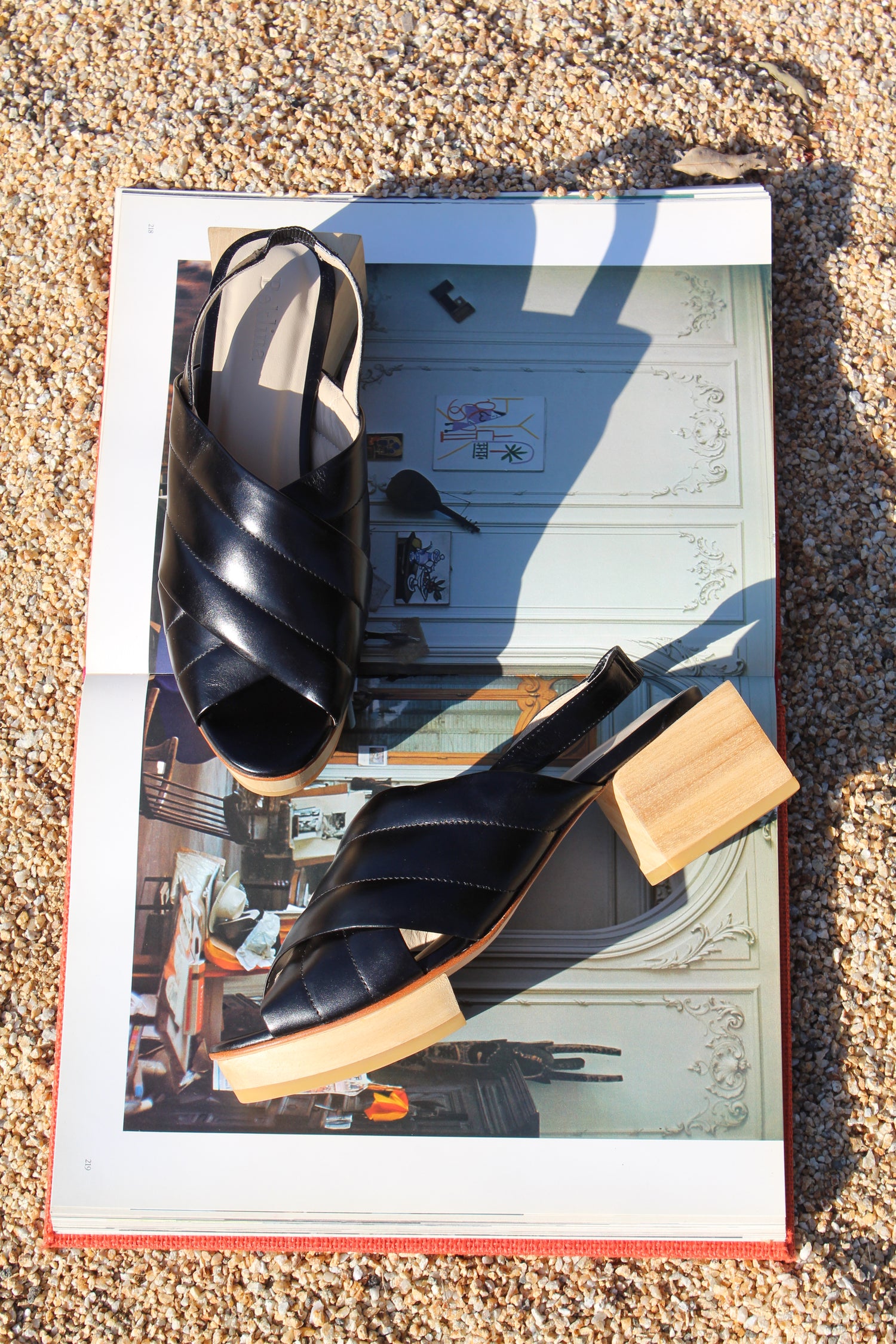 Hand carved wooden platform split heel, classic criss-cross wide ribbed 100% Italian leather uppers and leather lined. 2" back heel and 1" front platform. The heel is split it two parts, allowing the shoe's middle leather layer base to bend, making it very wearable and ultra comfortable.