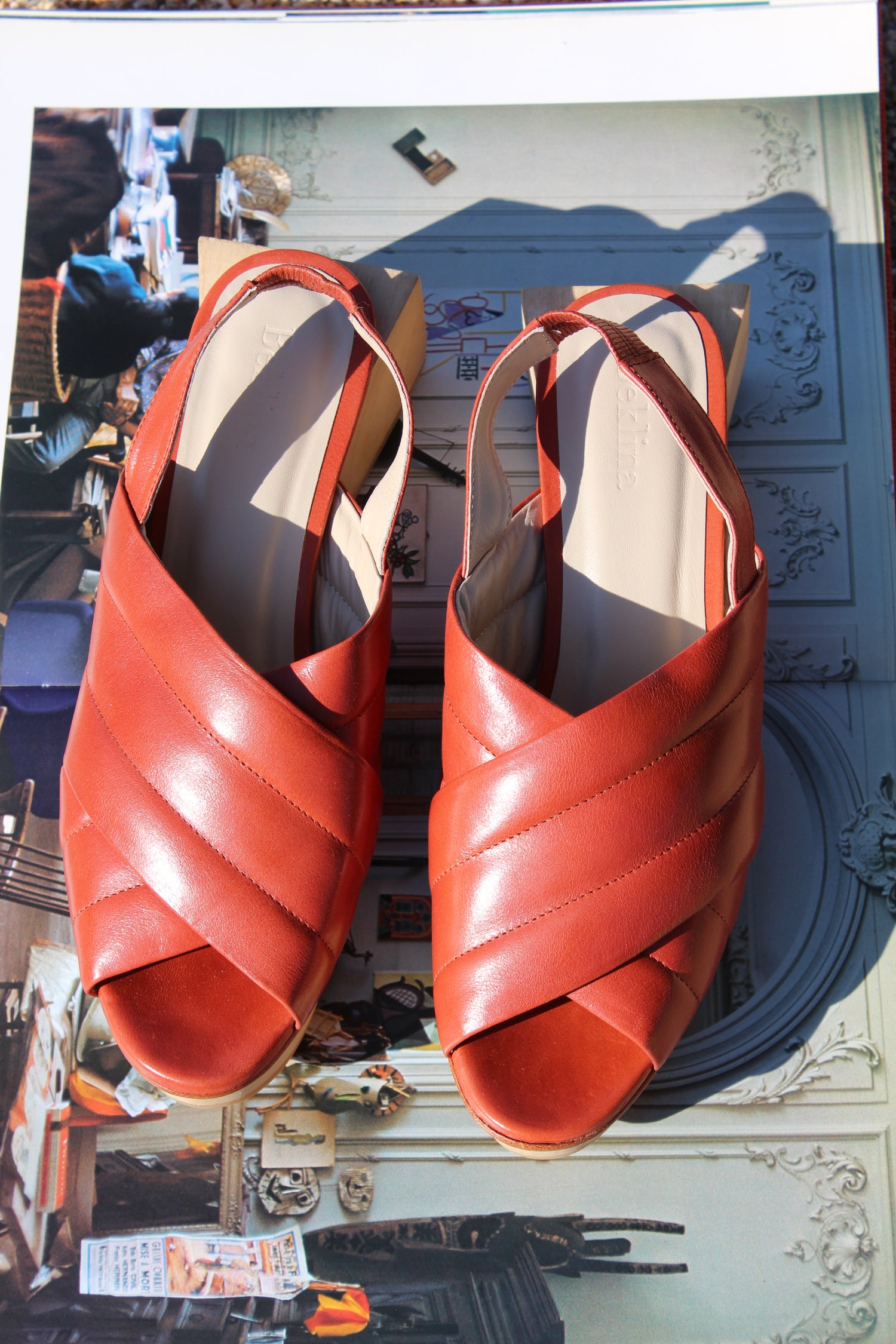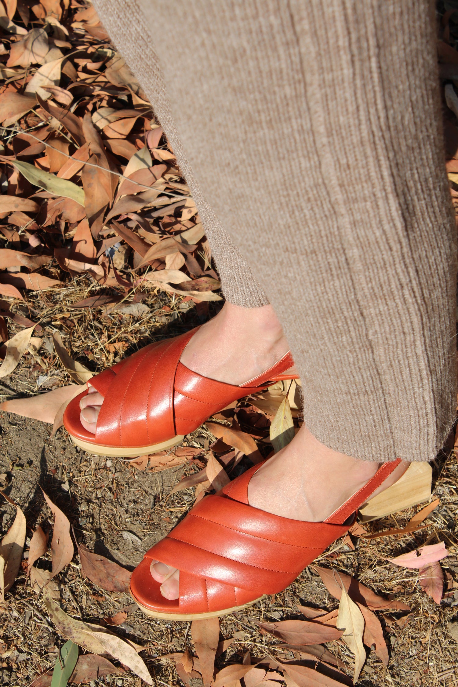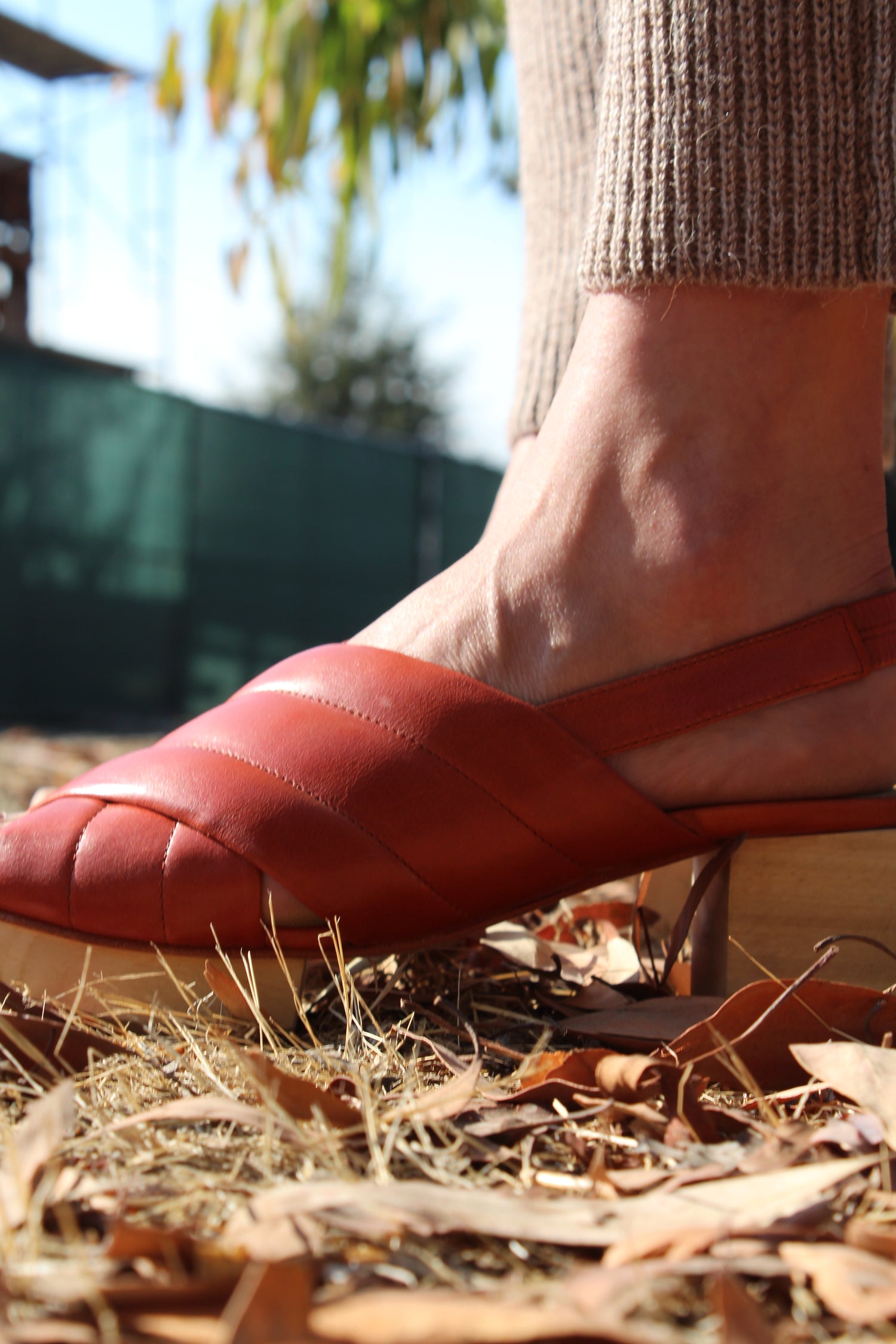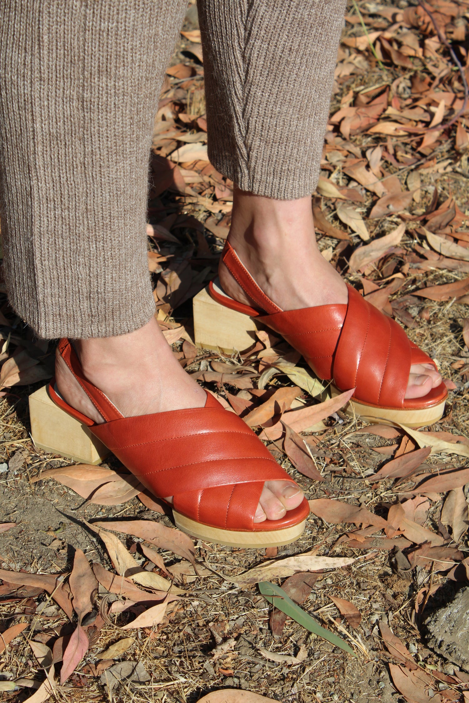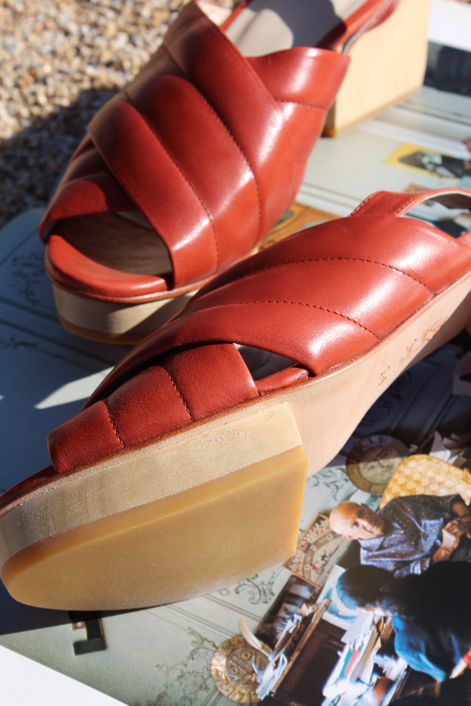 Hand carved wooden platform split heel, classic criss-cross wide ribbed 100% Italian leather uppers and leather lined. 2" back heel and 1" front platform. The heel is split it two parts, allowing the shoe's middle leather layer base to bend, making it very wearable and ultra comfortable.