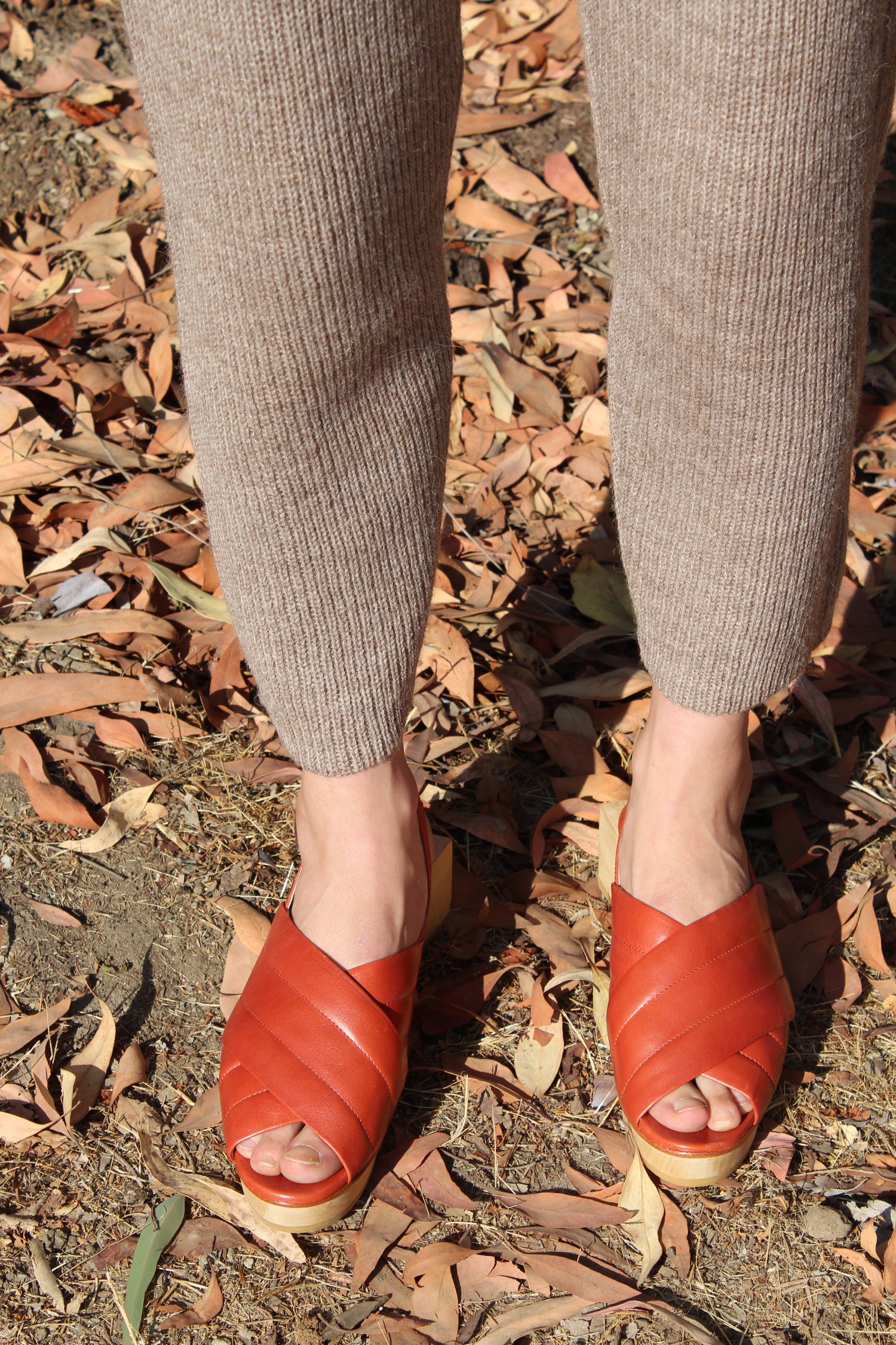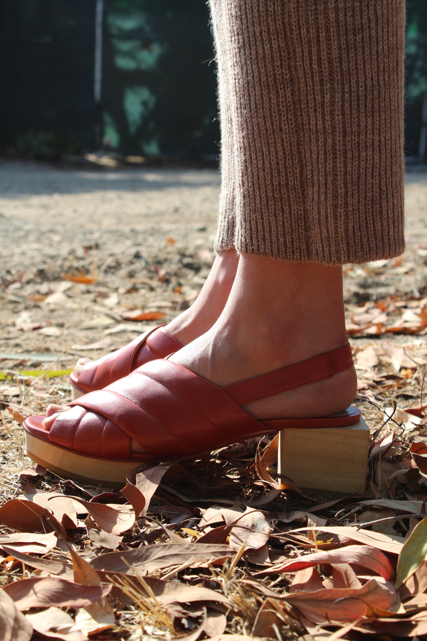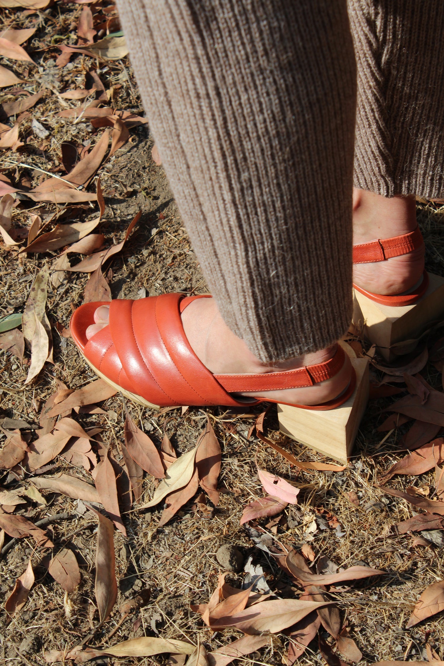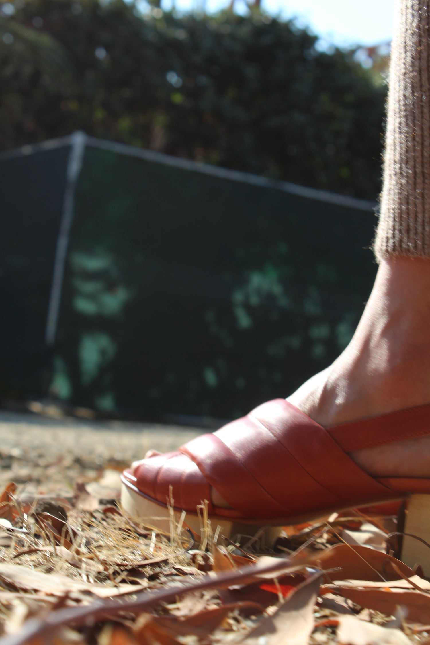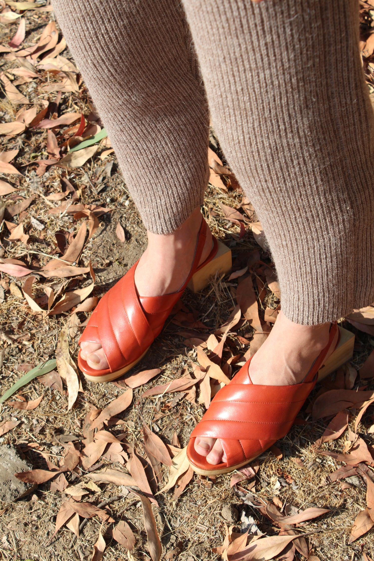 Hand carved wooden platform split heel, classic criss-cross wide ribbed 100% Italian leather uppers and leather lined. 2" back heel and 1" front platform. The heel is split it two parts, allowing the shoe's middle leather layer base to bend, making it very wearable and ultra comfortable.