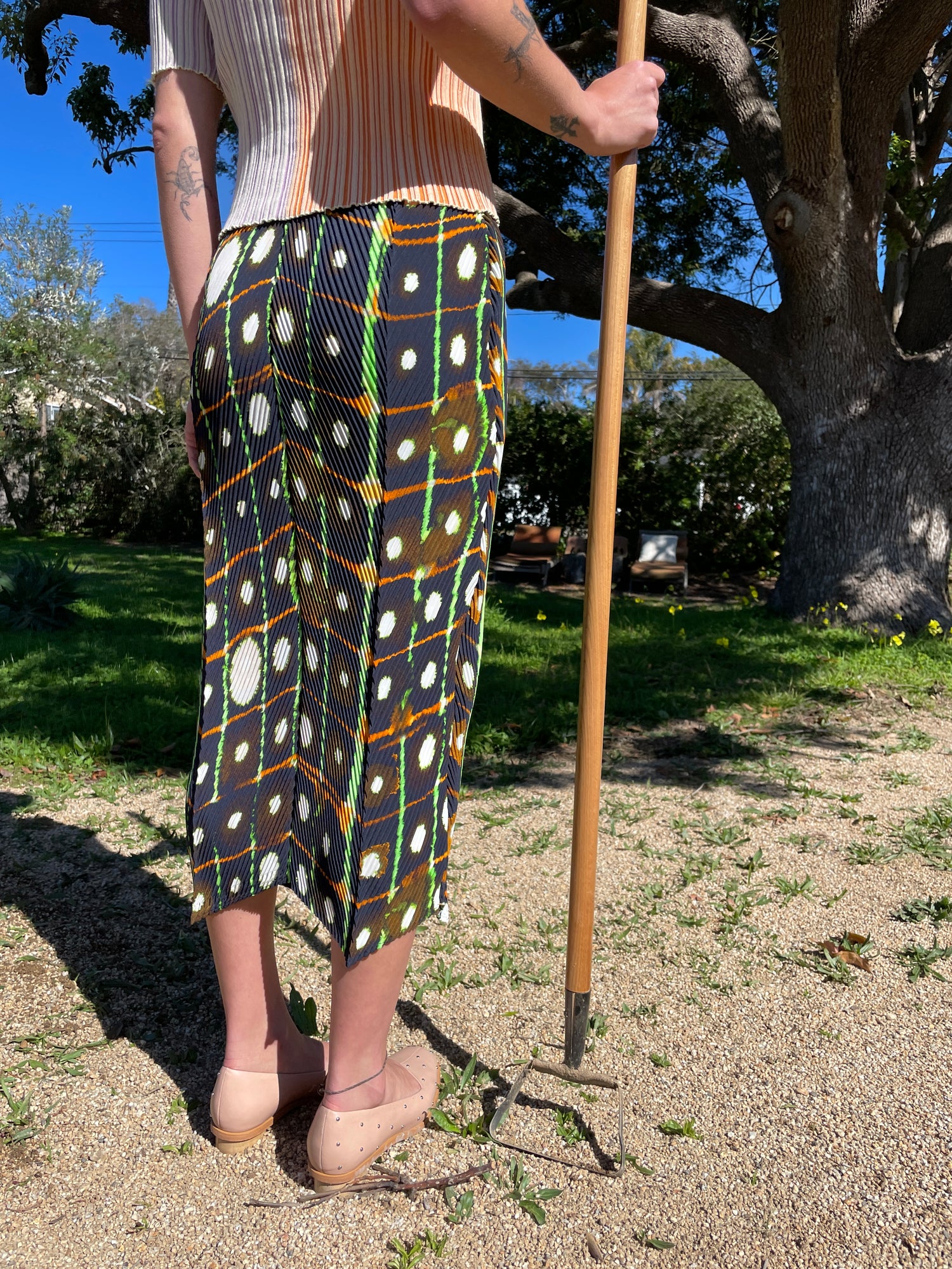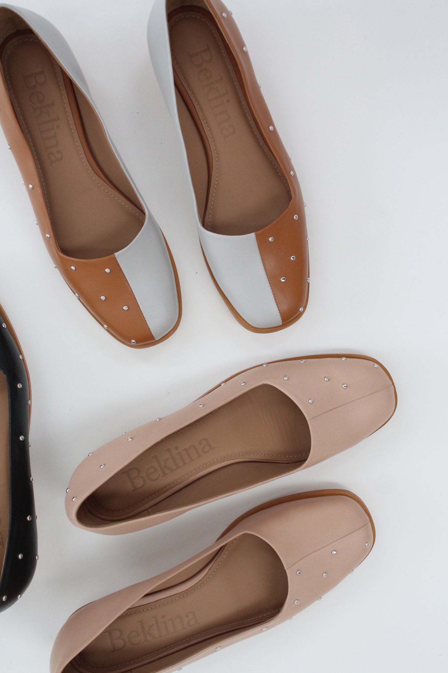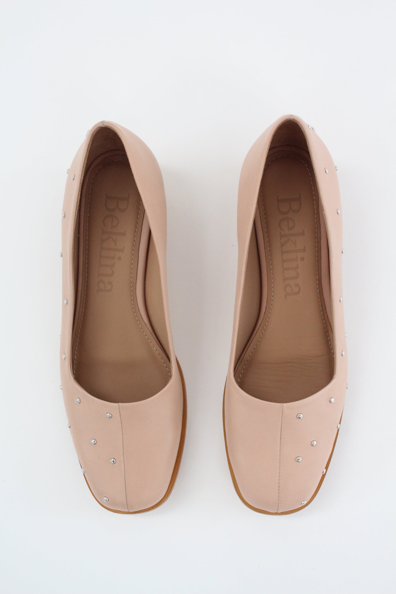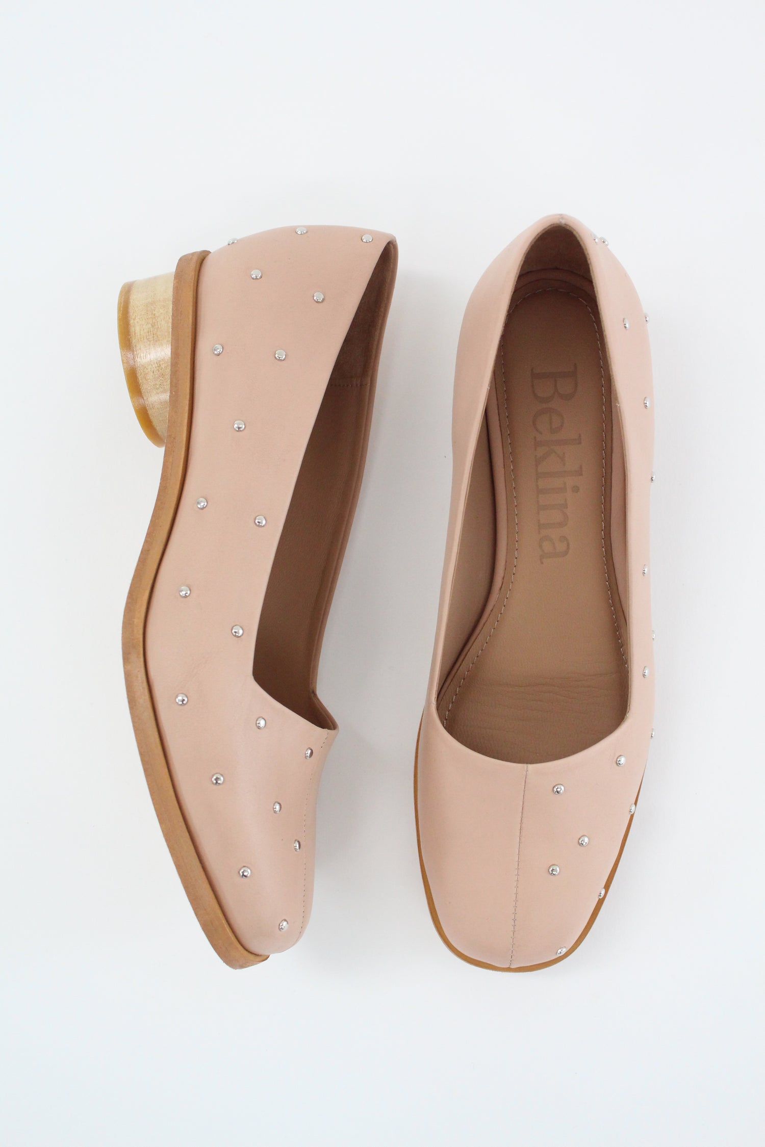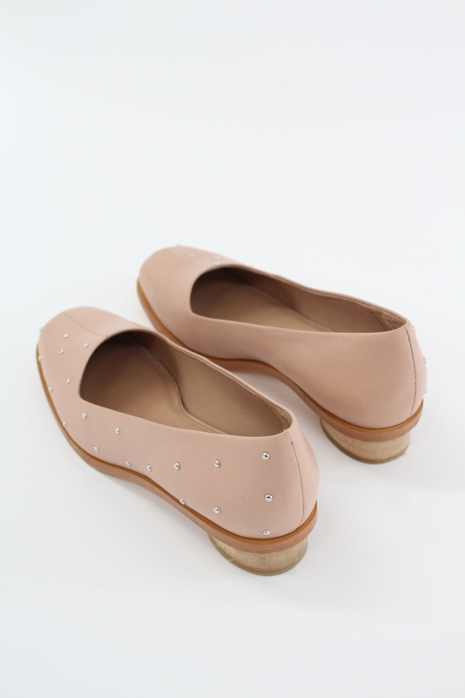 All day wearable low pump. Contrasting right and left sides, one side stud covered leather. Leather sole with hand carved rounded wood heel and leather welt. Leather lined. Running true to size.