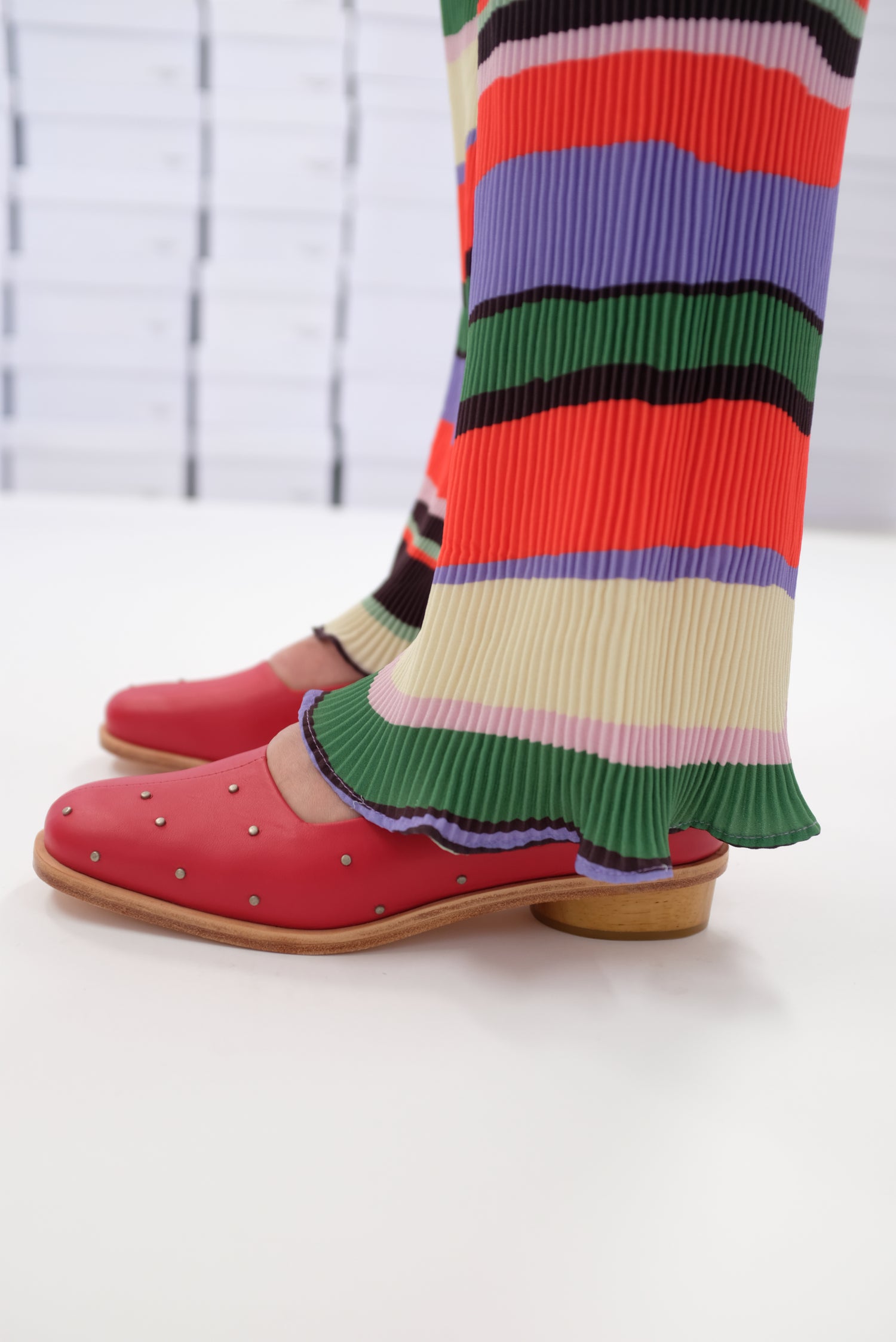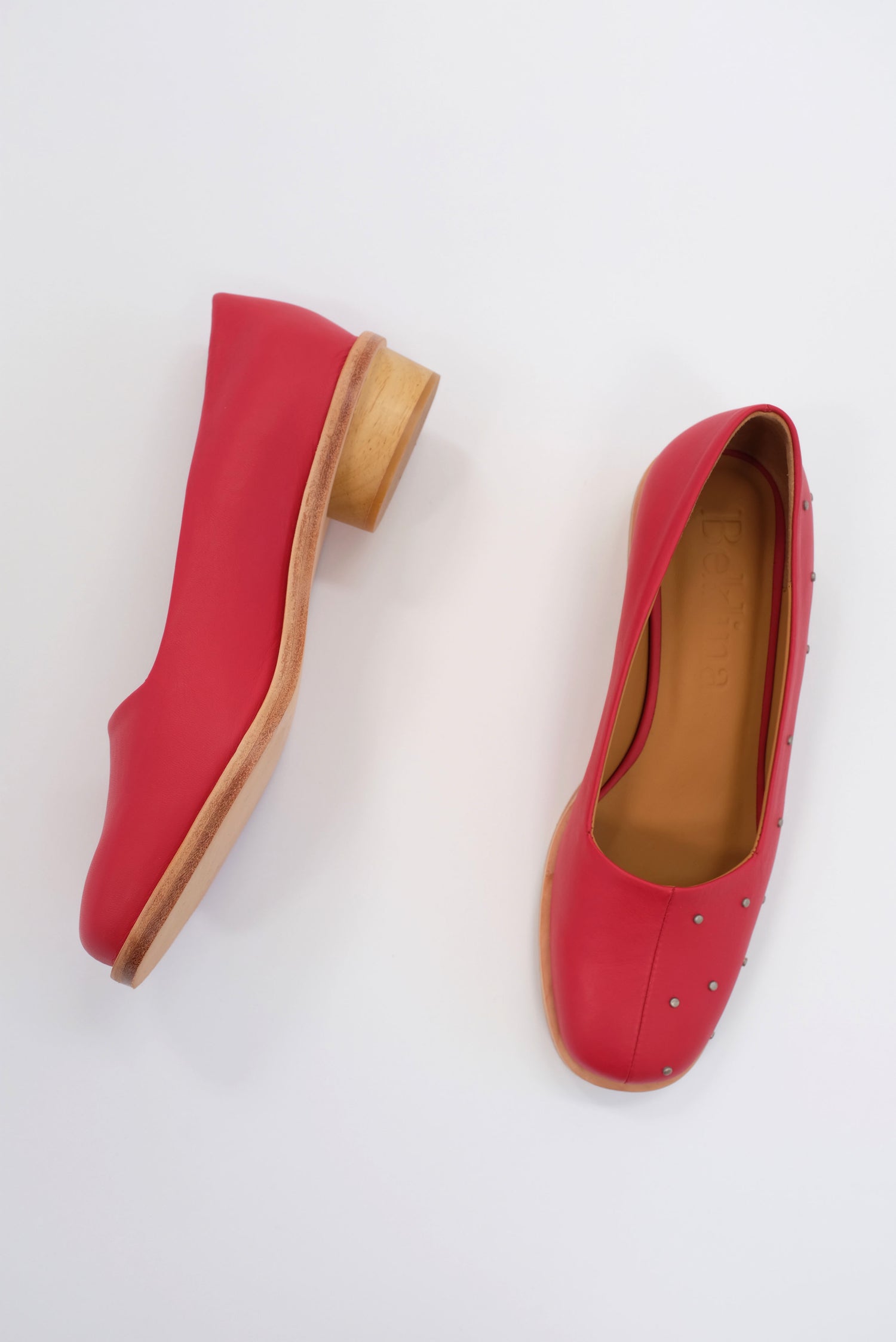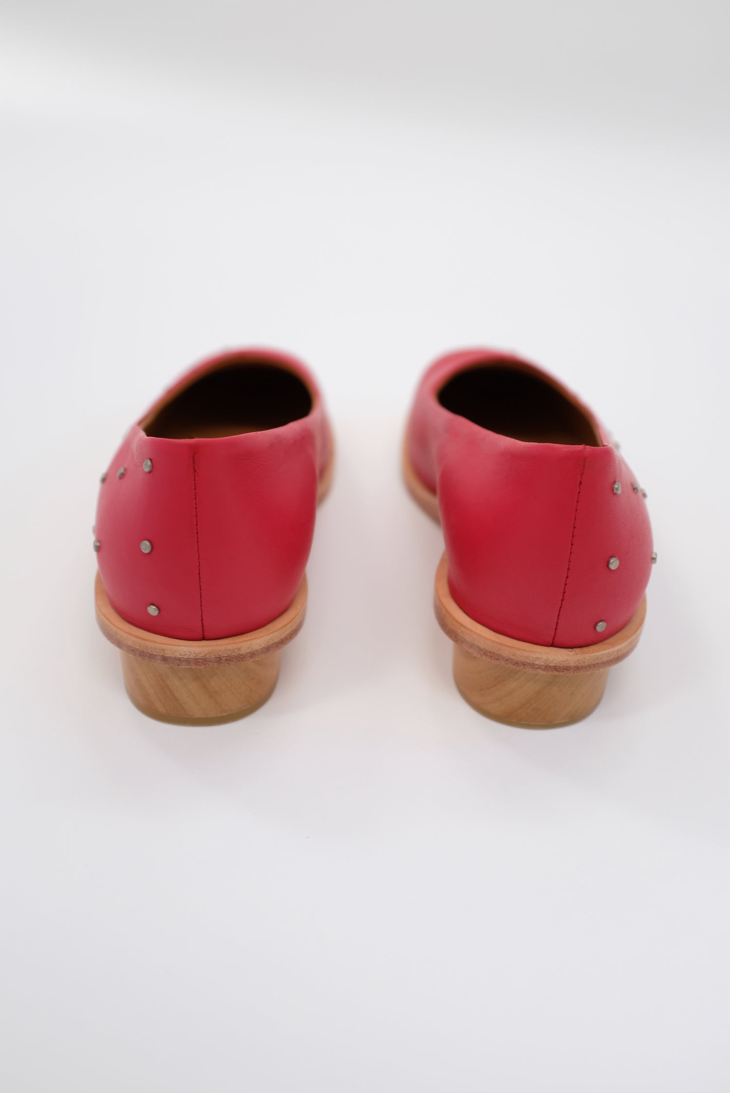 All day wearable low pump. Contrasting right and left sides, one side stud covered leather. Leather sole with hand carved rounded wood heel and leather welt. Leather lined.