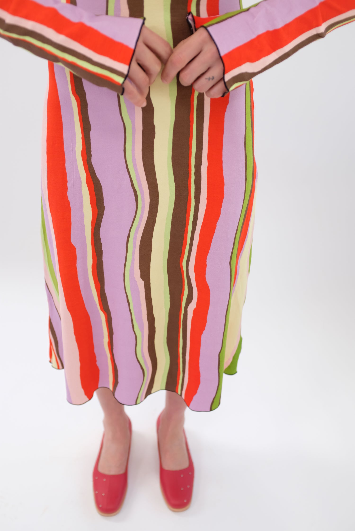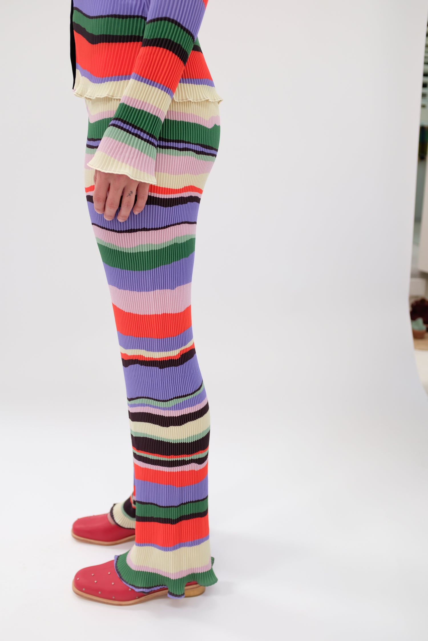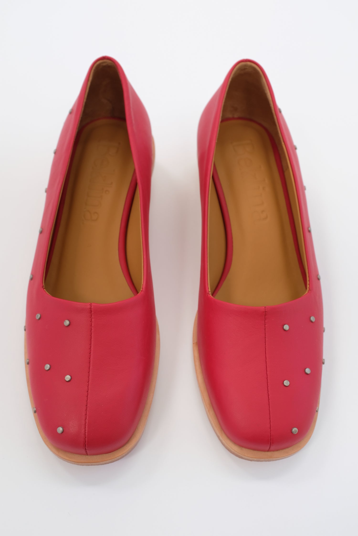 All day wearable low pump. Contrasting right and left sides, one side stud covered leather. Leather sole with hand carved rounded wood heel and leather welt. Leather lined.