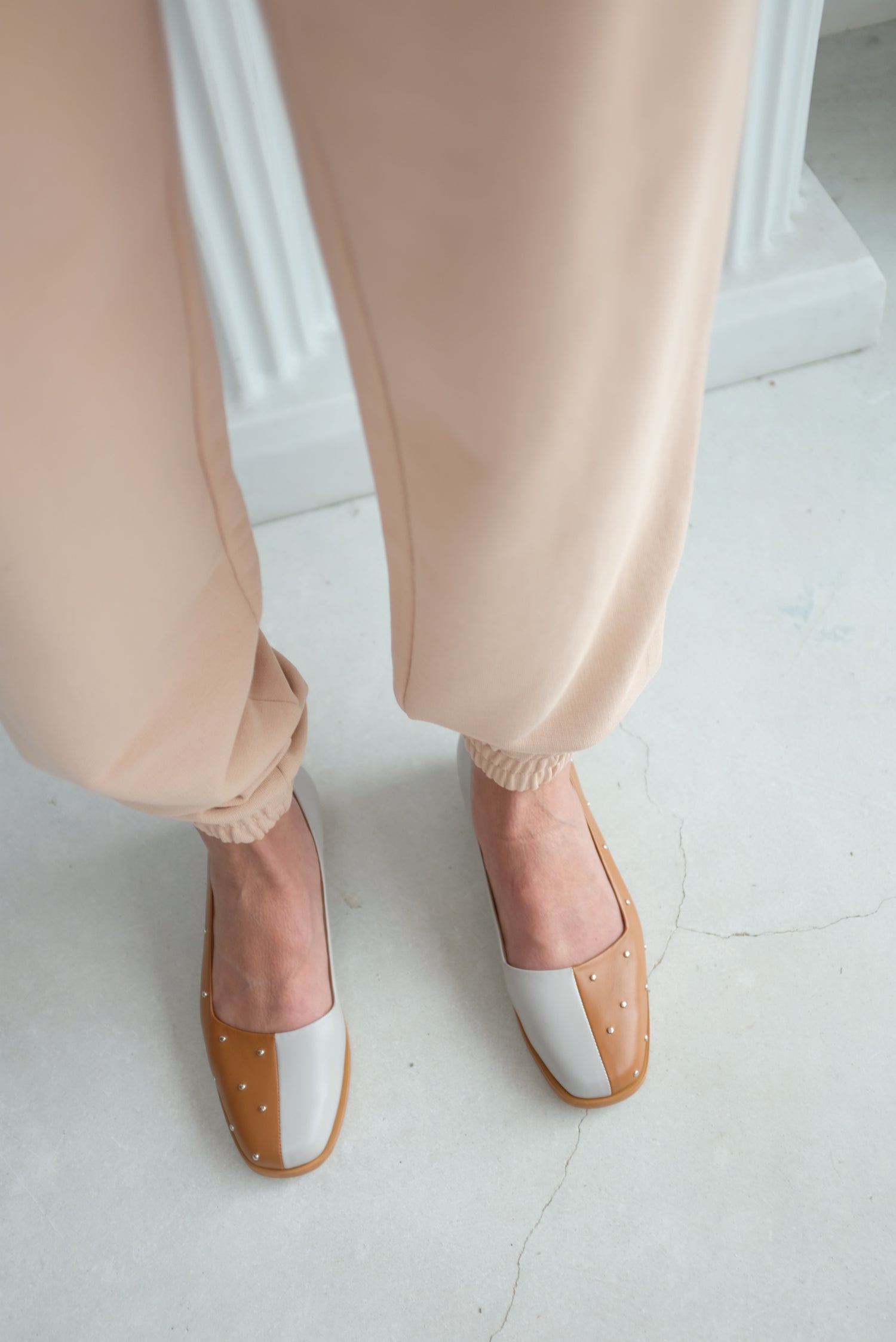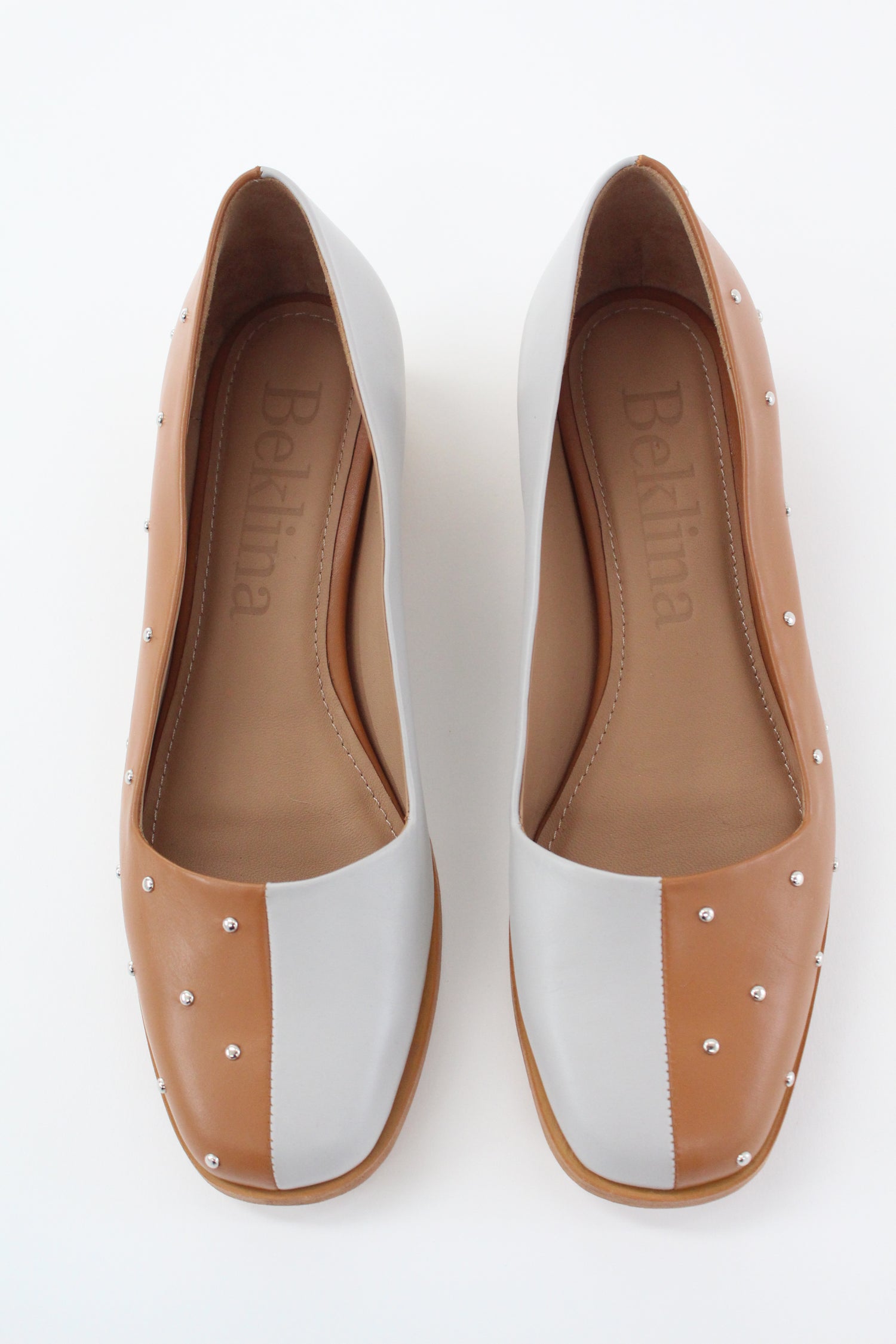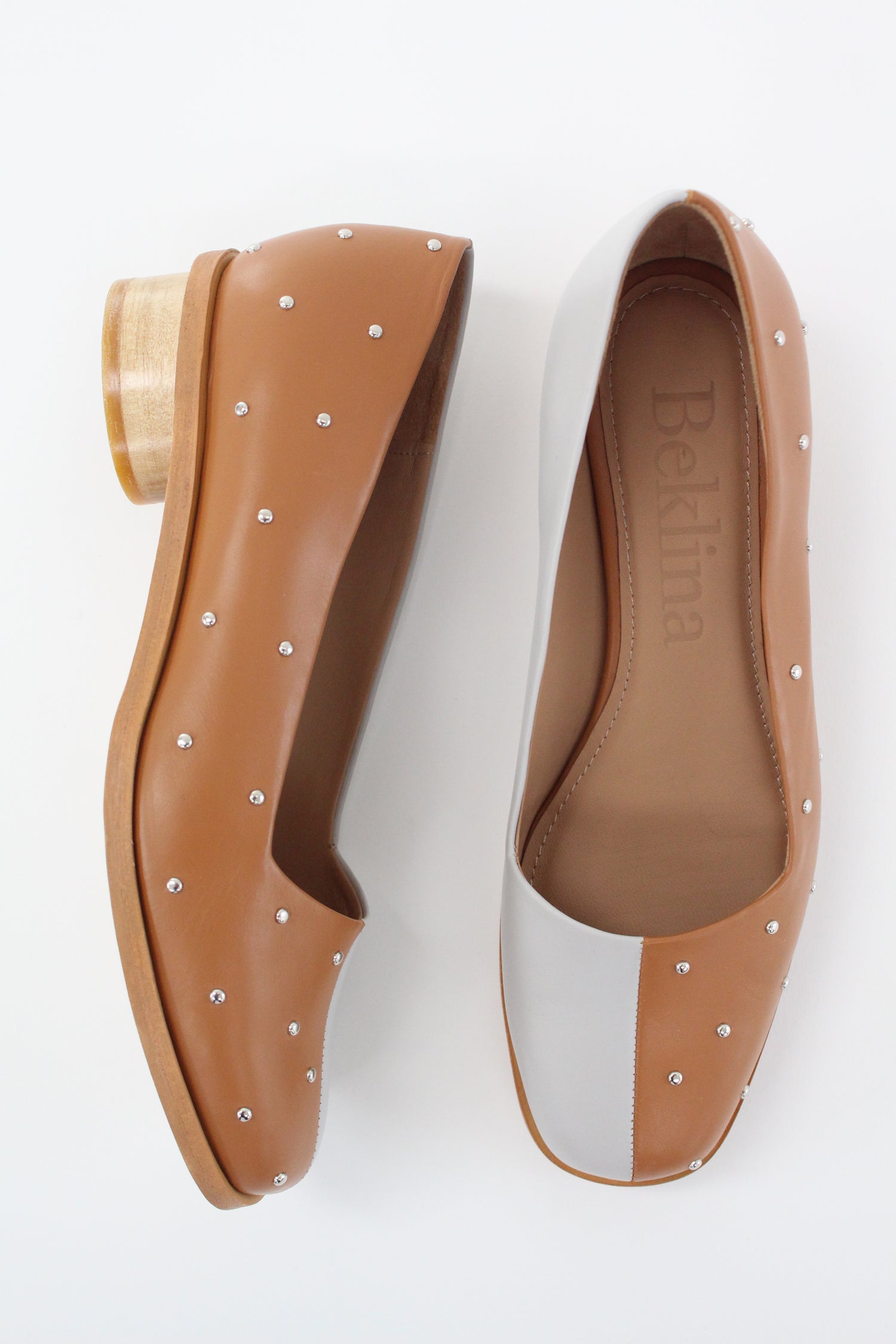 All day wearable low pump. Contrasting right and left sides, one side stud covered dry clay leather, and the other grey leather. Leather sole with hand carved rounded wood heel and leather welt. Leather lined.