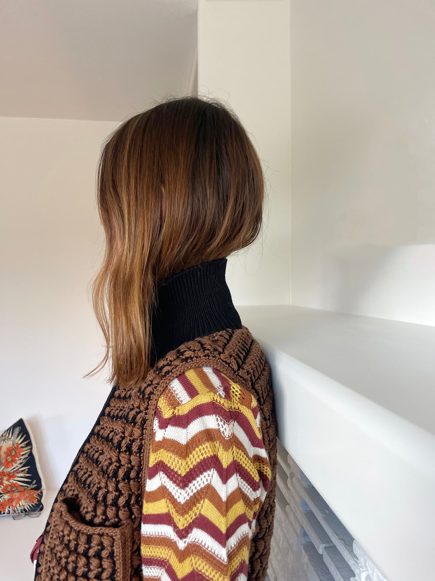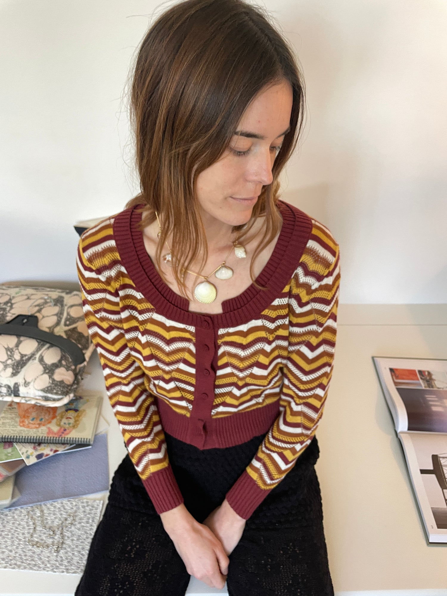 Lightweight cotton knit cardigan sweater, double ribbed collar detail at neckline. Airy light soft, stretchy cotton, 2.5" ribbing at cuffs, 4.5" ribbing at waist. 100% Cotton. Exclusive to Beklina.