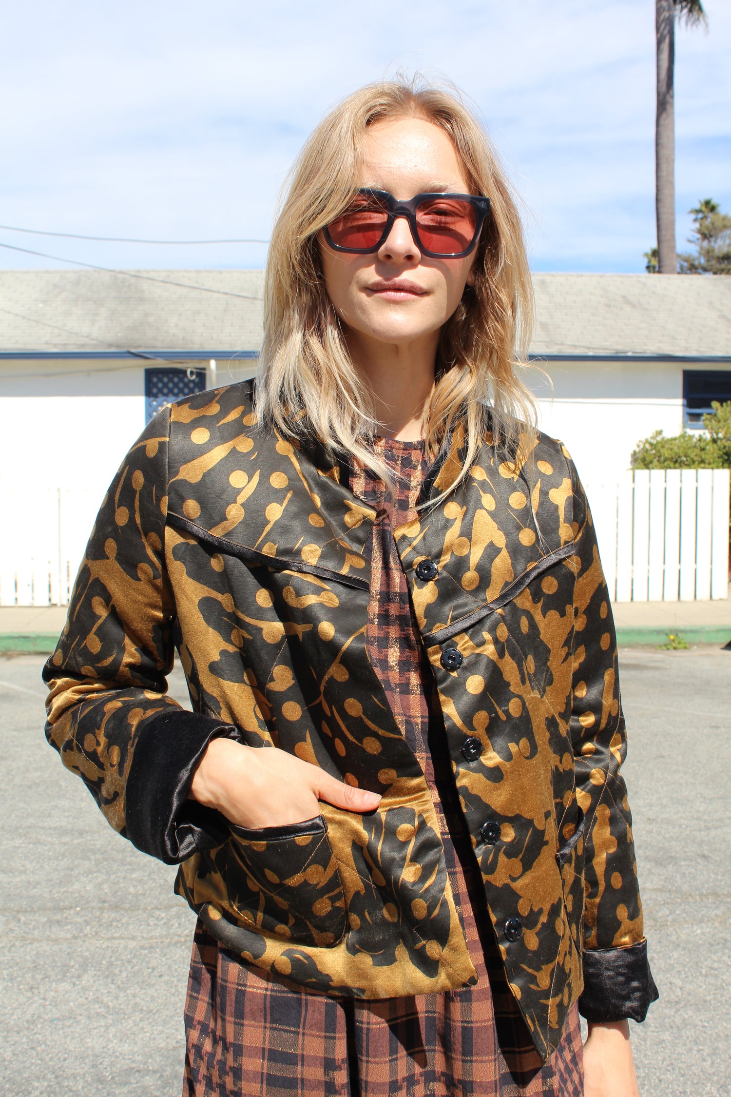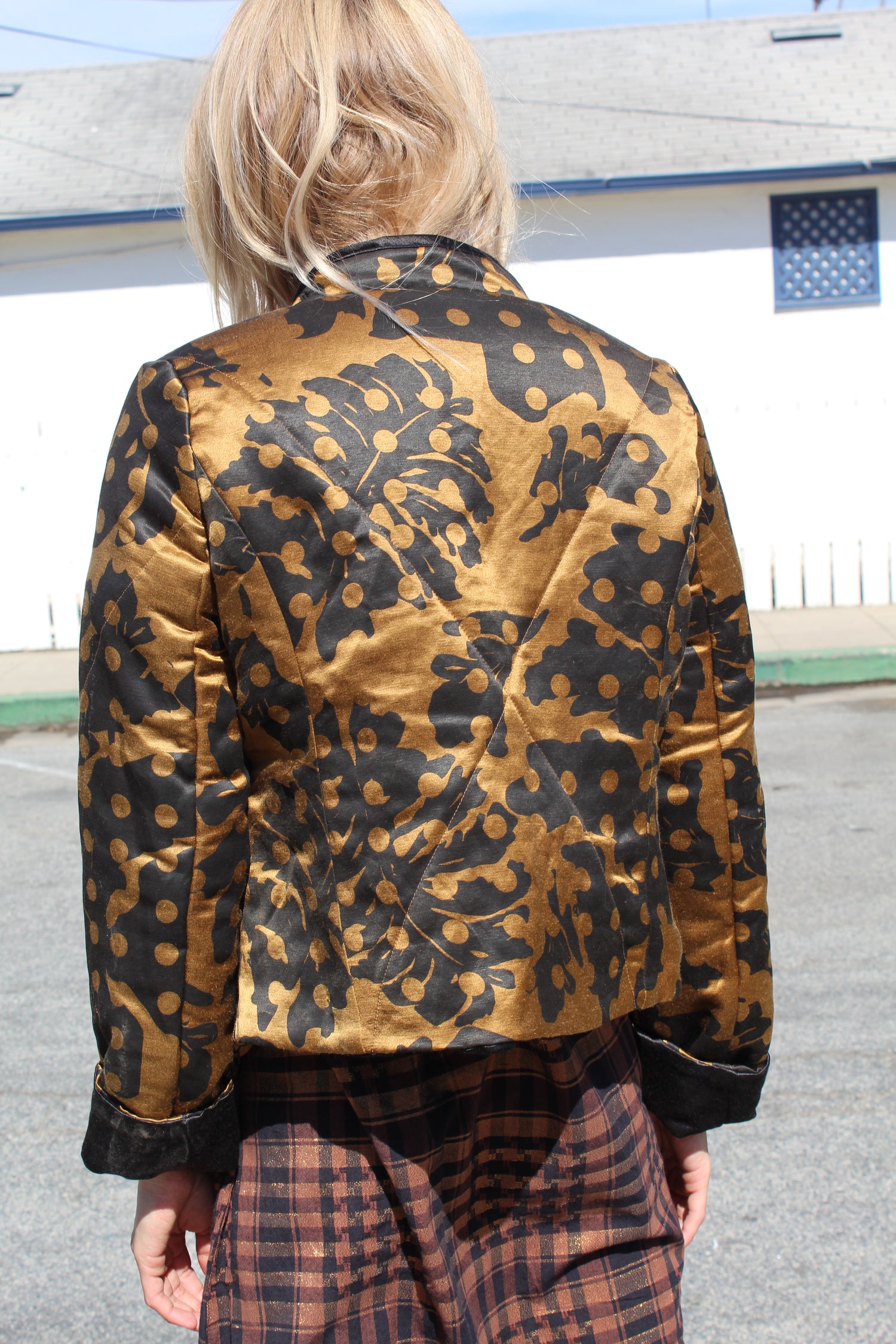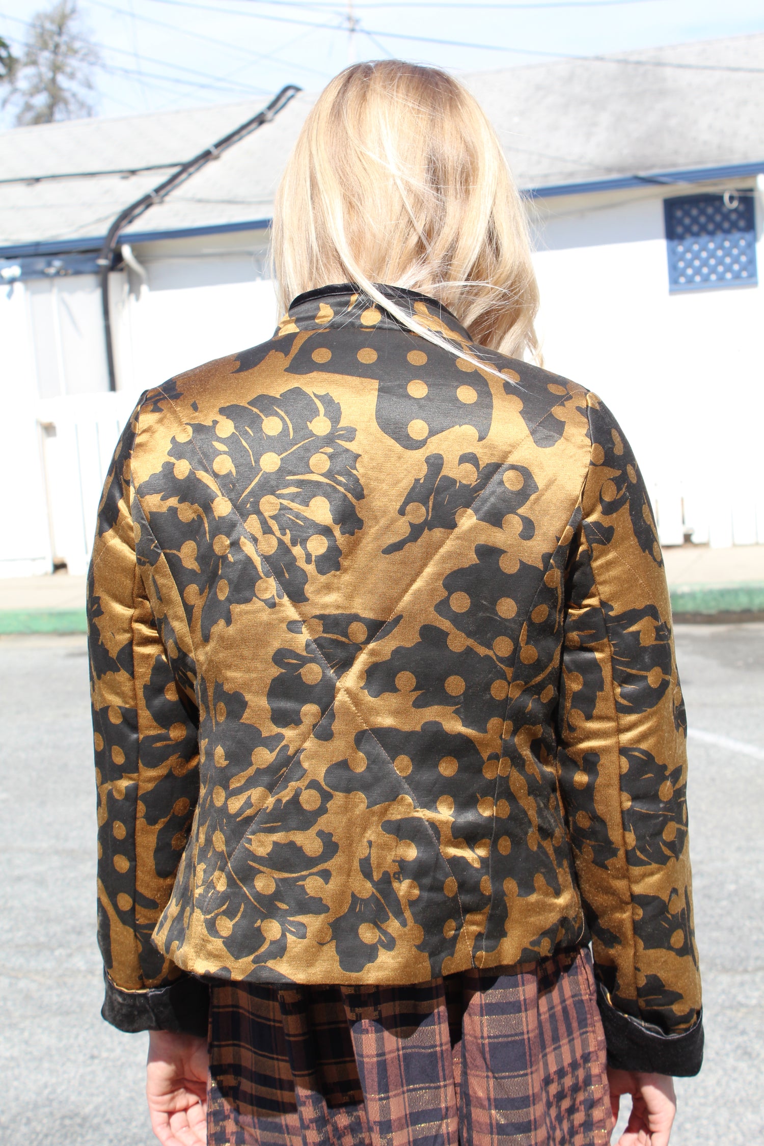 Fitted quilt jacket, a shop favorite. Lined, as gorgeous on the inside as on the outside. Limited edition black Leaf print on bronze organic silk and hemp exterior, cotton batting, silk interior. Front pocket, x-quilt design throughout, large snaps down front. Tailored to perfection. A jacket made for long term relationships, as in best friend or lover.