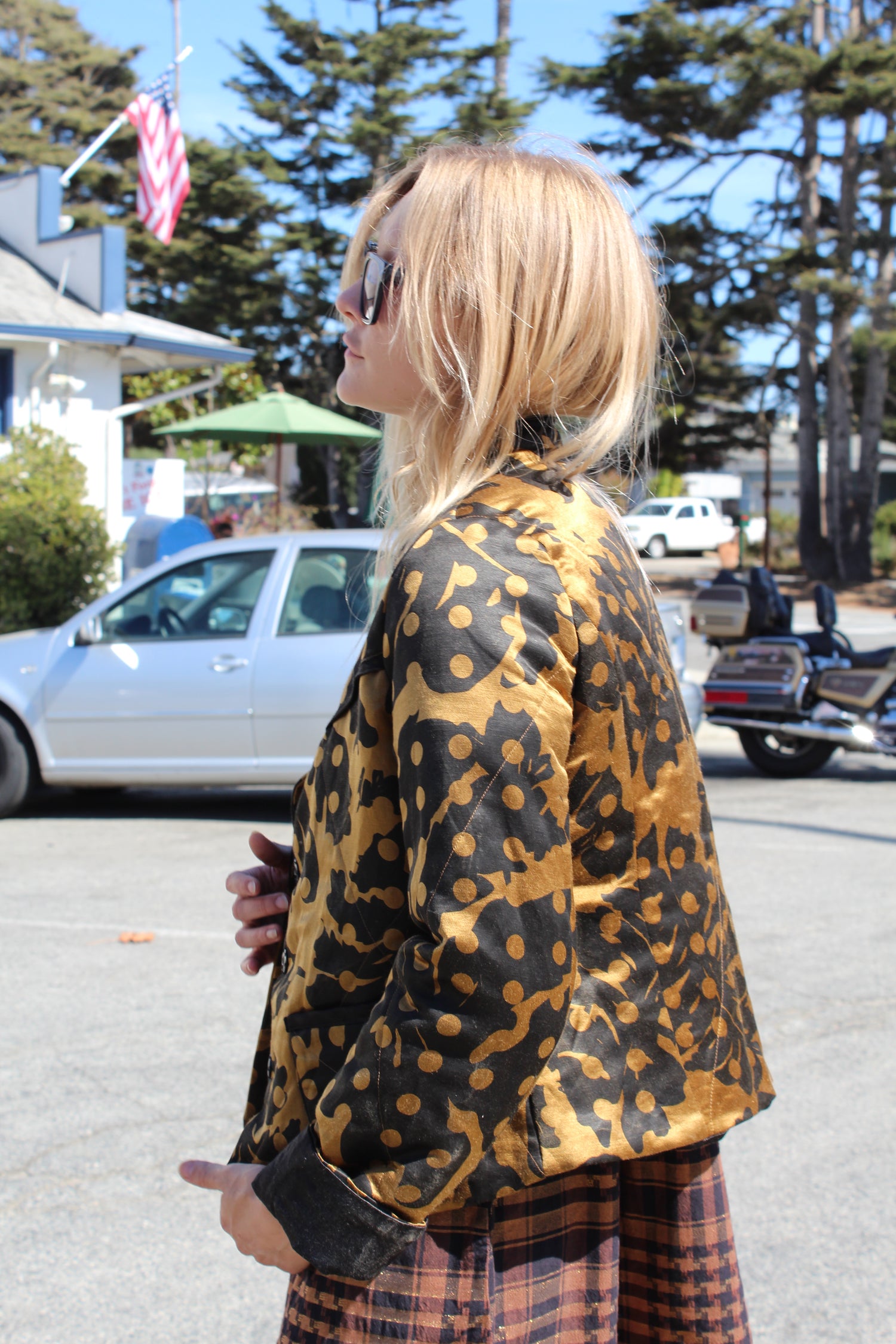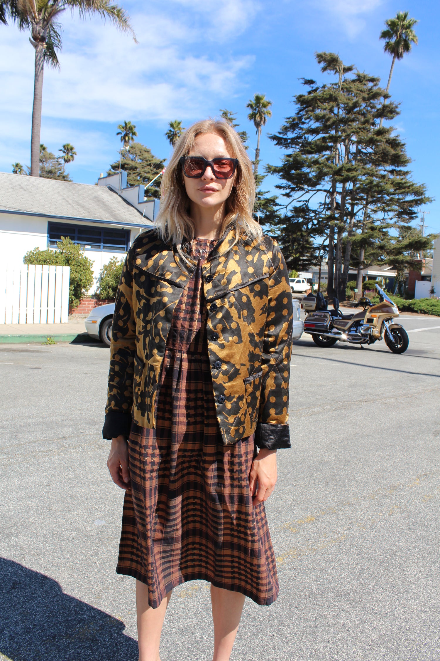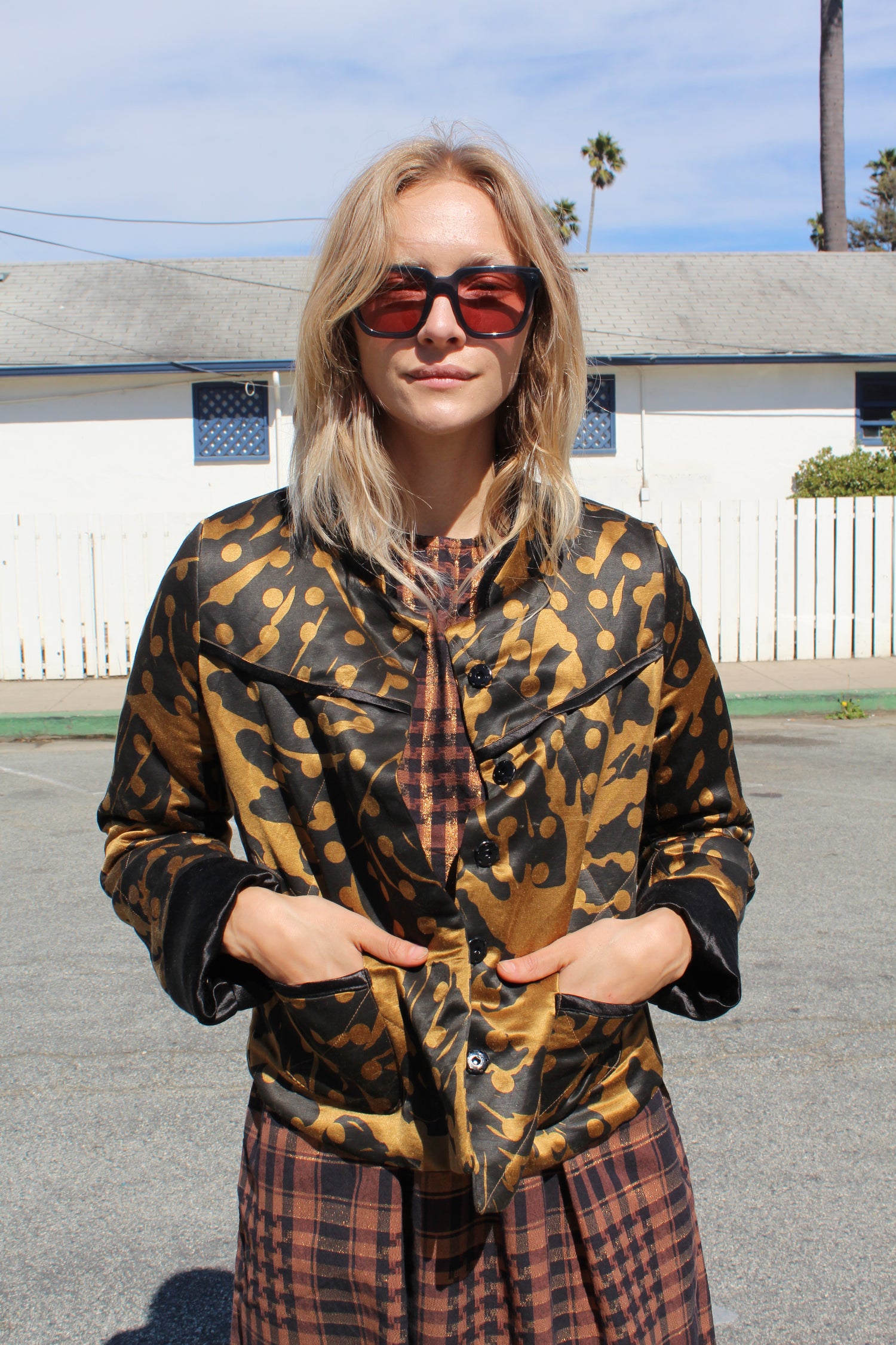 Fitted quilt jacket, a shop favorite. Lined, as gorgeous on the inside as on the outside. Limited edition black Leaf print on bronze organic silk and hemp exterior, cotton batting, silk interior. Front pocket, x-quilt design throughout, large snaps down front. Tailored to perfection. A jacket made for long term relationships, as in best friend or lover.
