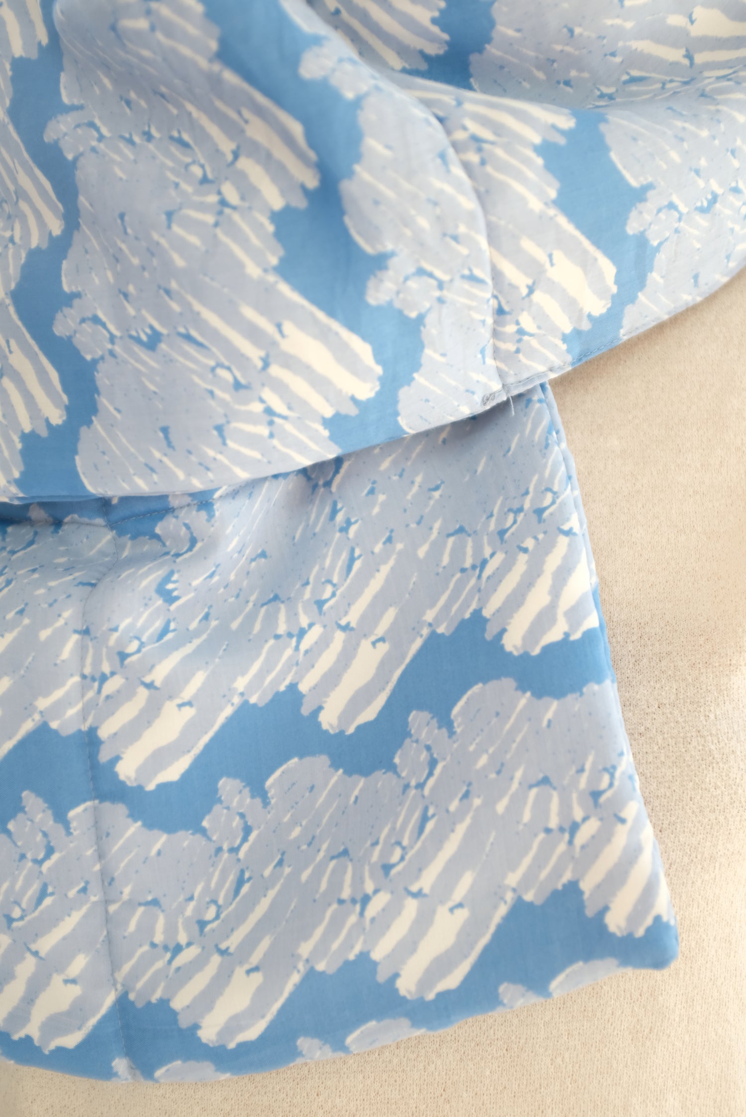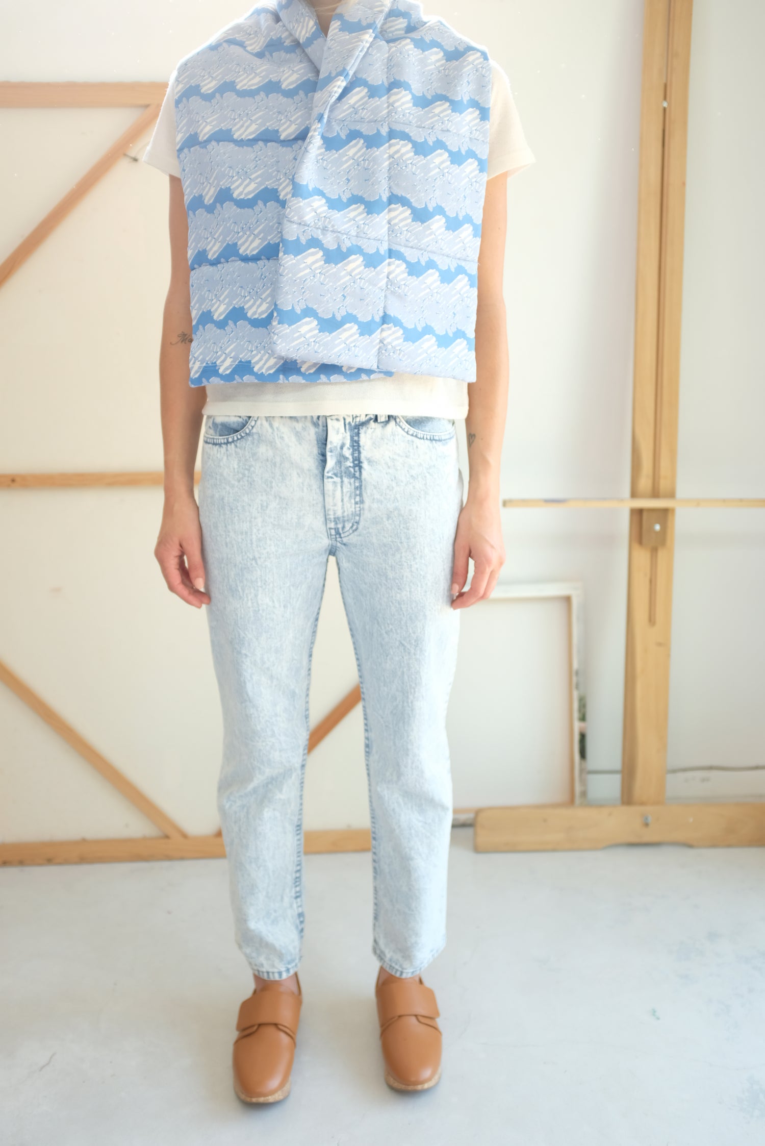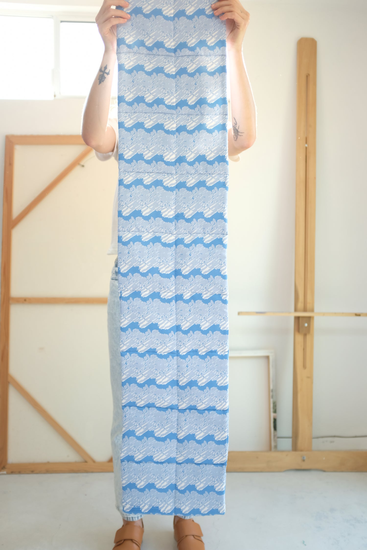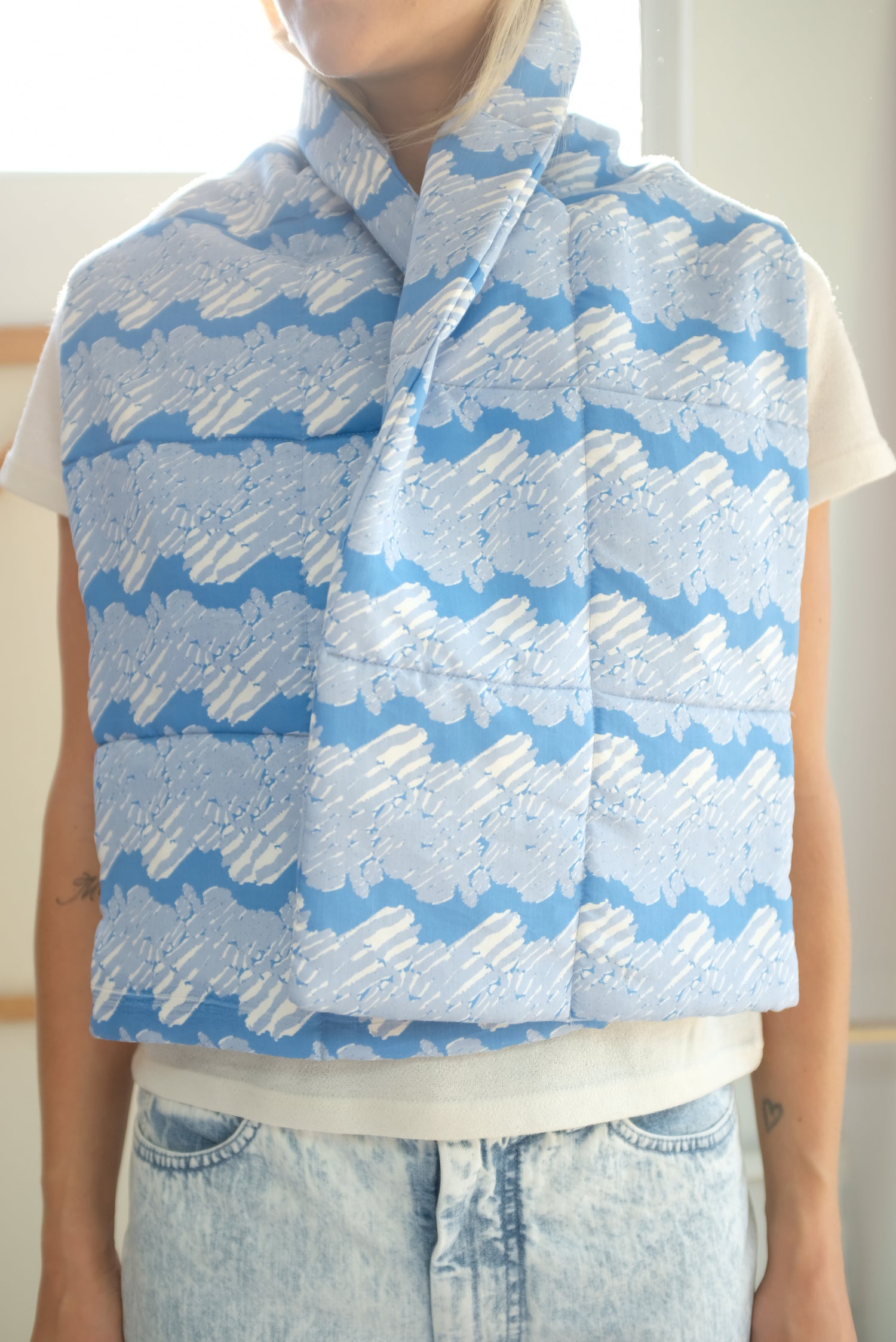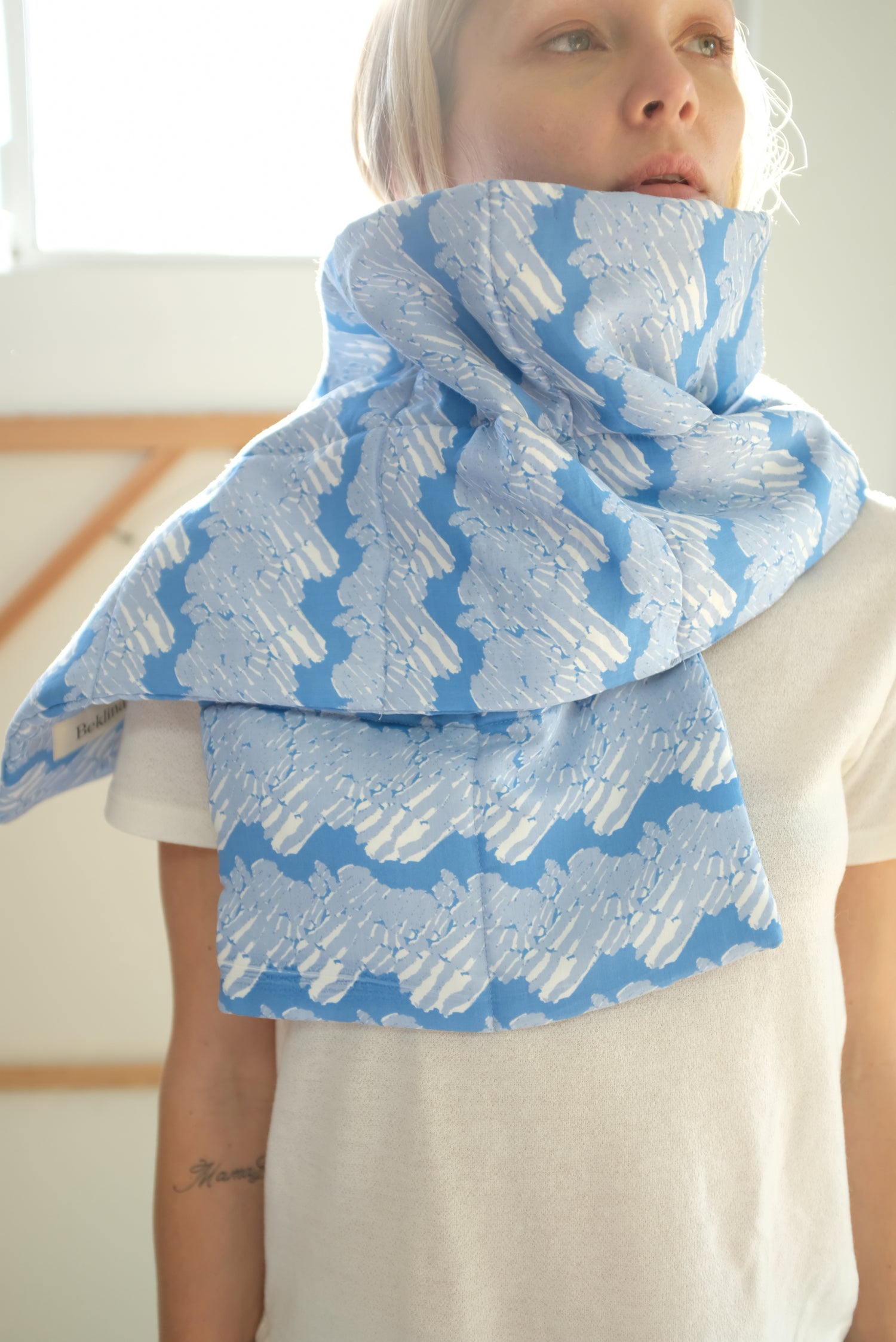 Super cozy, like a mini blanket for taking out in the world. 100% cotton silk blend with an inside layer of puffy cotton padding. Screen printed limited edition. Aprox 11" x 53".