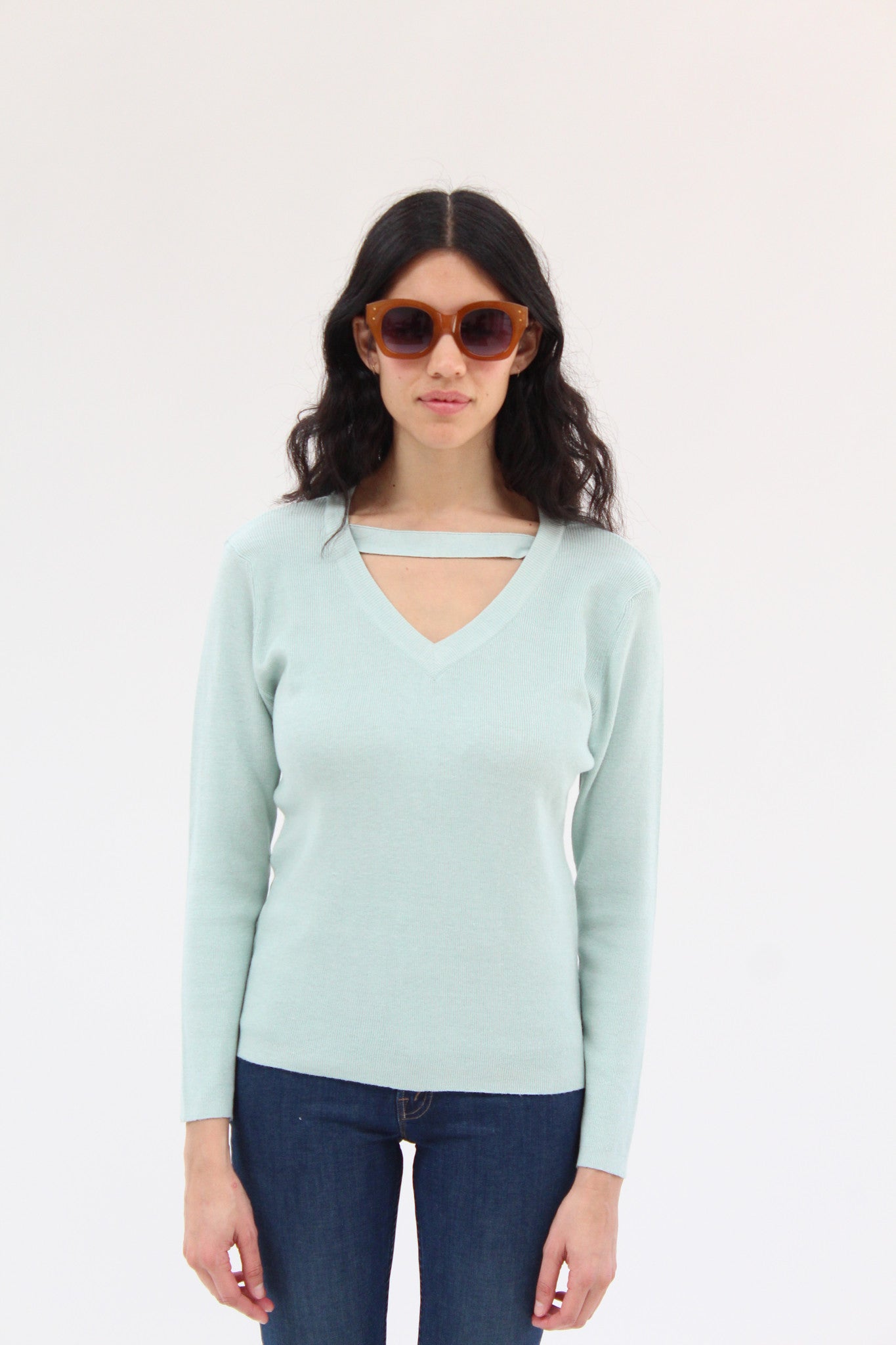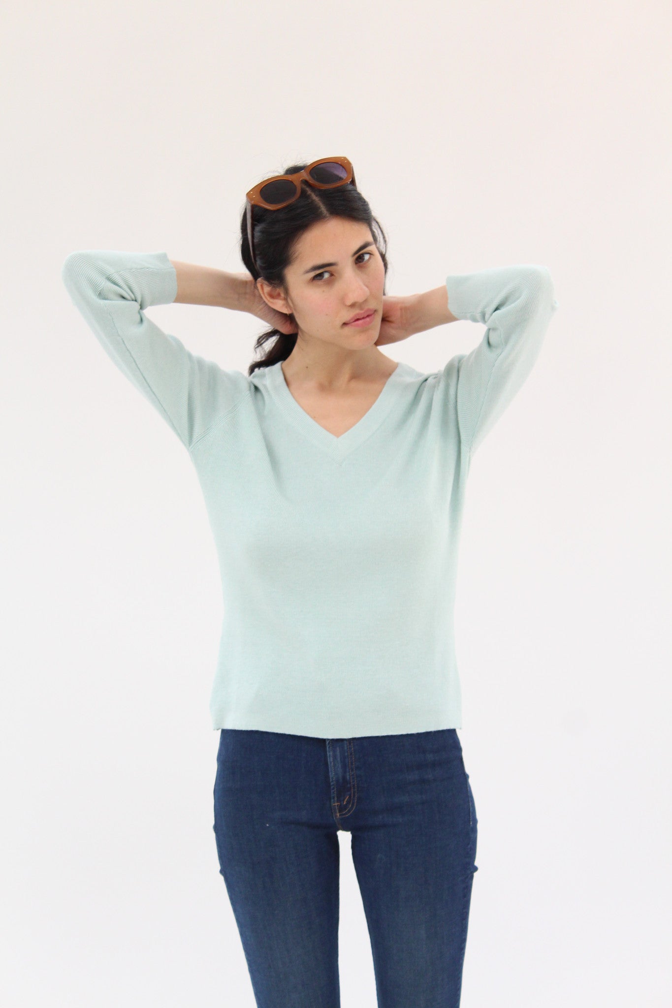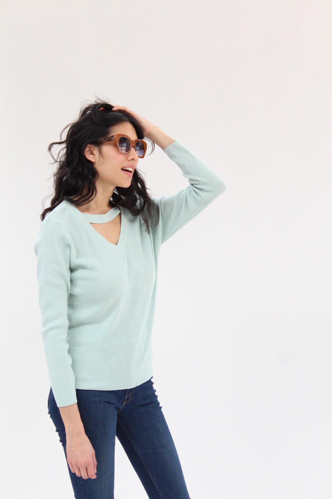 30% silk, 20% cashmere and 50% ultra soft wool, medium weight, soft & luxurious, long sleeve, v neckline, removable (via a large hidden snap) bar detail across front neckline. Exclusive to Beklina. Sarah is wearing size small/medium and she is 5 8"
