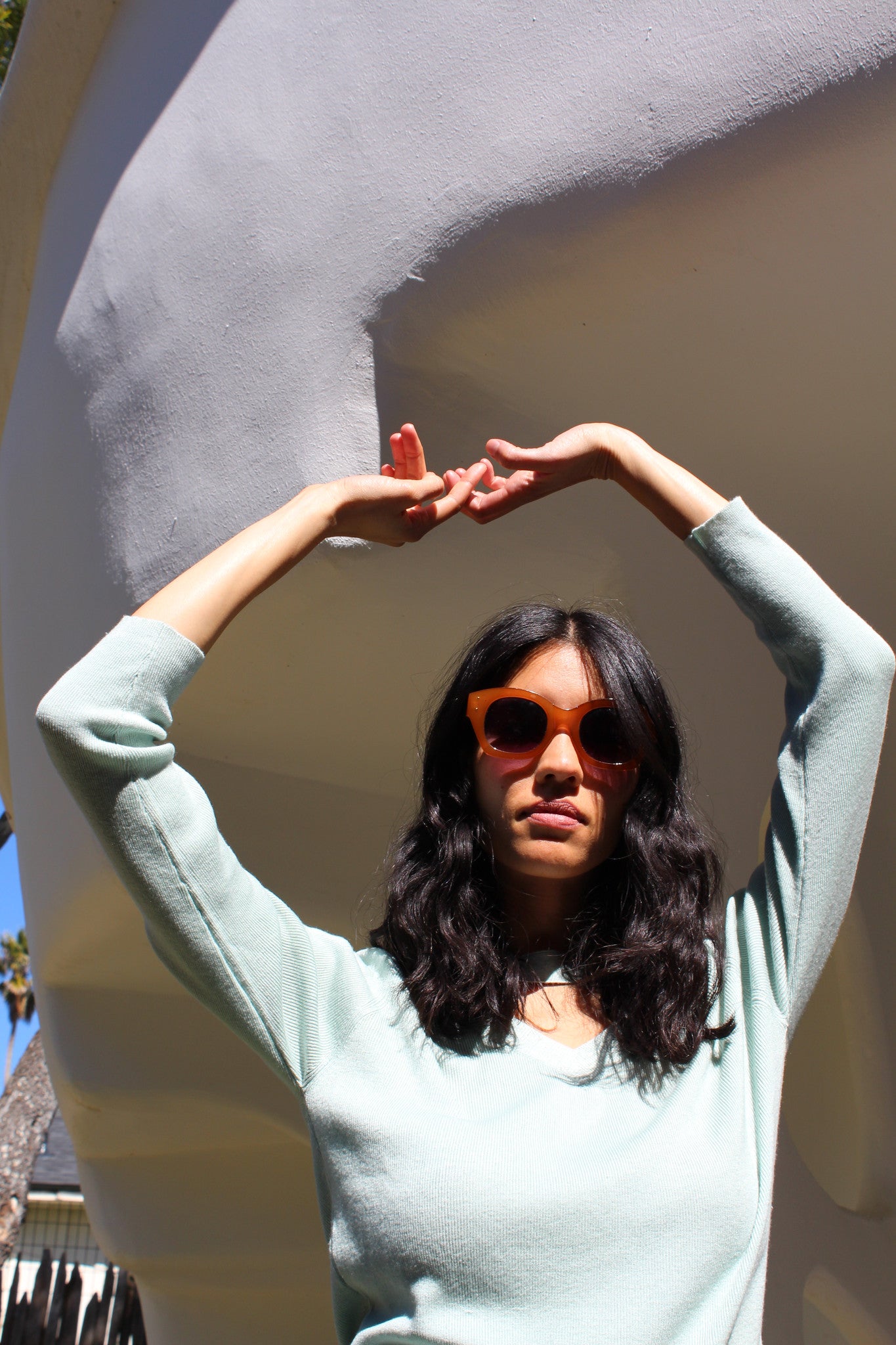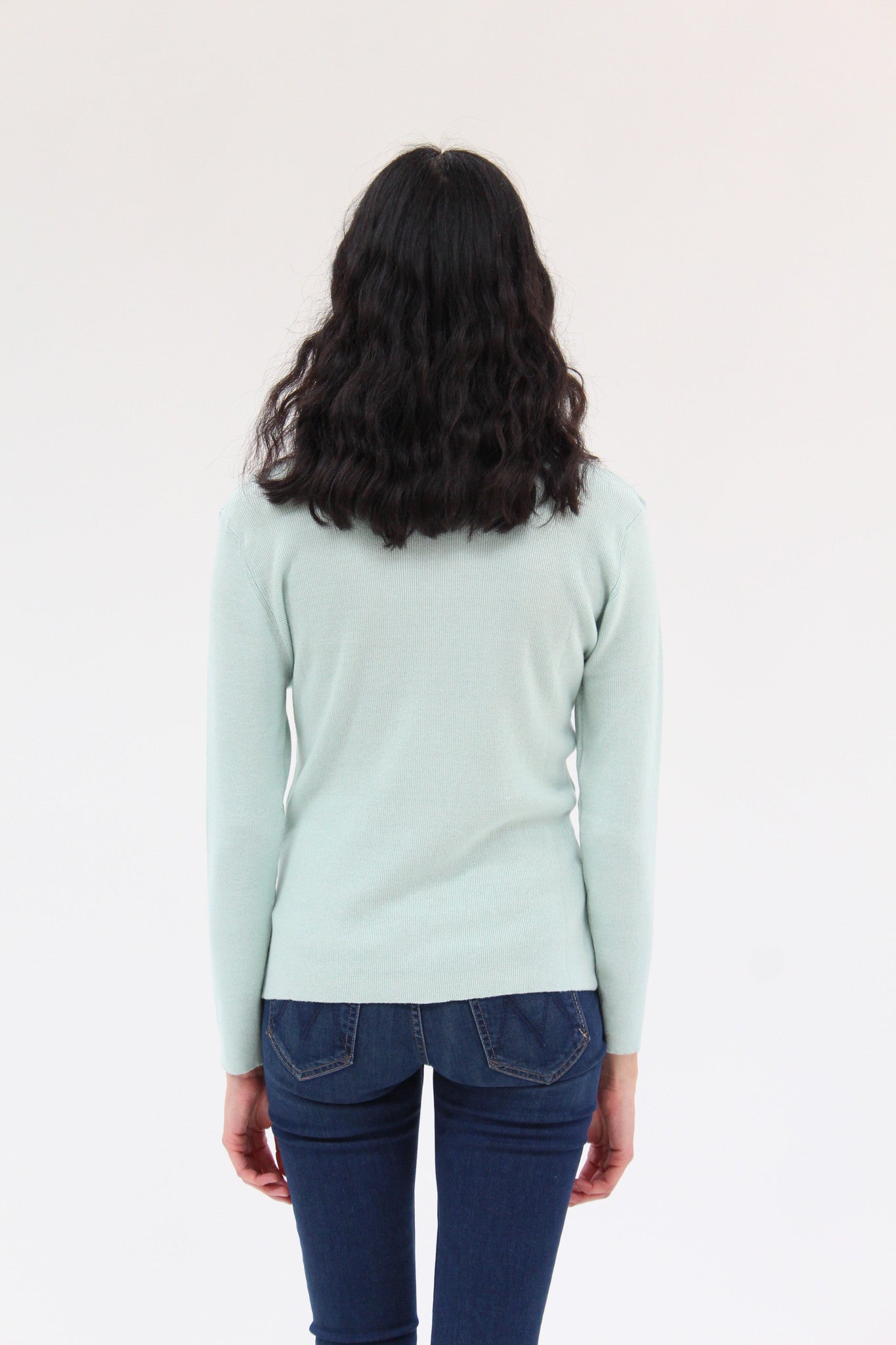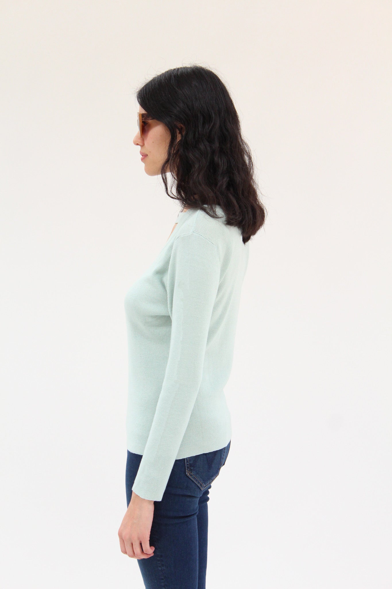 30% silk, 20% cashmere and 50% ultra soft wool, medium weight, soft & luxurious, long sleeve, v neckline, removable (via a large hidden snap) bar detail across front neckline. Exclusive to Beklina. Sarah is wearing size small/medium and she is 5 8"
