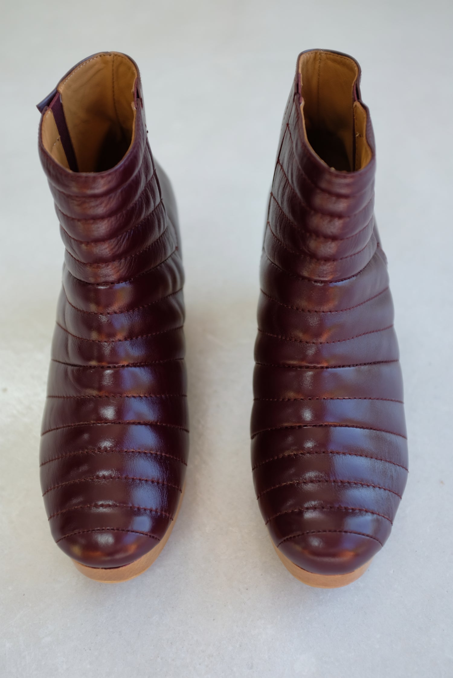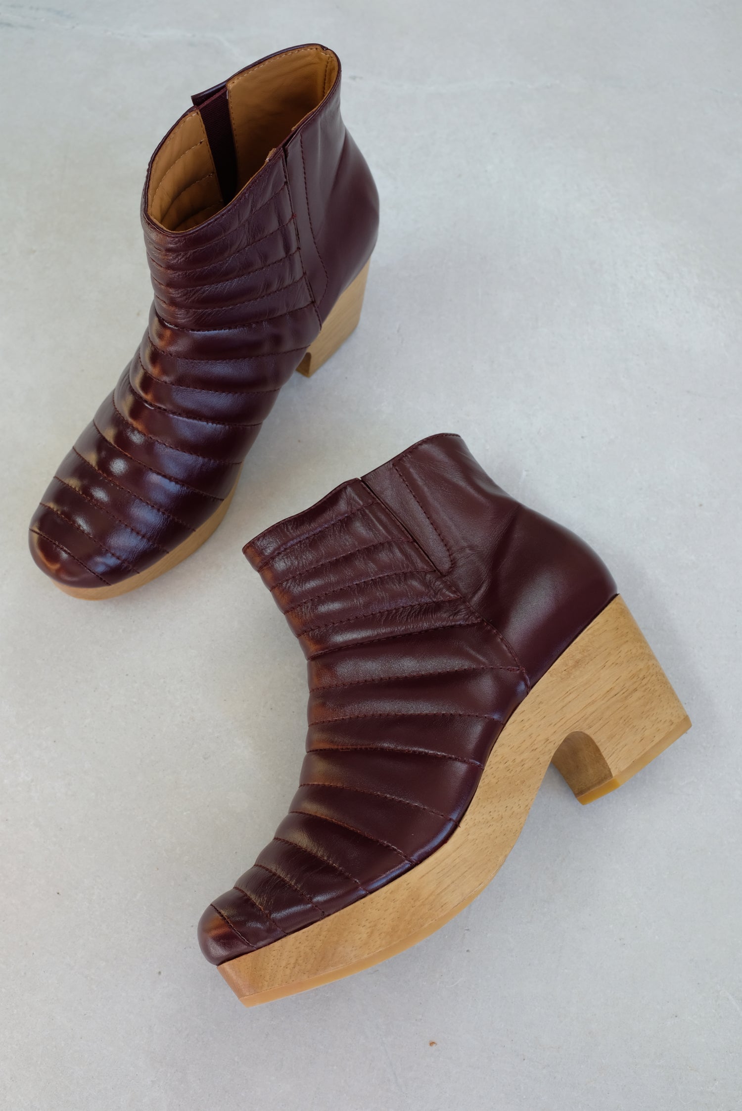 Hand carved wooden platform heel, 100% Italian leather uppers and leather lined. 2 1/2" heel. Ultra comfortable, all-day-wearable, wood wedge clogs!