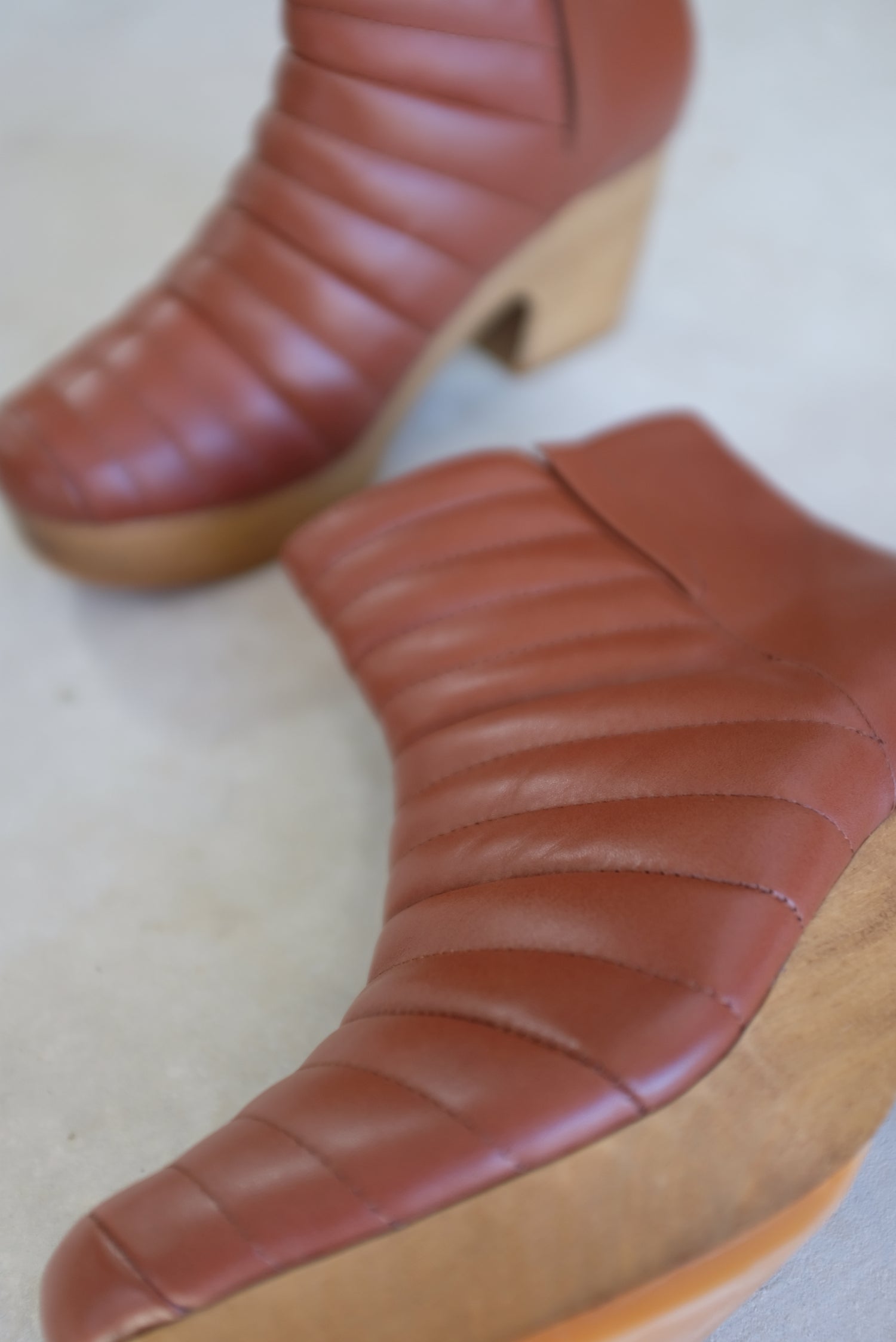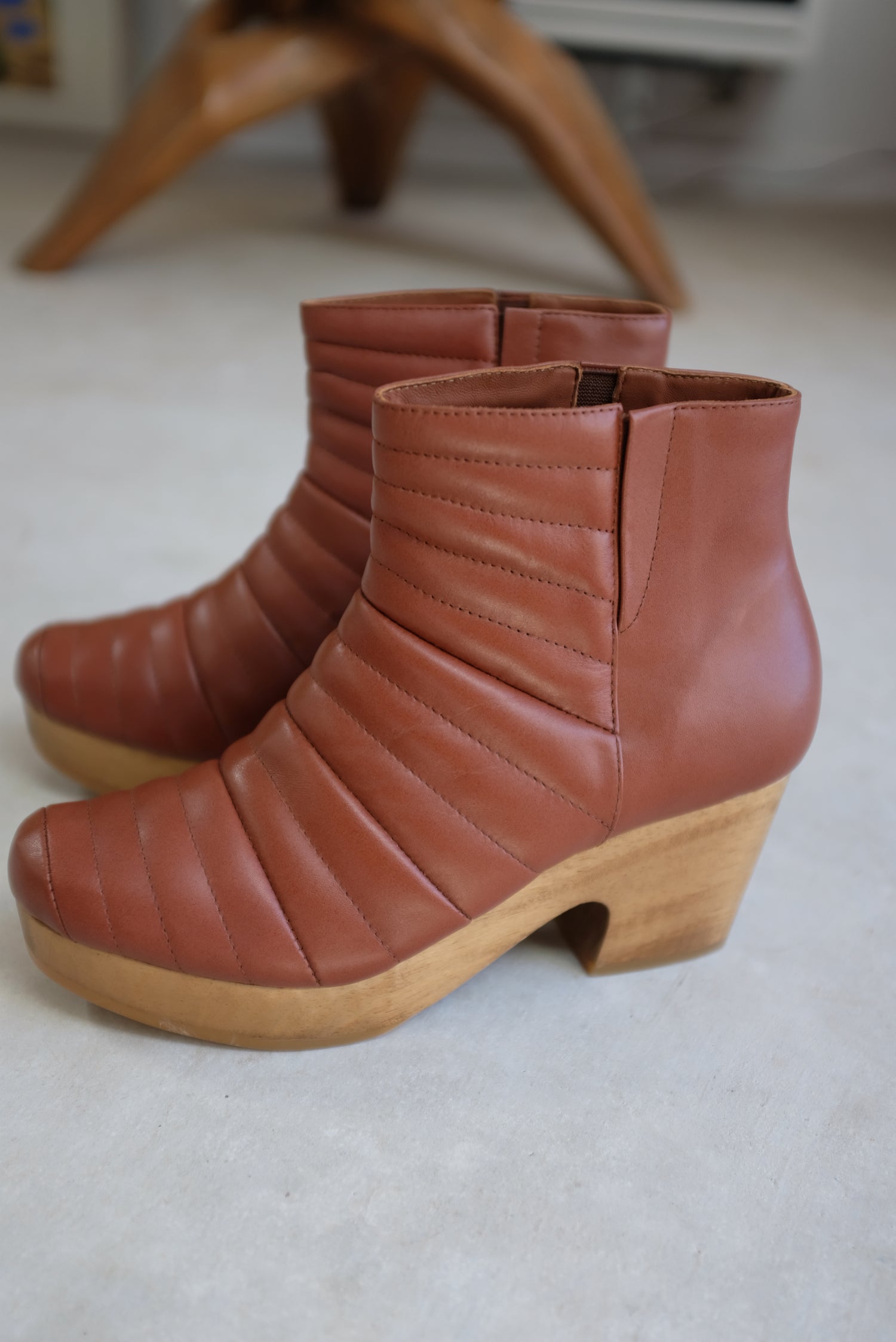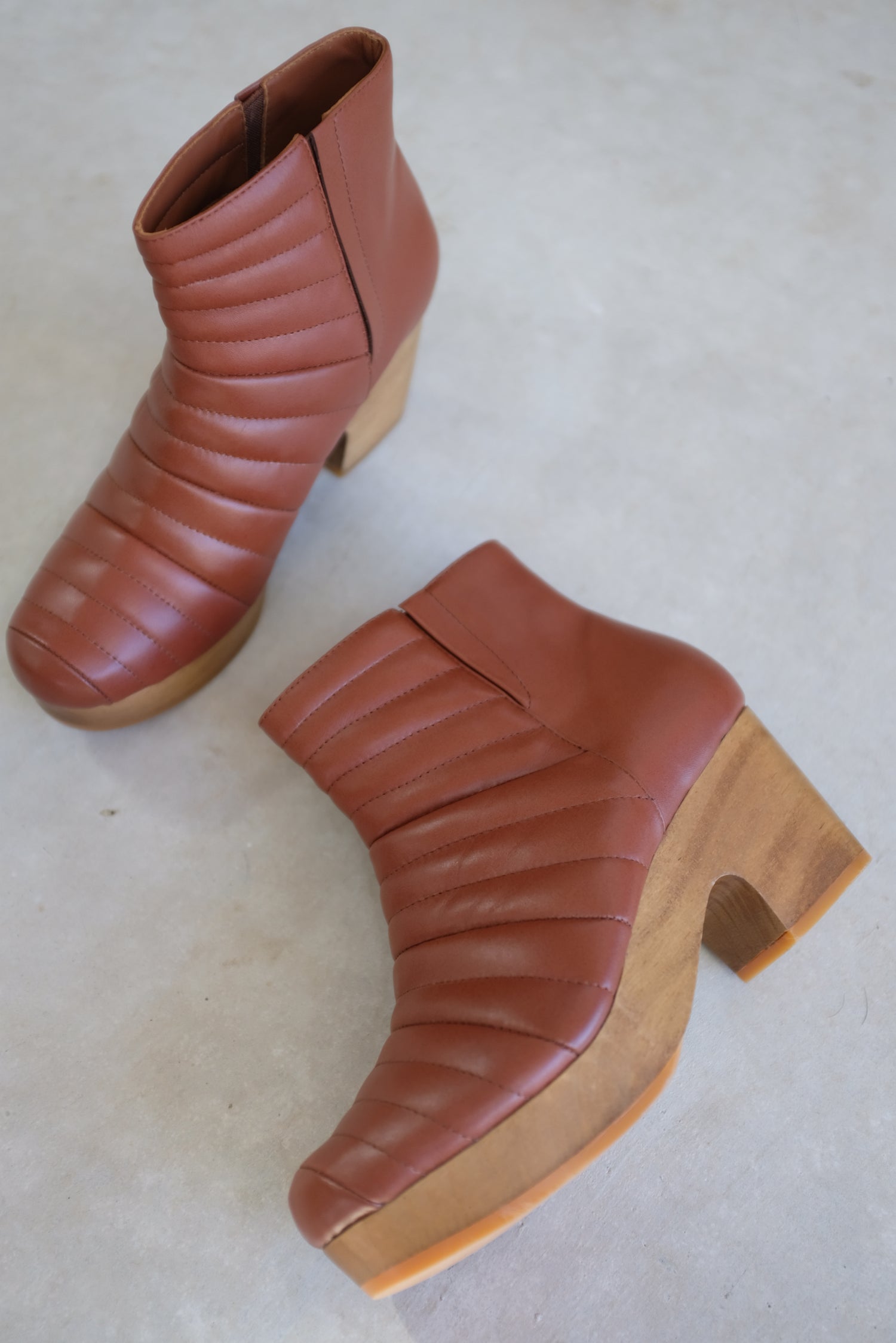 Hand carved wooden platform heel, 100% Italian leather uppers and leather lined. 2 1/2" heel. Ultra comfortable, all-day-wearable, wood wedge clogs! Free of staples. Running true to size. If between sizes we suggest going up.