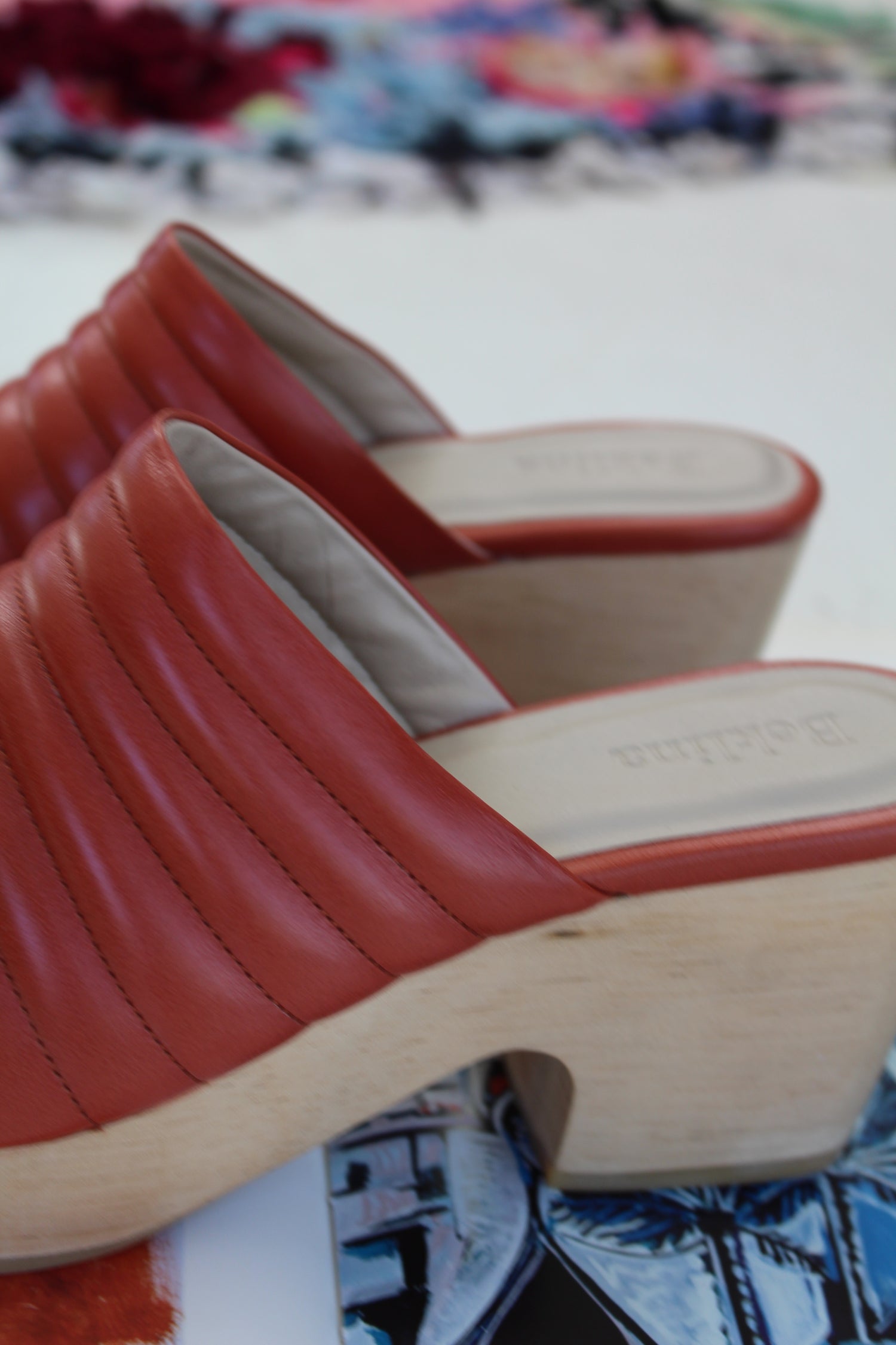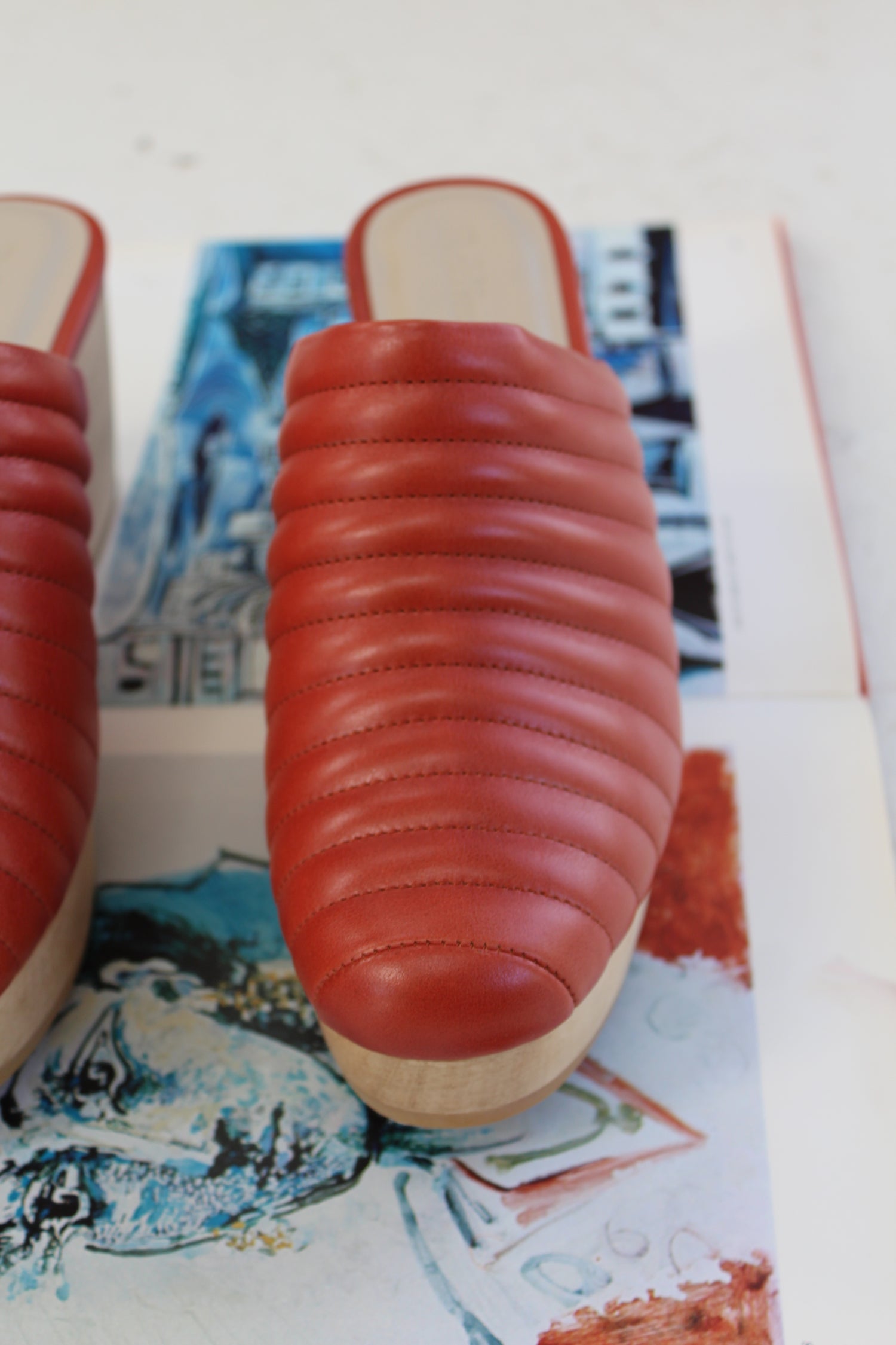 Hand carved wooden platform heel, 100% Italian leather uppers and leather lined. 2 1/2" heel. Ultra comfortable, all-day-wearable, wood wedge clogs! Free of gauche staples.
