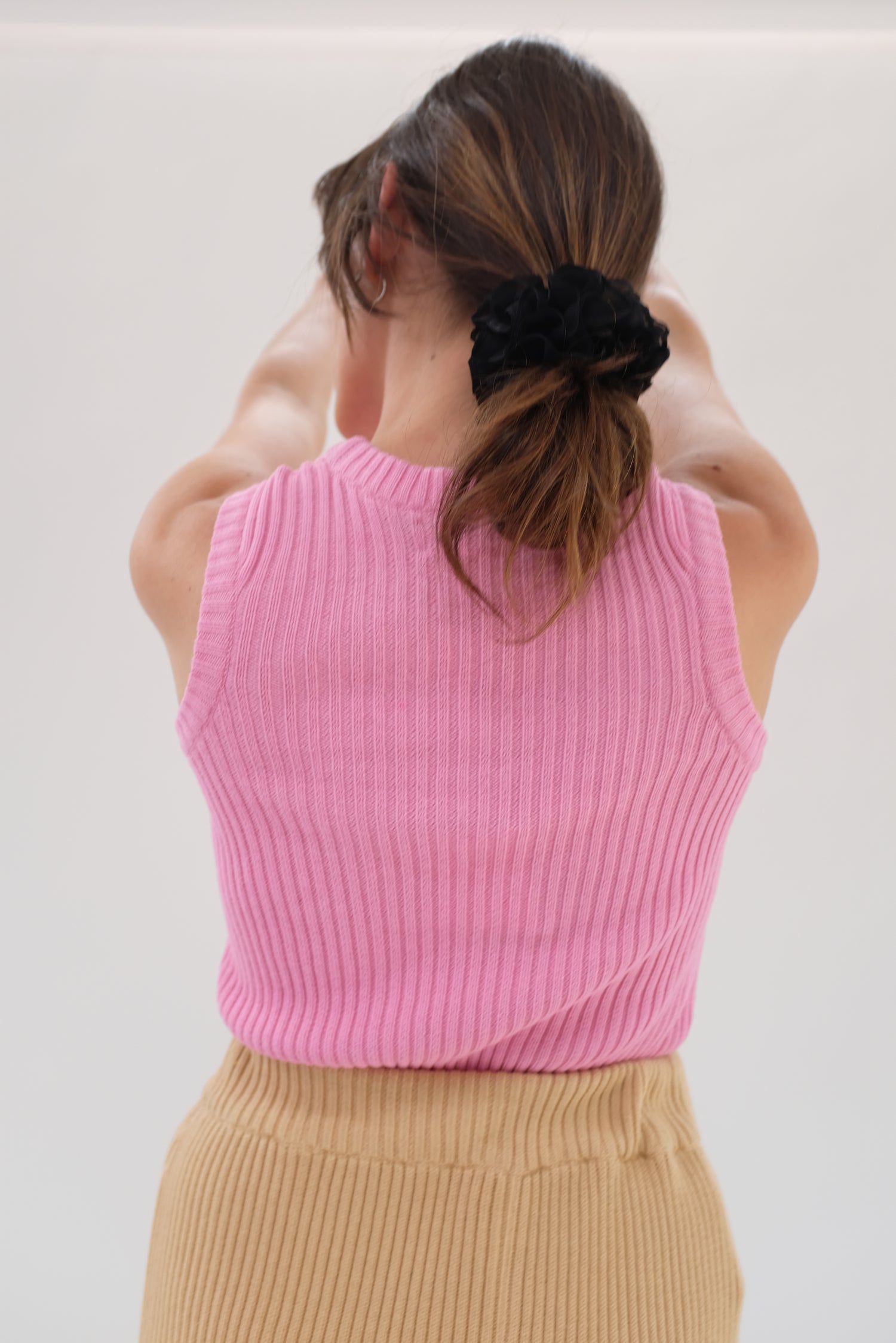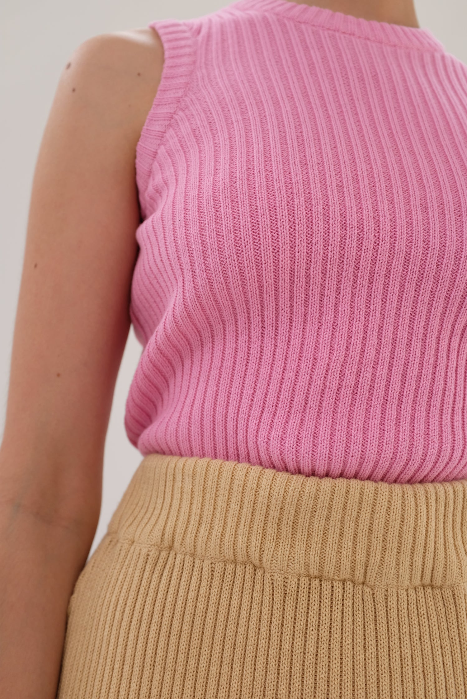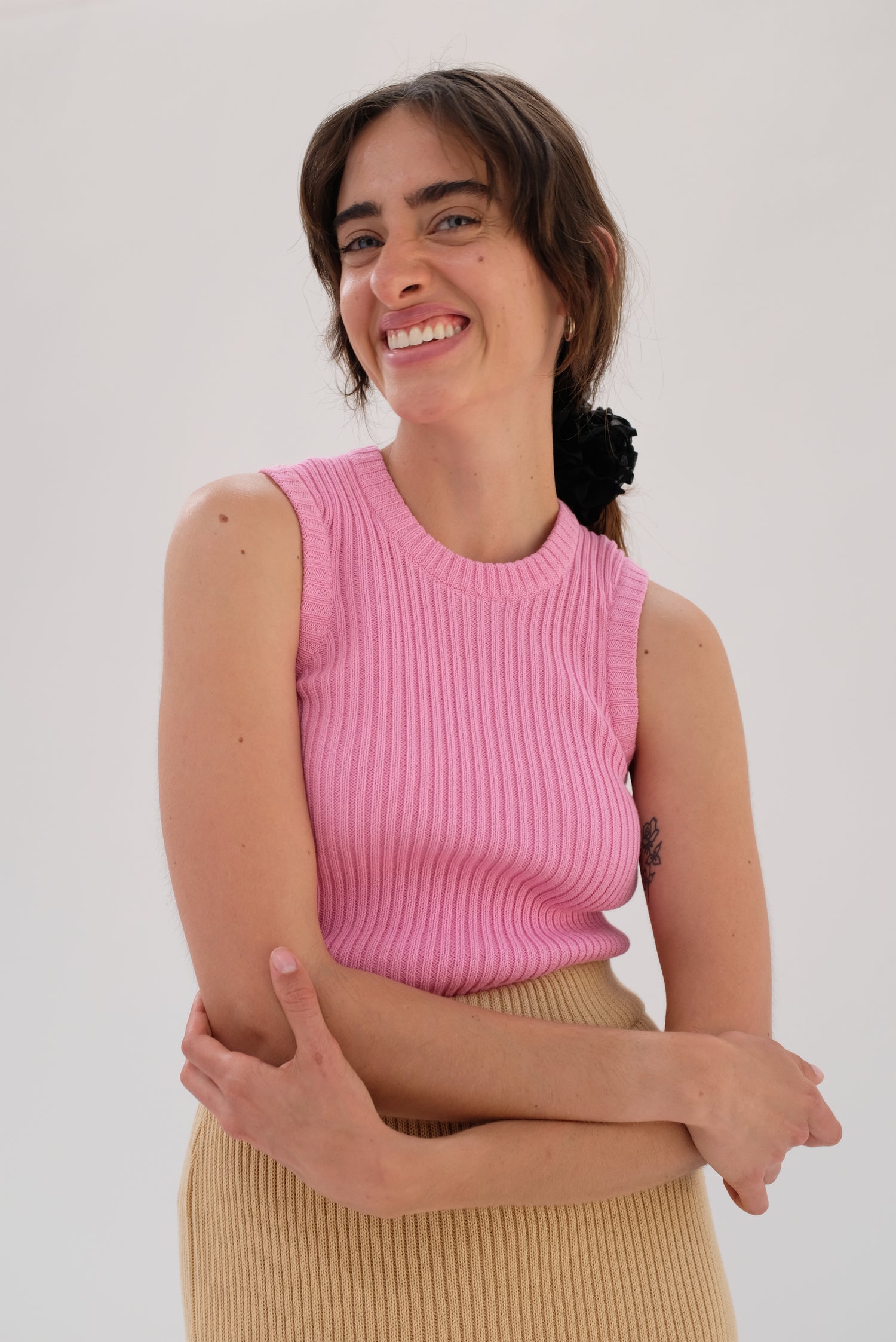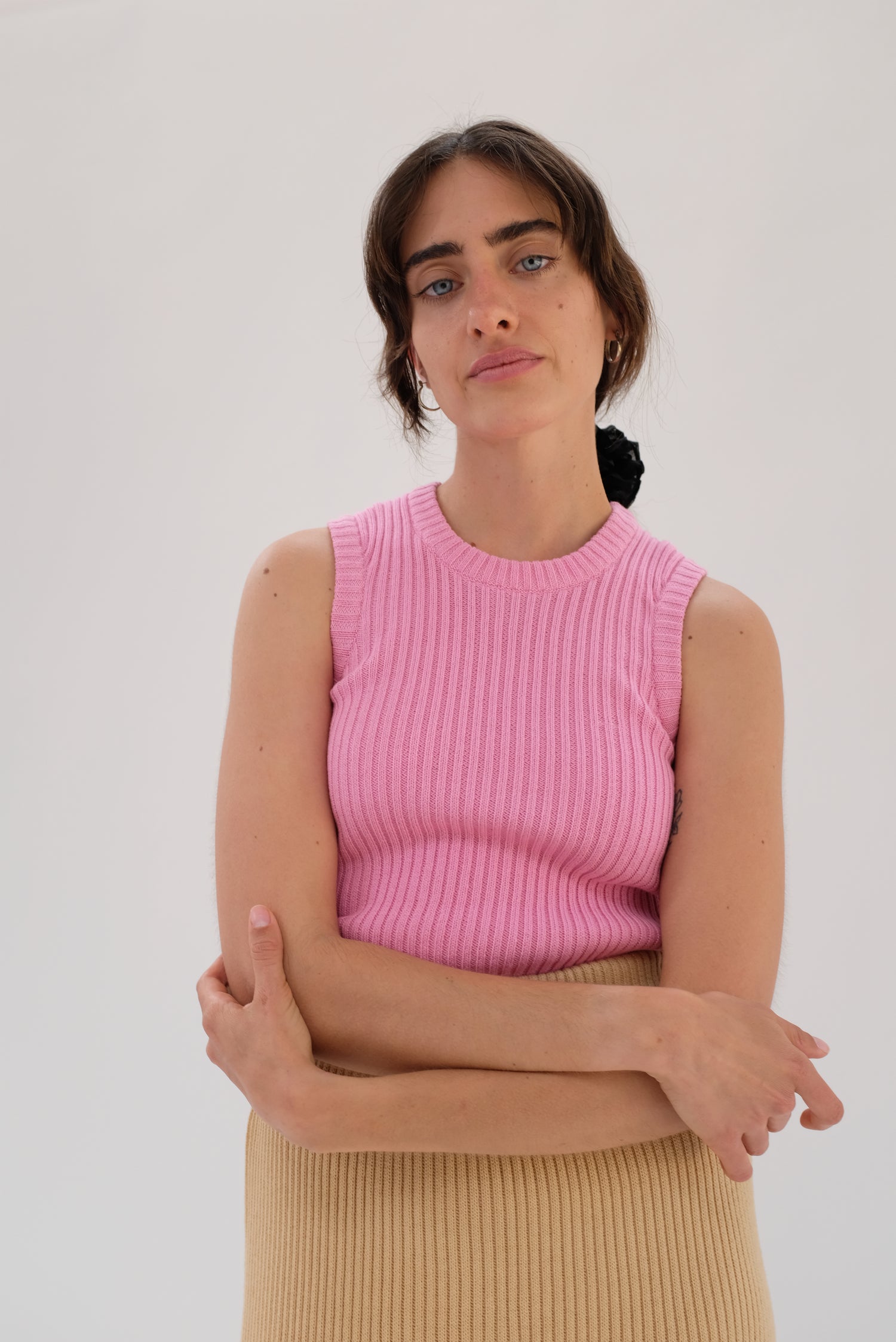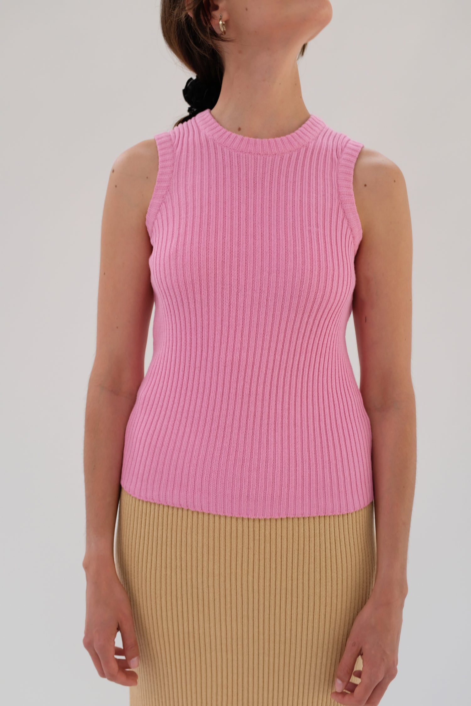 100% Ultra soft cotton knit, ribbed medium weight tank top. Round high neckline. Model is wearing size s/m. Runs true to size and easy fitting.