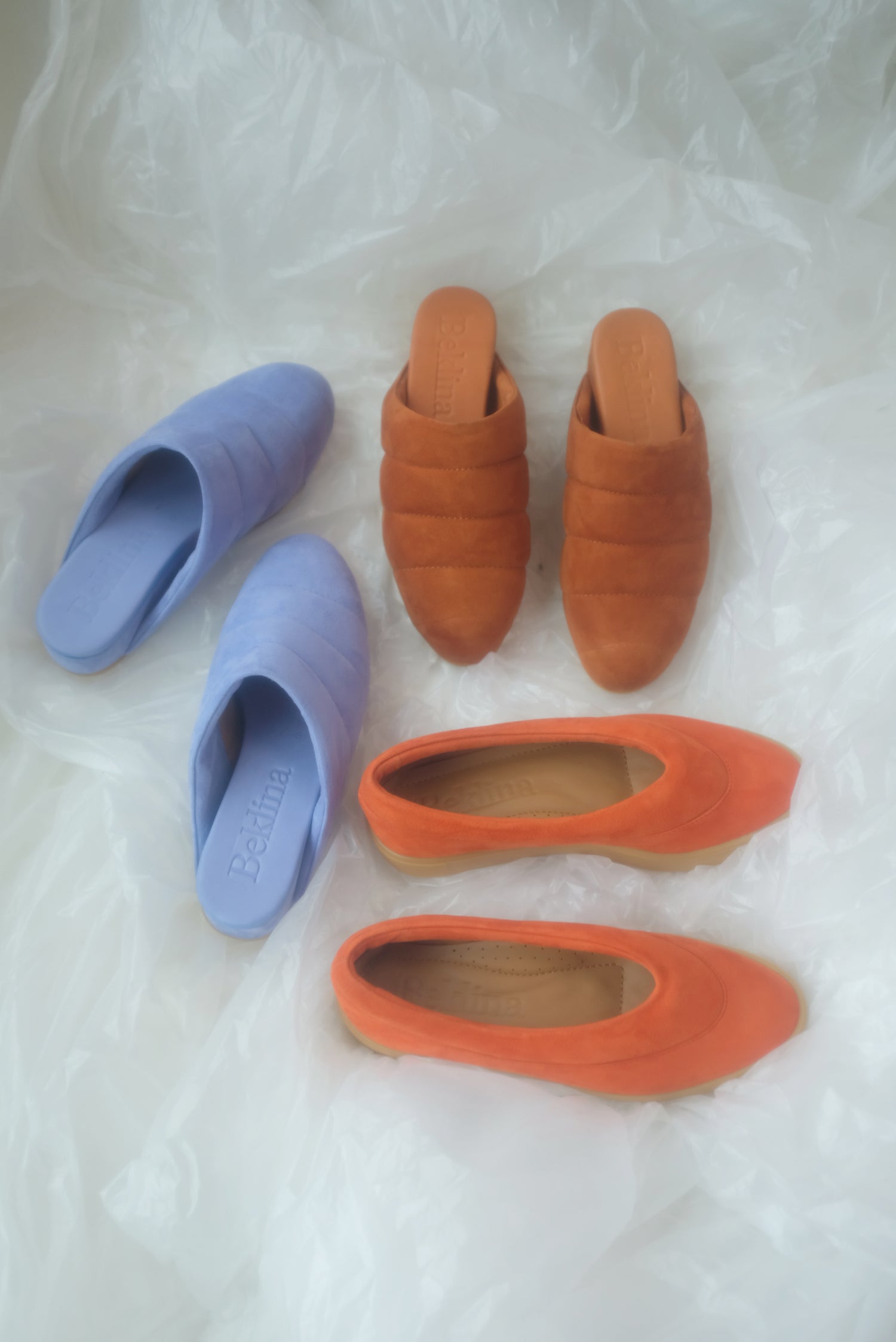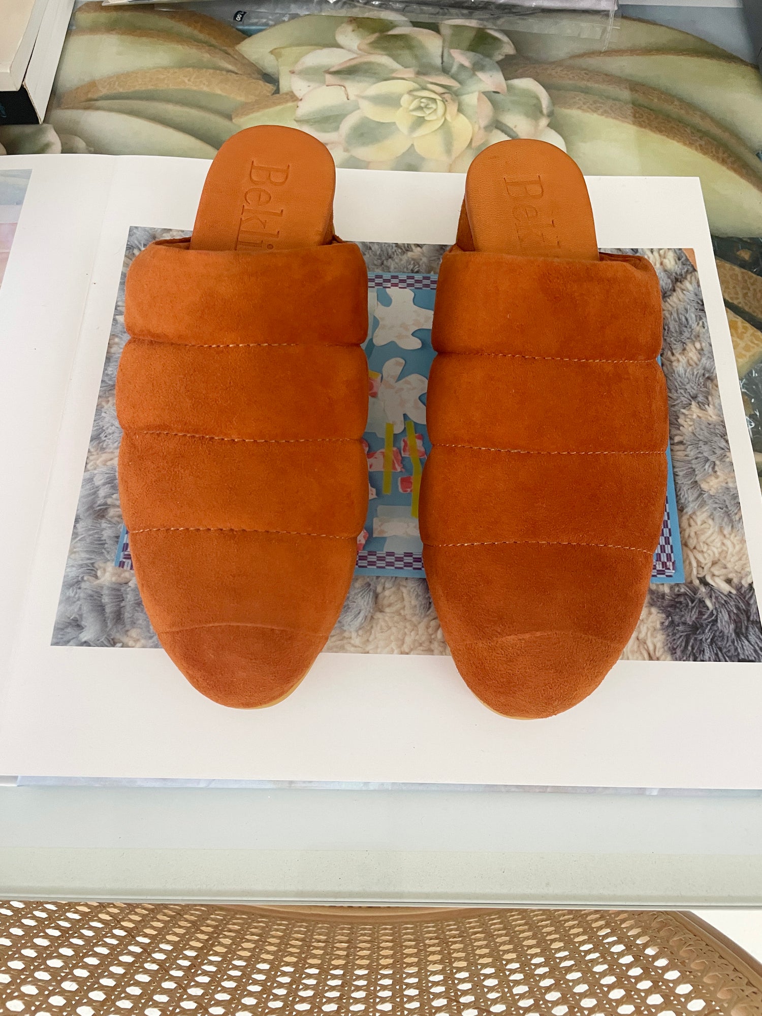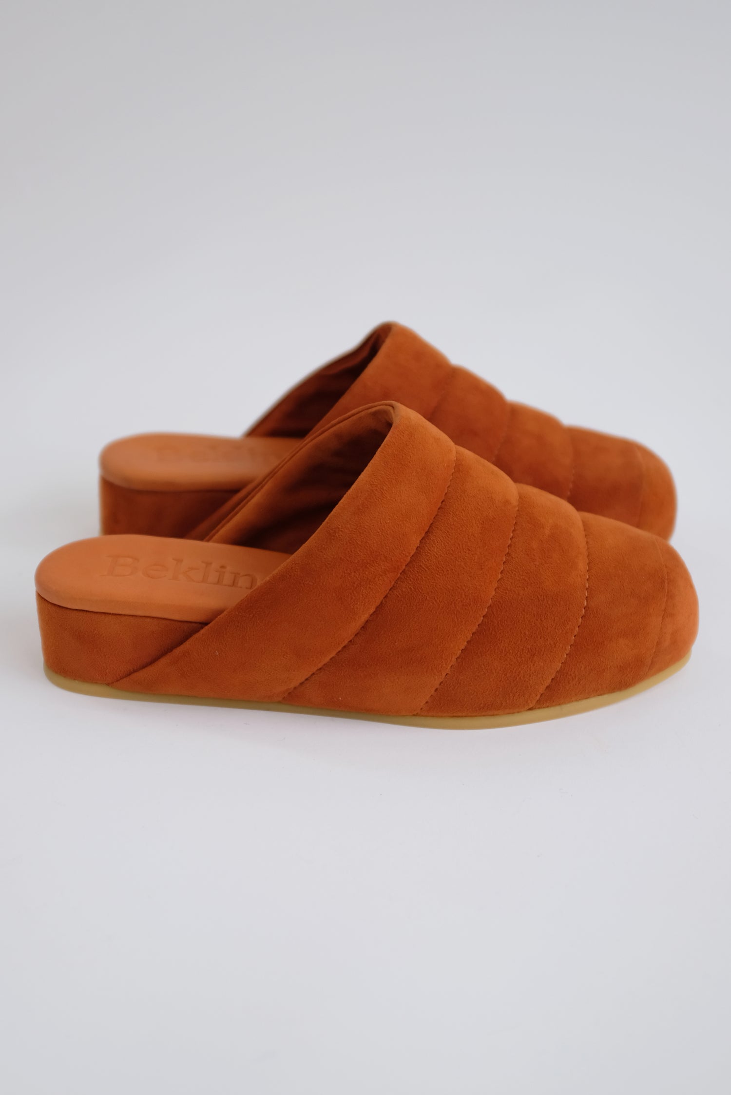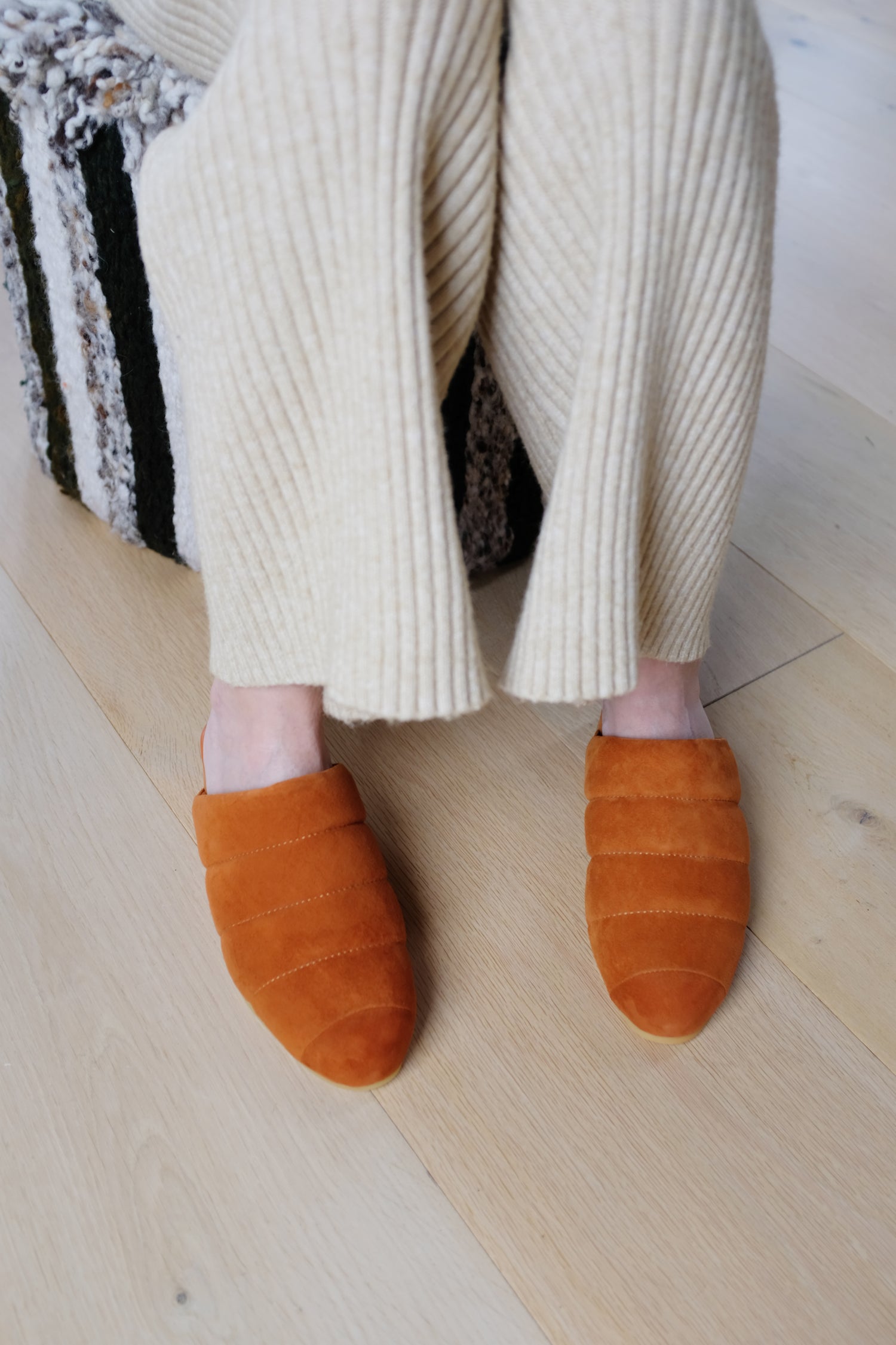 Ultra comfy cozy wedges, easy all-day-wearable slides that hold your feet, like walking on clouds. Luxurious soft puffy ribbed suede leather with 1.75" suede wrapped soft wedge. ASMR for your feet.