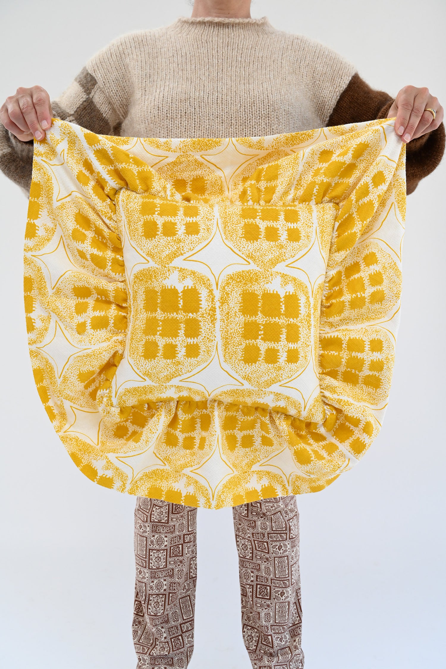 Linen silk blend accent pillow. Hand printed in San Francisco, archived Briefcase Print. Zipper, oversized ruffle, insert included.