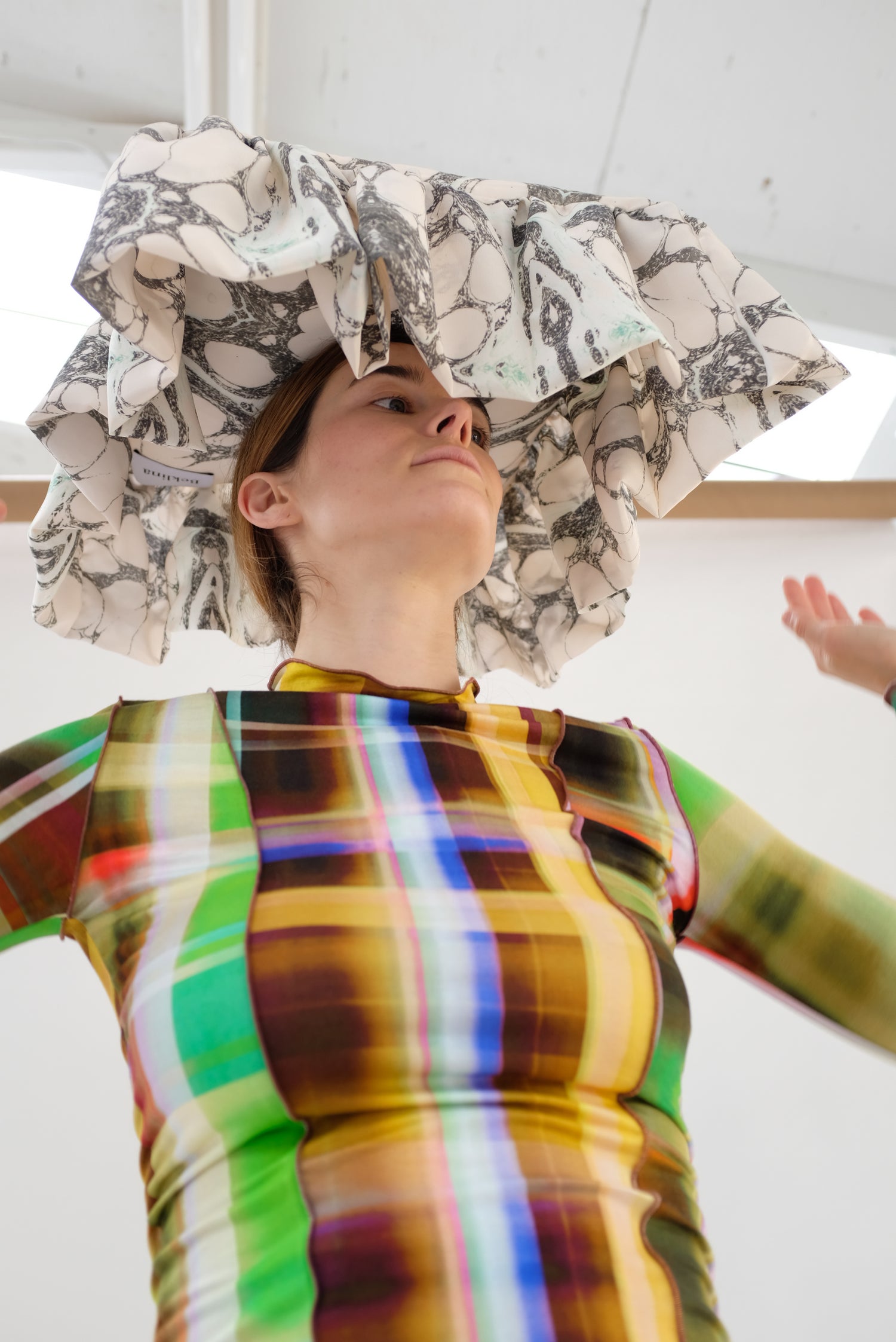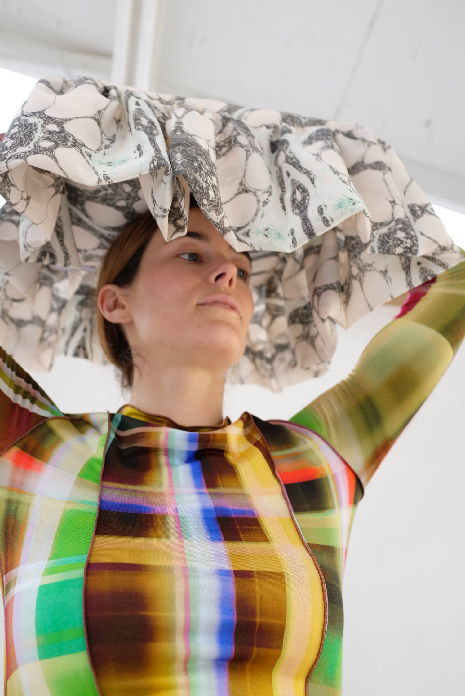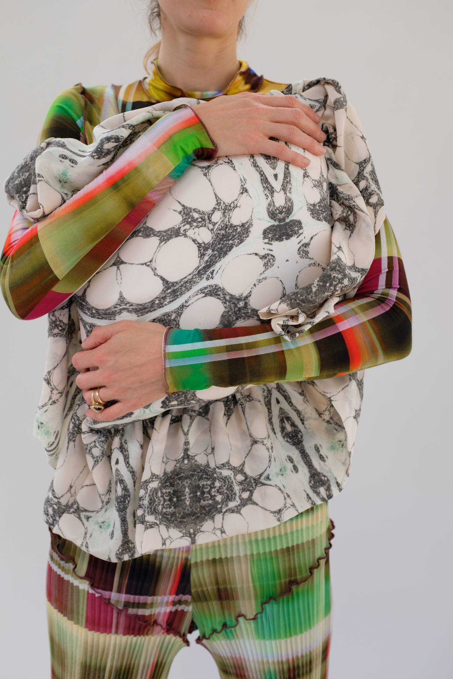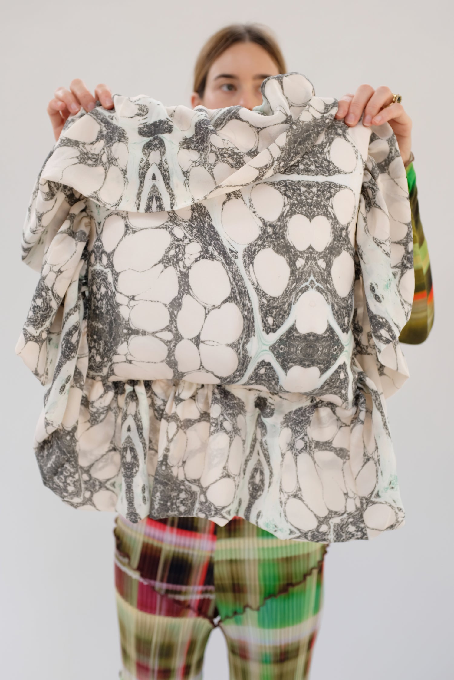 100% Silk accent pillow. Hand printed in San Francisco, archived Pink Marble Print. Zipper, oversized ruffle, insert included.