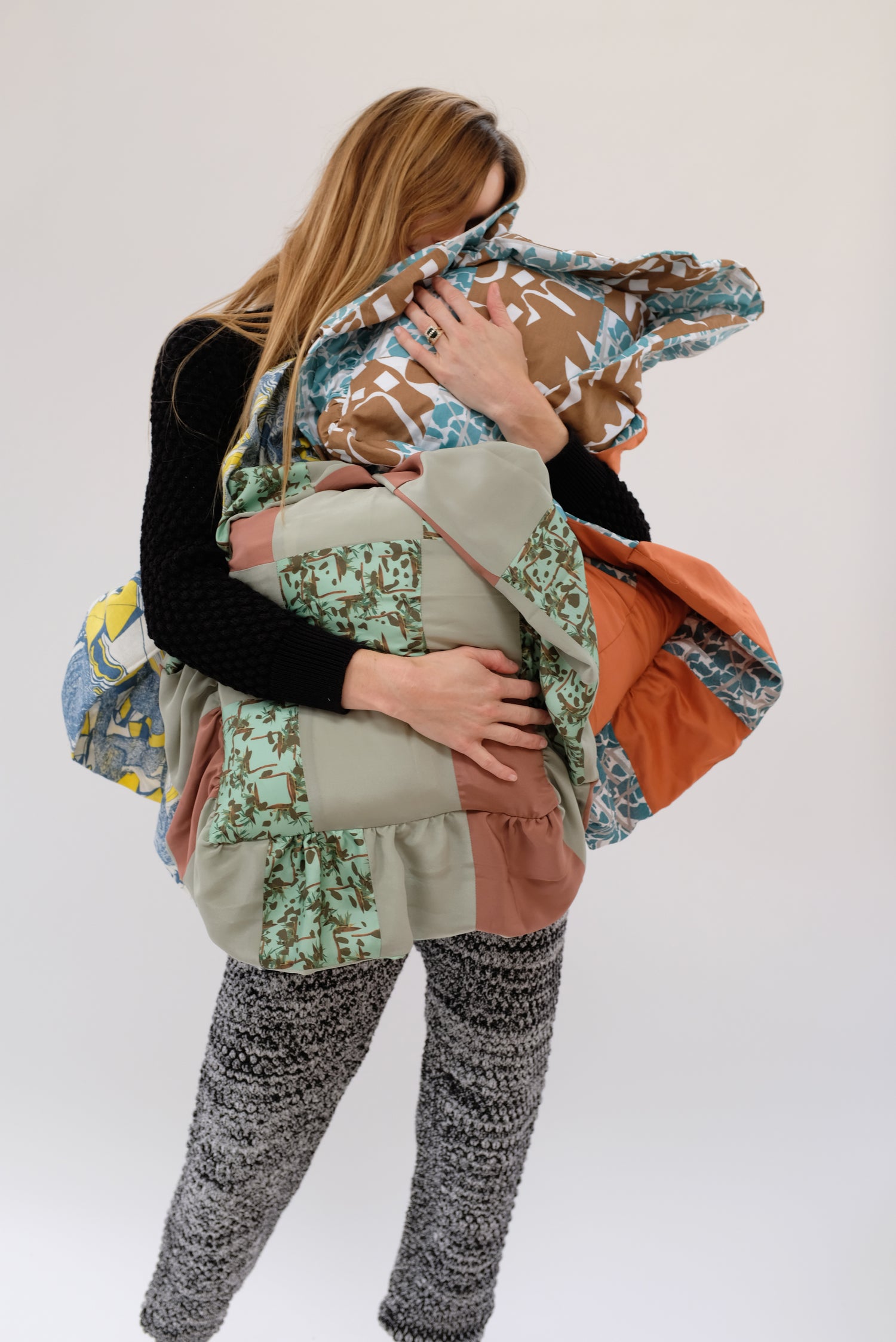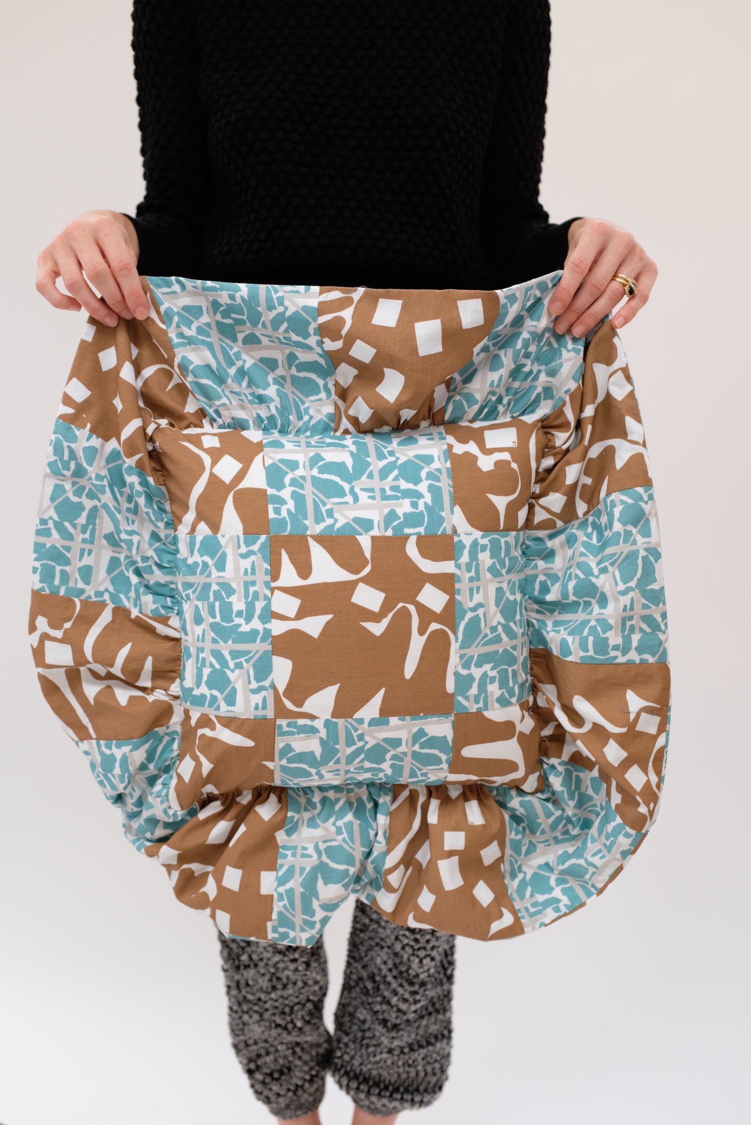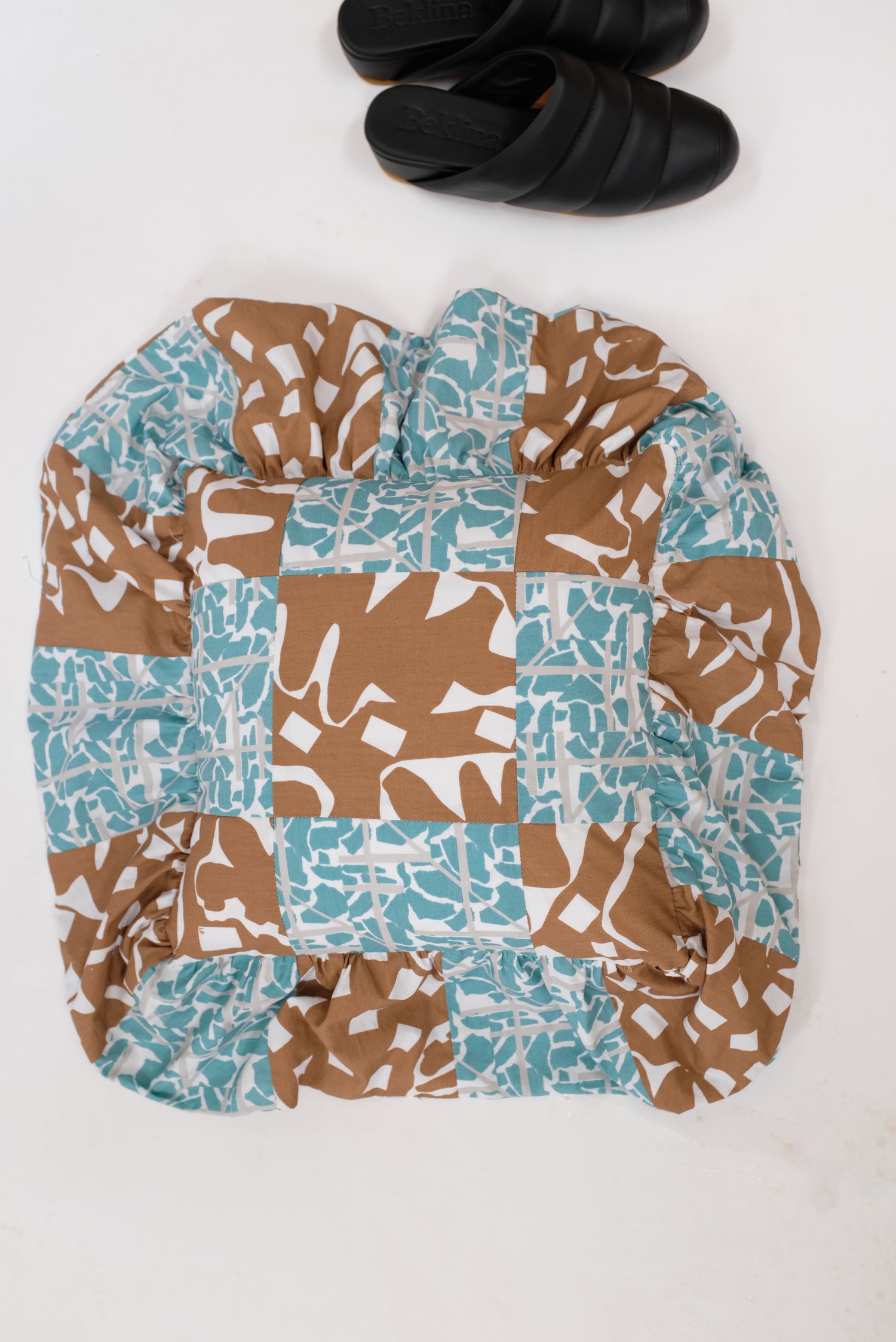 100% Cotton quilt accent pillow. Zipper, oversized ruffle, insert included. One of a kind, made from Beklina textile print remnants.