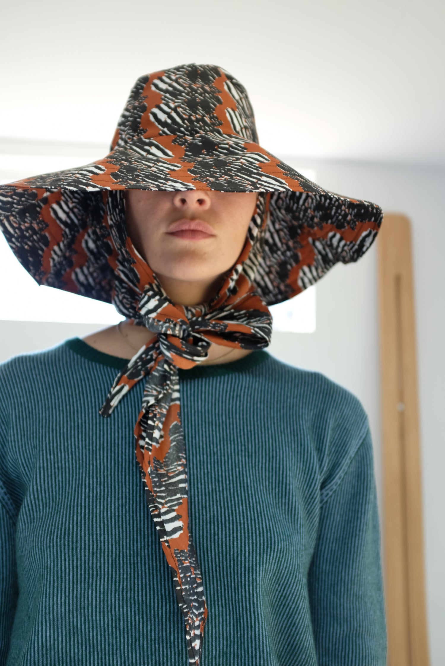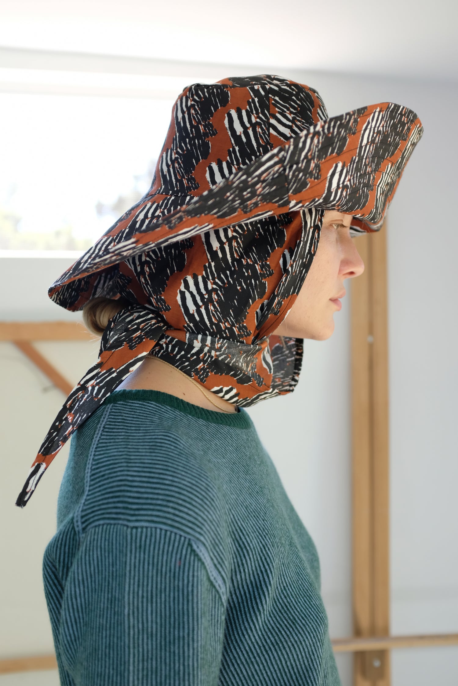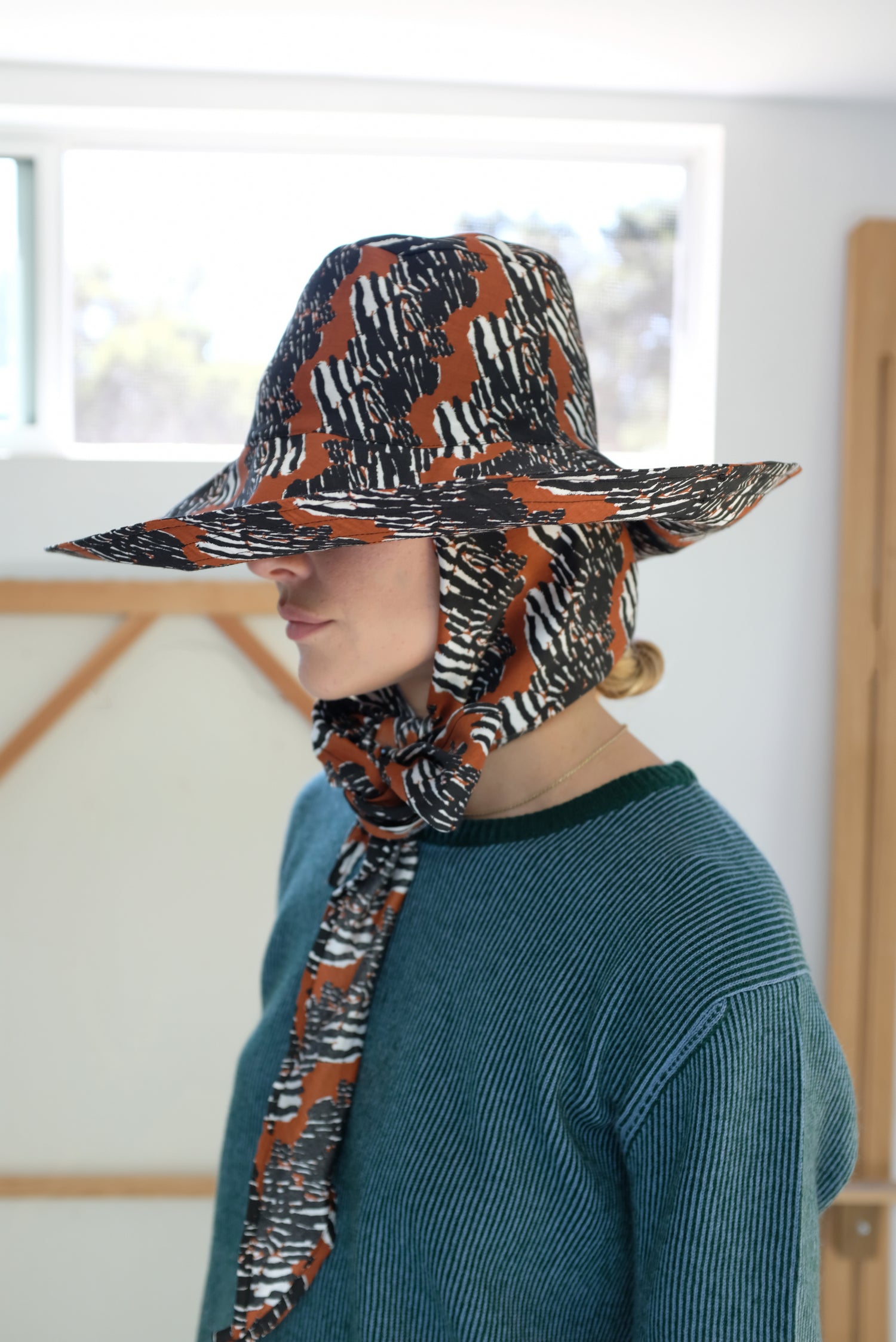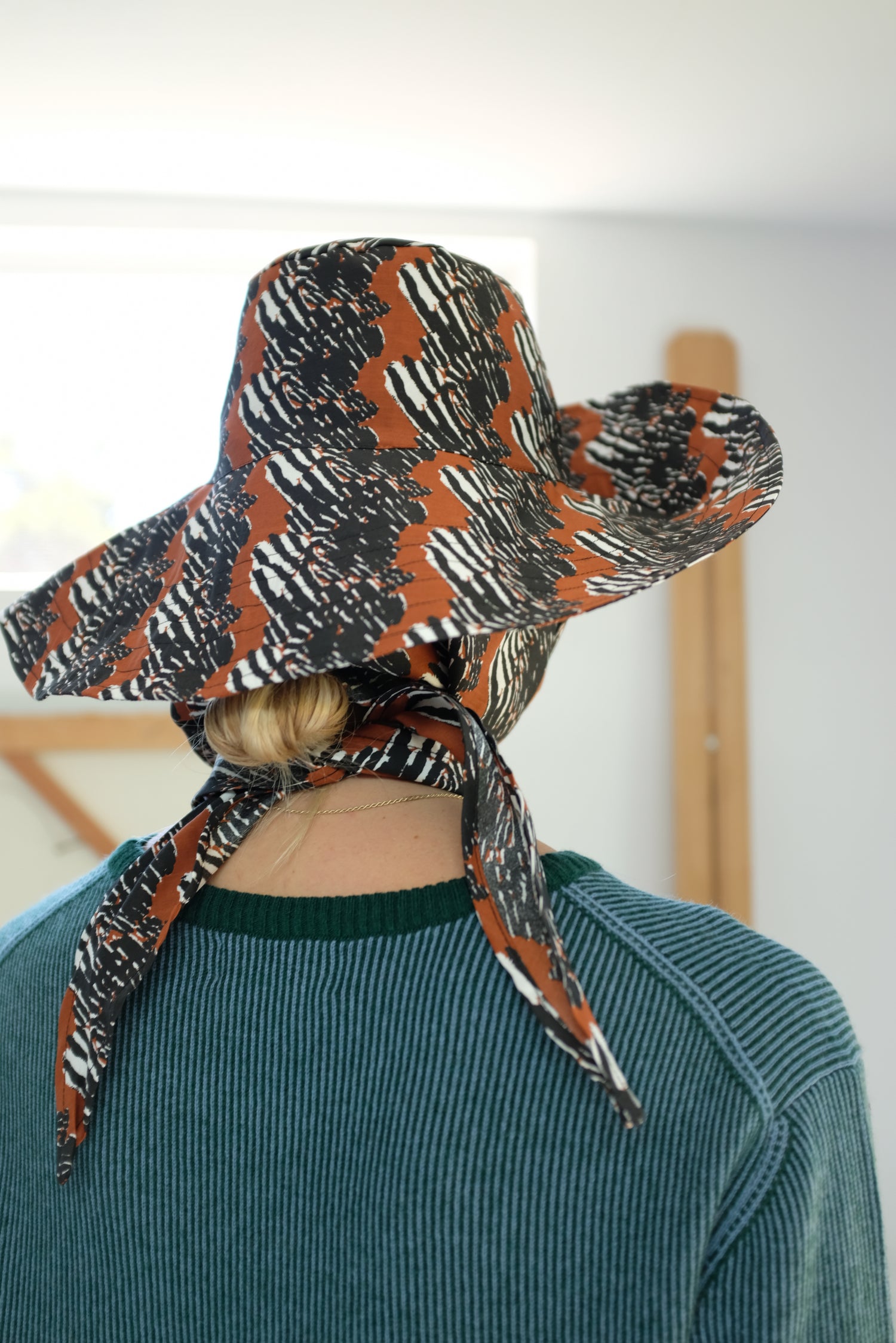 Our best hat yet; we love this style so much! Cotton silk blend woven in our exclusive limited edition Tiramisu French Ribbon print. A sunhat that provides great shade for face, one size fits most, self scarf tie for windy weather, chill, or privacy, wear tied or untied.