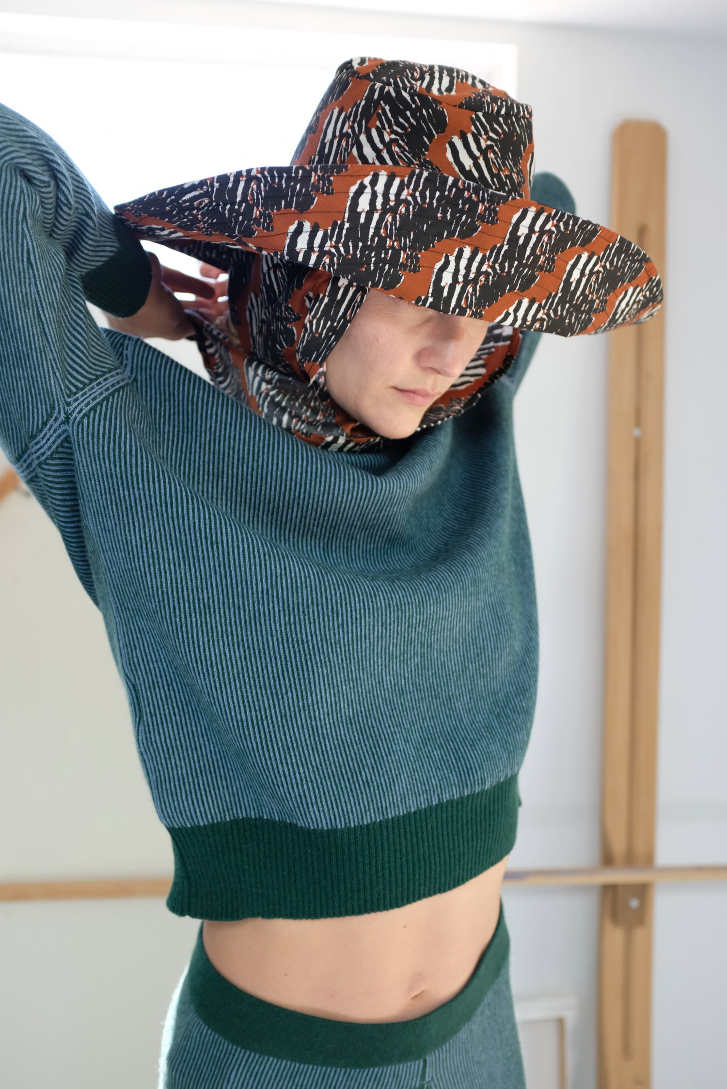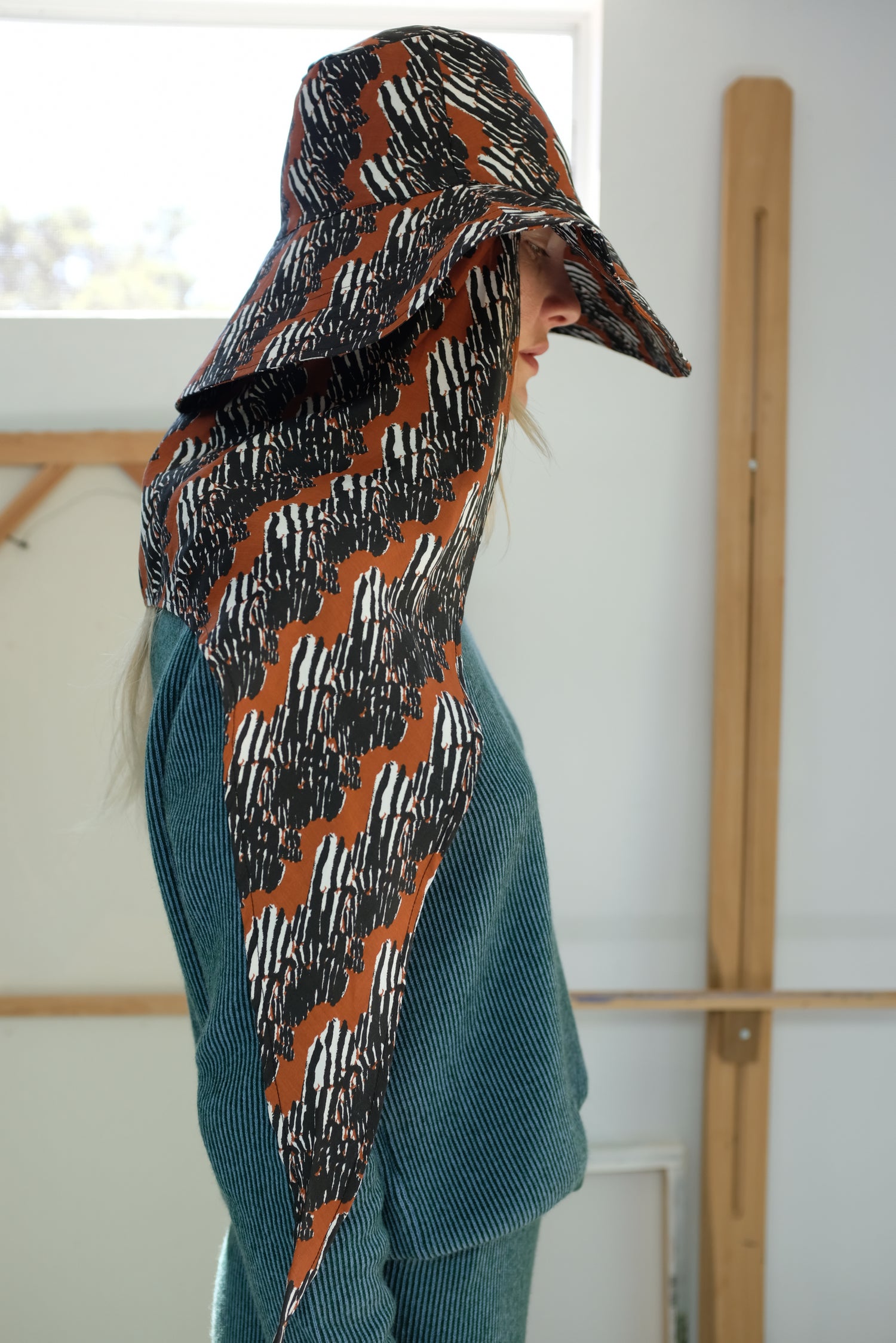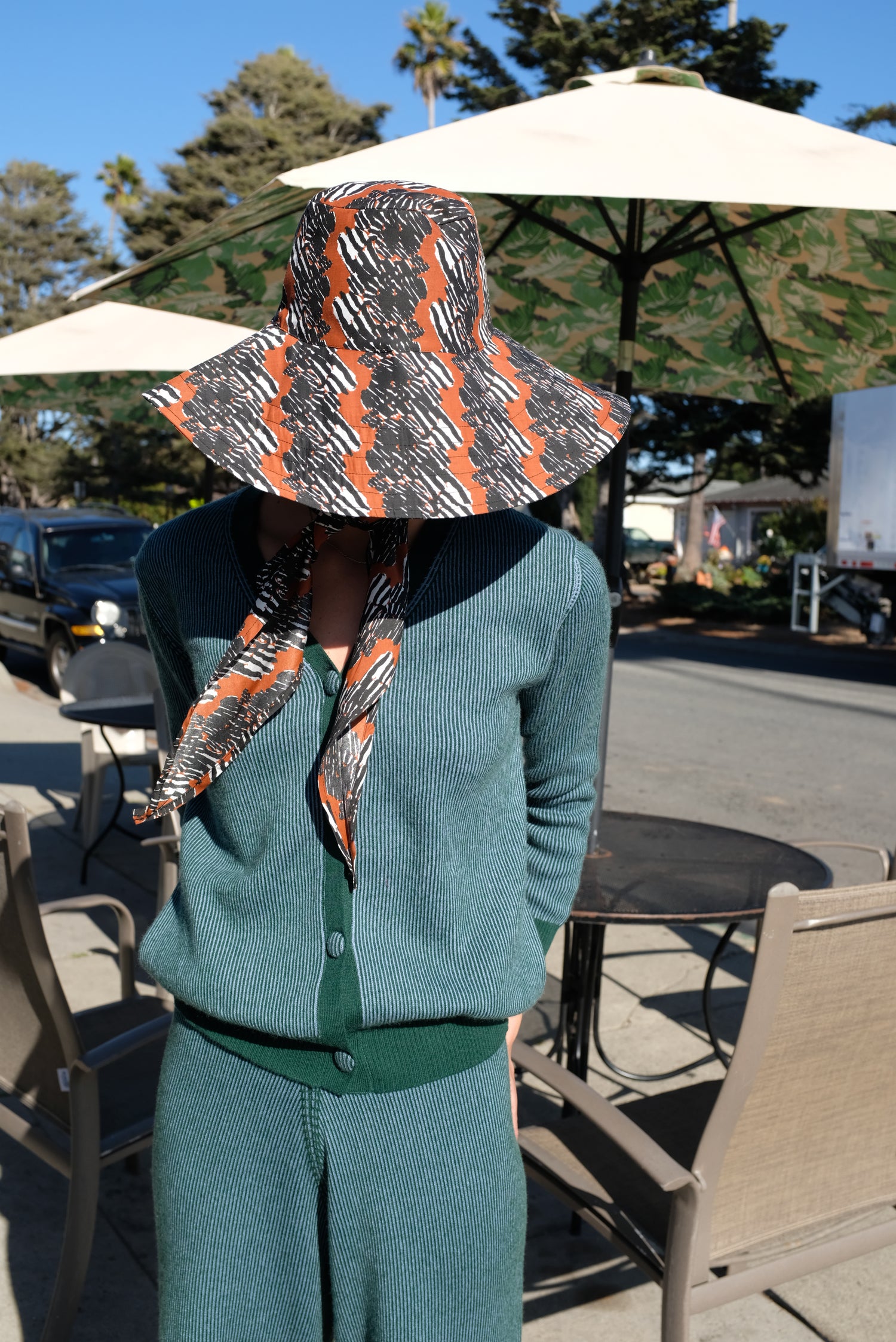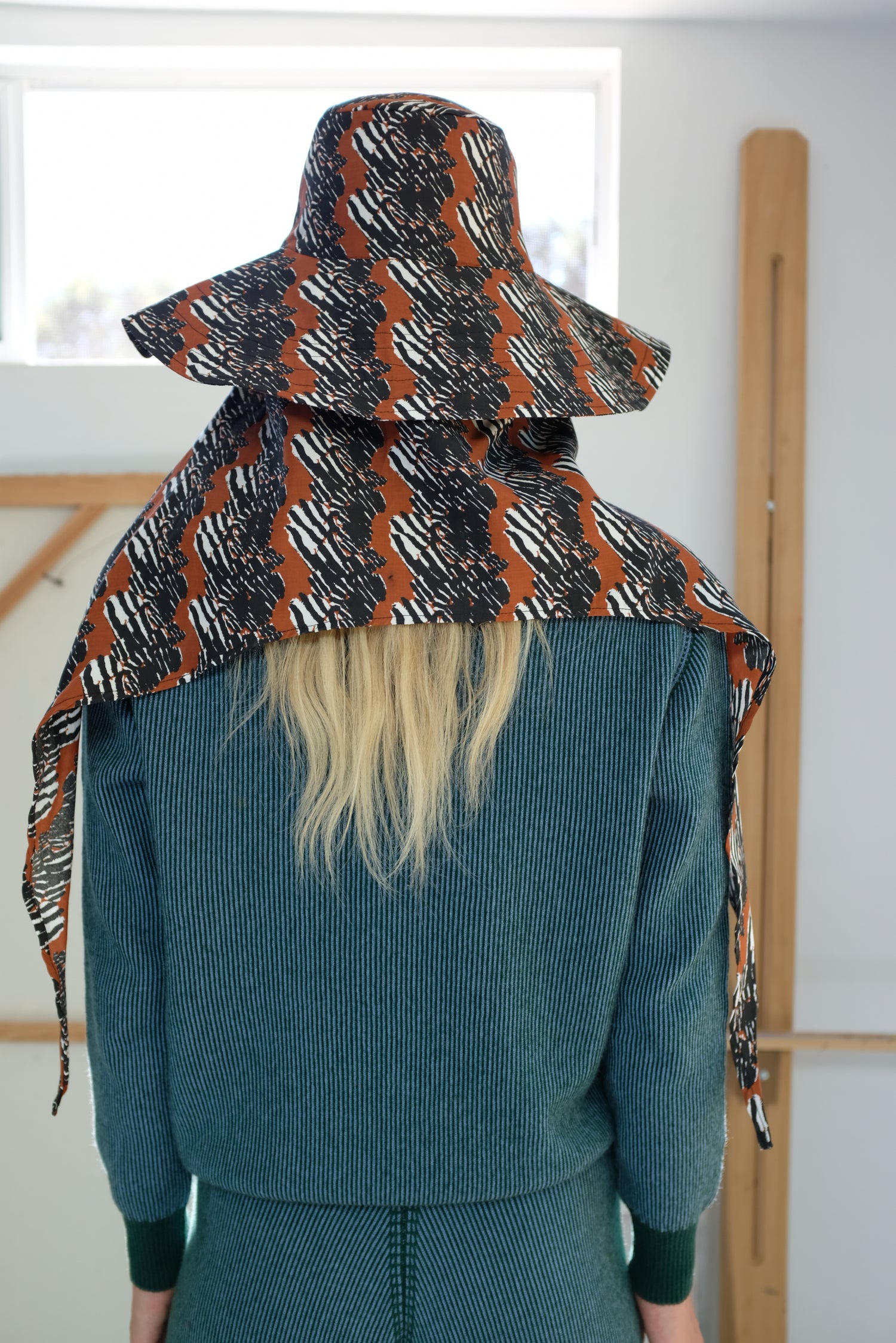 Our best hat yet; we love this style so much! Cotton silk blend woven in our exclusive limited edition Tiramisu French Ribbon print. A sunhat that provides great shade for face, one size fits most, self scarf tie for windy weather, chill, or privacy, wear tied or untied.
