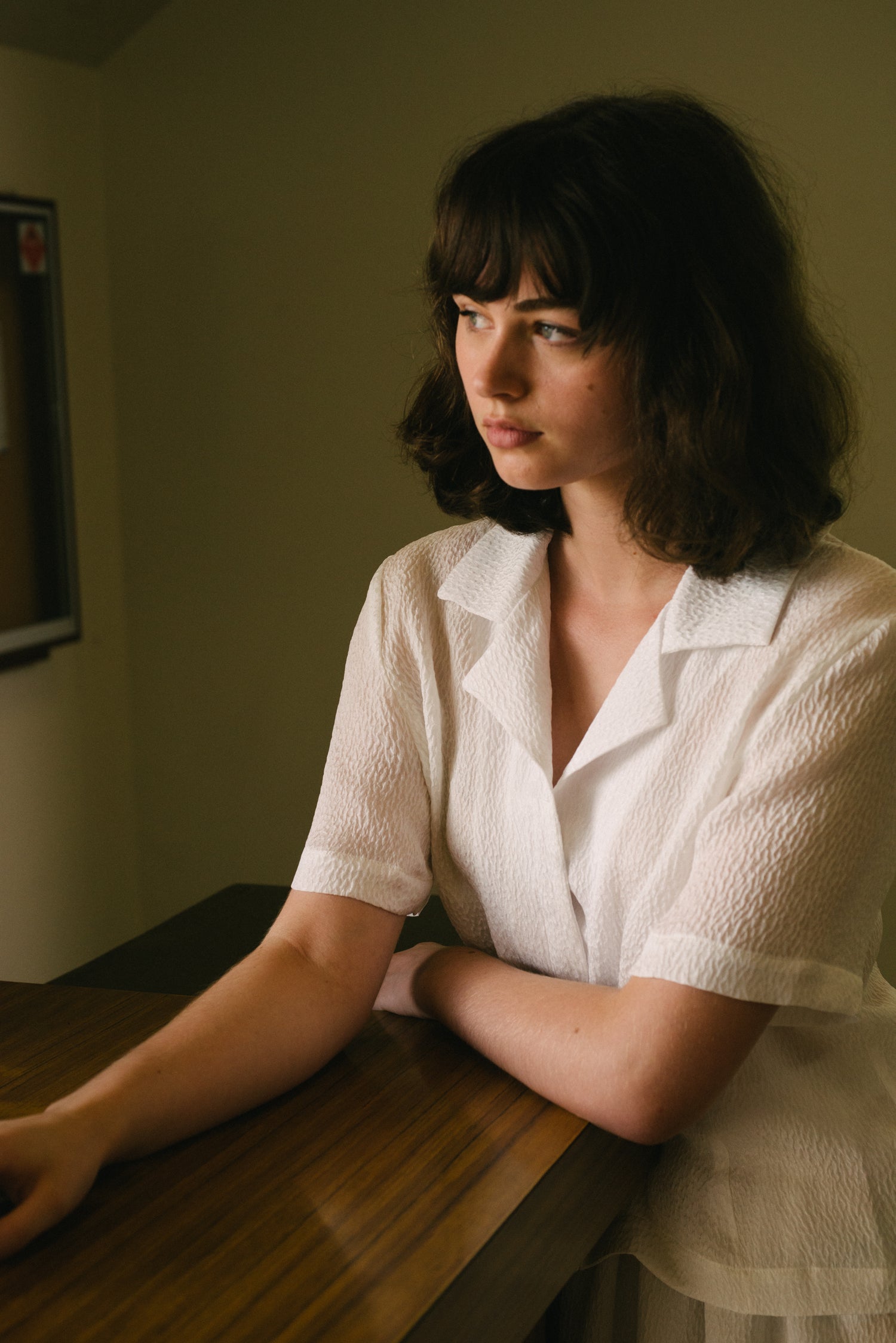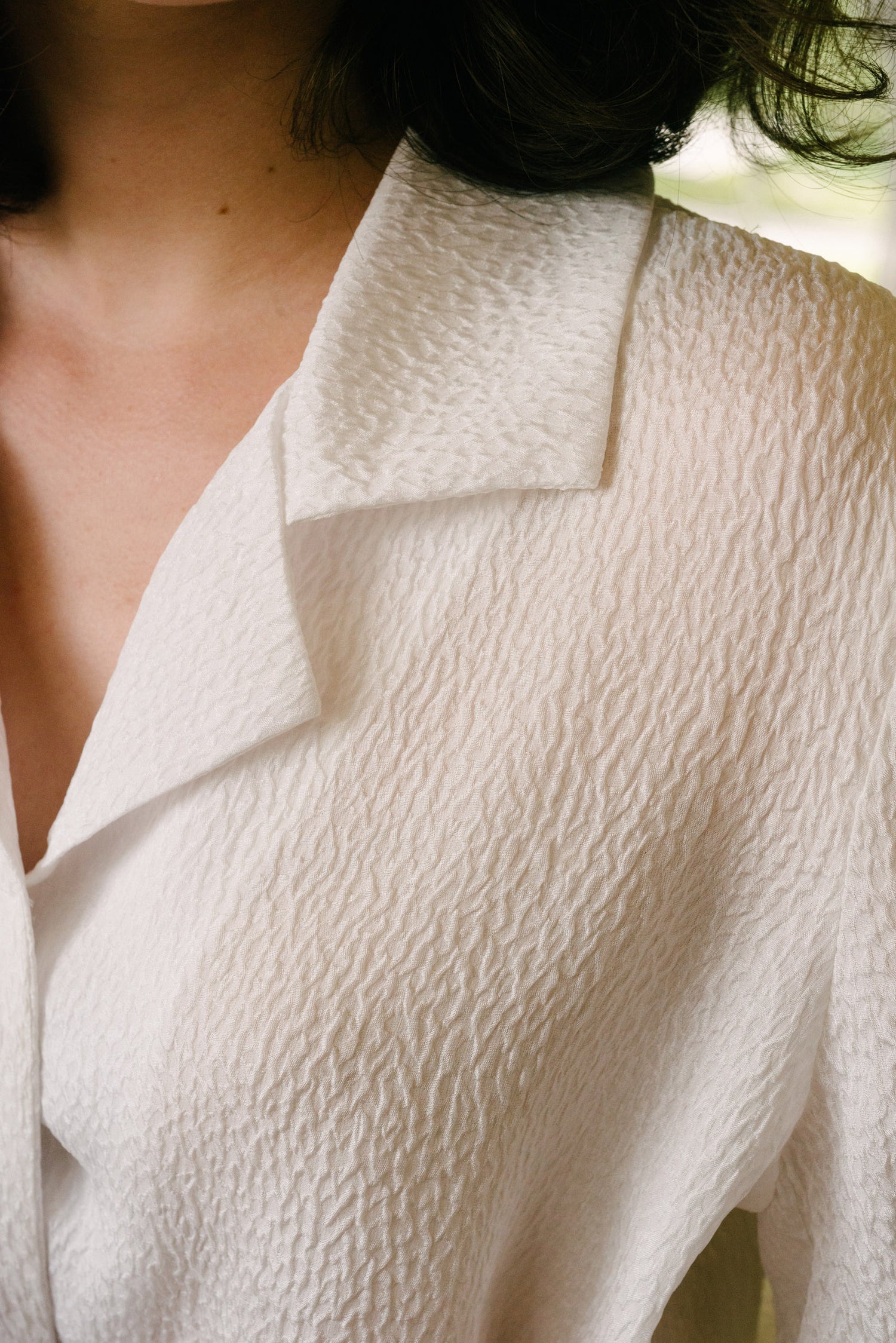 Tailored fitted blouse, with enclosed French seams, vintage buttons, covered front placket. Semi sheer textured silk. Hand sewn in San Francisco. 100% Silk. Only this Sfumato blouse in the white textured silk is made over-sized, O/S one size only, for a soft flowing look.