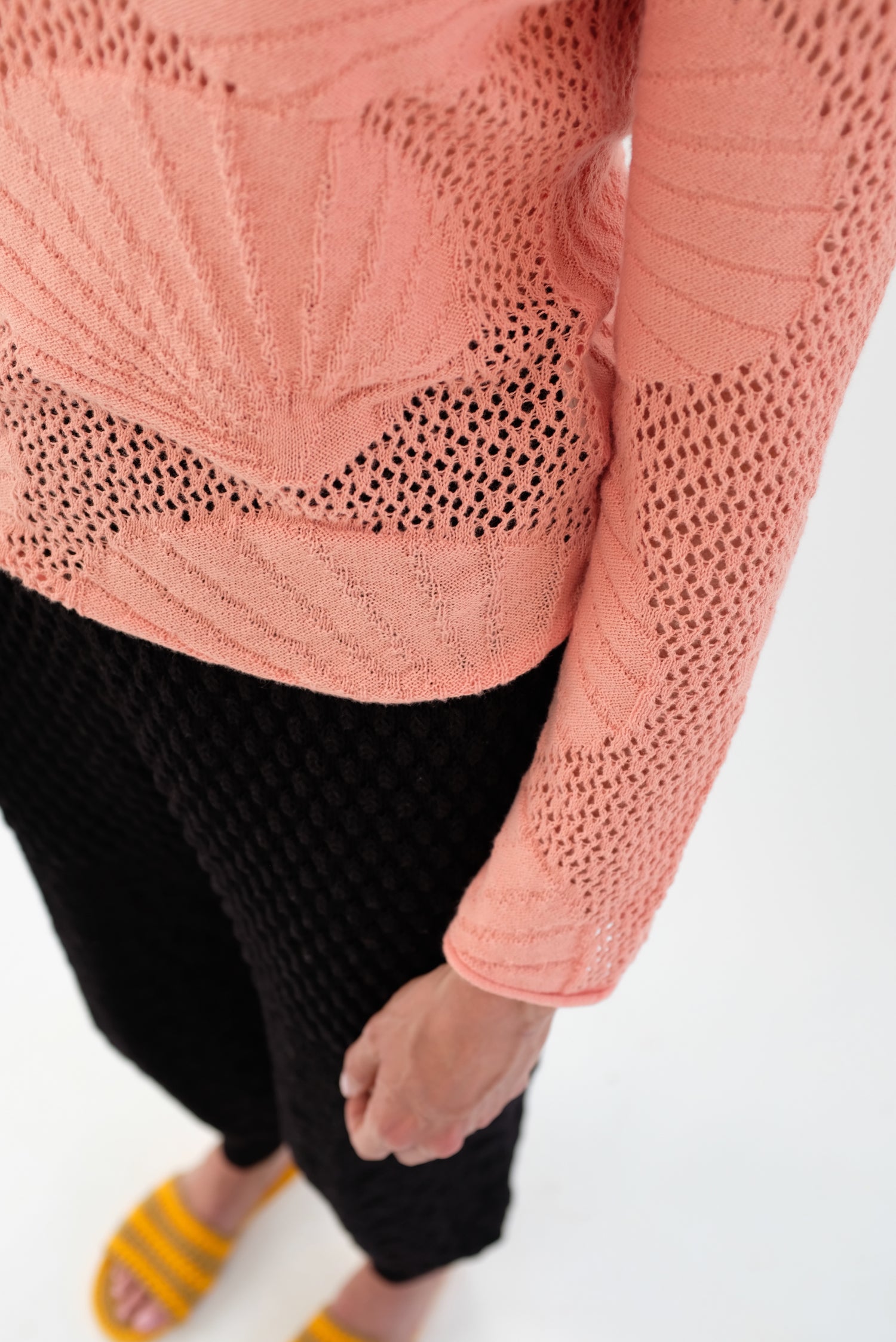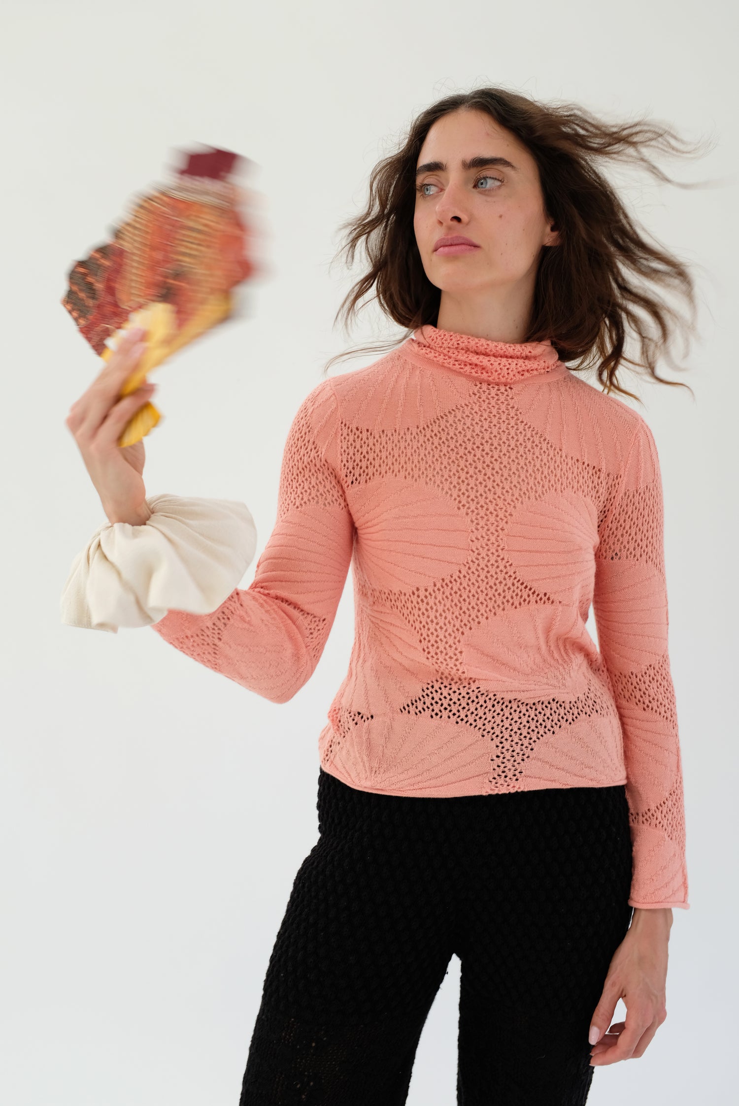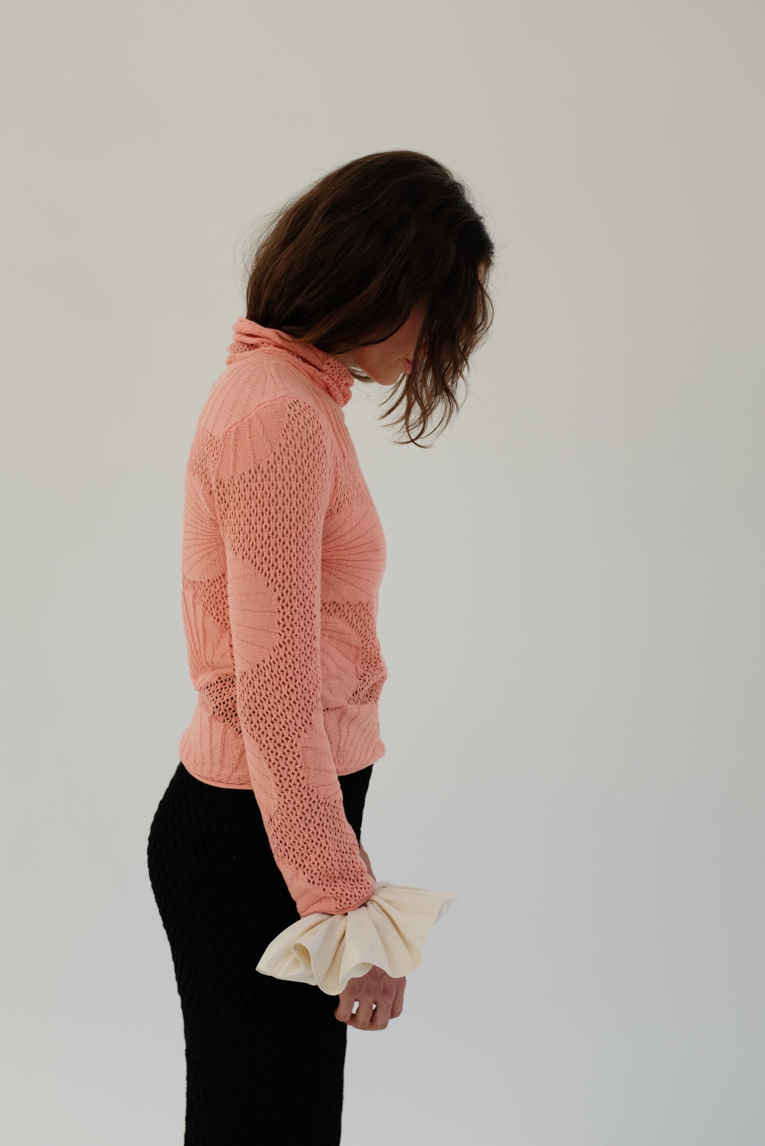 Hand knit cotton shell lace turtleneck. Long sleeve, 6" high neck, dress up or down. Runs true to size, with a natural gentle built in stretch, washable, not overly delicate. 100% Cotton, ultra soft second skin. Exclusive to Beklina.