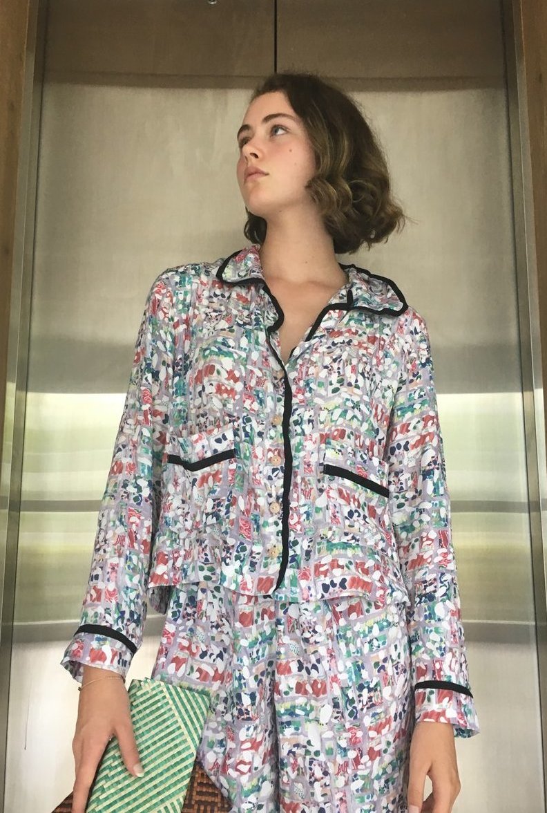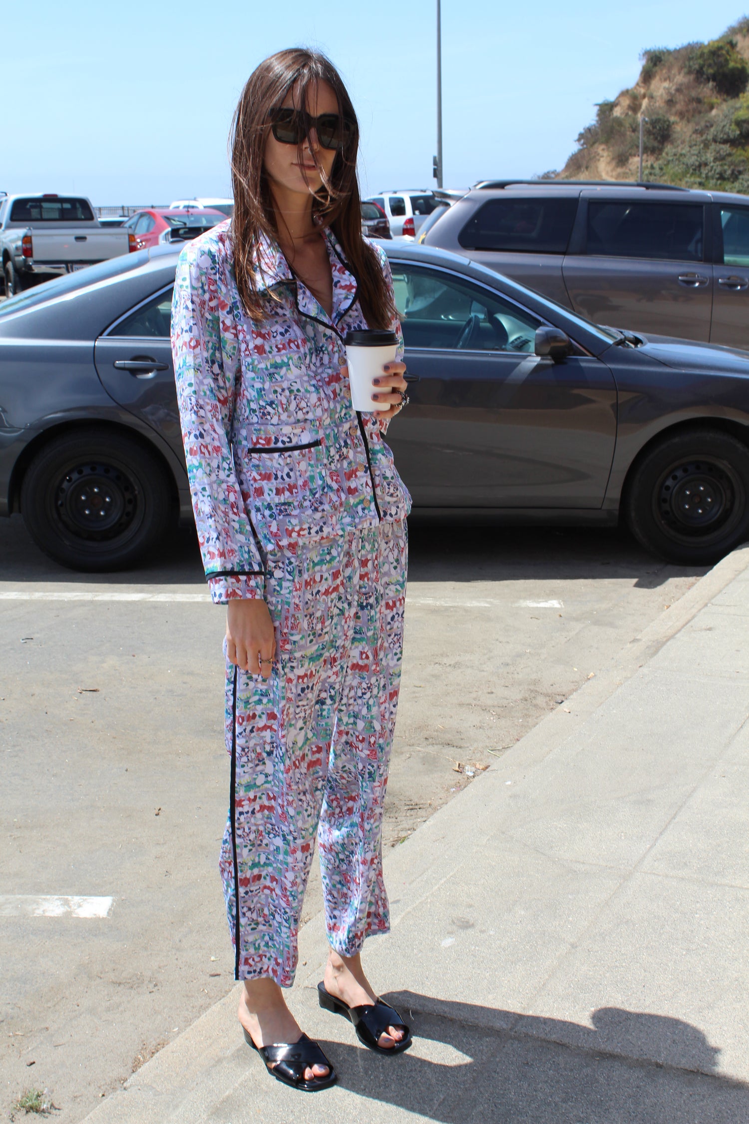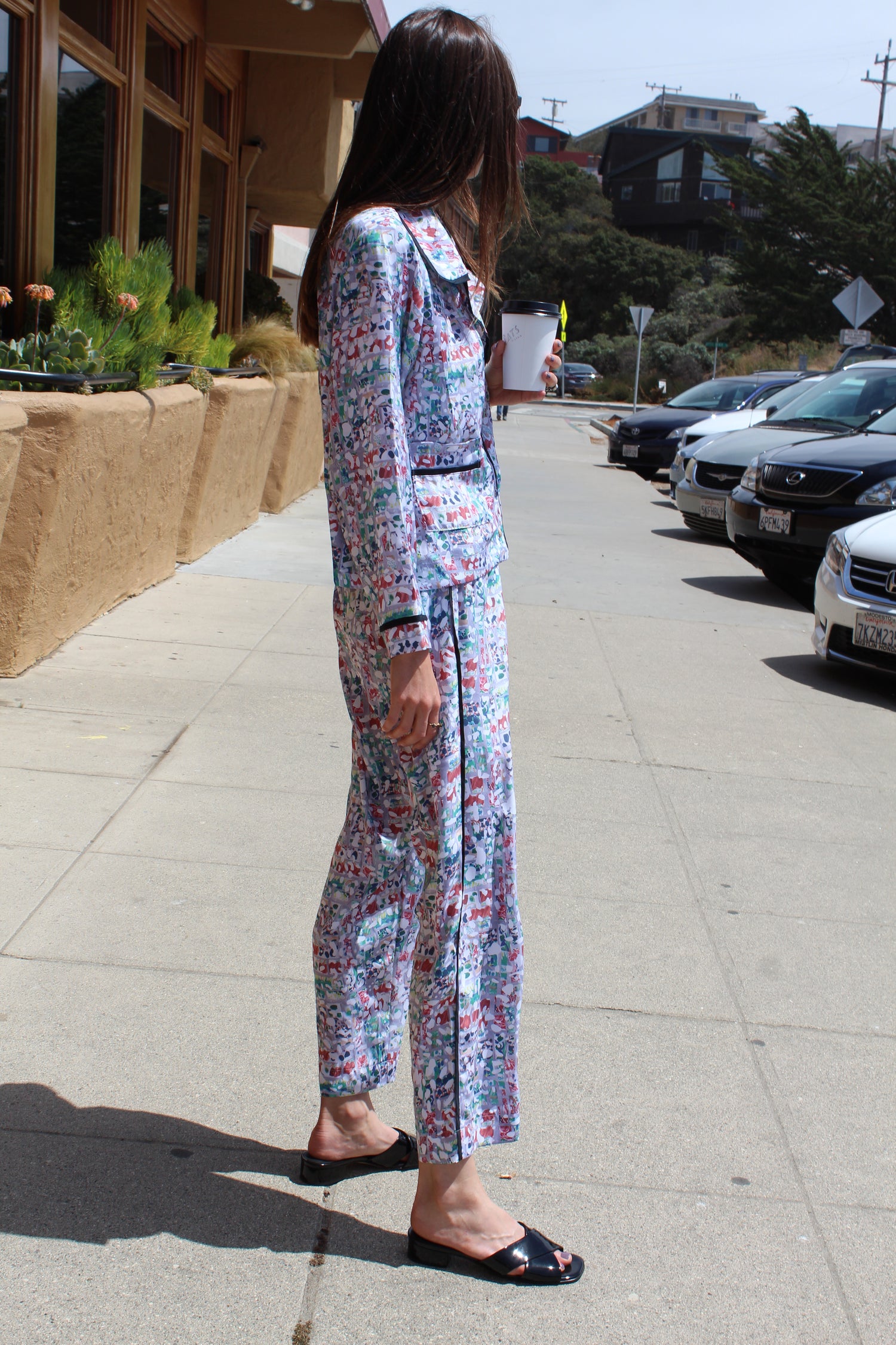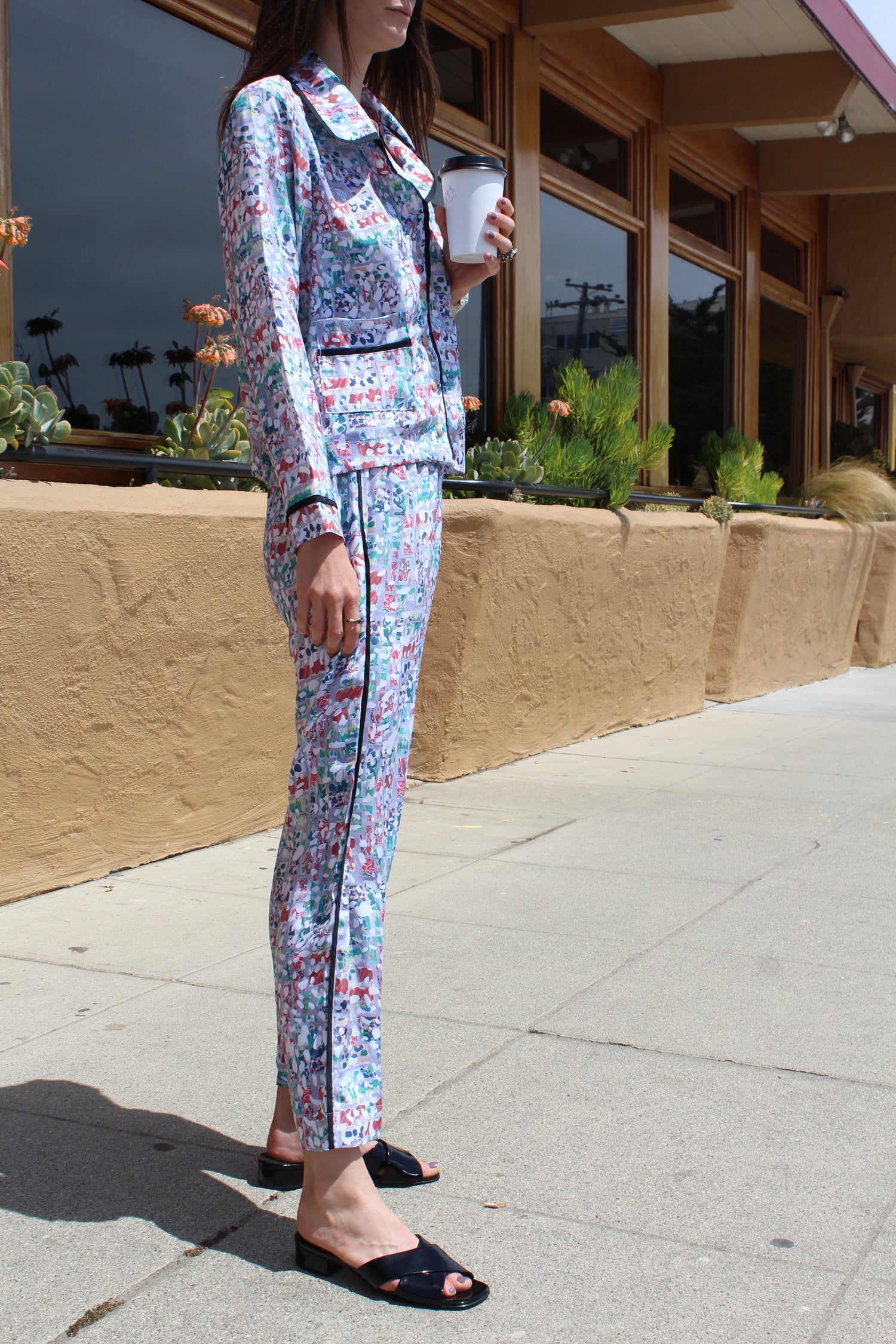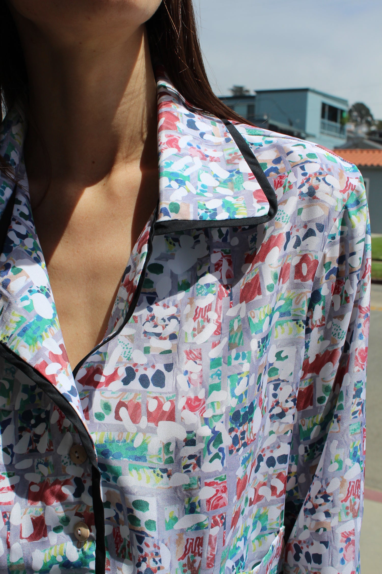 Luxurious 100% silk charmeuse pj's with black trim, limited edition custom Art Block Collage print, front pockets, enclosed French seams, wooden buttons down front, gentle elastic waist. They're pajamas, but they also work as silk pants, or a silk blouse.