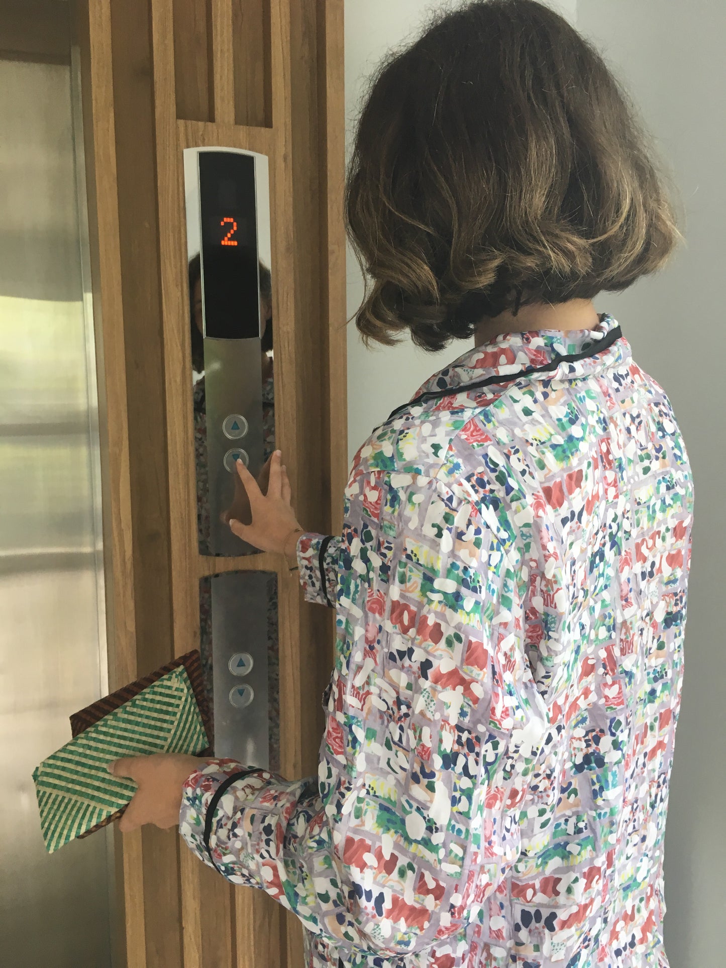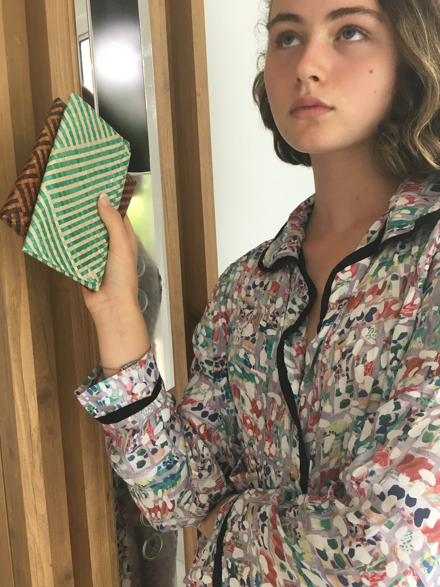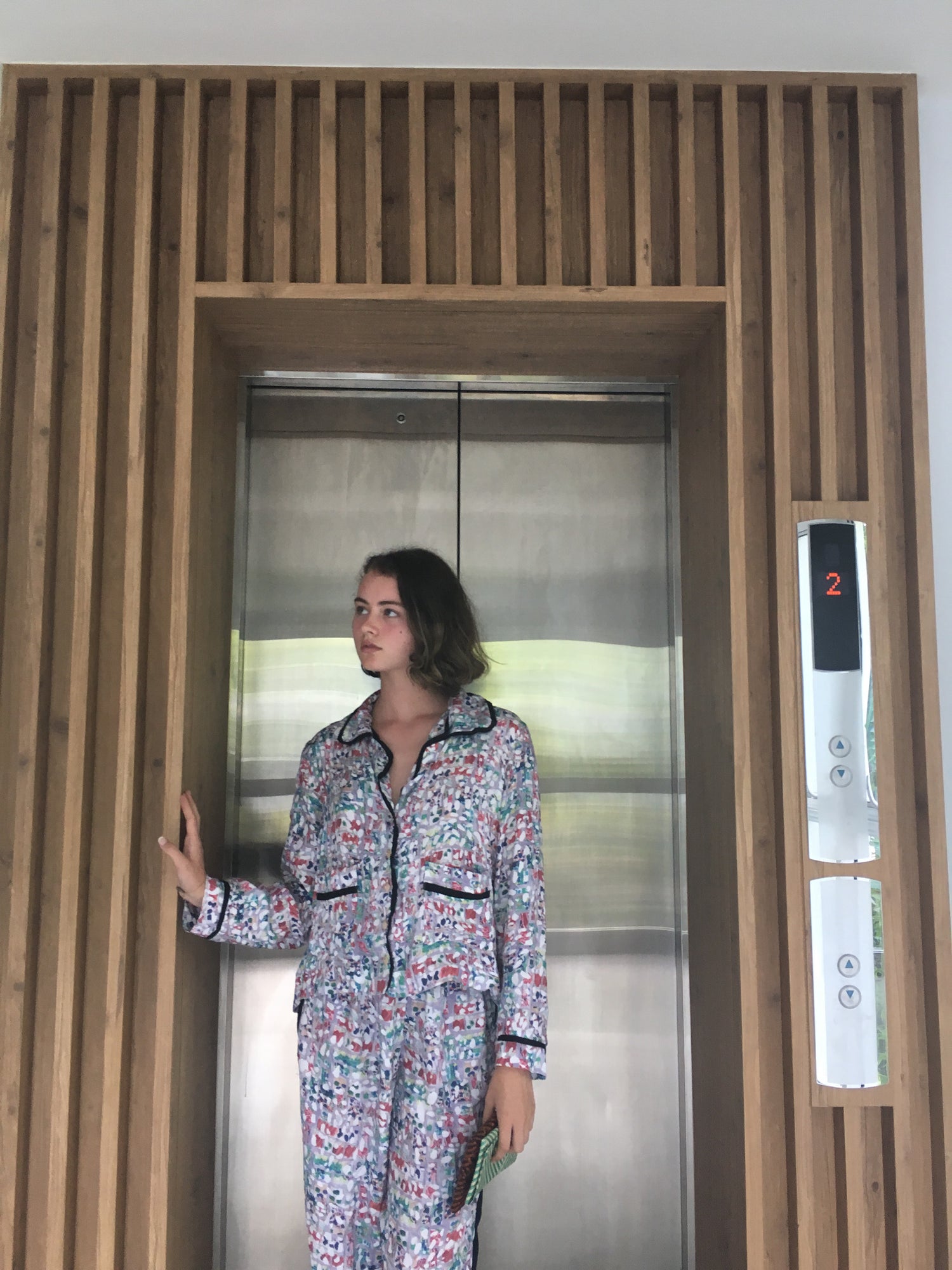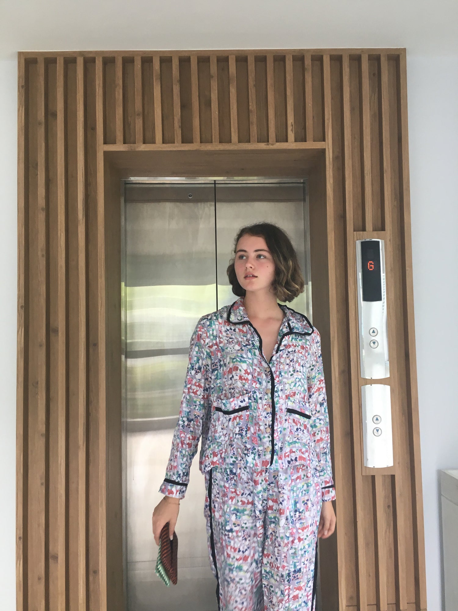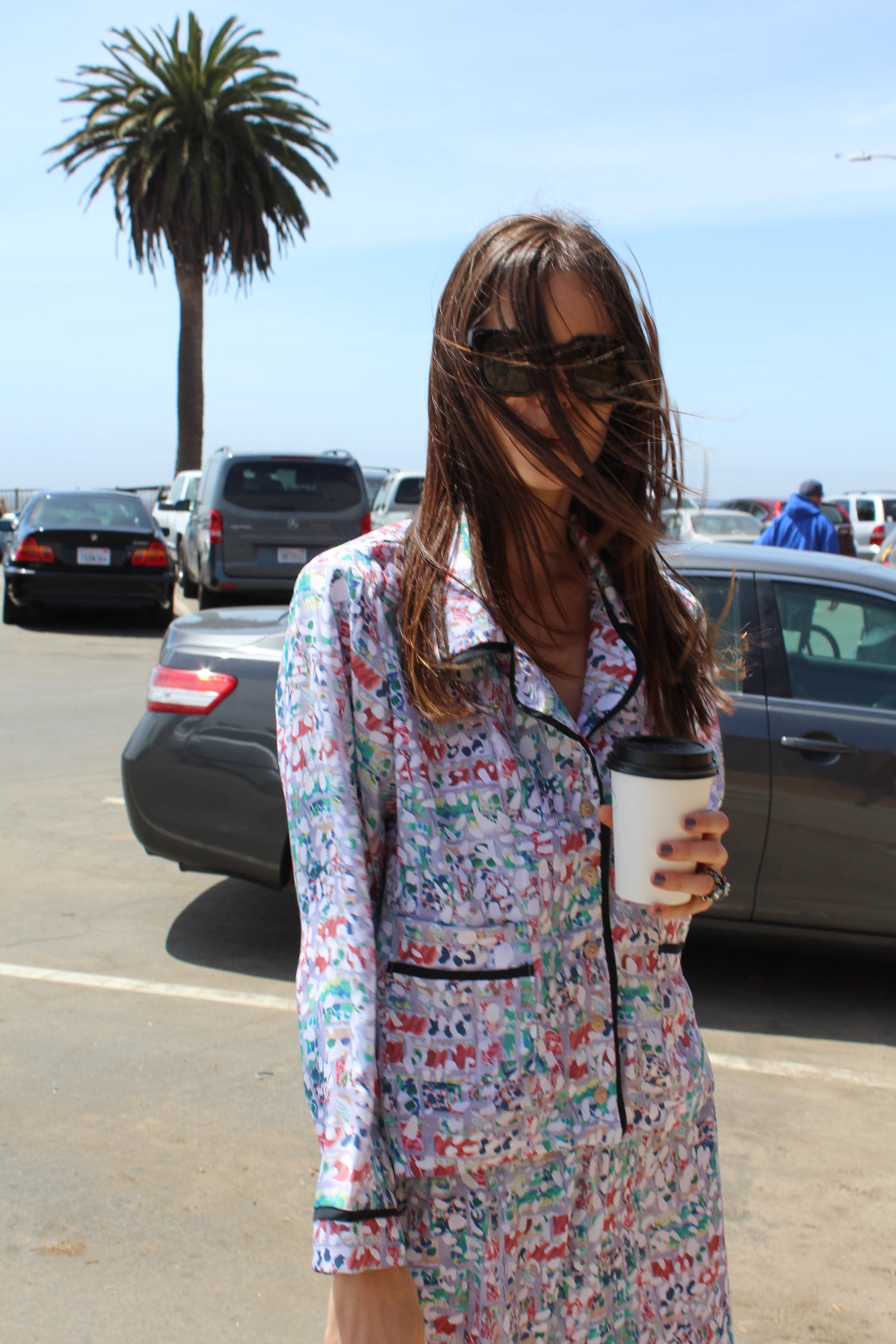Luxurious 100% silk charmeuse pj's with black trim, limited edition custom Art Block Collage print, front pockets, enclosed French seams, wooden buttons down front, gentle elastic waist. They're pajamas, but they also work as silk pants, or a silk blouse.