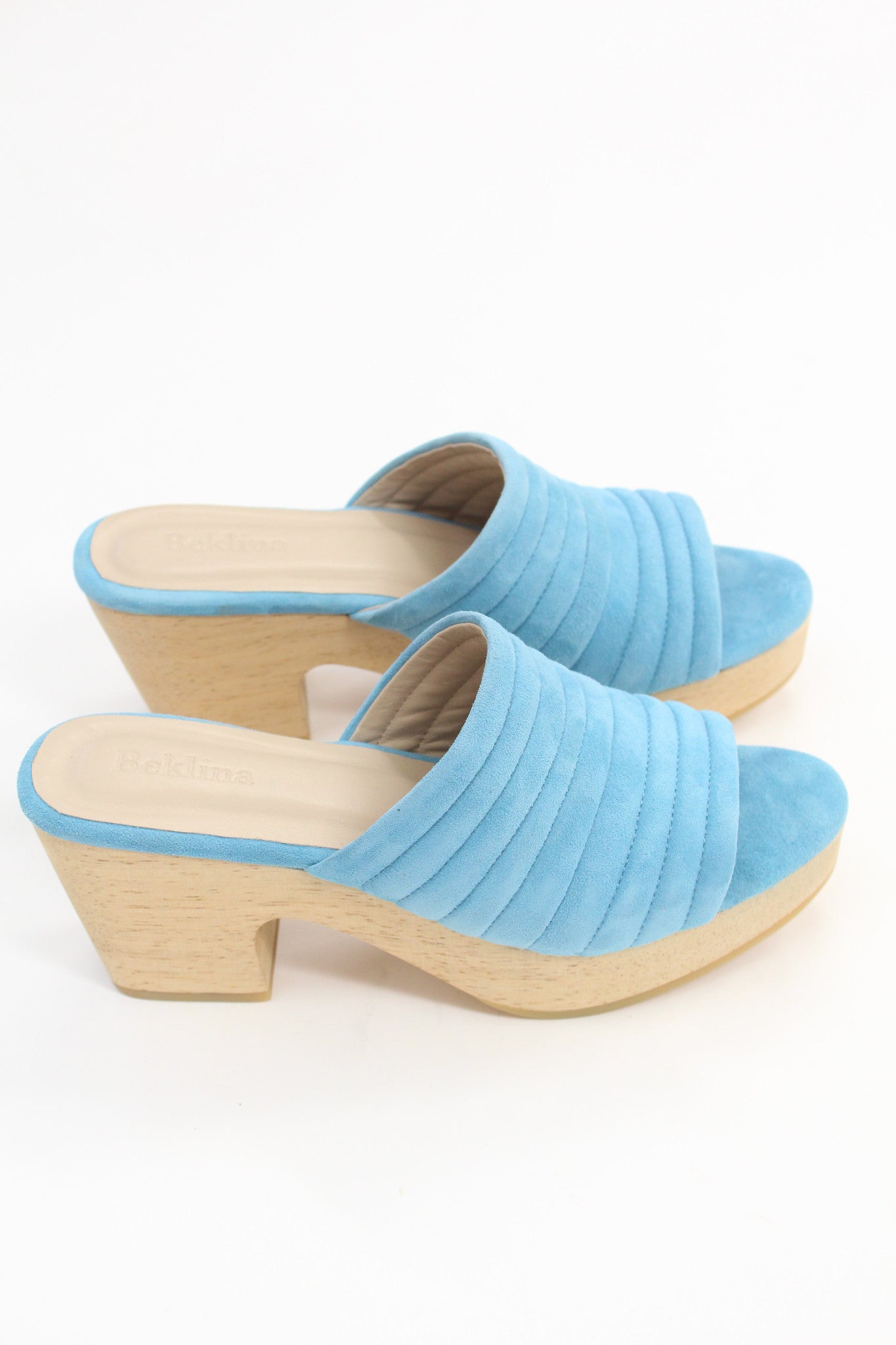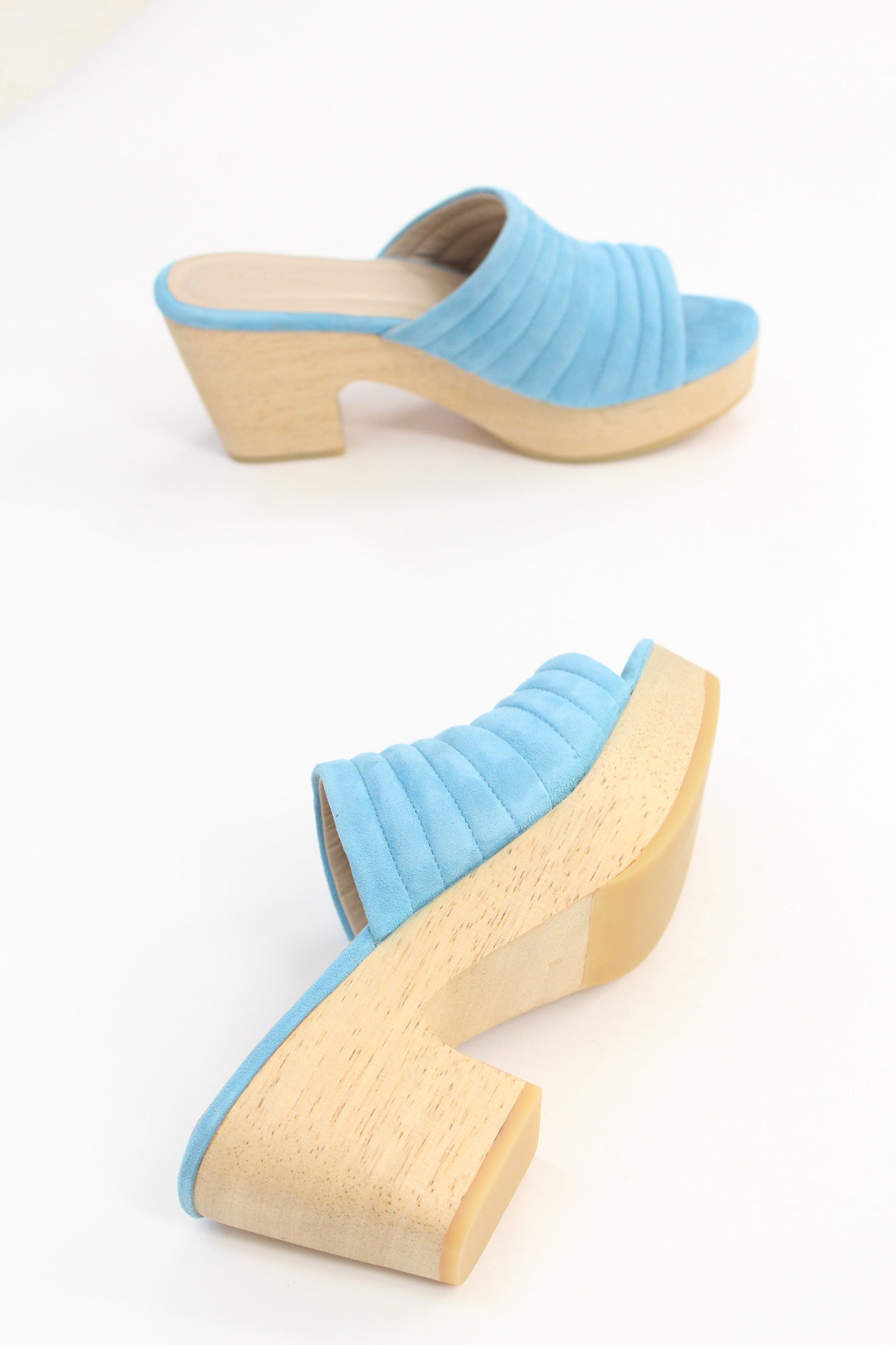 Hand carved wooden platform heel, 100% suede leather uppers and leather lined.