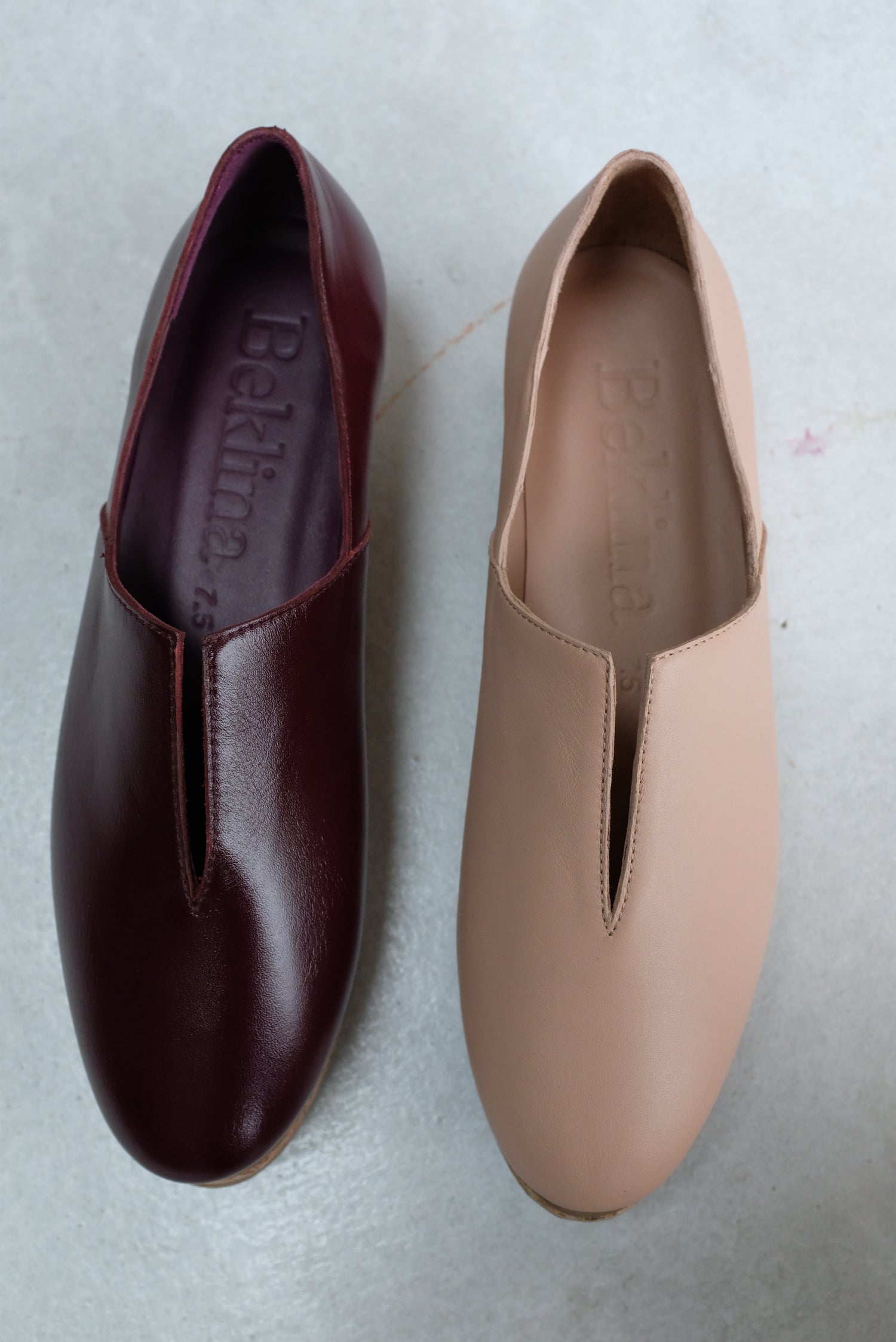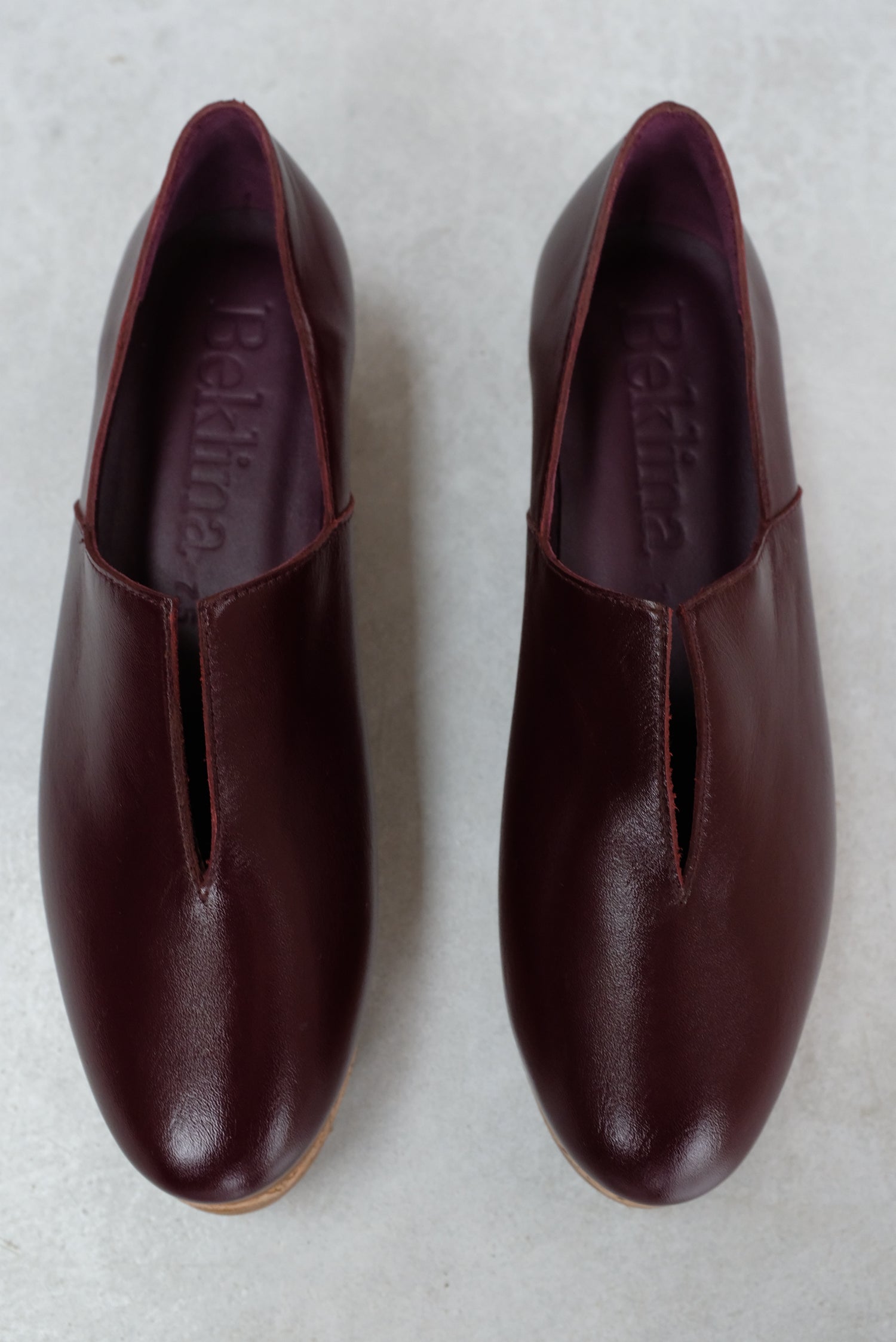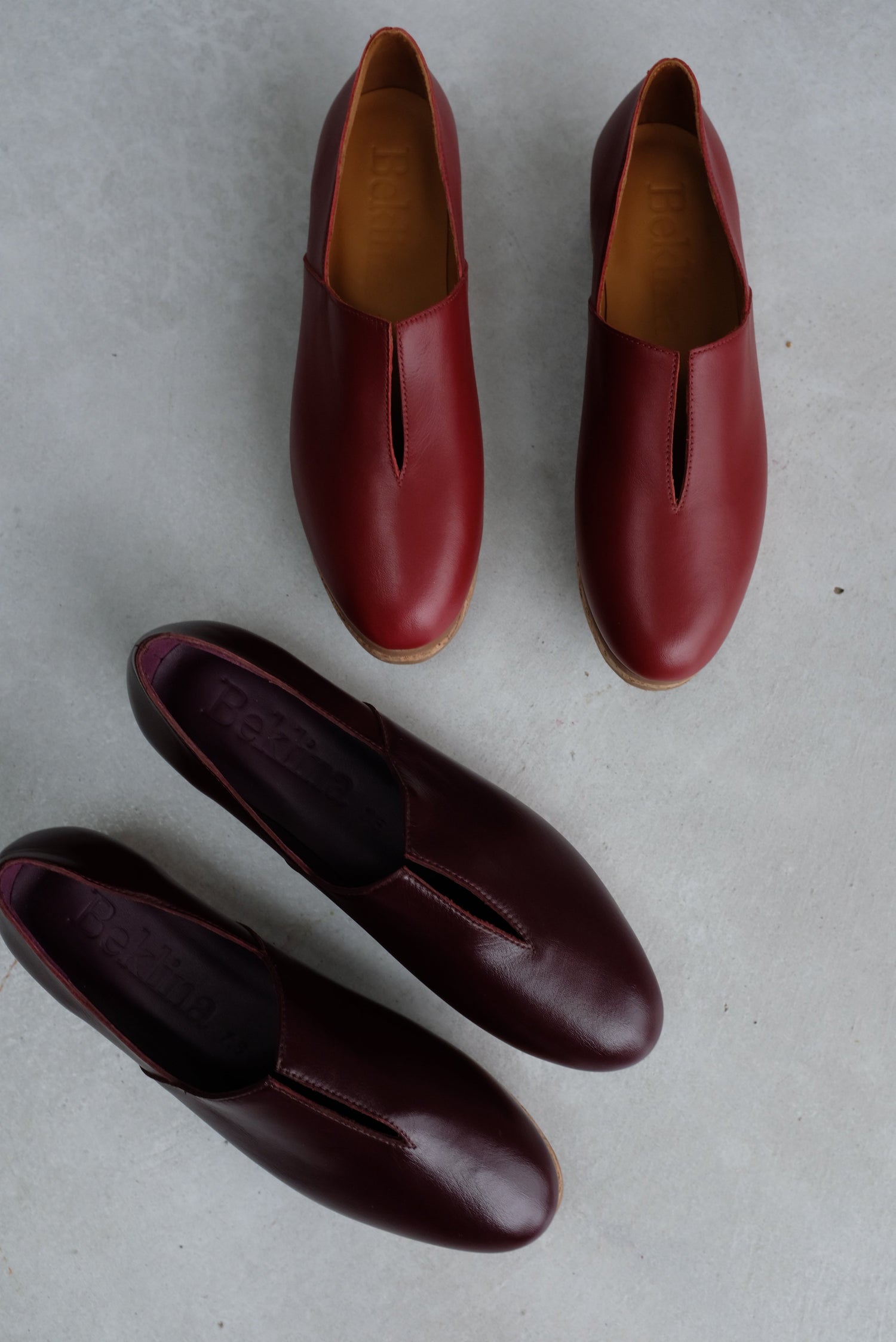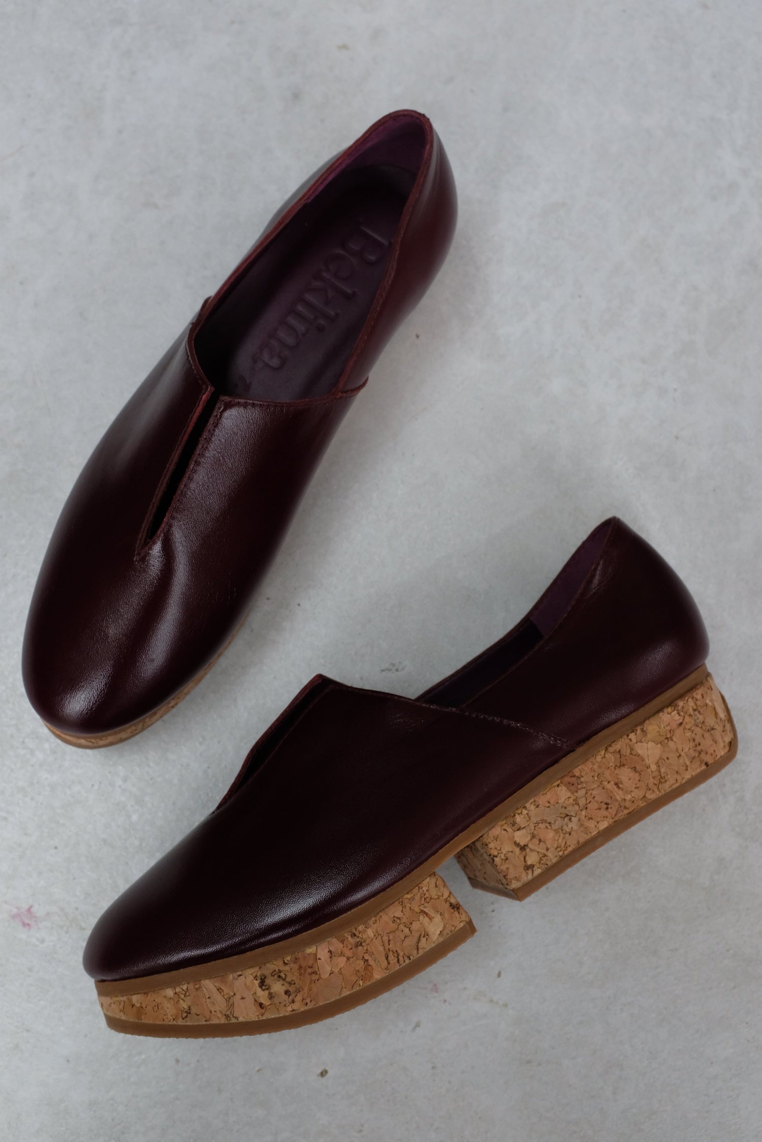 Leather slip on shoe, split cork 1 1/4" platform heel, all leather upper, v-detail, walking shoe.