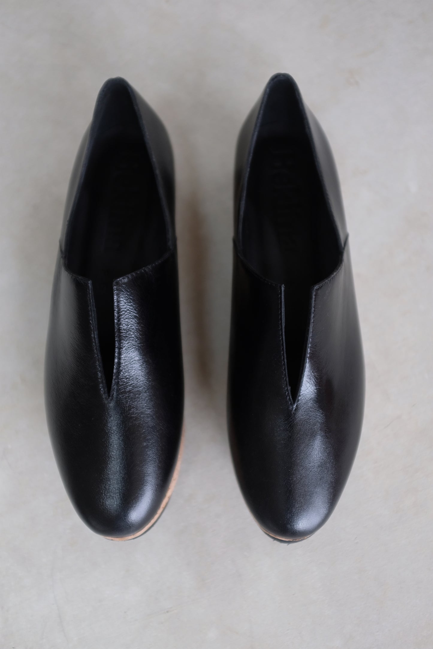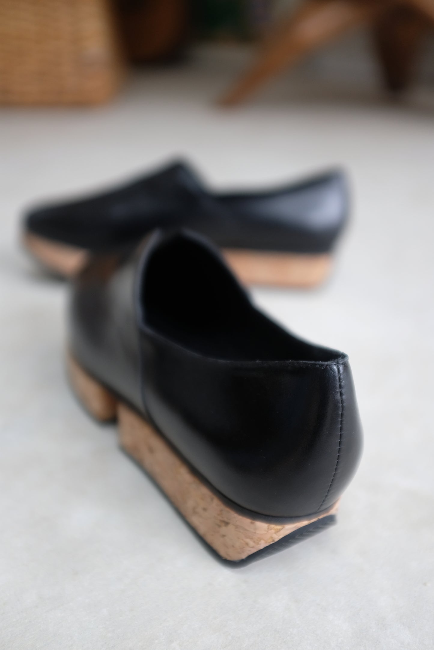 Leather slip on shoe, split cork 1 1/4" platform heel, all leather upper, v-detail, walking shoe. A best selling shoe in the shop. These are hard to keep in stock due to their cult following :)